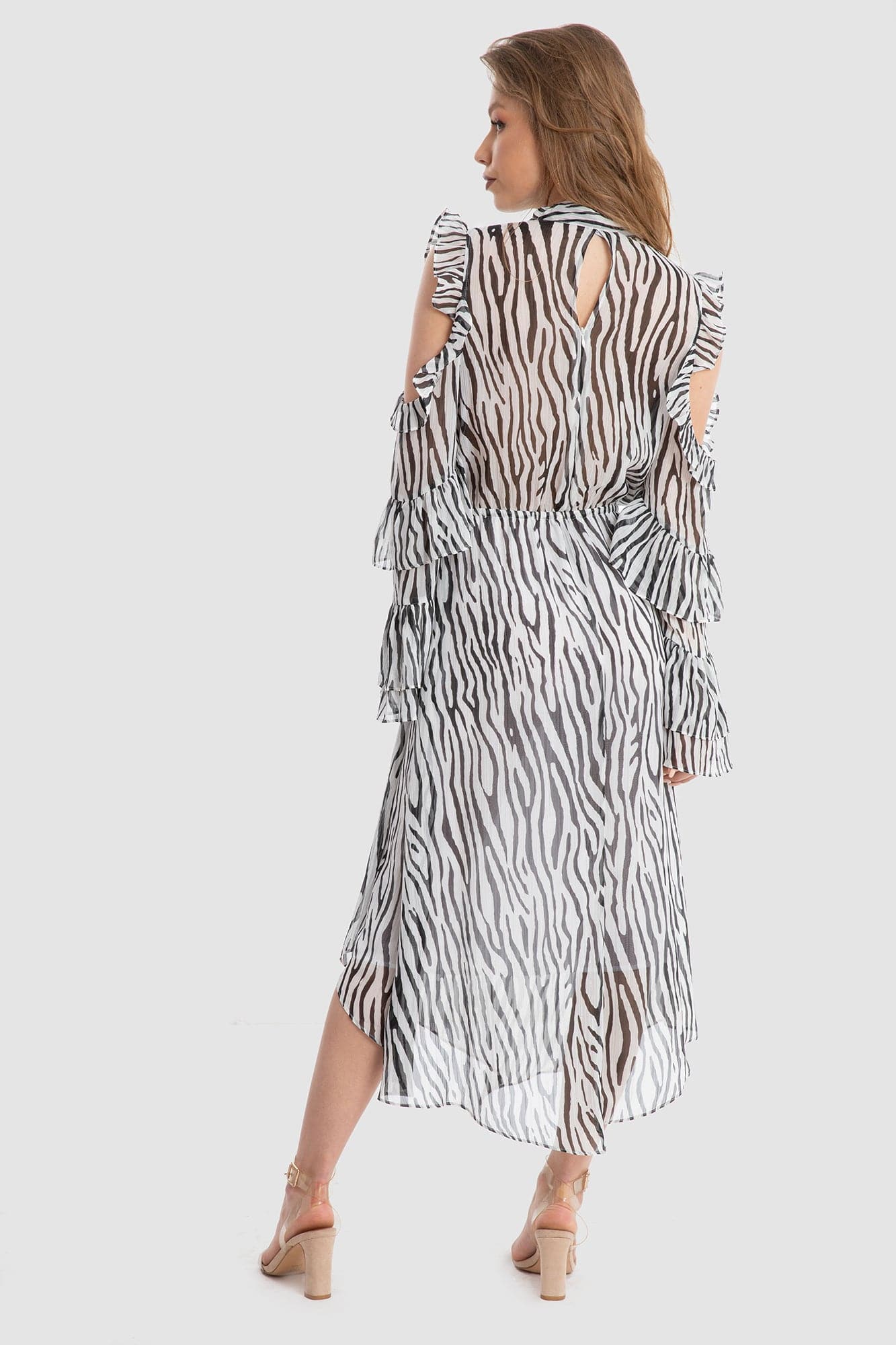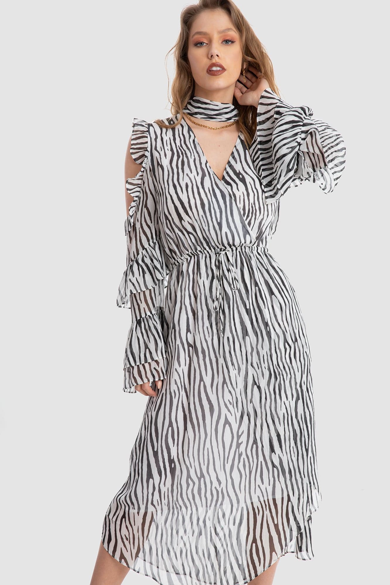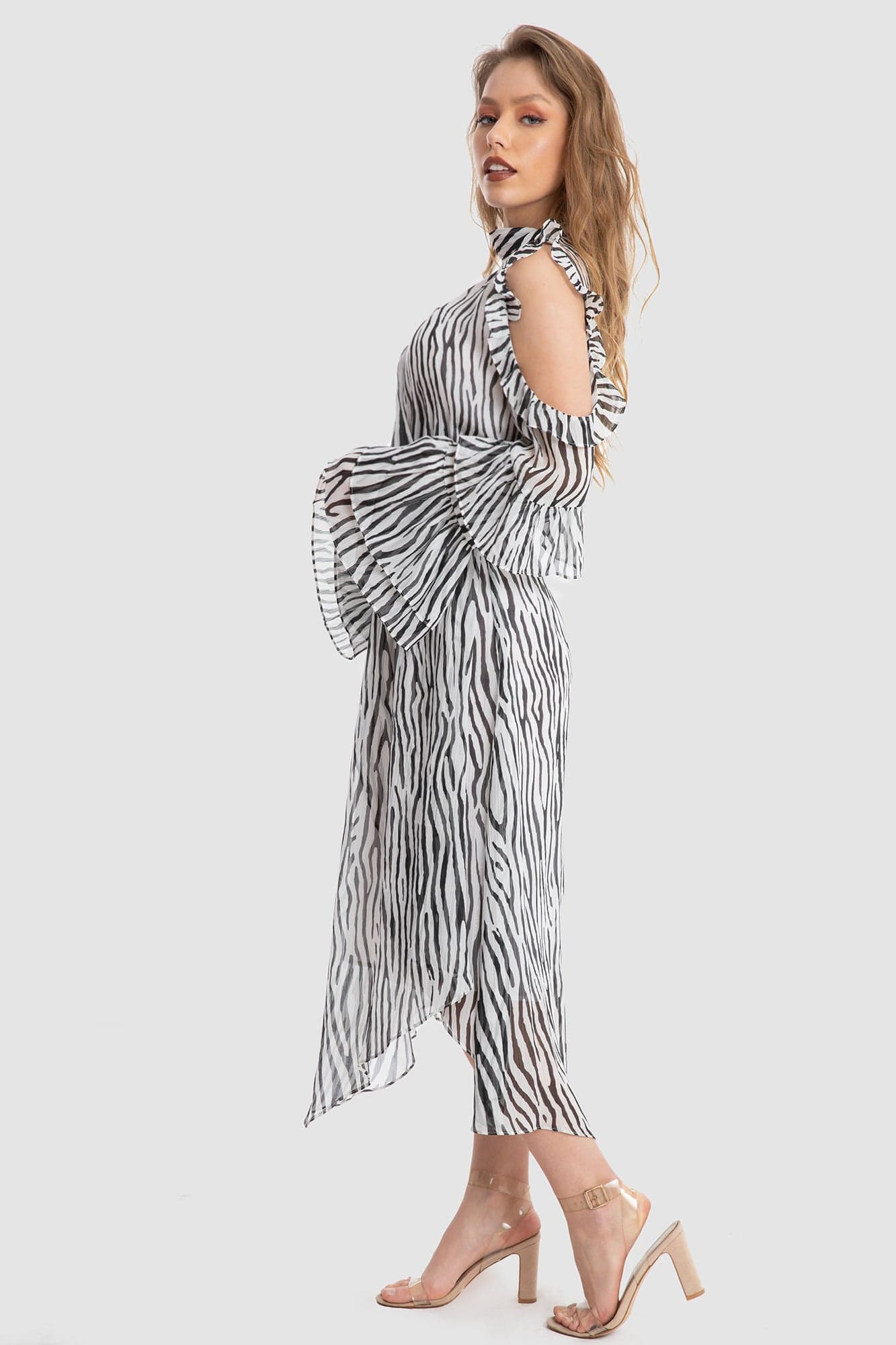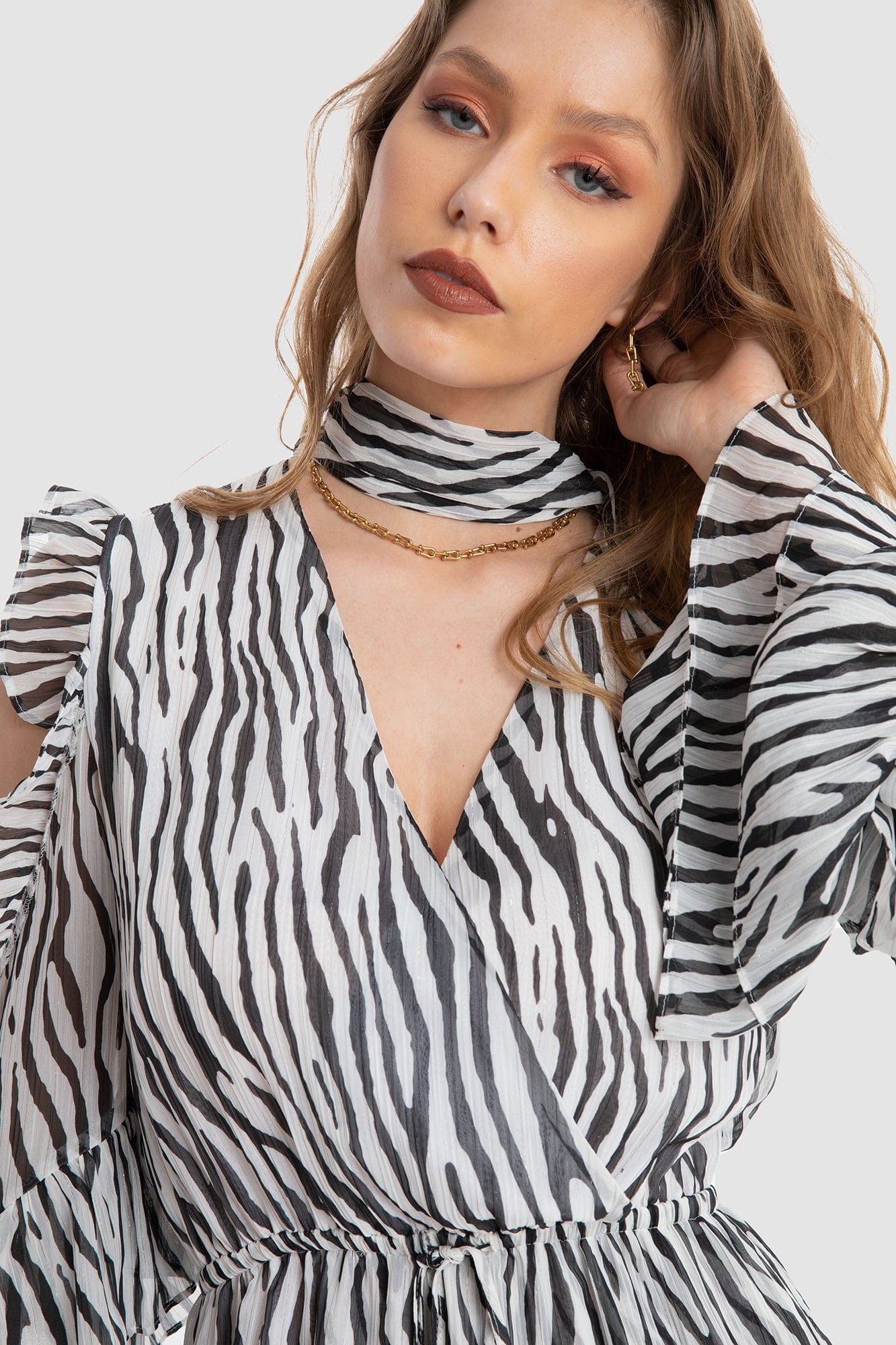 Turn heads in this Black Animal-Print Midi Cold-Shoulder Dress — a bold blend of on-trend details and effortless comfort. The asymmetric silhouette and ruffled trim skim the body in a flattering, loose mold while the midi length lends polished coverage for daytime or after-work plans. Cut from a lightweight, thin fabric with an unlined interior, the V-neck and cold-shoulder long sleeves keep the look breathable and relaxed; a self-tie belted waist and wrapover closure create adjustable definition. Pocketless construction keeps lines sleek, and the monochrome animal print adds instant attitude for spring and autumn styling. Ideal for casual everyday wear yet easily dressed up with heels and a leather jacket, this versatile piece is a Fashion SA staple — shop now to make it yours.