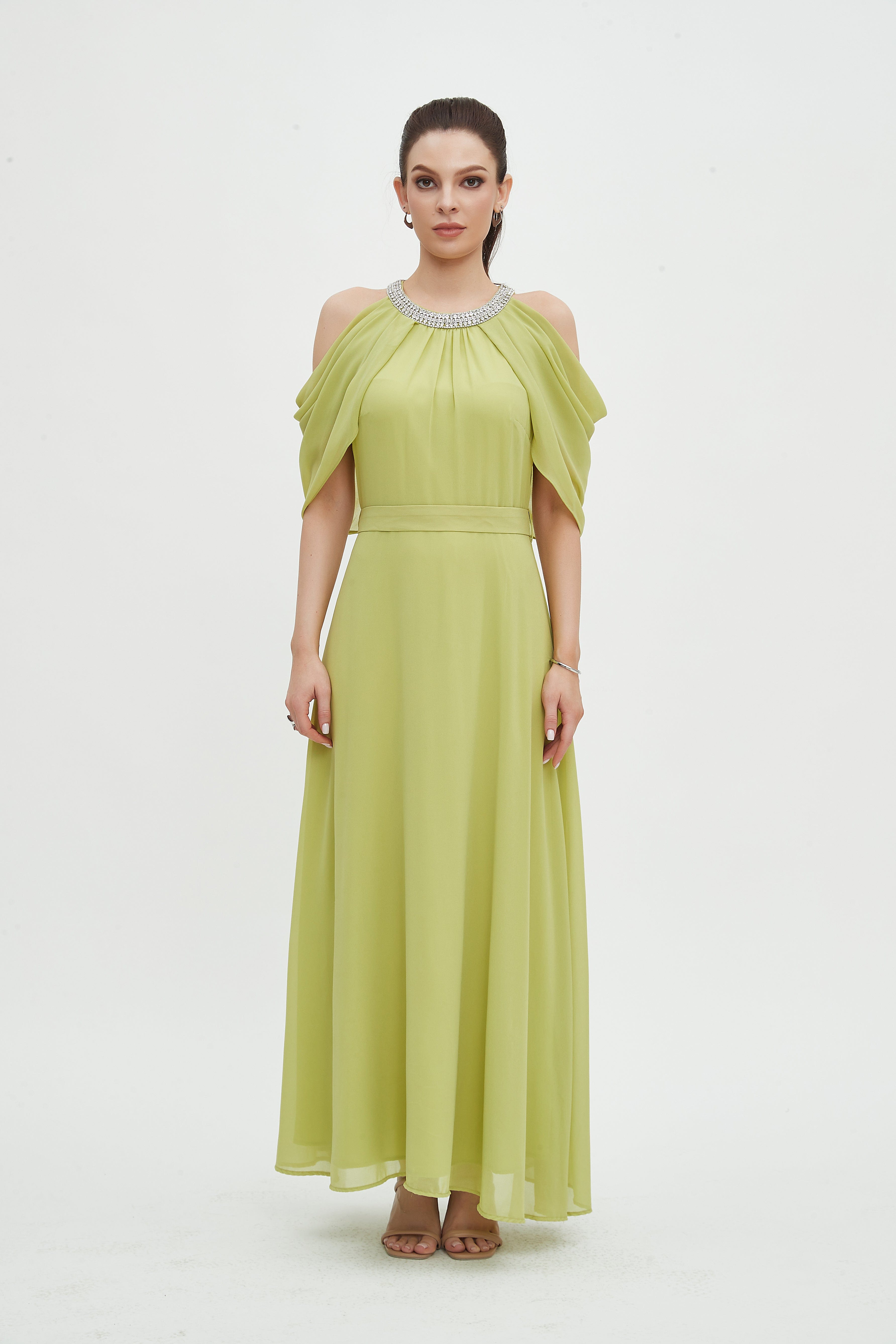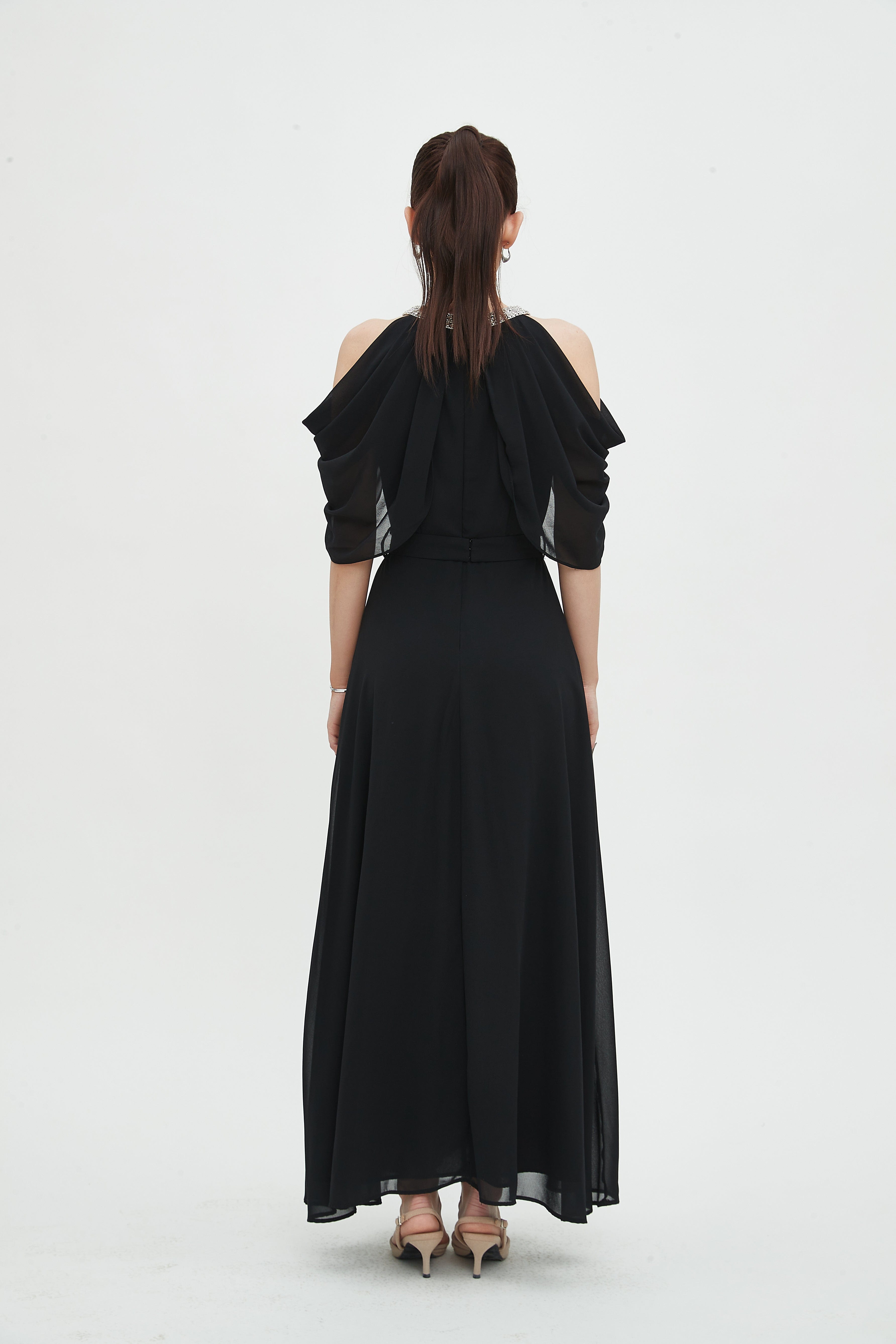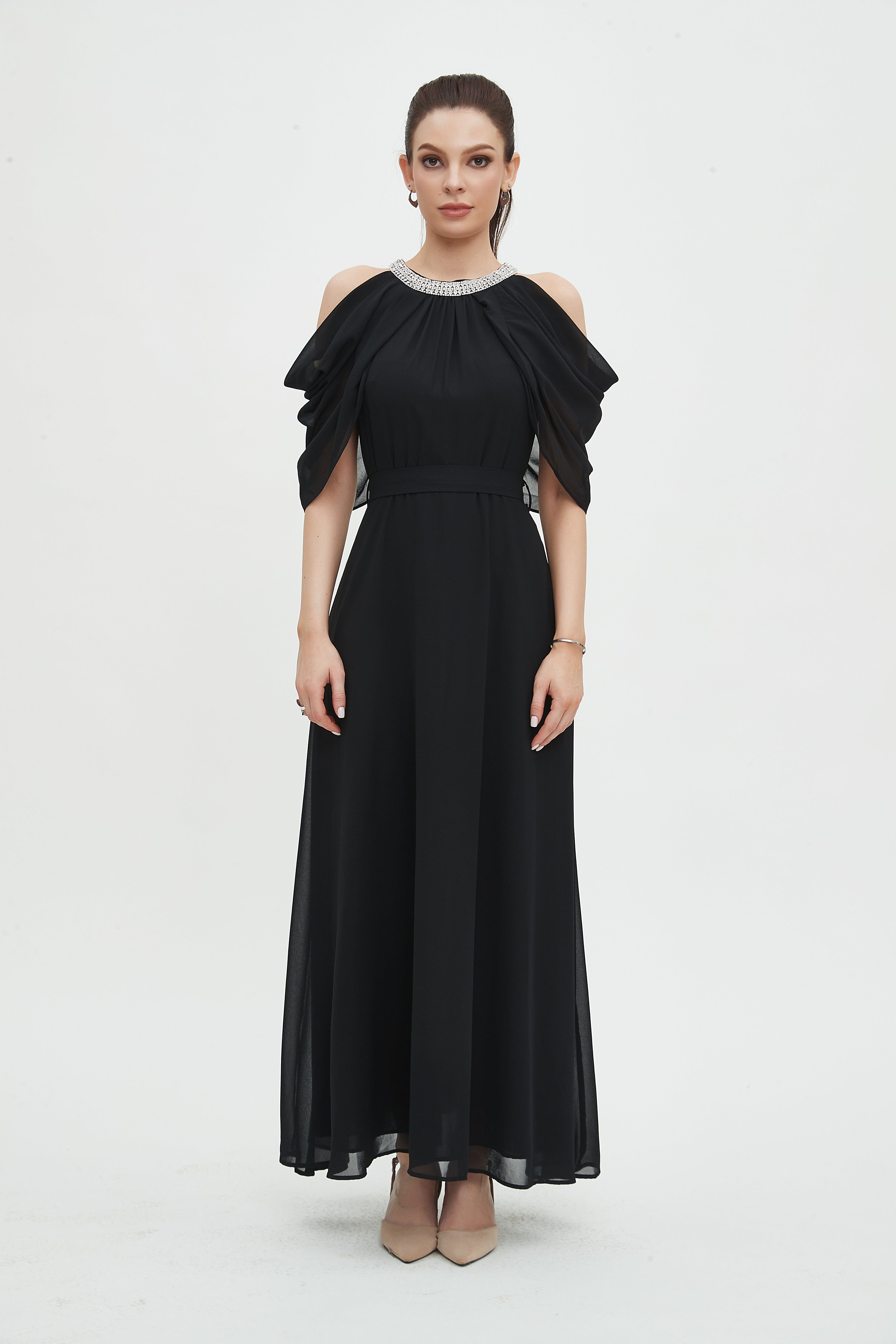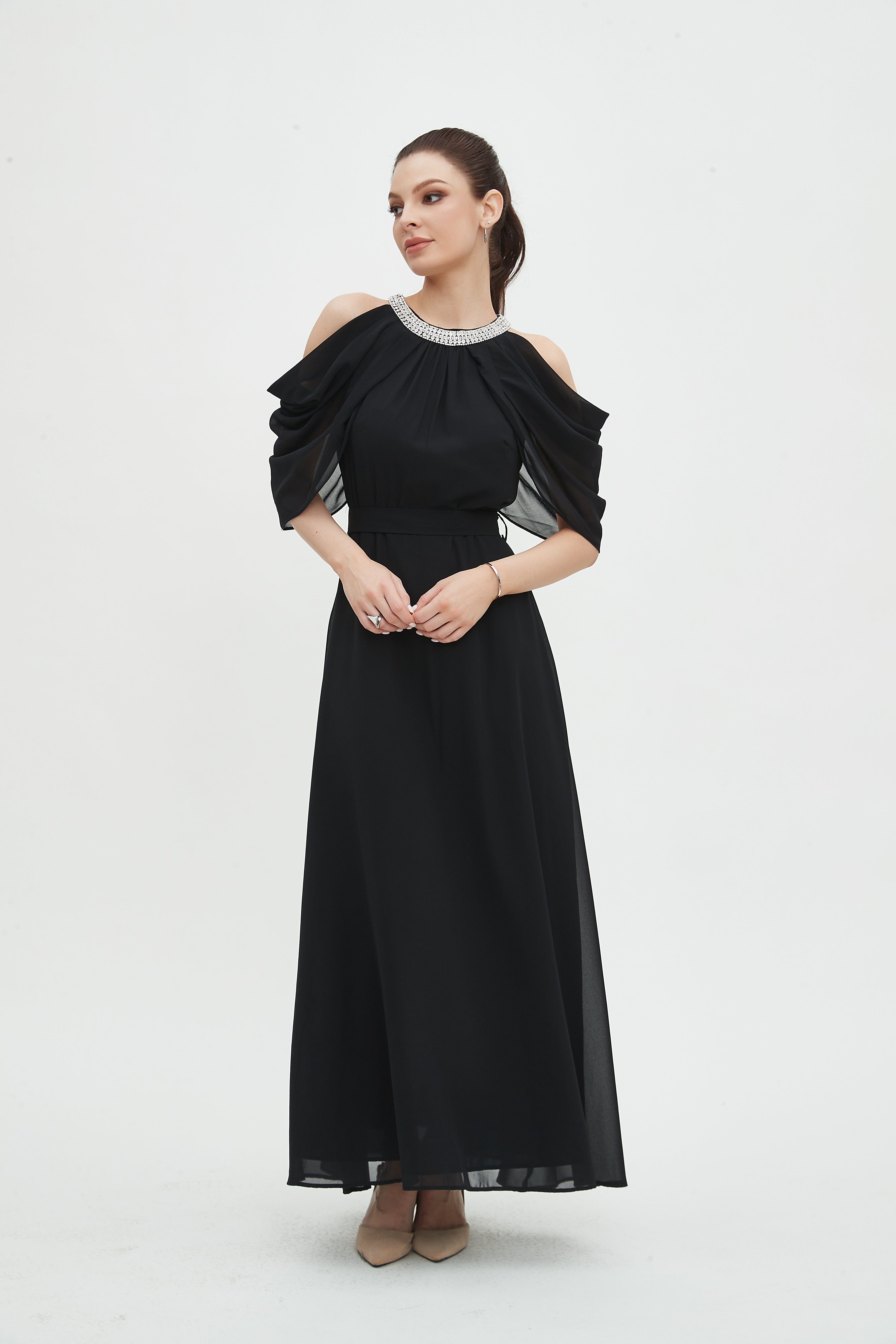 - Elegant maxi length for elongating lines and versatile evening or daytime styling