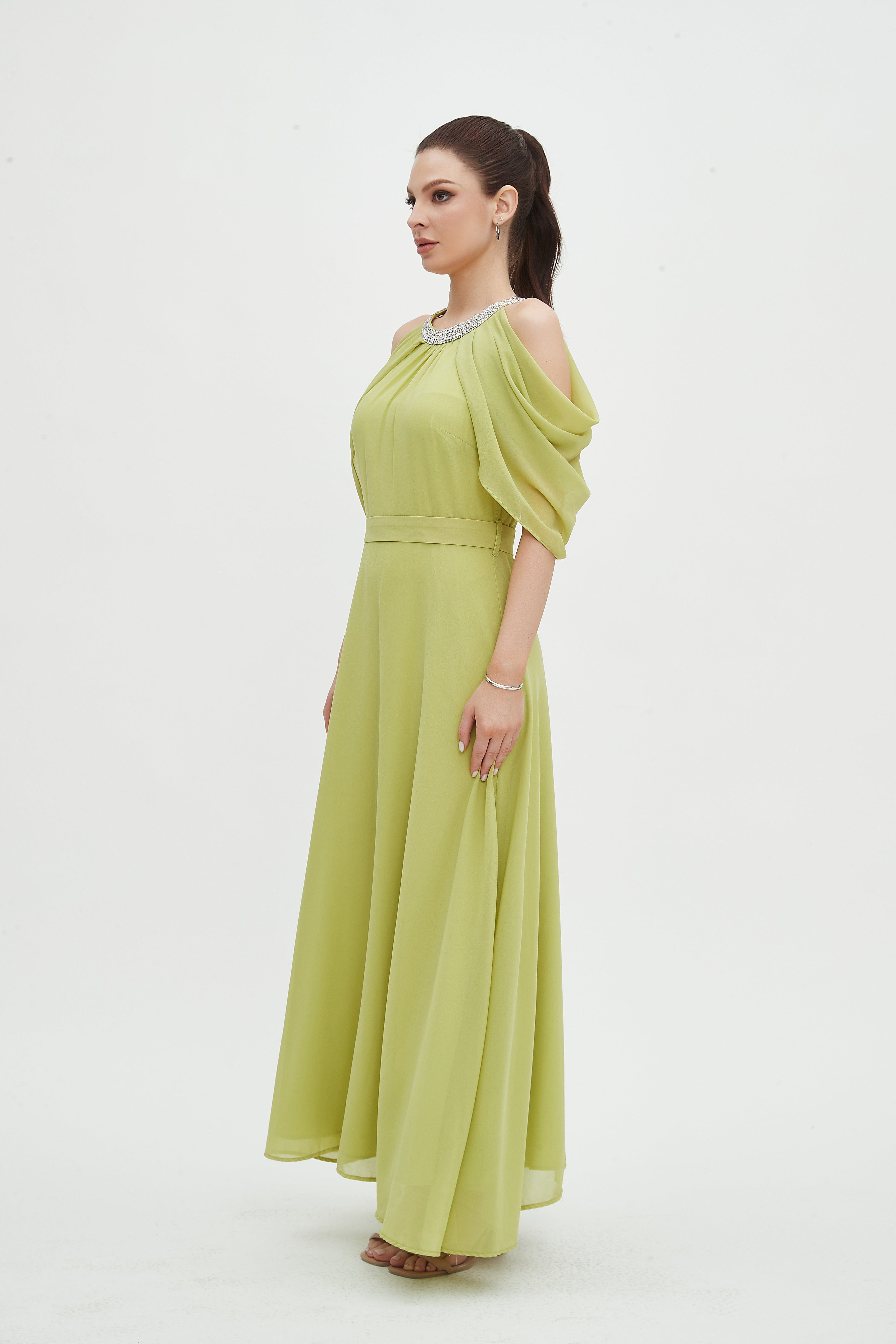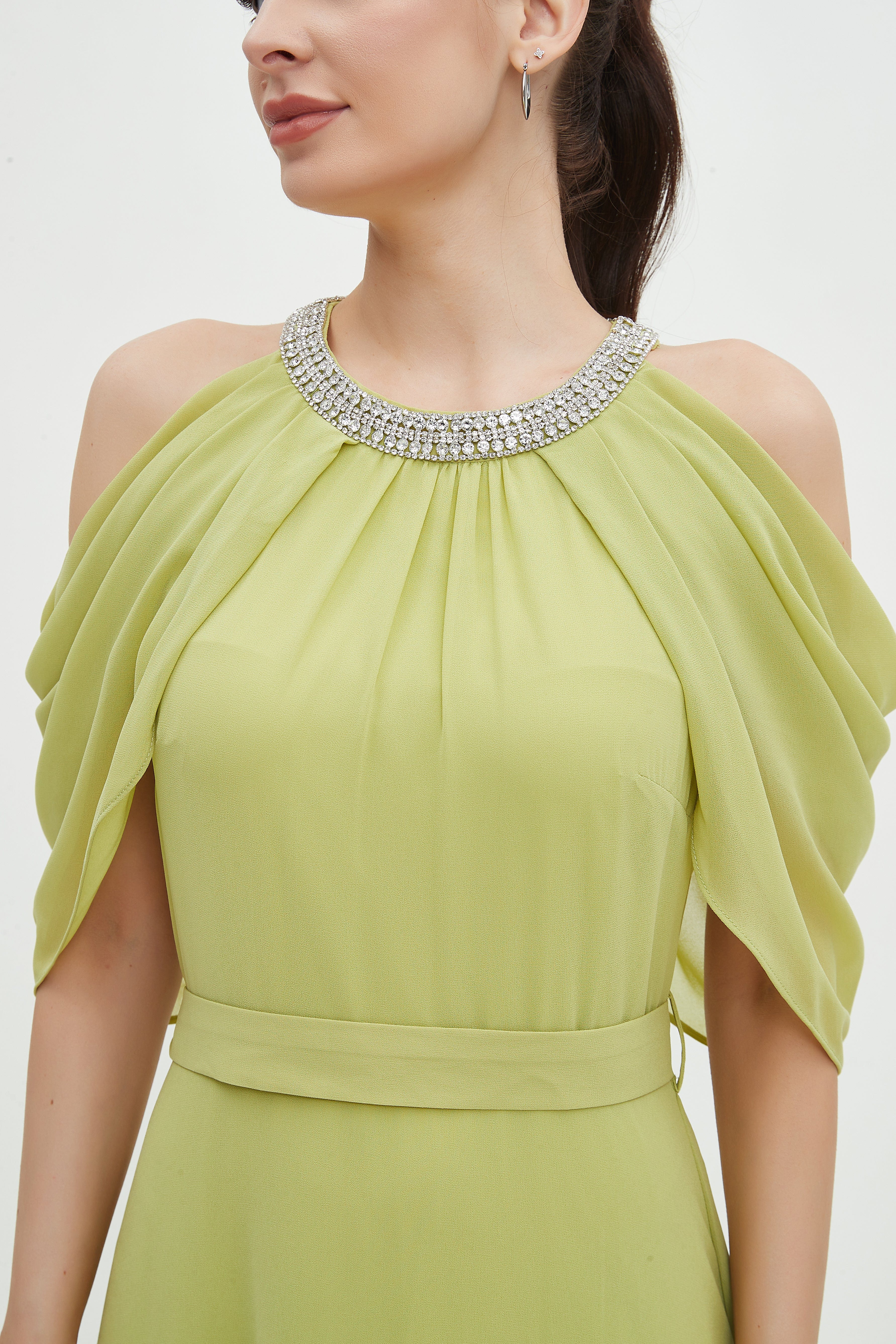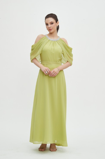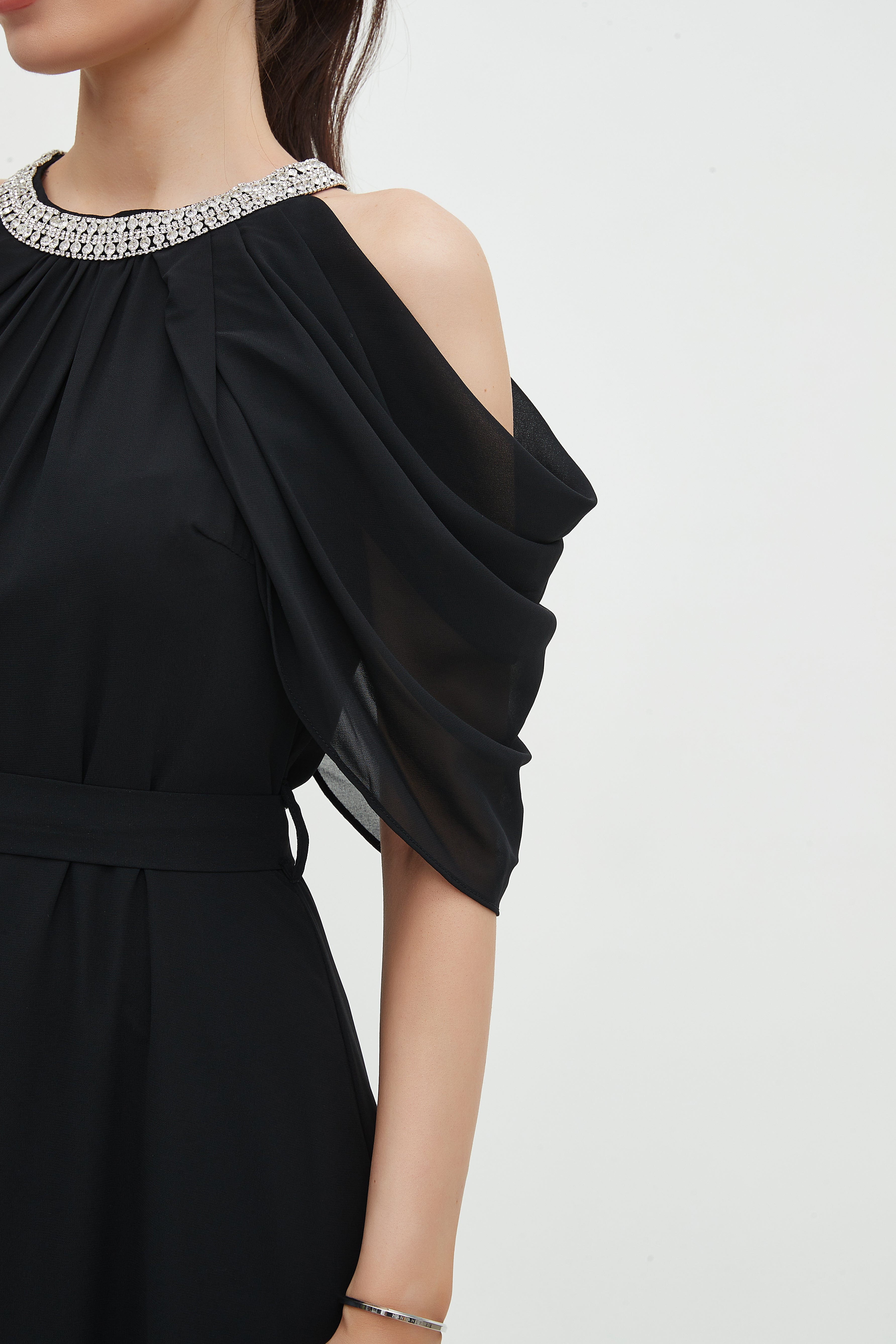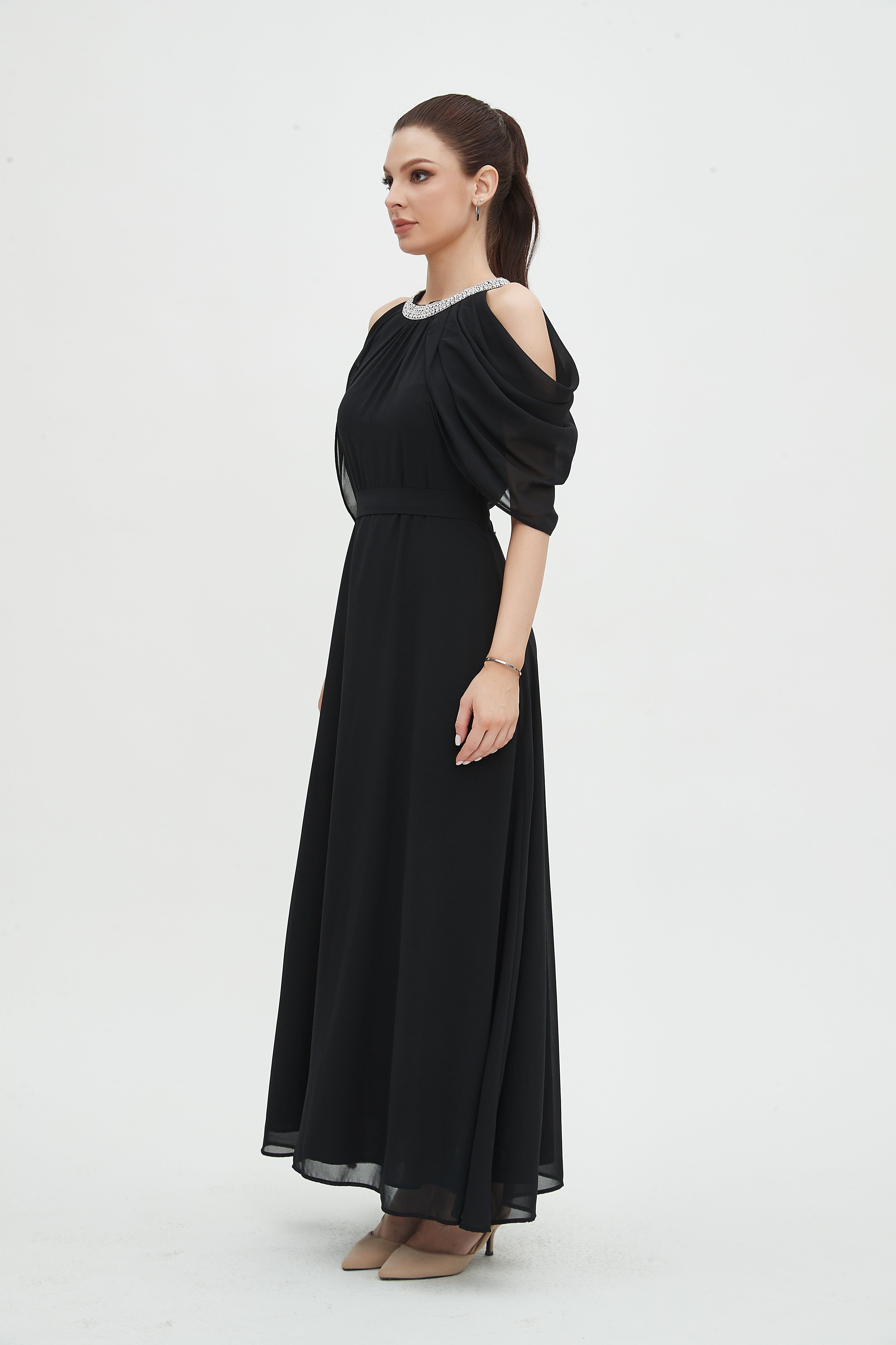 - Short off-shoulder sleeves with a round neck for feminine shoulder emphasis and jewelry-friendly styling