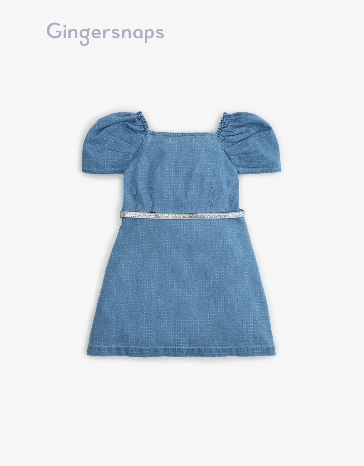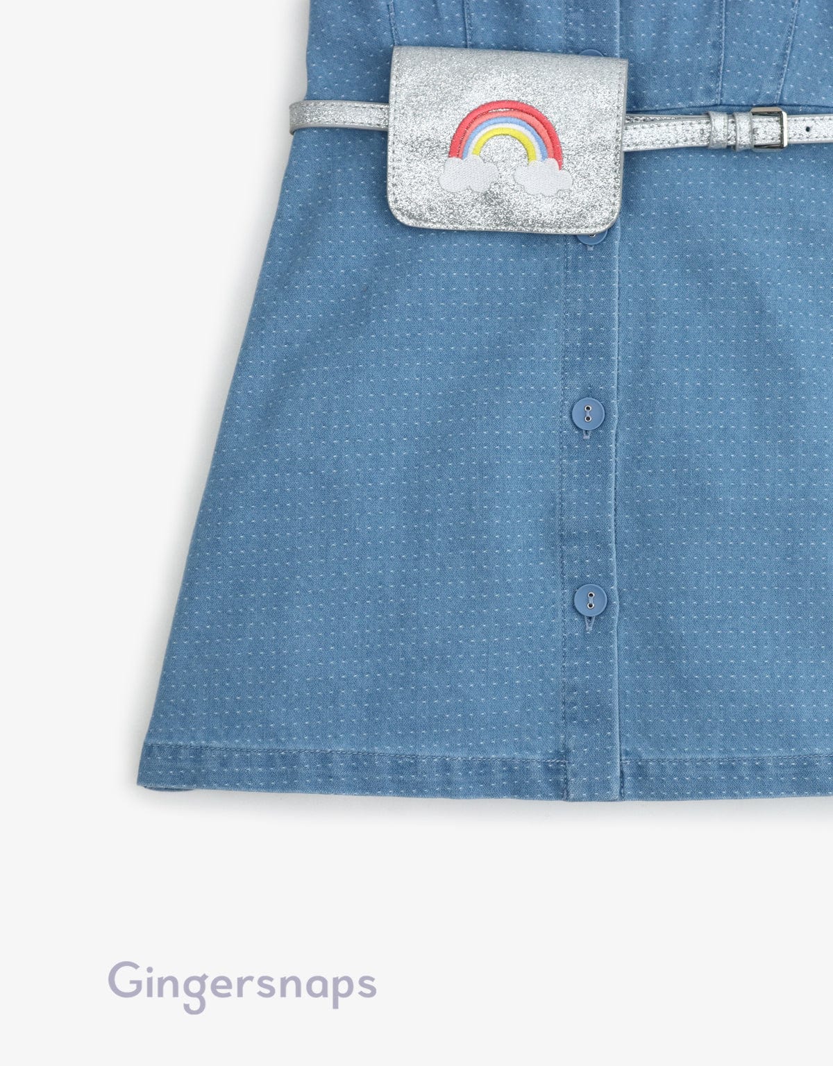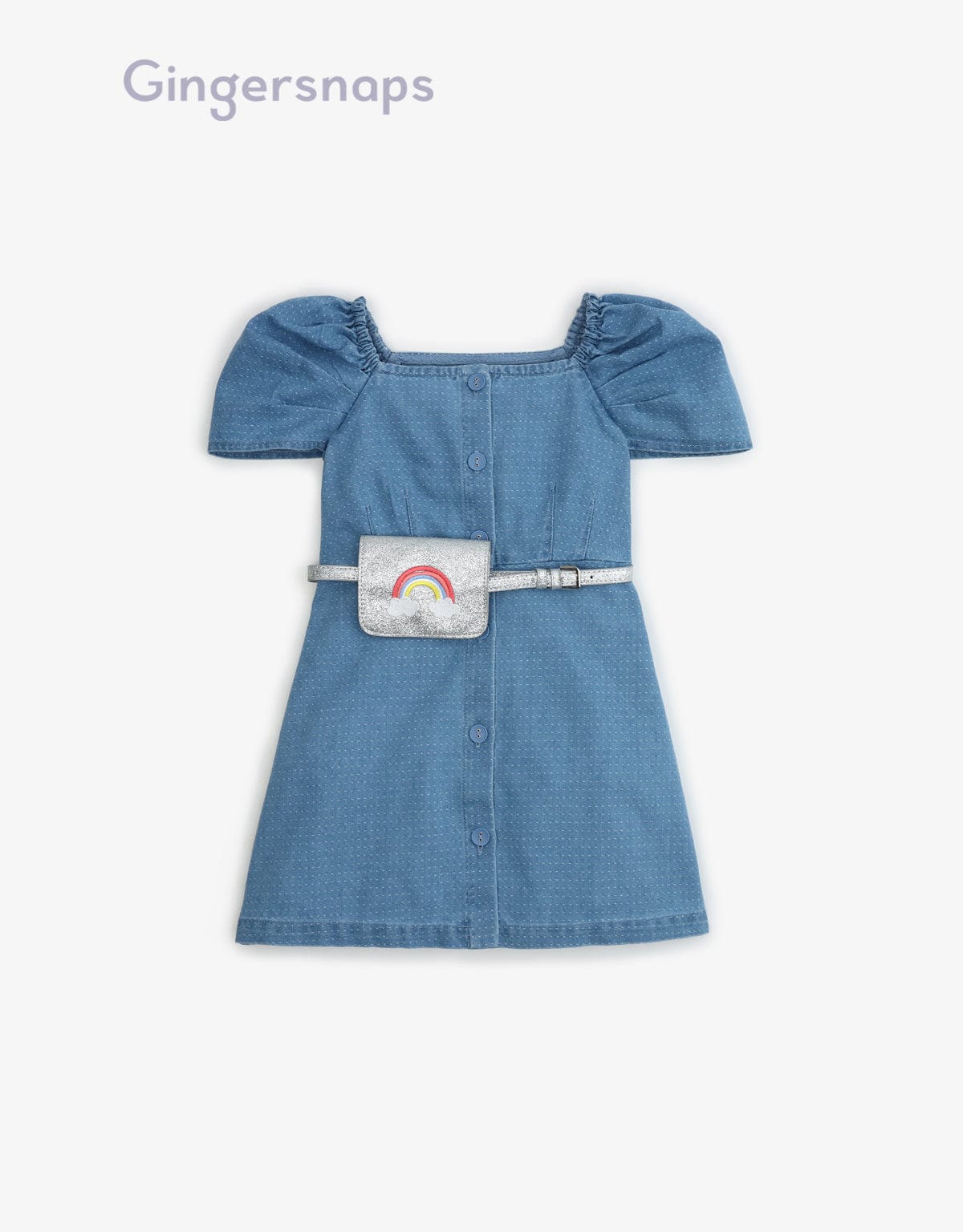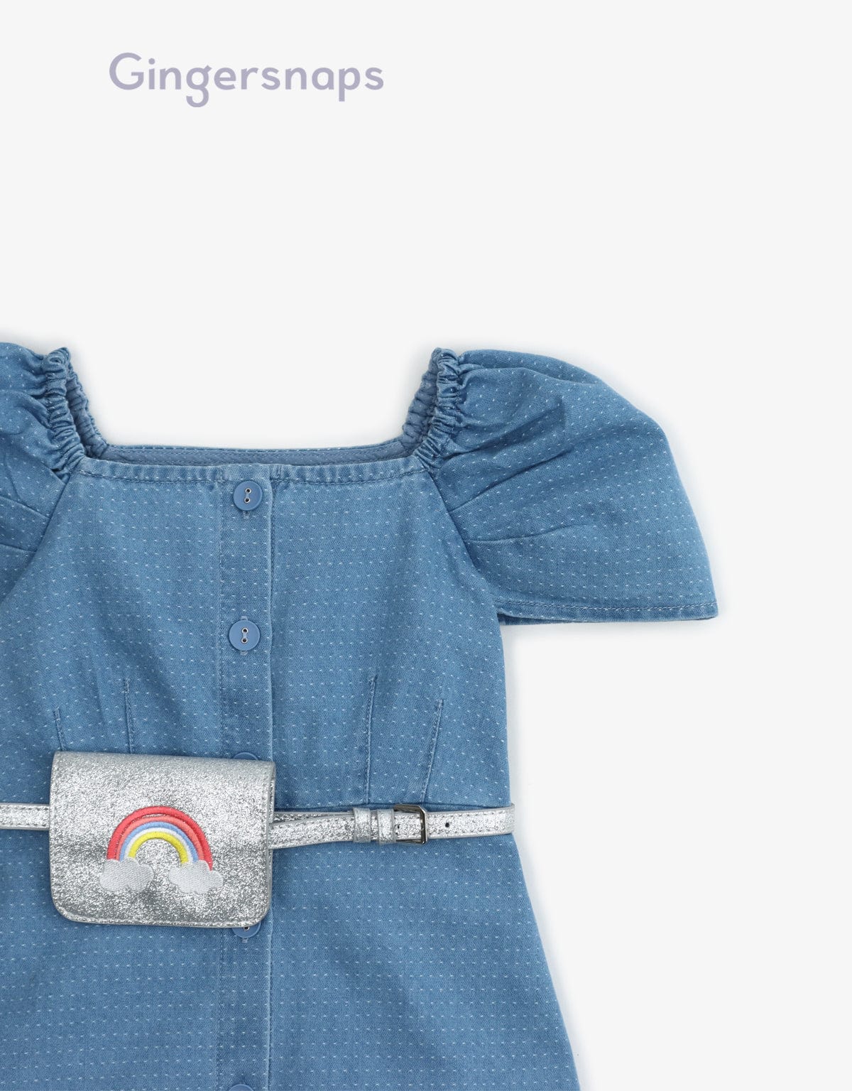 Girls Short-Sleeve Denim Dress with Waist Bag