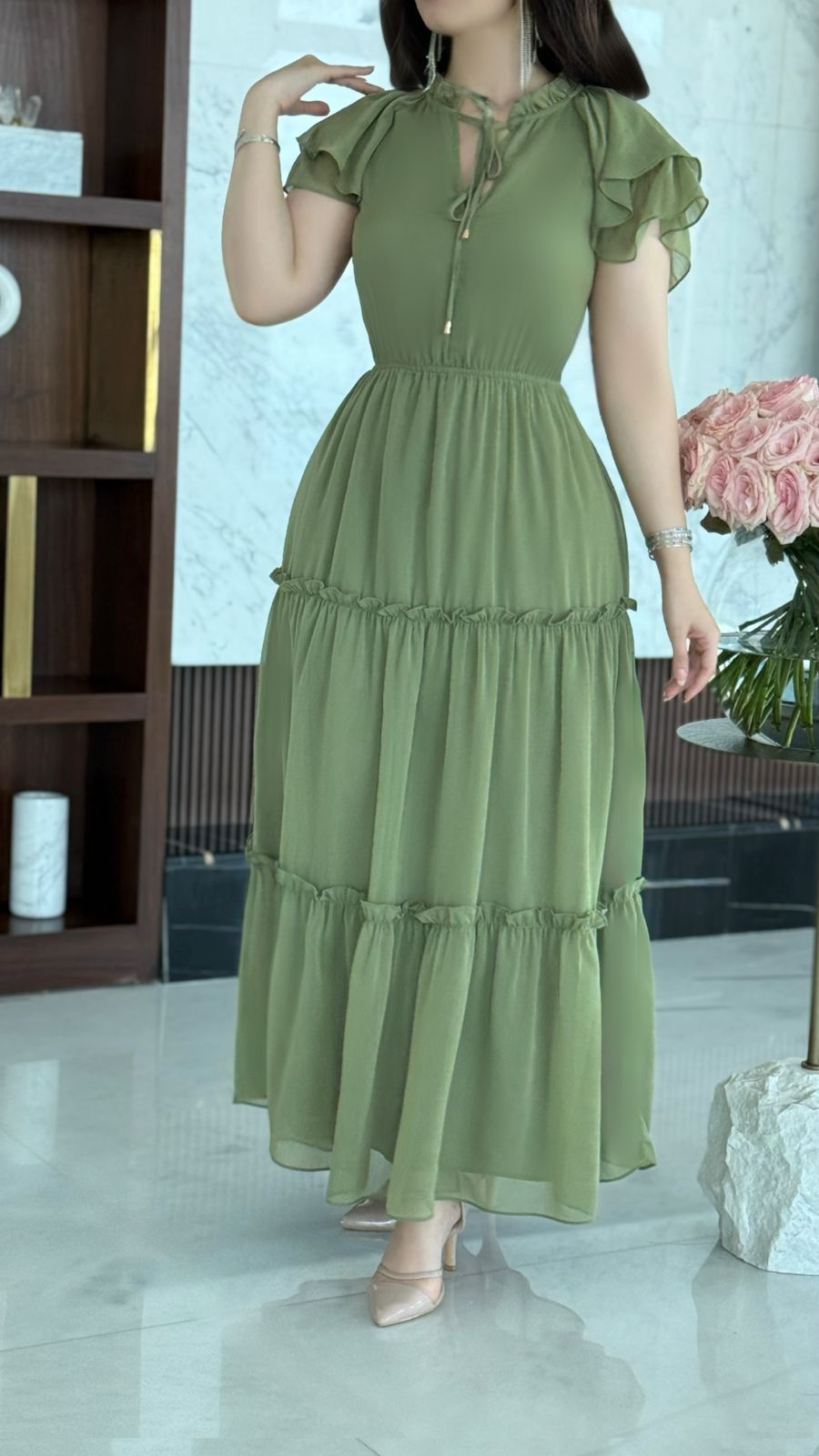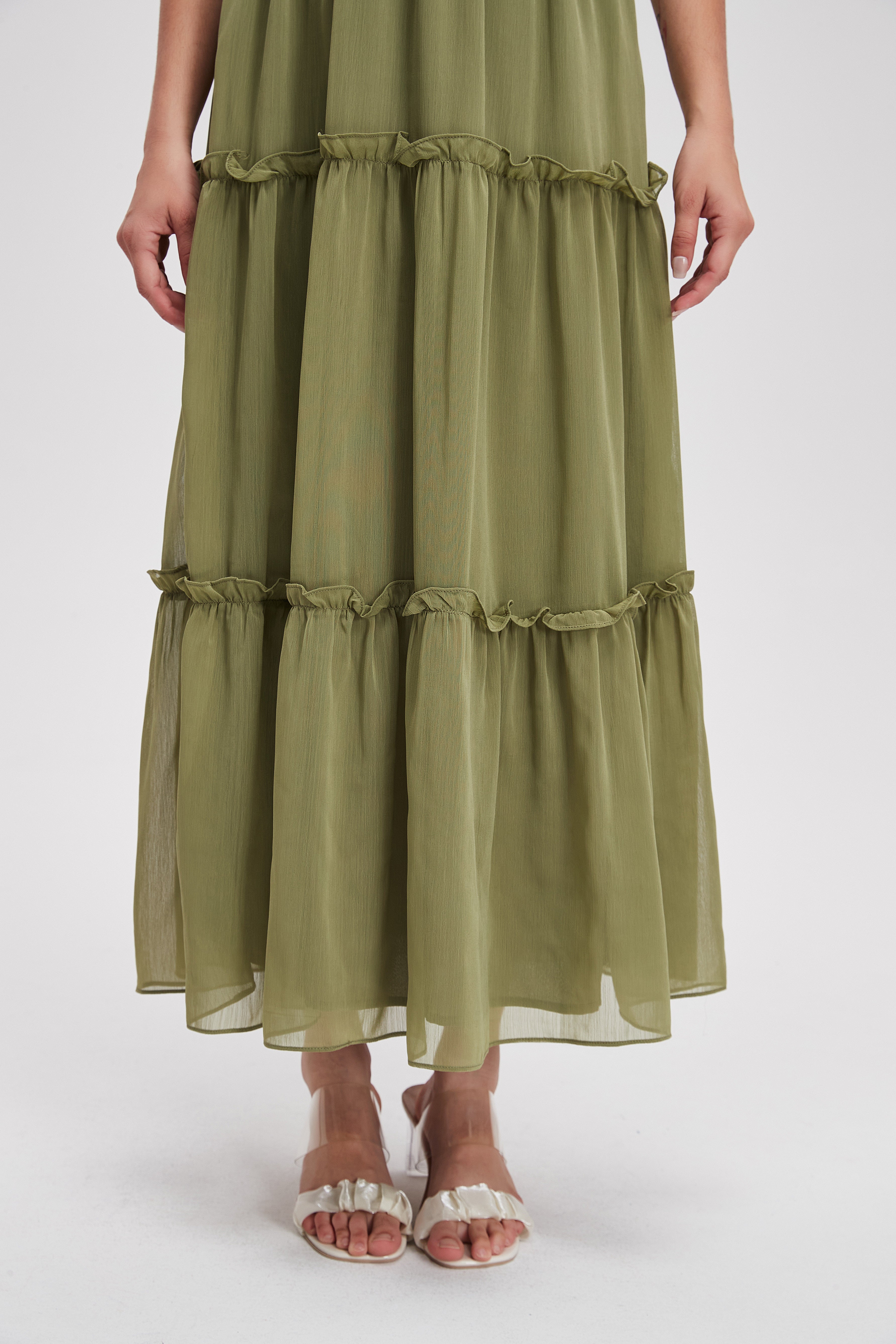 Sleeveless Plain Midi Dress with Ruffles