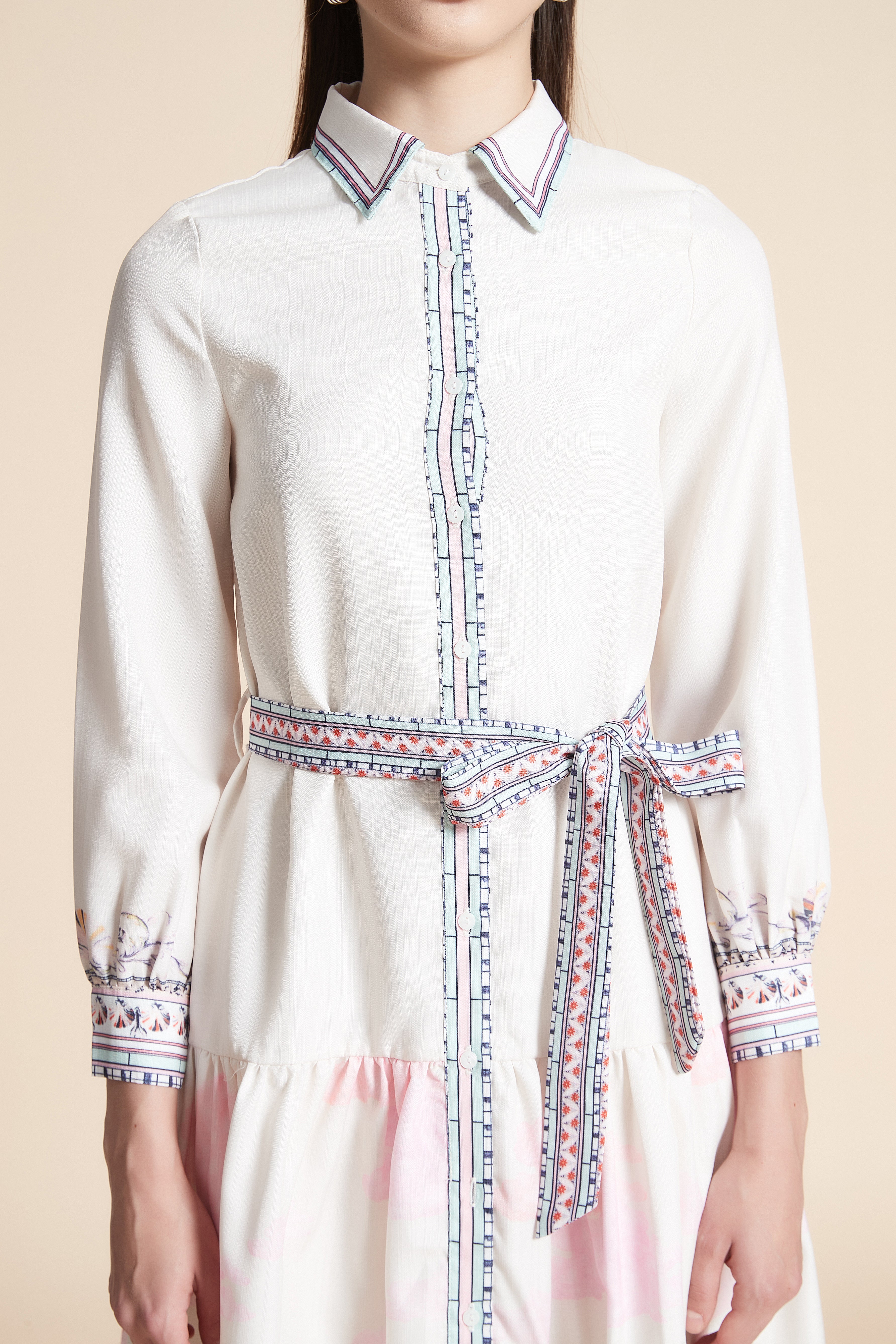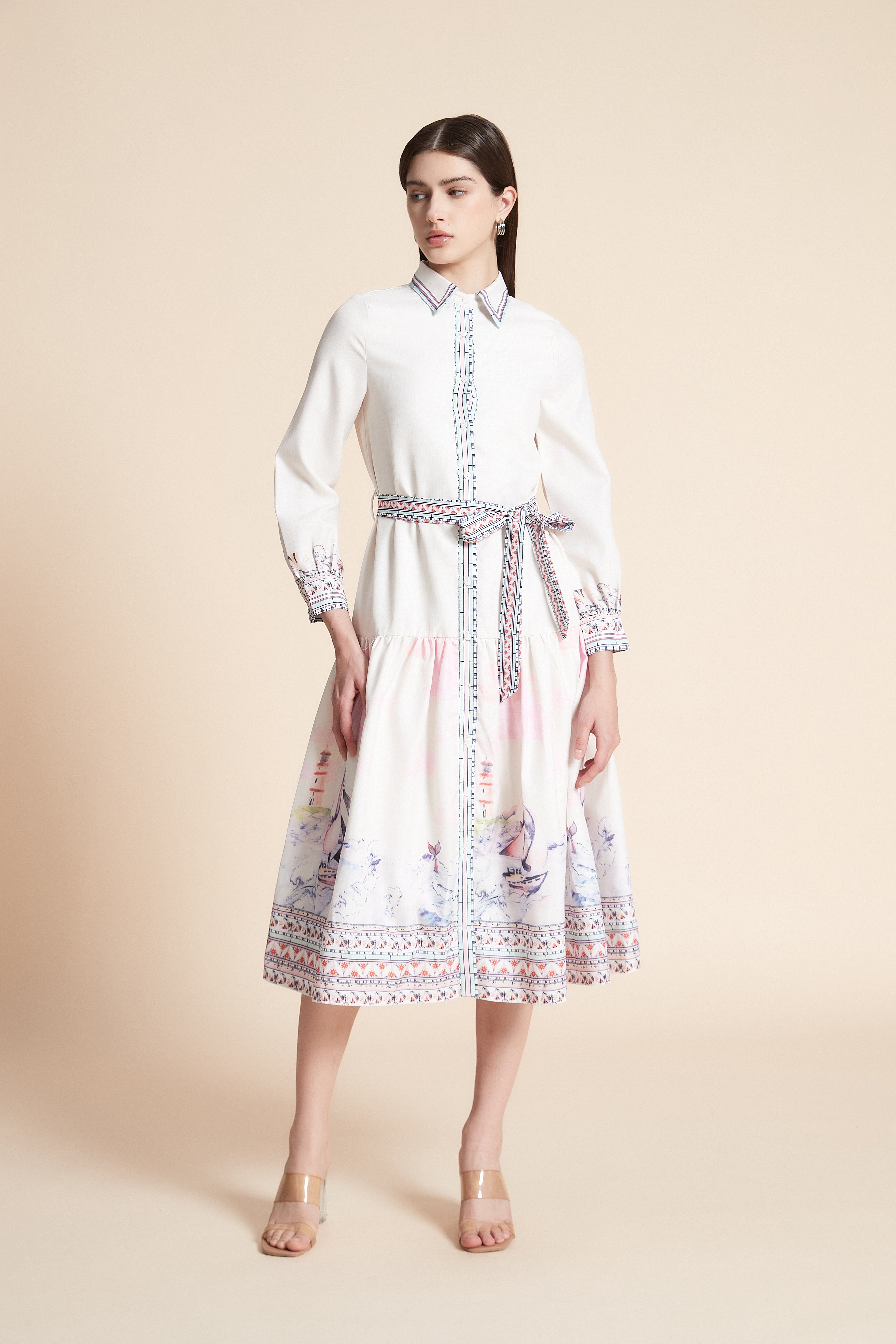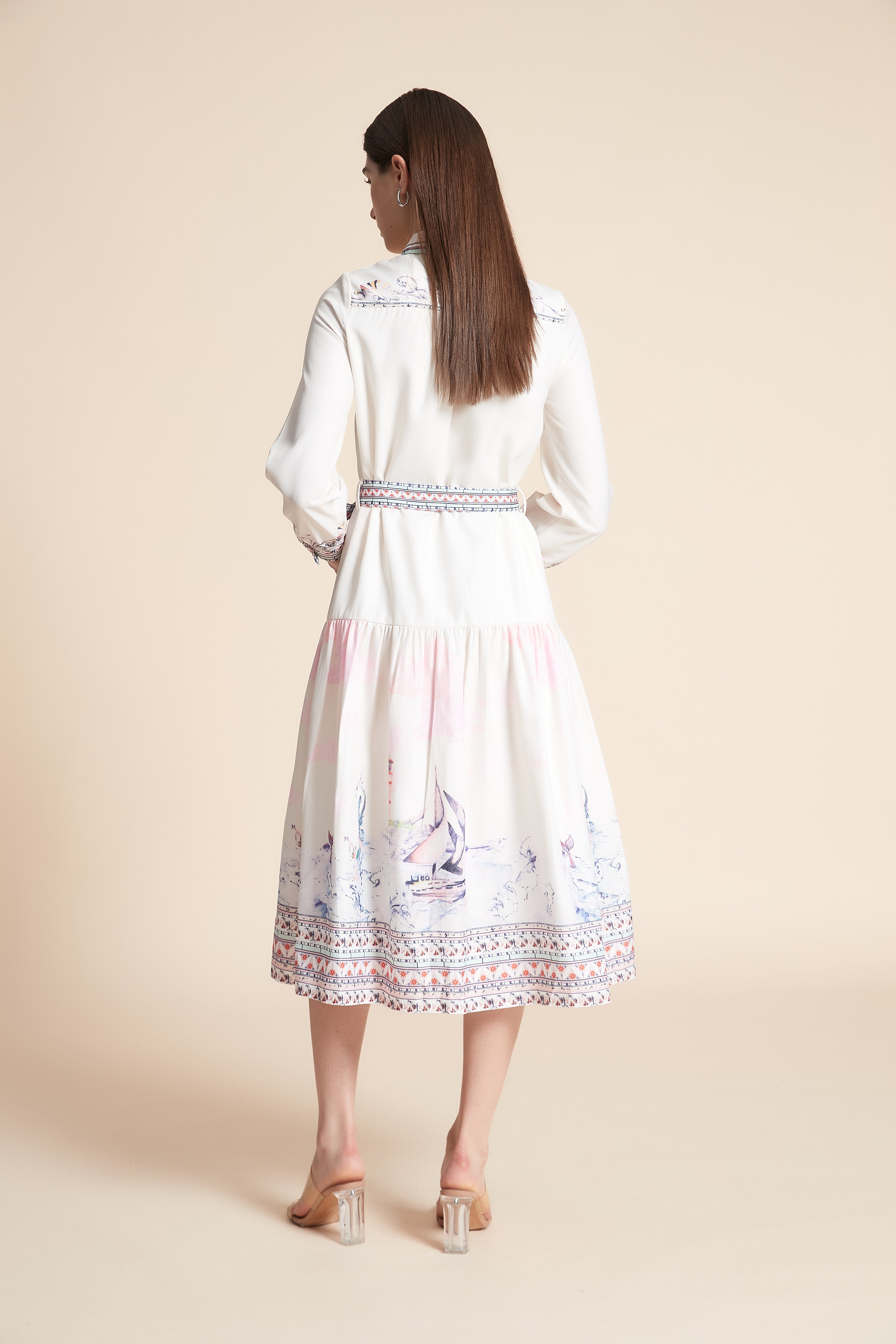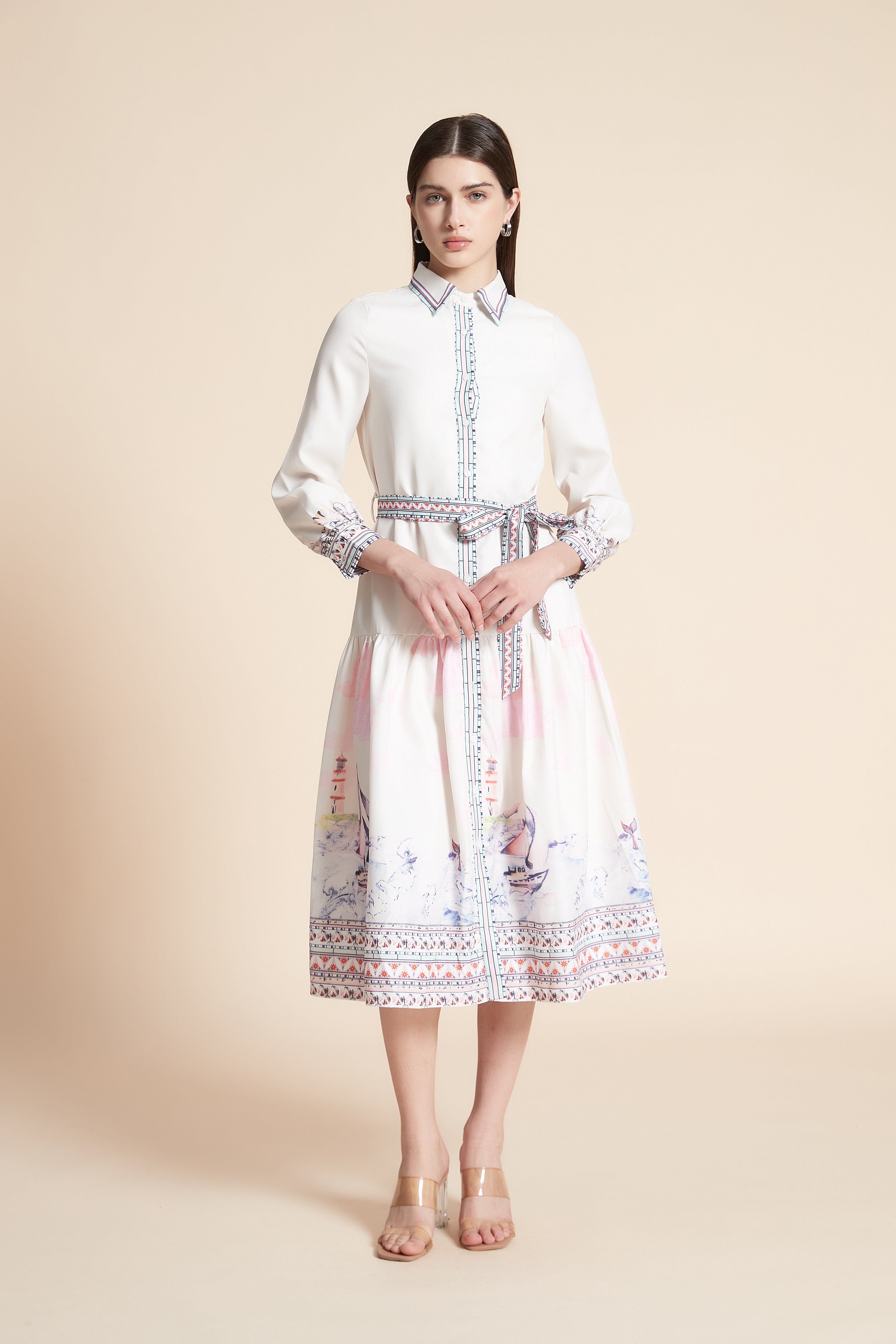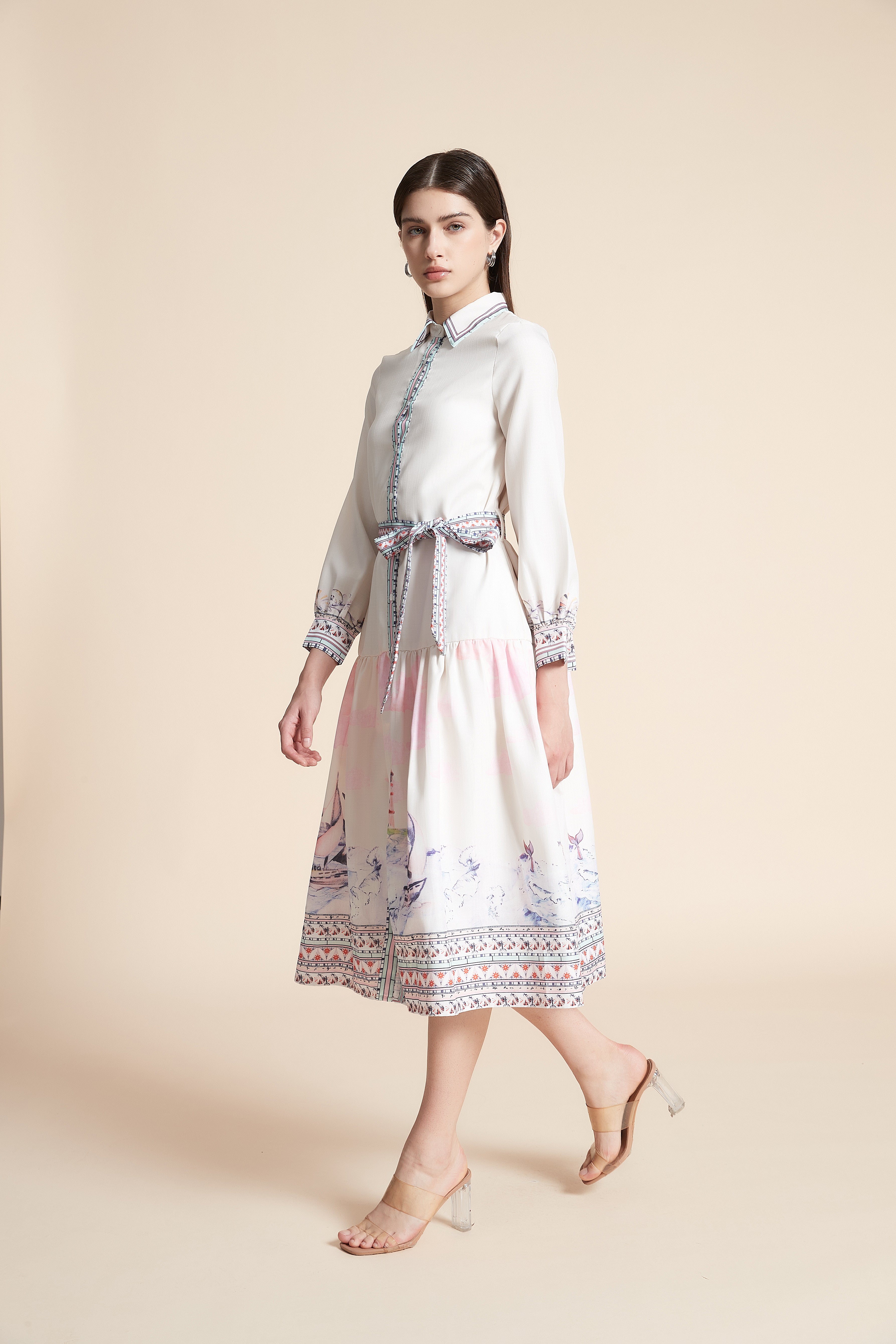 Printed Long Sleeve Midi Dress with Belt