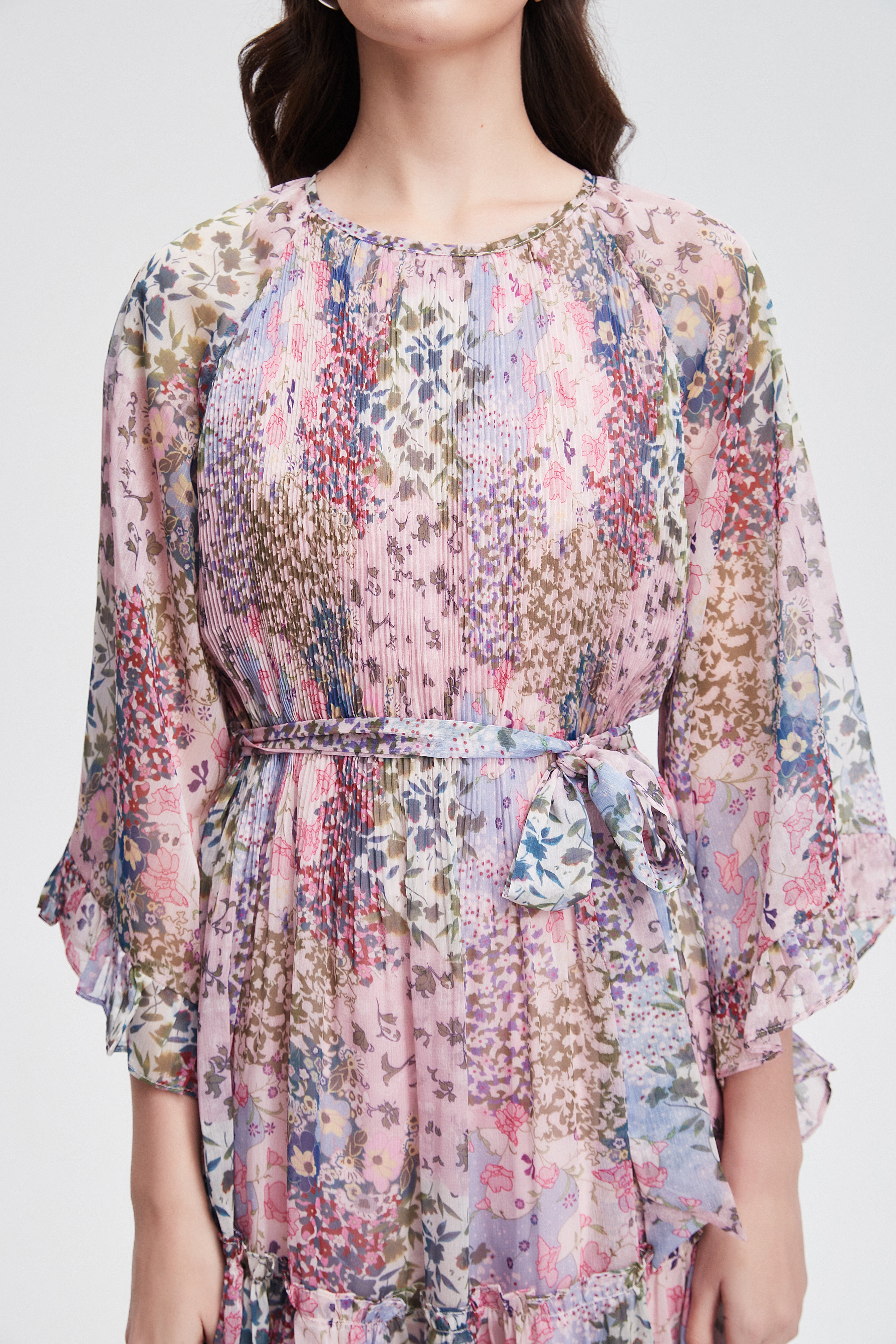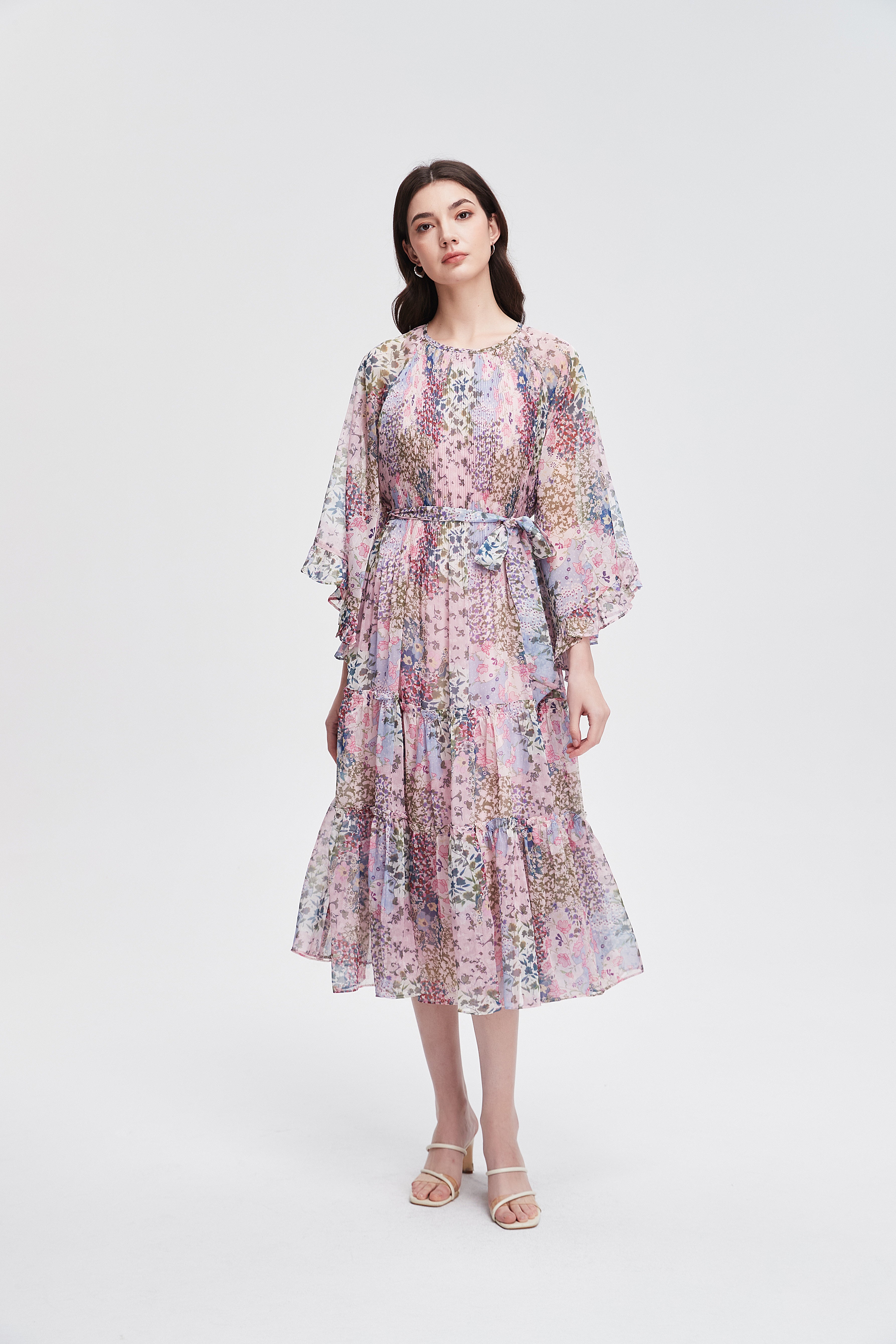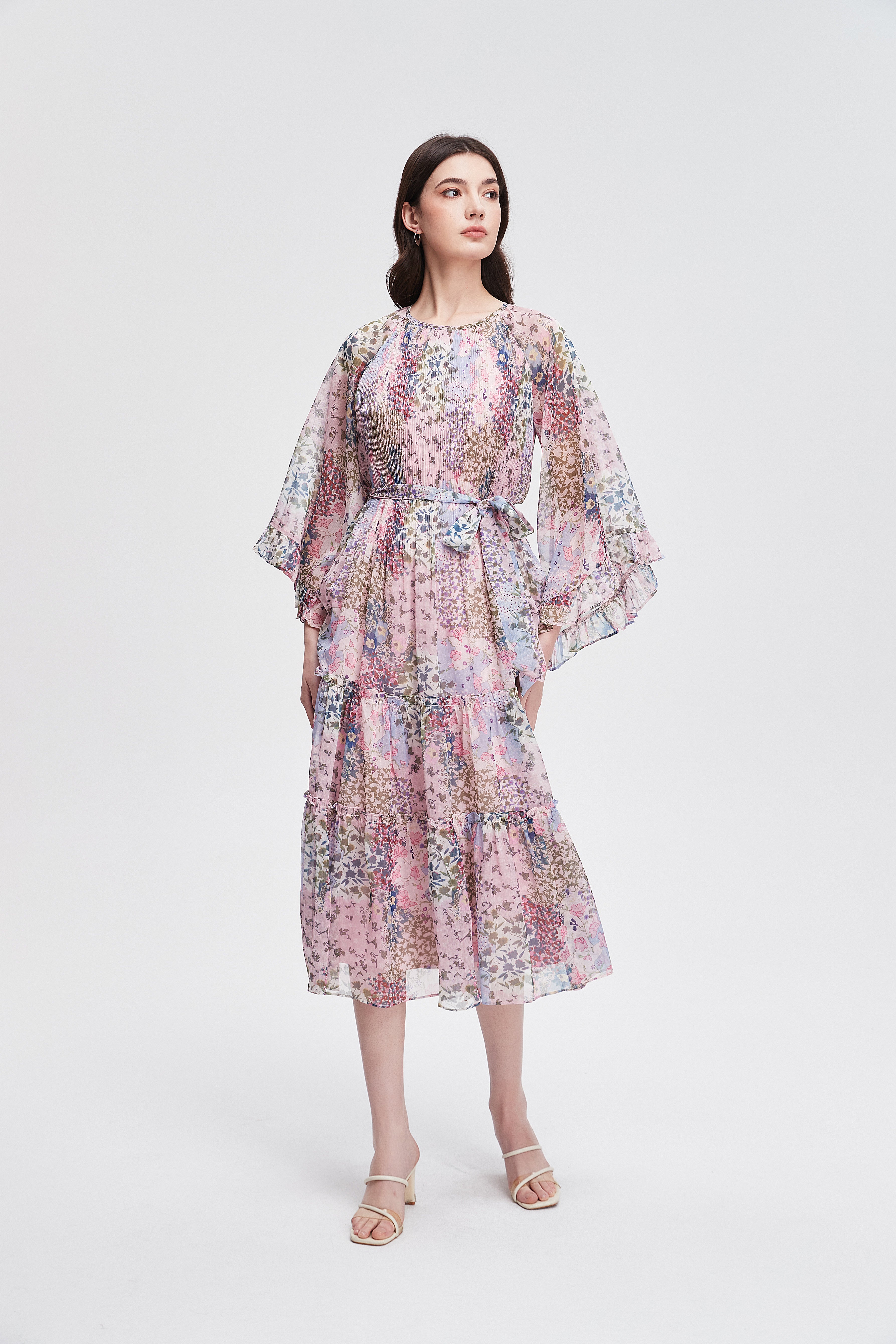 long-sleeved pleated midi dress