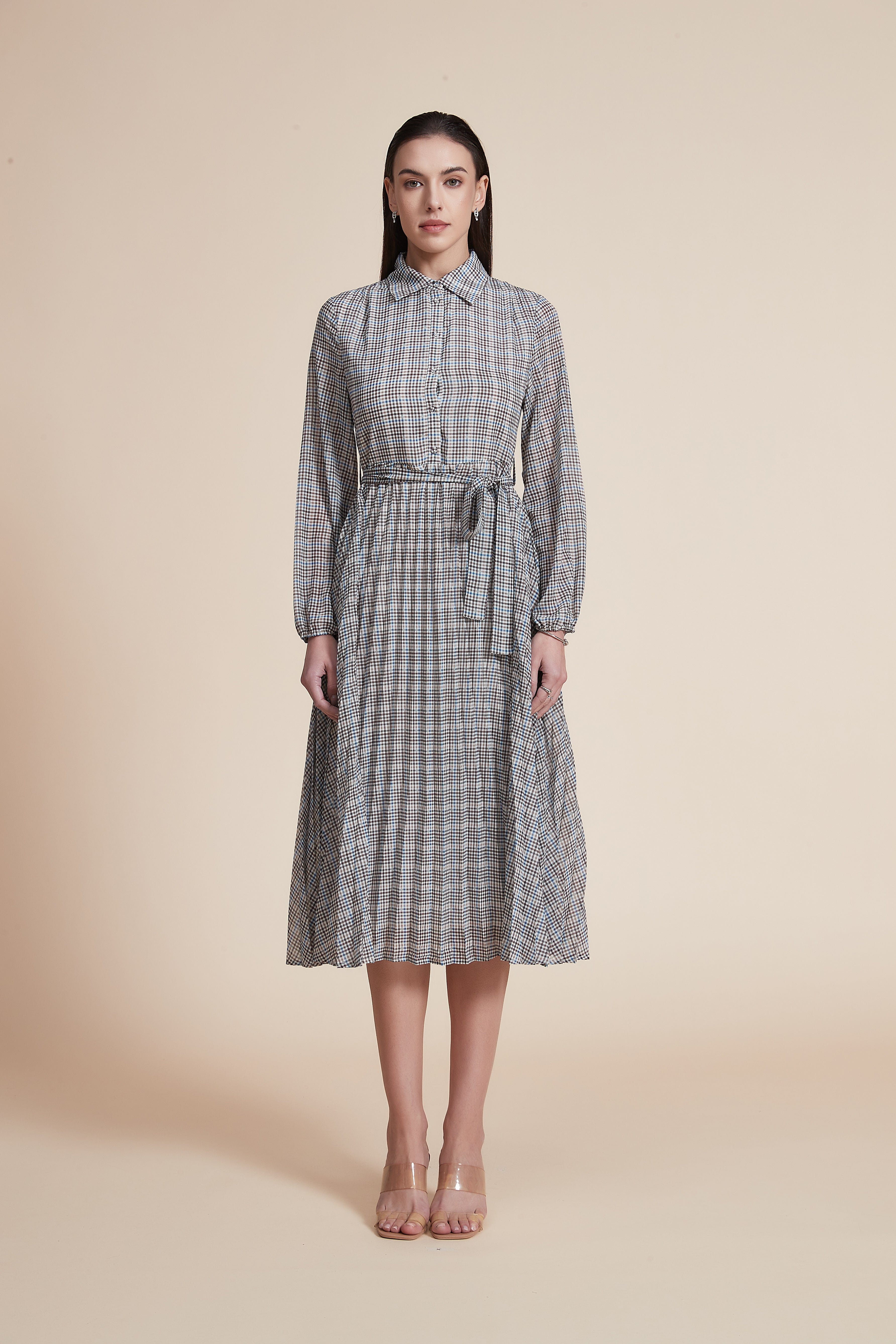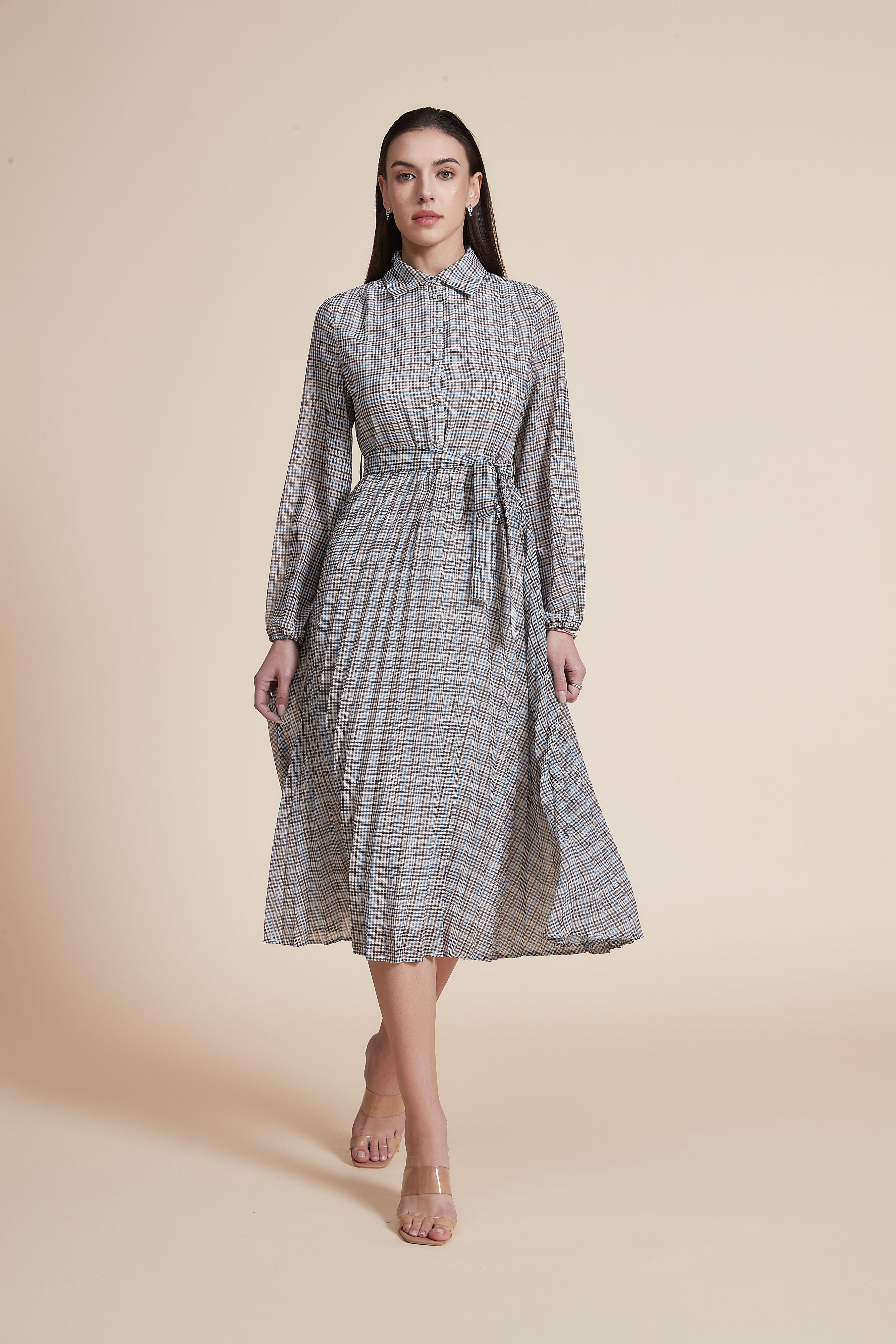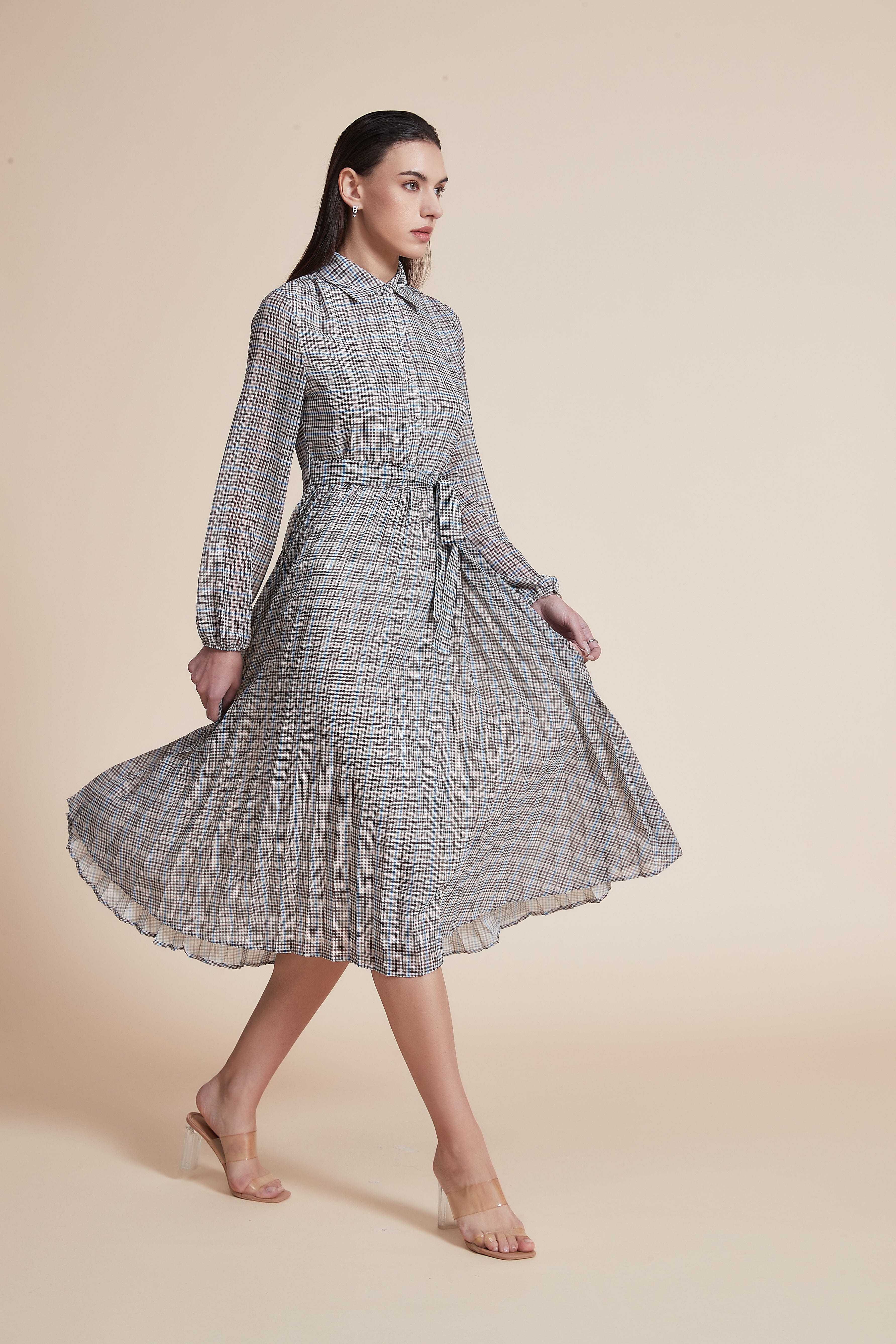 This multicolor plaid midi dress is a polished wardrobe essential that brings tailored office style with effortless comfort. Cut in a flattering A-line silhouette with a defined belted waist, the regular-fit shape skims the body while allowing movement, and the shirt collar with button closure creates a smart, professional neckline. Crafted from 100% polyester, the medium-weight fabric is wrinkle-resistant and easy-care for busy workweeks. Long sleeves provide coverage for all seasons and the unlined construction keeps the feel light for layered styling. Pocketless refinement and a midi length offer a streamlined look that pairs perfectly with loafers for meetings or pumps for presentations. From client calls to after-work drinks, this versatile piece by Yola transitions seamlessly — shop it at Fashion SA today.