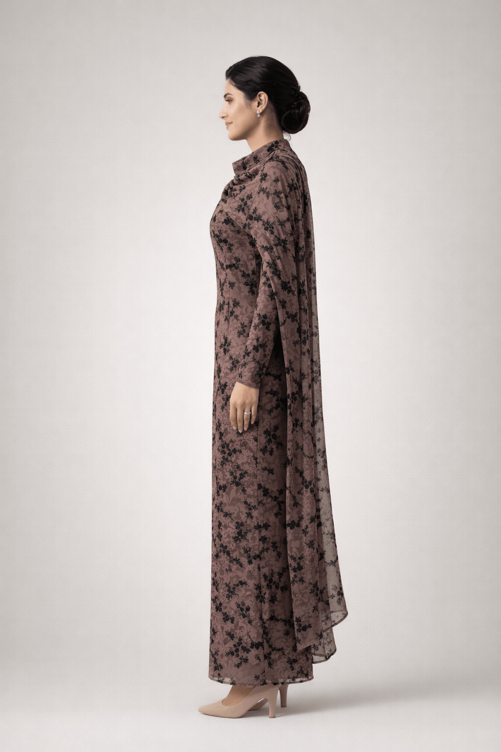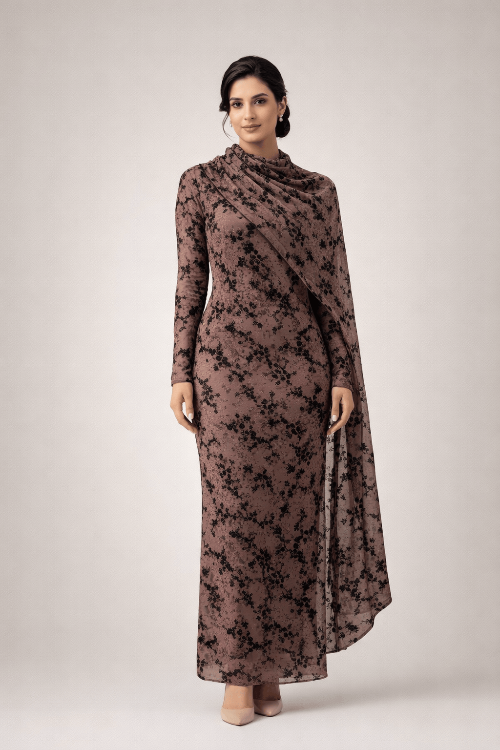Elevate your evening wardrobe with this elegant floral lace draped maxi dress, designed for refined and sophisticated occasions. Crafted from a delicate semi-sheer fabric with intricate black floral detailing, the dress features a graceful high neckline and an attached draped dupatta-style overlay that flows effortlessly from the shoulder, creating a timeless silhouette.