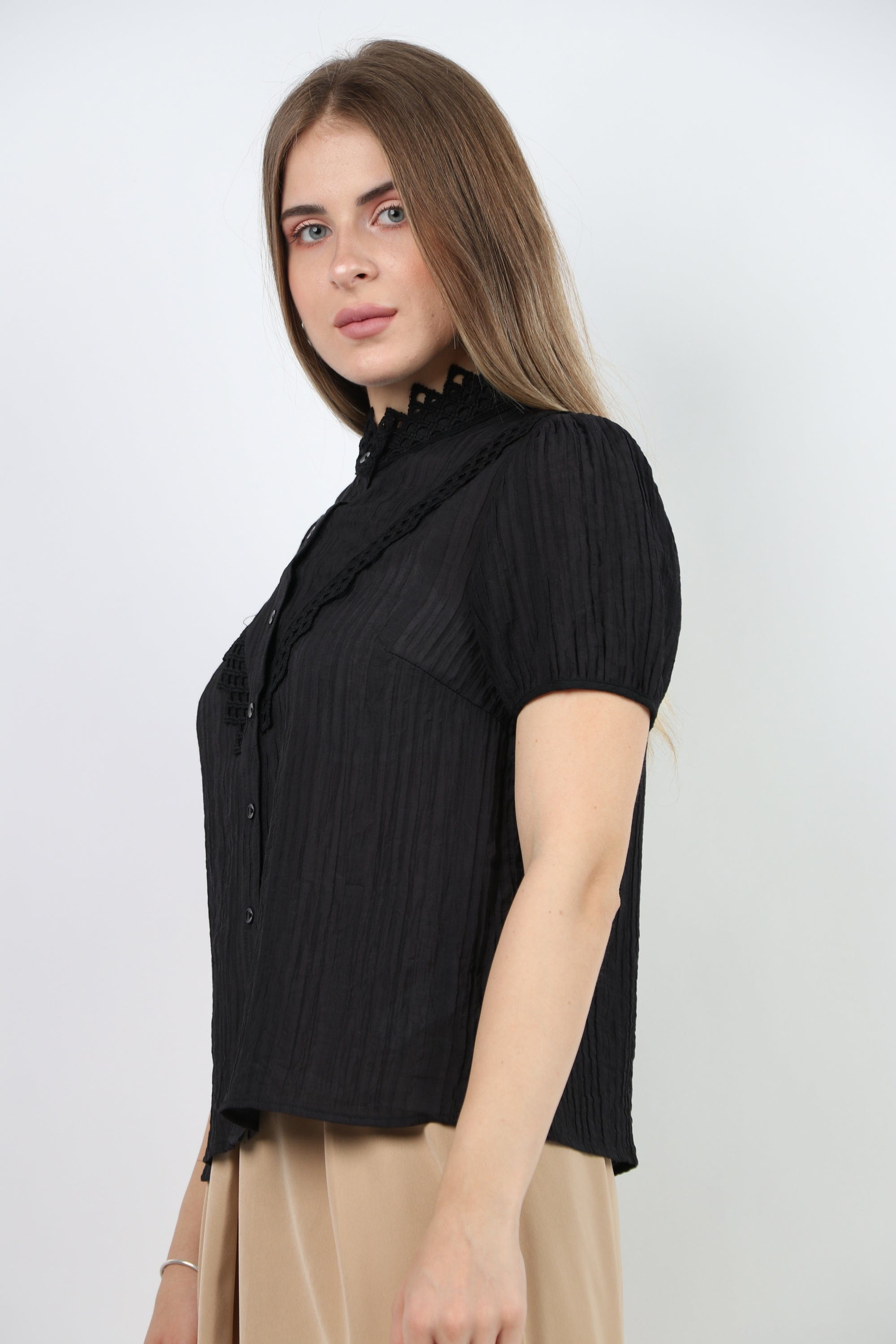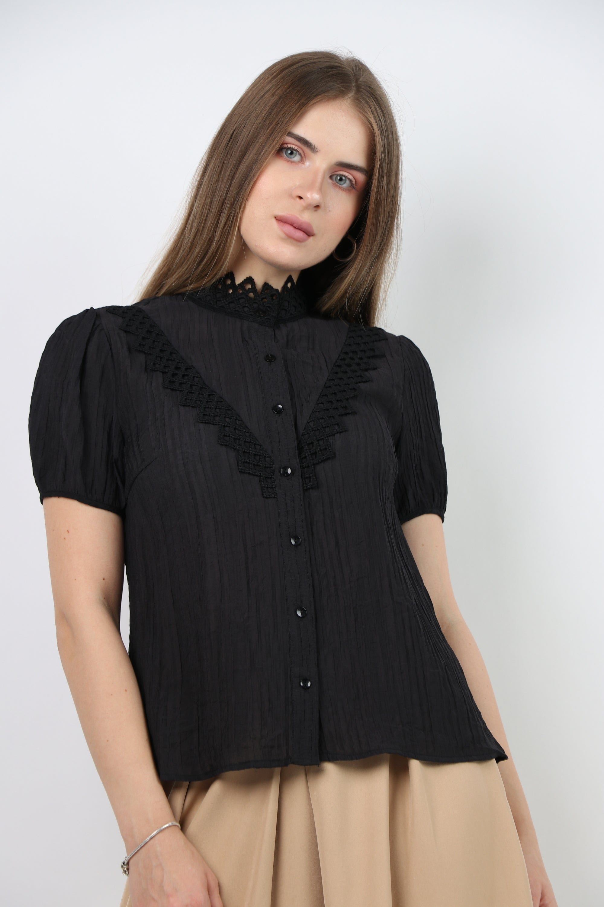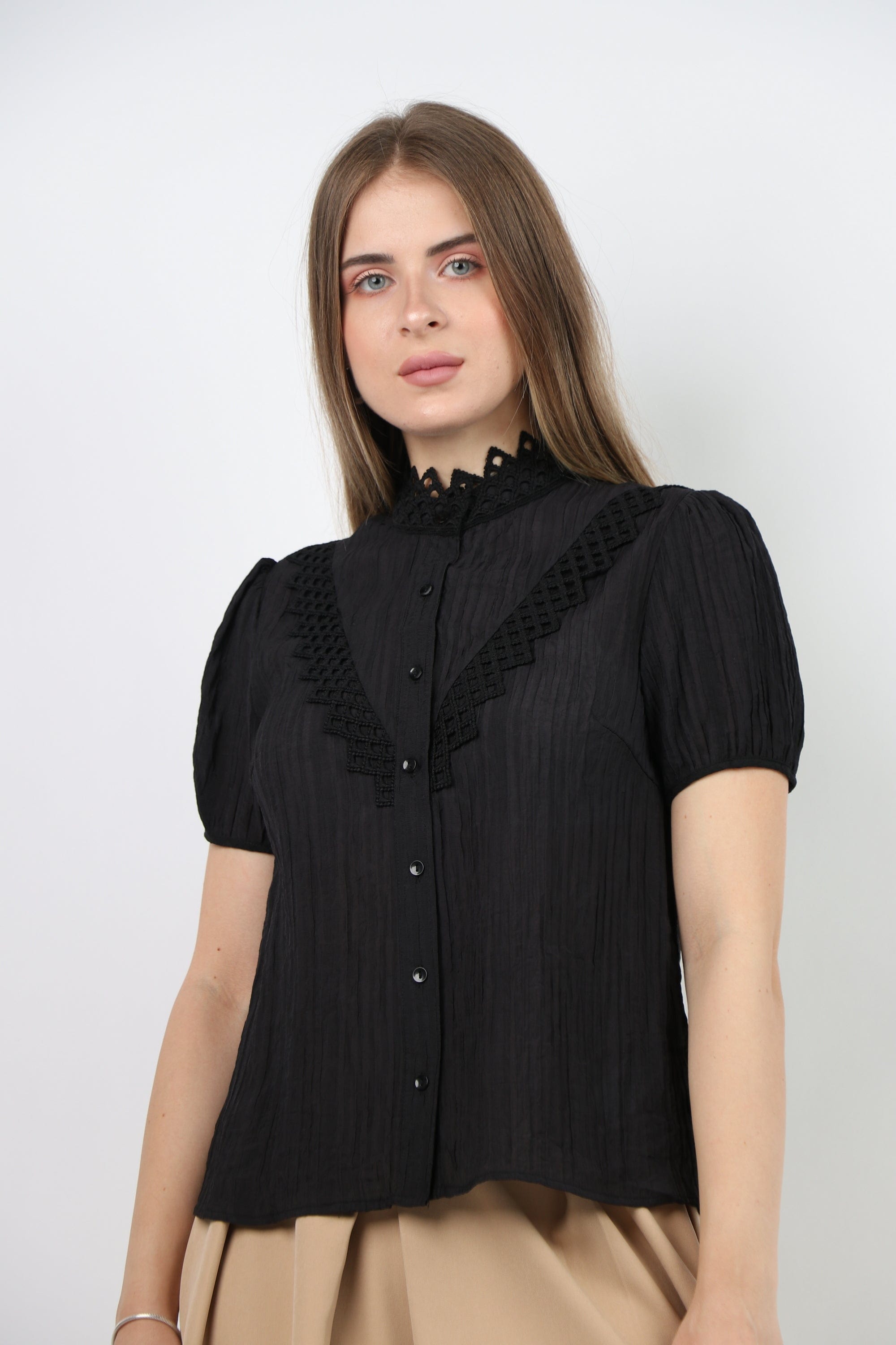 Prepare for a charming official look with an official blouse, a short sleeve decorated with women's lace from Nichii. This blouse comes in an elegant design and various colors that include black and snowy white. Made of high -quality materials to ensure perfect comfort throughout the day. It features short sleeves and great lace details that add a charming feminine touch. You can coordinate it with official pants or skirt for an integrated look on special occasions. Now get an official blouse, a short sleeve decorated with women's lace from Nichii And prepare to shine in your own style. Ask now and enjoy the best fashion from Fashion Saudi Arabia. Product number: lc208721q206