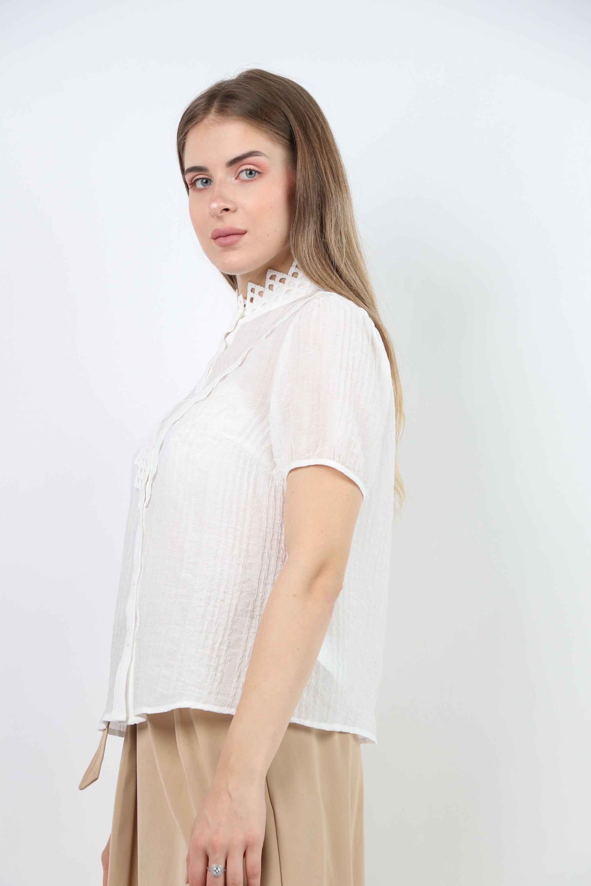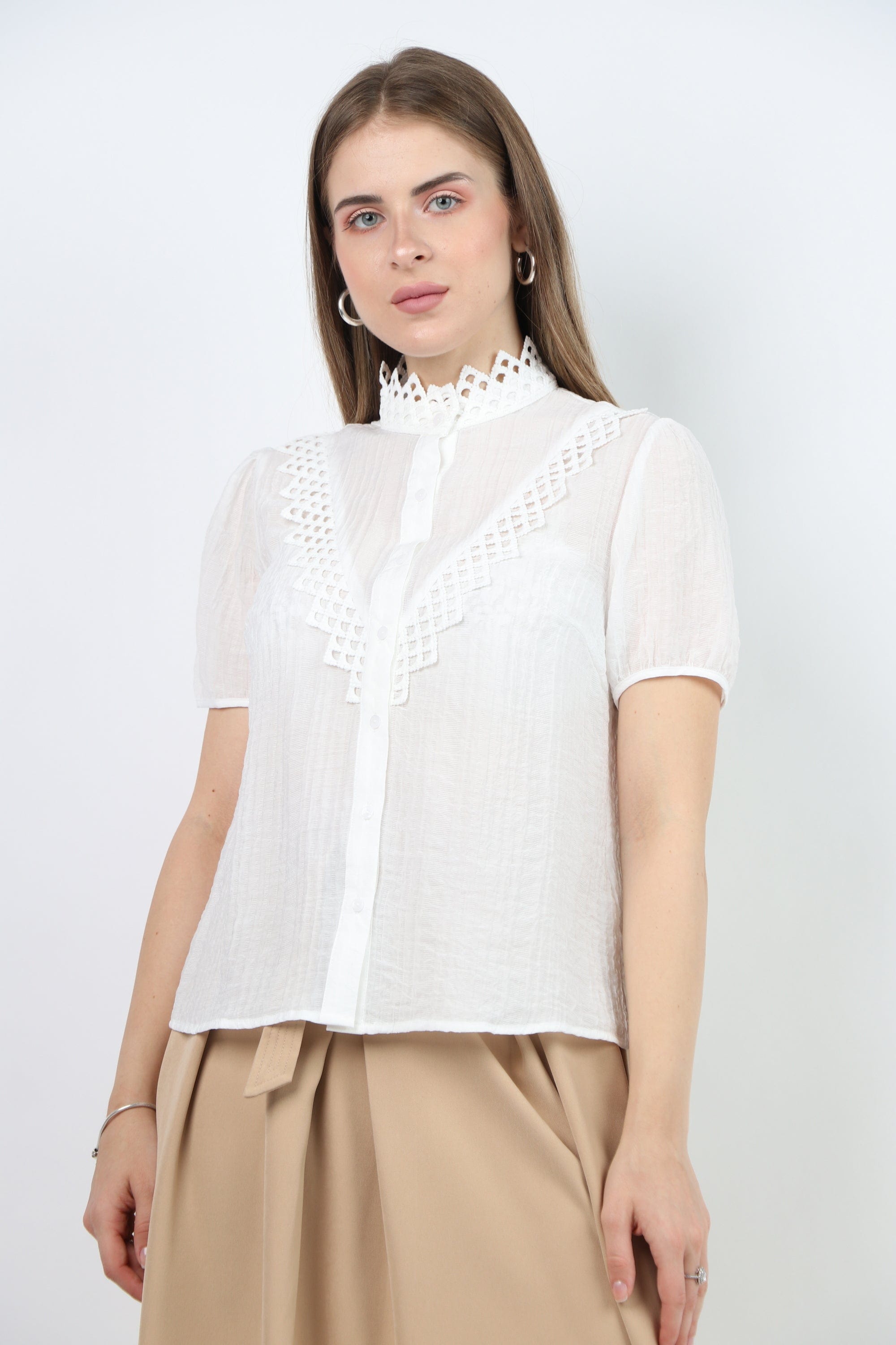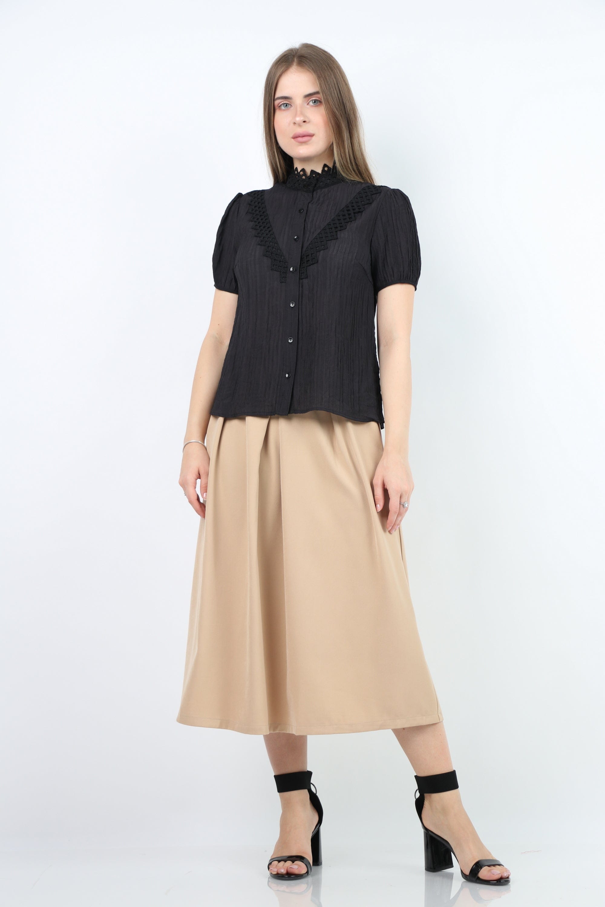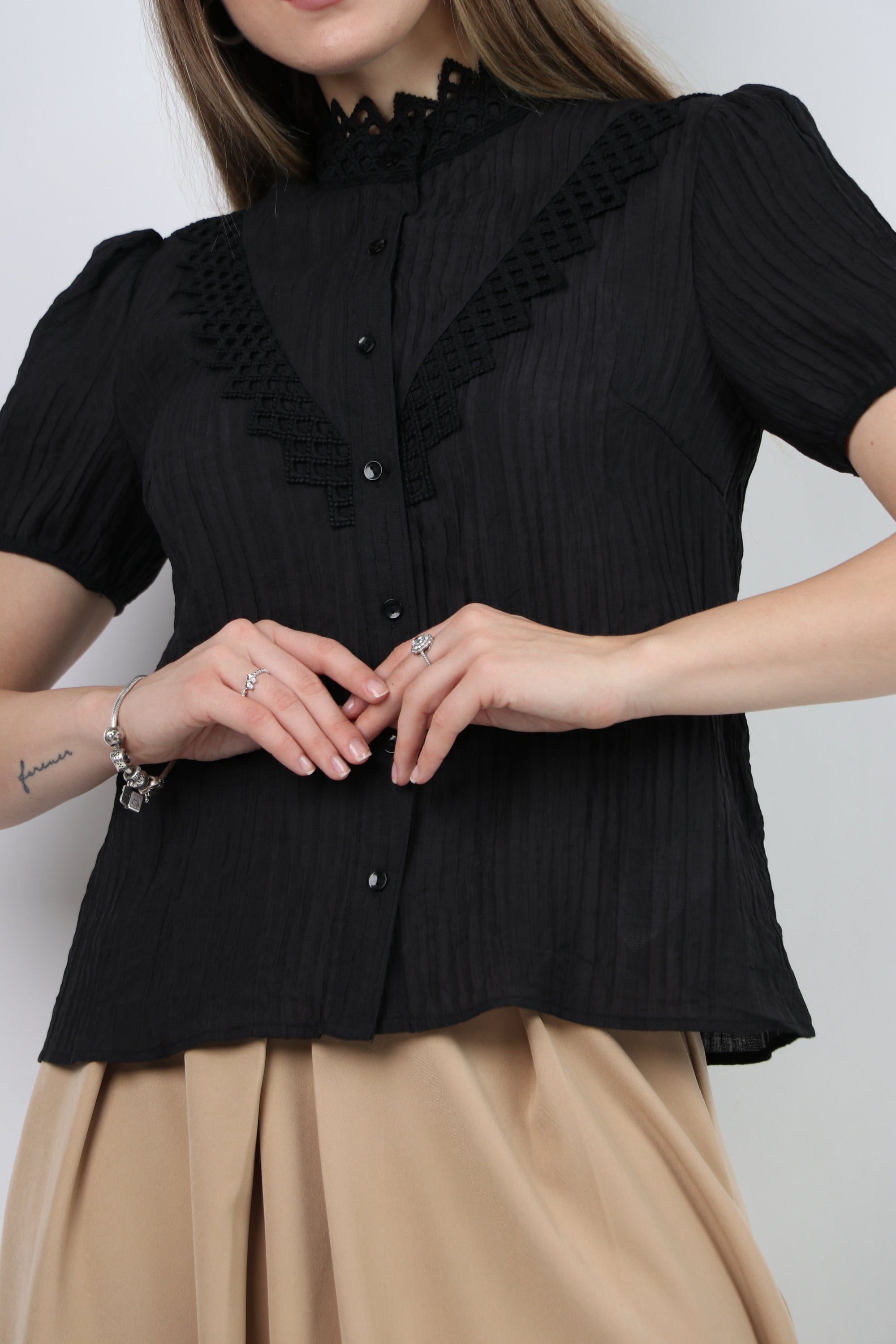 Prepare for a charming official look with an official blouse, a short sleeve decorated with women's lace from Nichii. This blouse comes in an elegant design and various colors that include black and snowy white. Made of high -quality materials to ensure perfect comfort throughout the day. It features short sleeves and great lace details that add a charming feminine touch. You can coordinate it with official pants or skirt for an integrated look on special occasions. Now get an official blouse, a short sleeve decorated with women's lace from Nichii And prepare to shine in your own style. Ask now and enjoy the best fashion from Fashion Saudi Arabia. Product number: lc208721q206