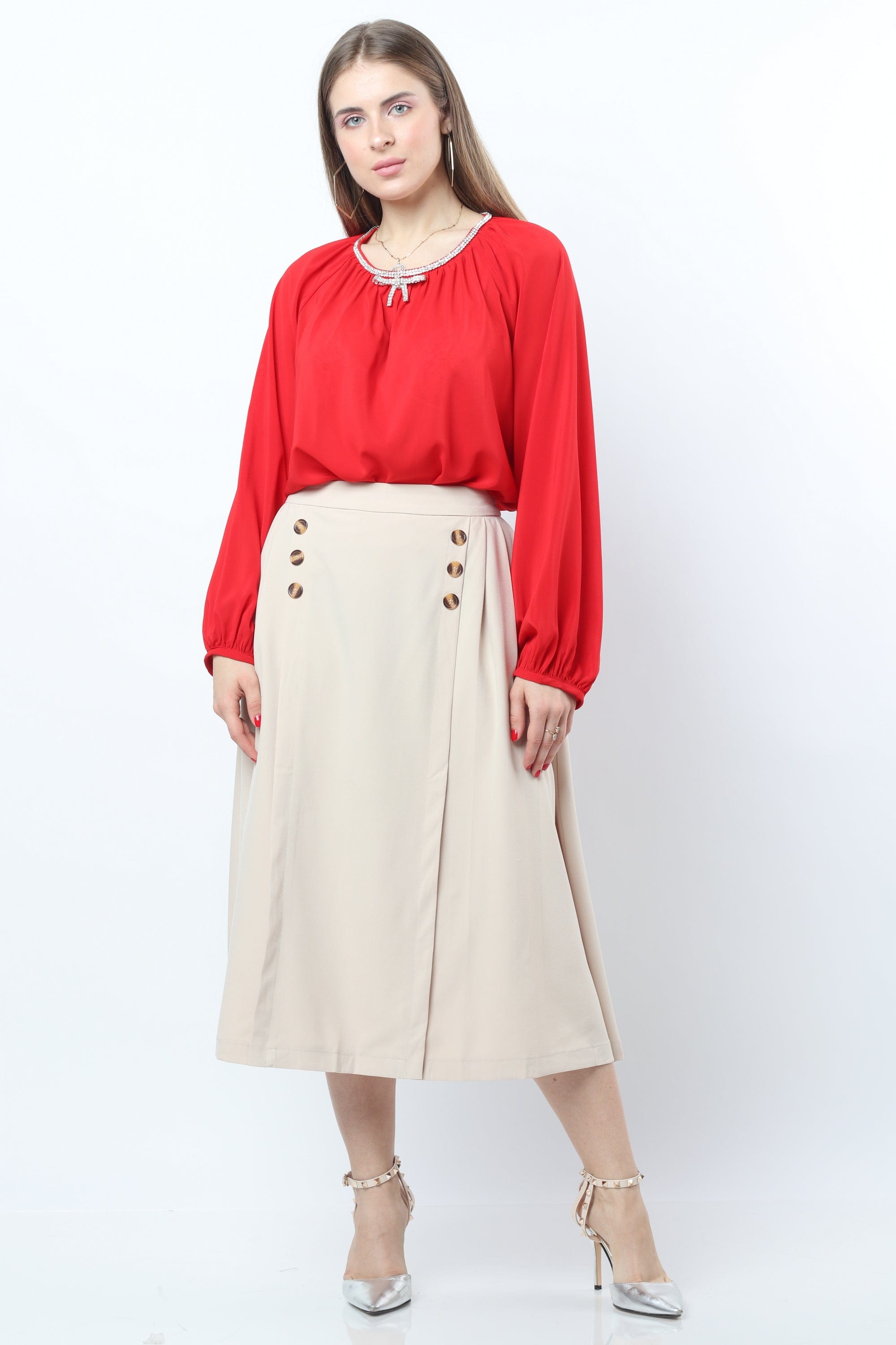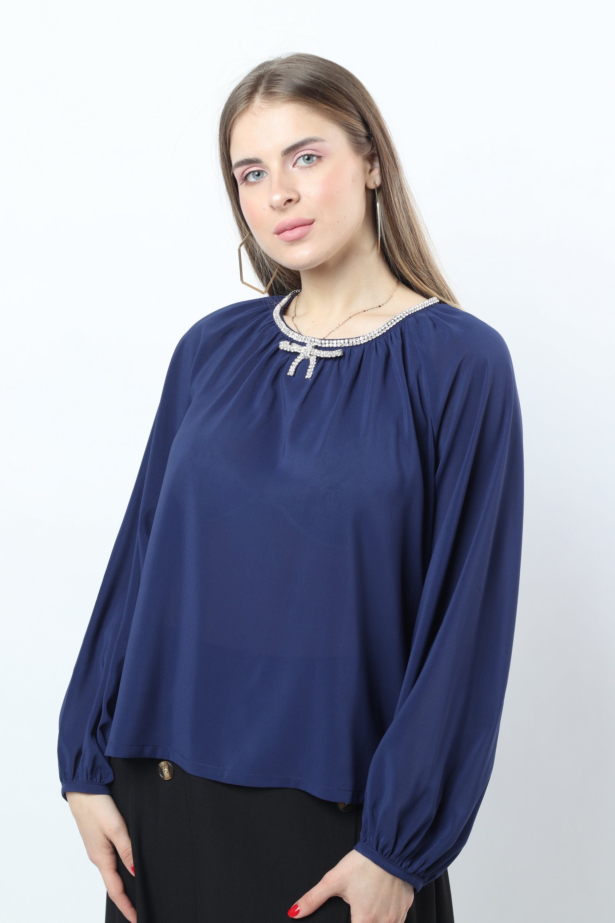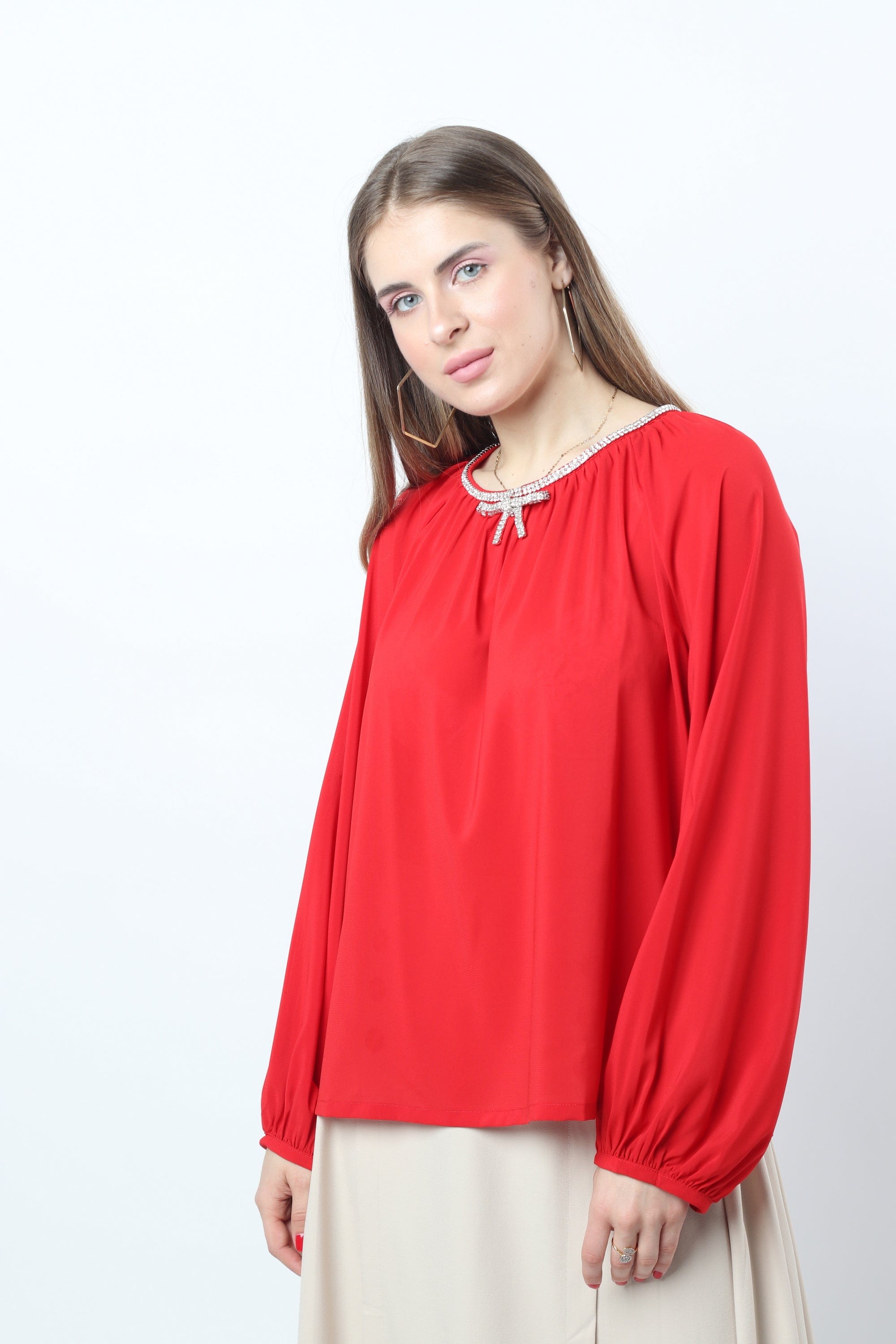 Take care of a gynecological blouse with a circular neck and long -blown sleeves. This blouse comes in an elegant and comfortable design that gives a touch of femininity to your look. This blouse is available in various colors that include red and dark blue, allowing you to choose the color that suits your personal taste. This blouse is made of high -quality materials to ensure comfort and durability. You can coordinate it with pants or skirts for an elegant look on special occasions or daily life. Now get a circular blouse for a long way, a women whispered from the Saudi Fashion and prepare for a distinctive look. Product number: ne25621q204