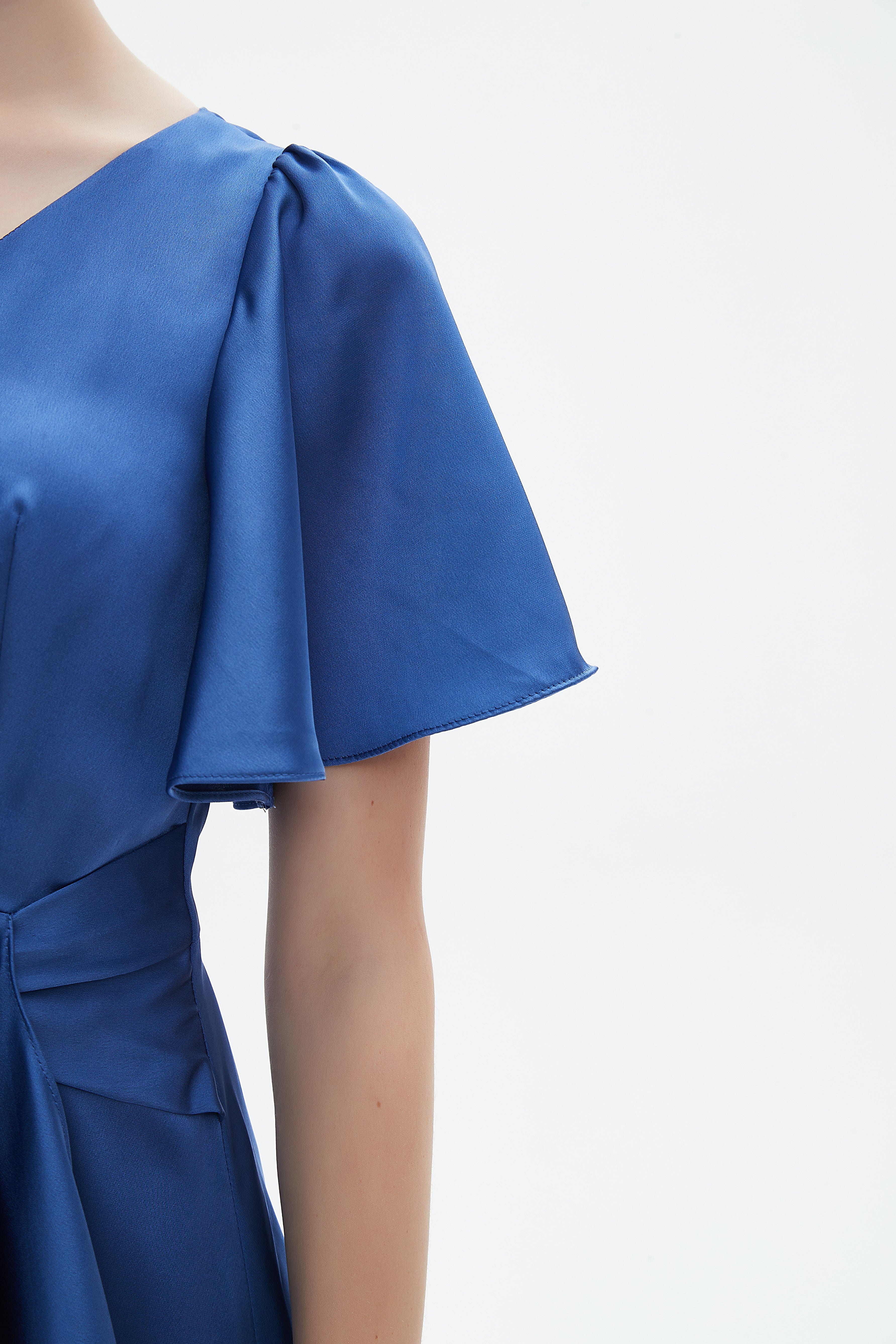 - Short flute sleeves and V-neckline for feminine proportion and interest