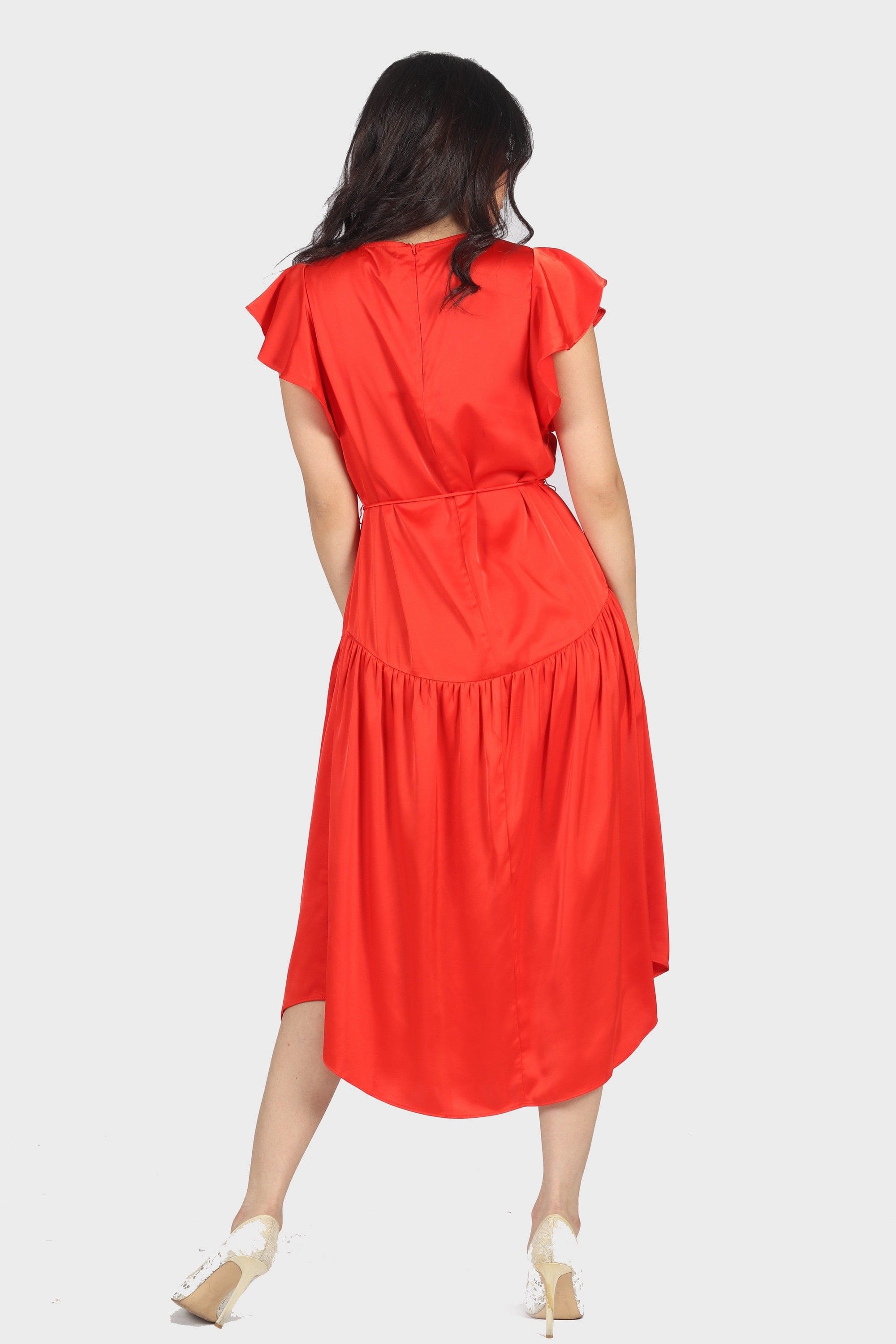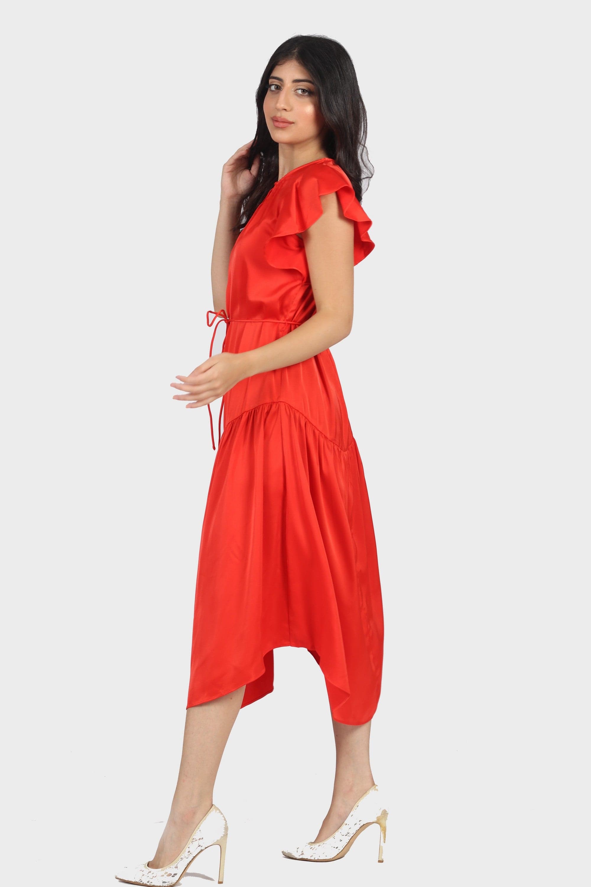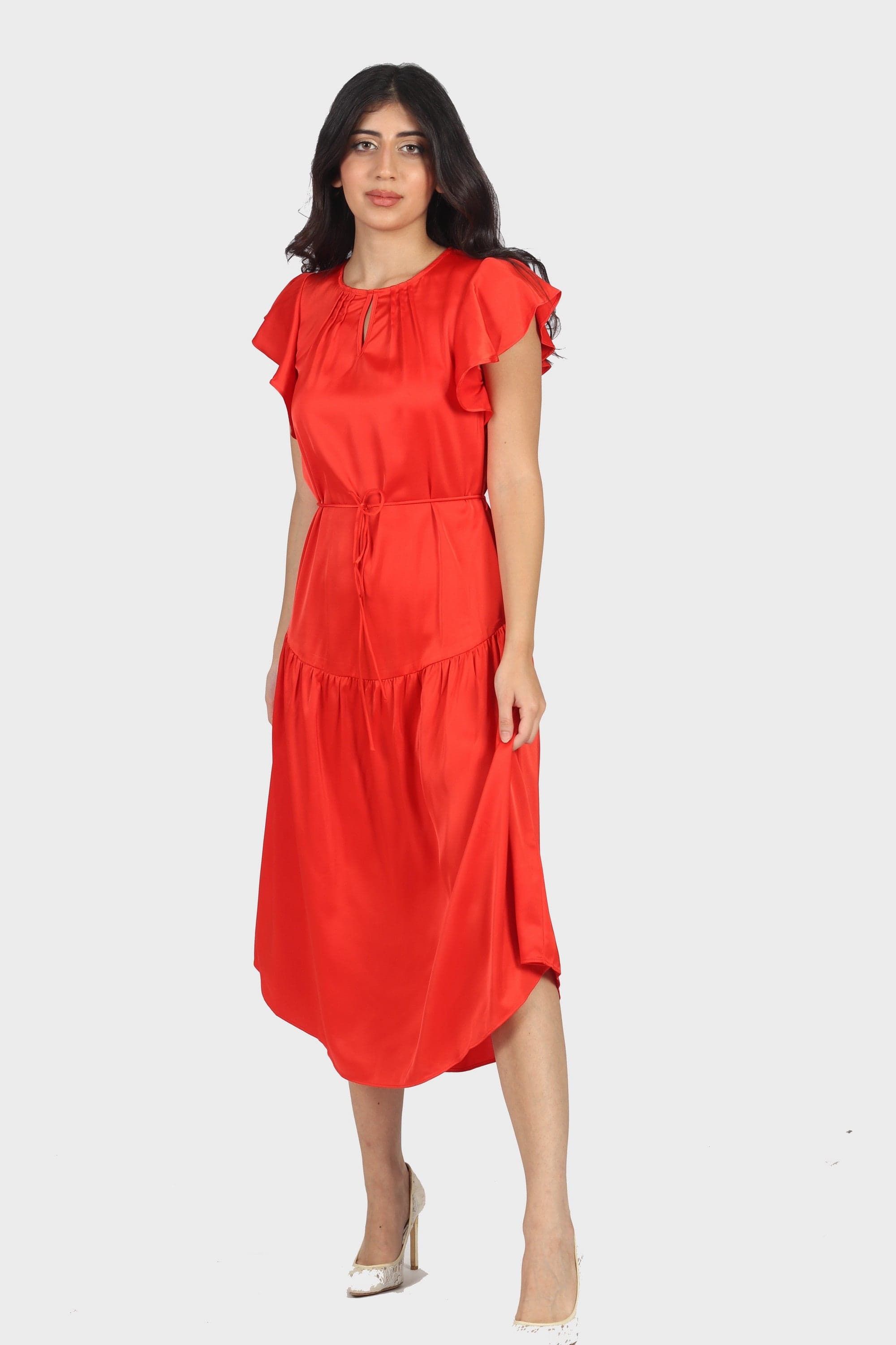 This red plain midi ruffle-sleeve dress offers effortless feminine charm with practical everyday ease. Crafted from a 95% polyester, 5% elastane blend, the A-line silhouette skims the waist and gently flares to a flattering midi length, while the belted waist defines your shape and creates a tailored look. Short ruffle sleeves and a round neck add romantic detail; the unlined, medium-weight fabric delivers all-season wear with light stretch for comfort and ease of movement. Pocketless and regular-fit, it’s ideal for casual days, weekend brunches or low-key evening plans — simply style up with heels or keep it relaxed with sneakers and a denim jacket. Discover this versatile wardrobe staple at Fashion SA and shop the Red Plain Midi Ruffle-Sleeve Dress now.