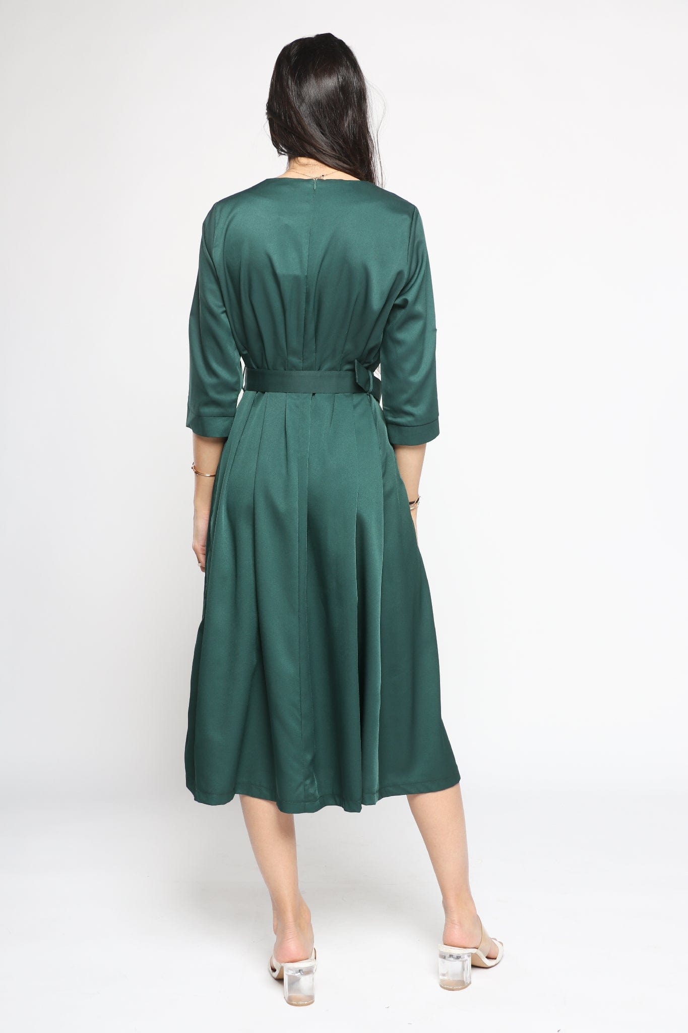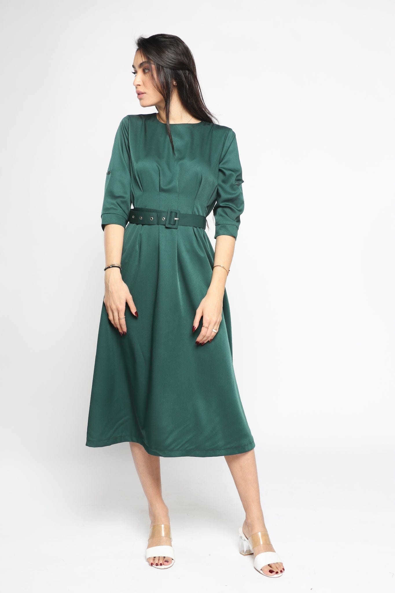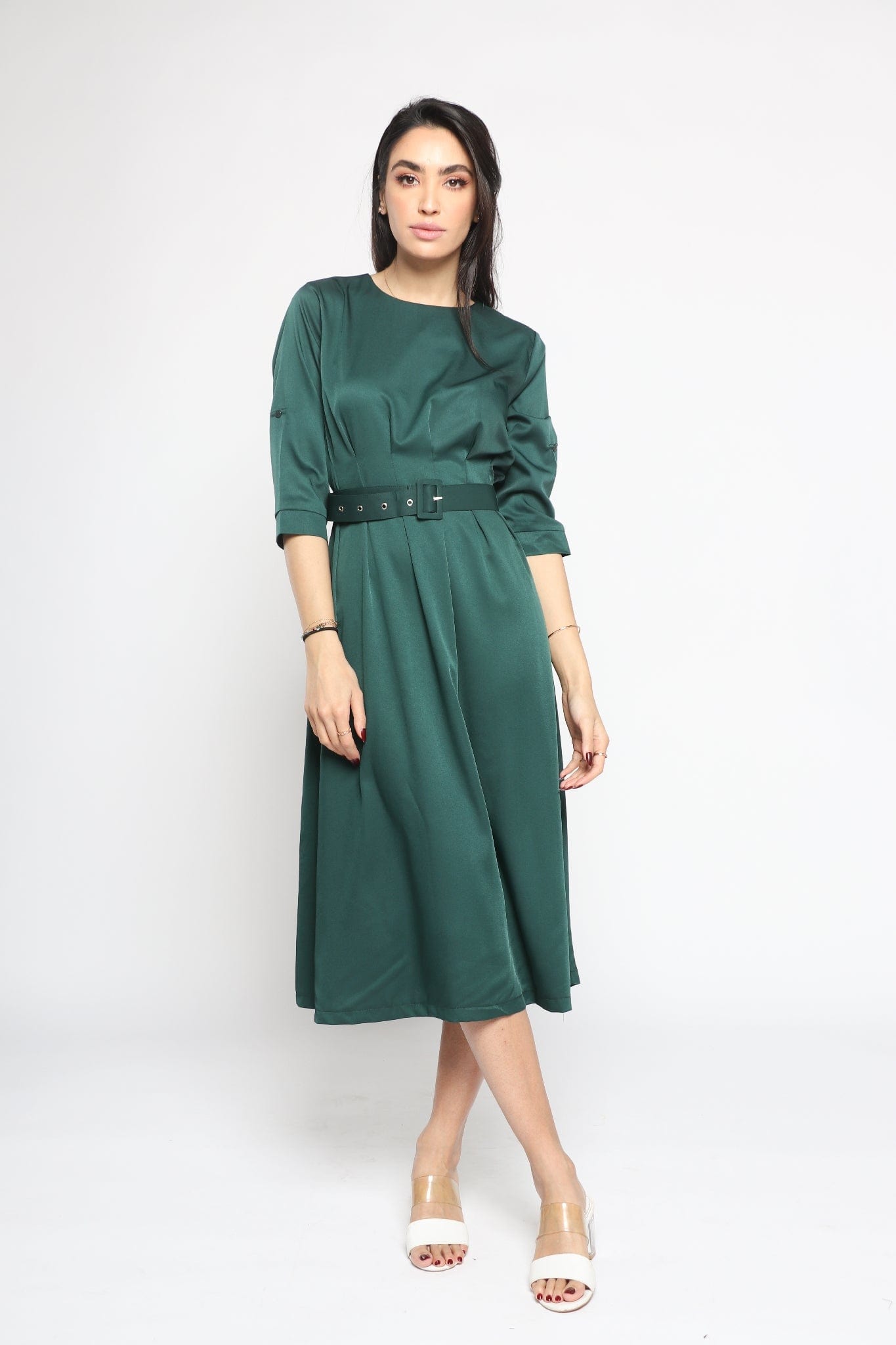 Effortlessly polished and endlessly wearable, the Green Solid Midi Belted Dress is a smart wardrobe staple that transitions from boardroom meetings to client dinners with ease. Cut in a flattering A-line silhouette, the midi length and three-quarter sleeves create a balanced, professional profile while the round neck keeps the neckline clean and modern. Crafted from a stretch-rich 95% polyester, 5% elastane blend, the medium-weight fabric offers wrinkle resistance, gentle recovery and comfortable movement in all seasons. Unlined and pocketless for a streamlined fit, the self-fabric belt defines the waist and adjusts the regular fit to your shape. Whether paired with a tailored blazer for the office or ankle boots for after-work drinks, this plain green dress is a versatile piece. Shop this essential at Fashion SA and elevate your smart dressing — add to cart now.