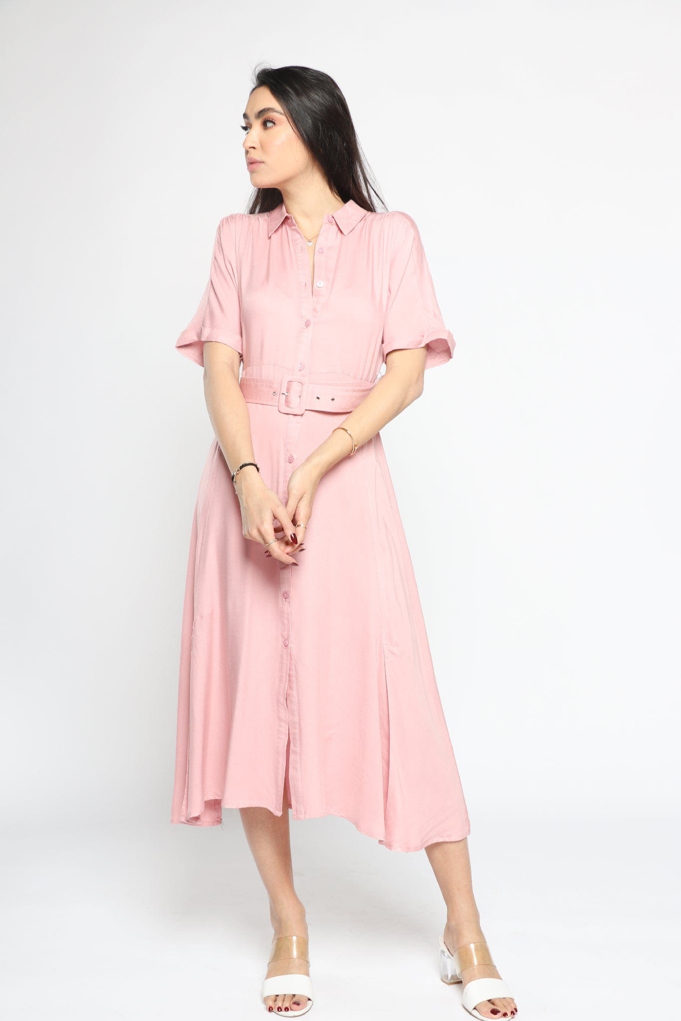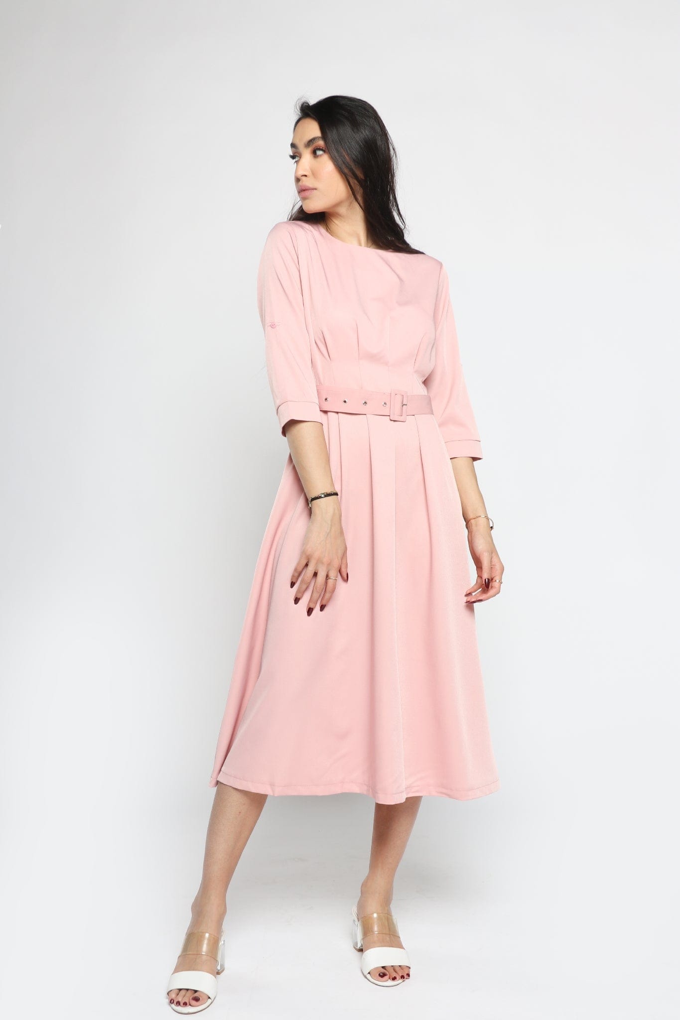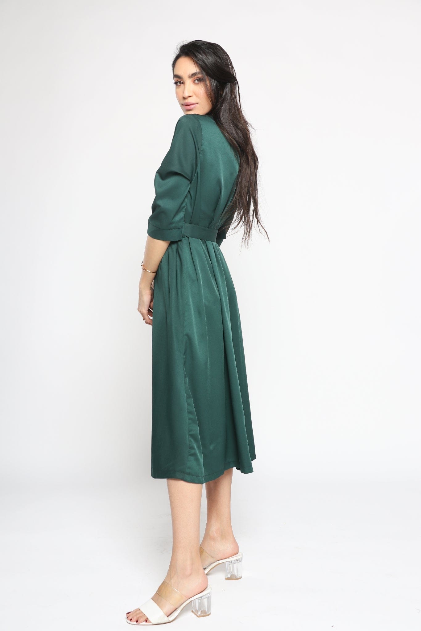 Effortlessly polished and endlessly wearable, the Green Solid Midi Belted Dress is a smart wardrobe staple that transitions from boardroom meetings to client dinners with ease. Cut in a flattering A-line silhouette, the midi length and three-quarter sleeves create a balanced, professional profile while the round neck keeps the neckline clean and modern. Crafted from a stretch-rich 95% polyester, 5% elastane blend, the medium-weight fabric offers wrinkle resistance, gentle recovery and comfortable movement in all seasons. Unlined and pocketless for a streamlined fit, the self-fabric belt defines the waist and adjusts the regular fit to your shape. Whether paired with a tailored blazer for the office or ankle boots for after-work drinks, this plain green dress is a versatile piece. Shop this essential at Fashion SA and elevate your smart dressing — add to cart now.