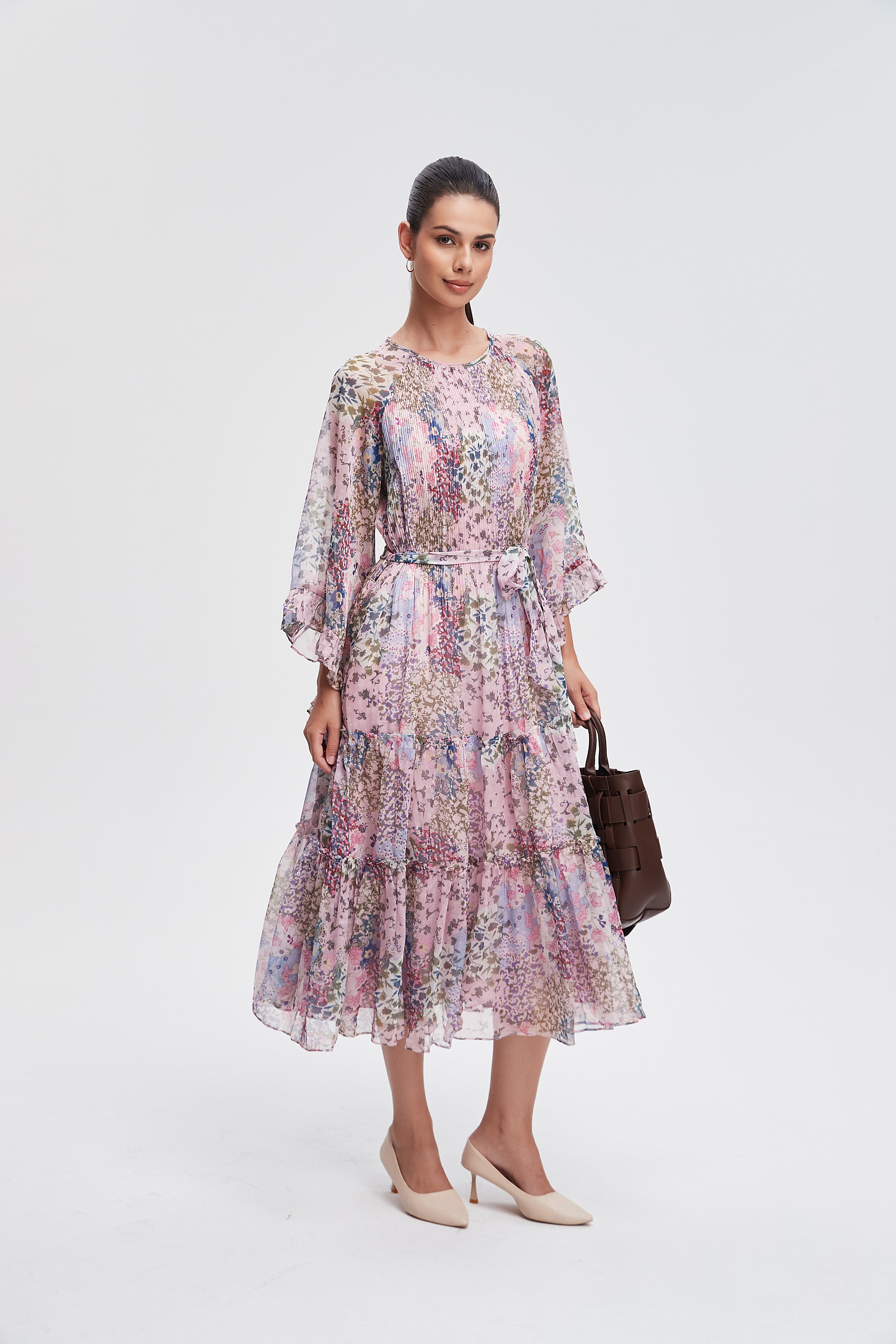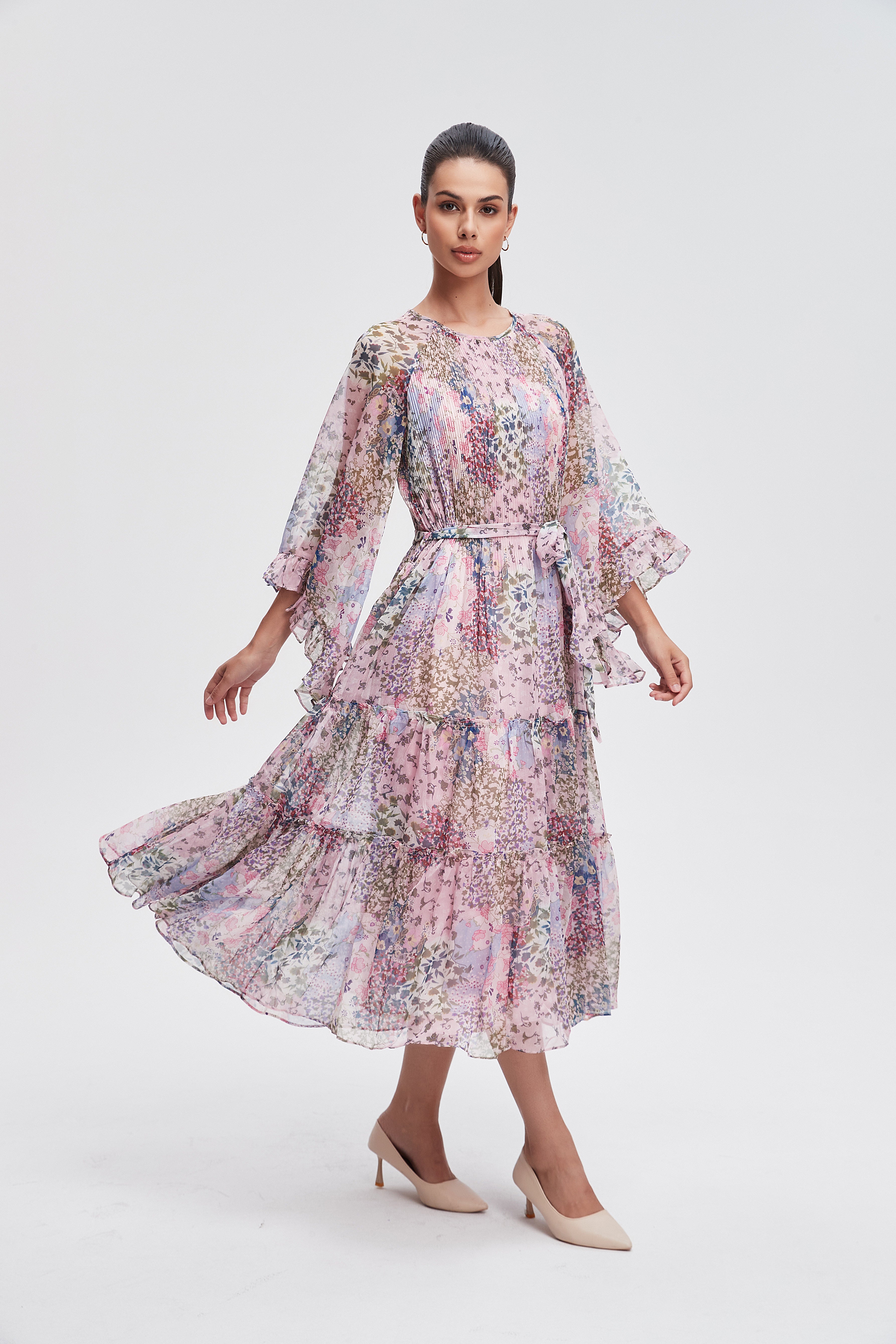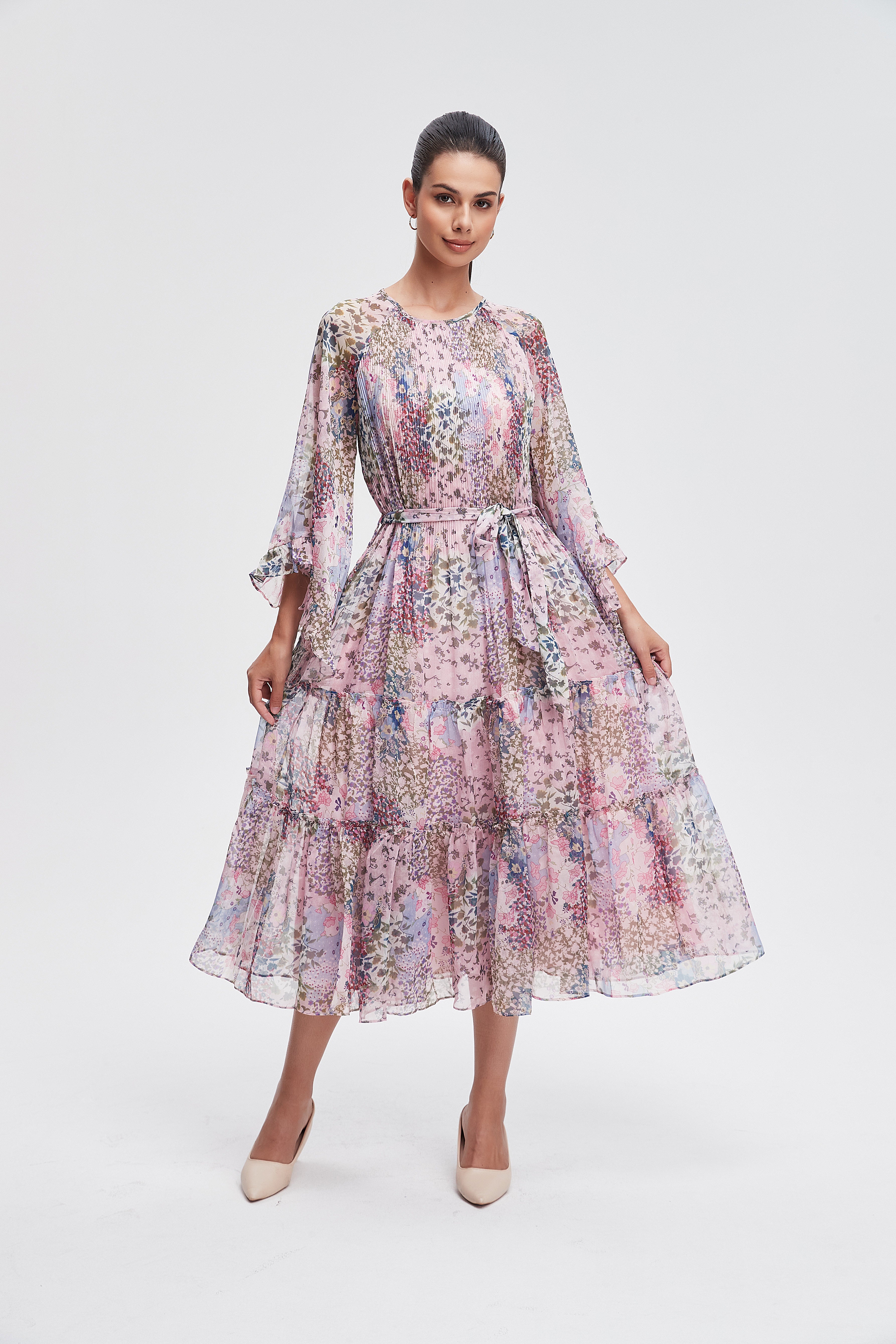 Embrace the essence of femininity with our stunning 3/4 sleeve floral midi dress. This dress features a charming floral pattern that brings a touch of nature to your wardrobe. The flattering midi length and comfortable fit make it perfect for any occasion, from brunch with friends to a romantic evening out. Crafted with care, it combines style and comfort seamlessly. Pair it with your favorite accessories for a complete look that turns heads. Product Number: l3311