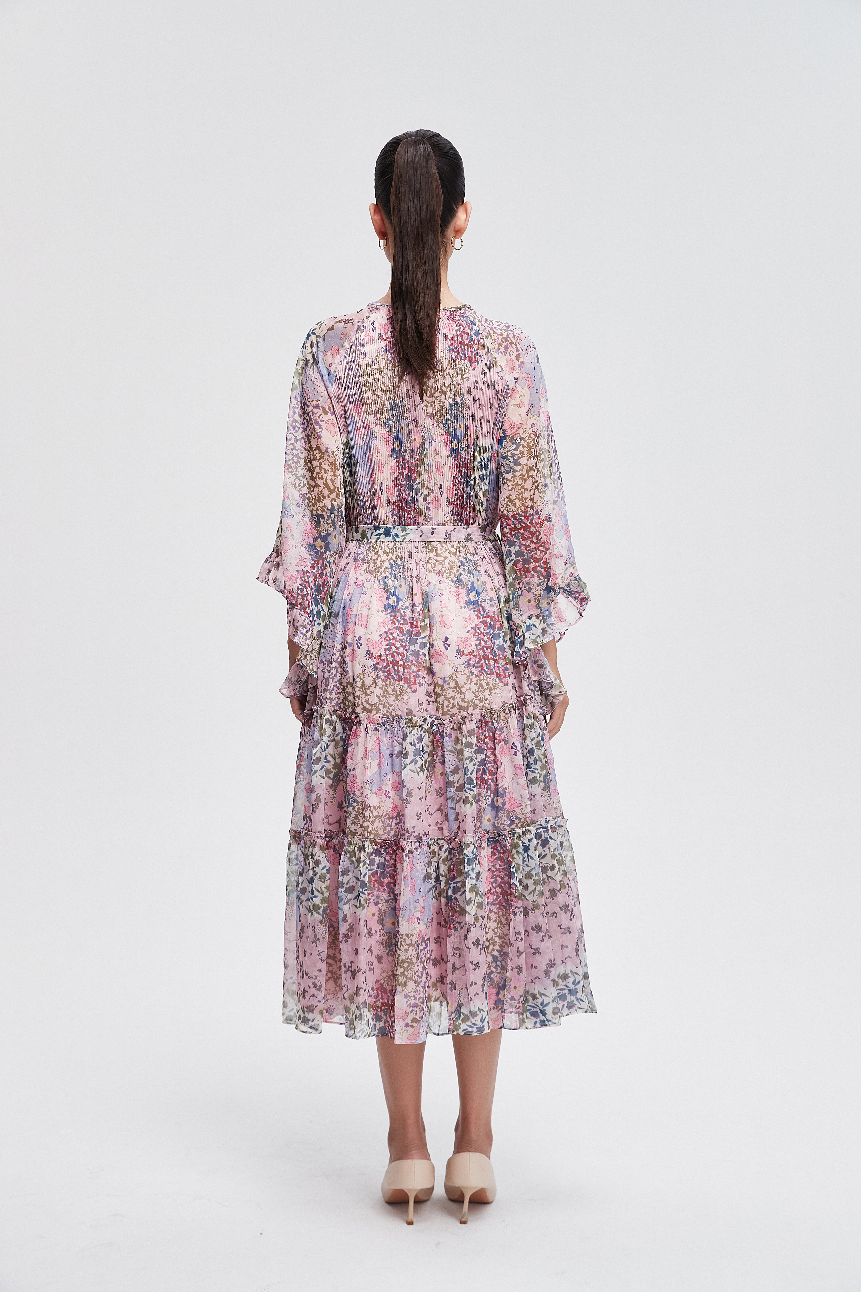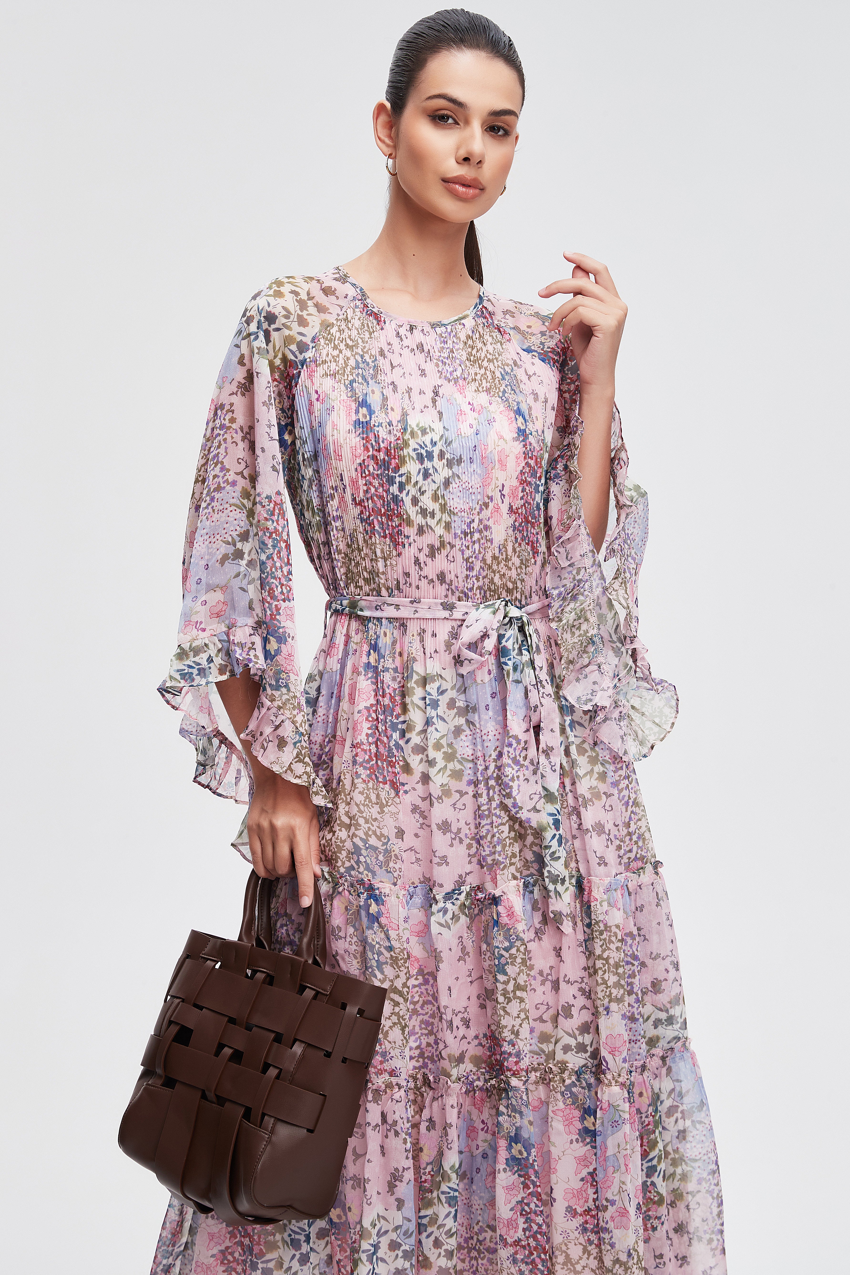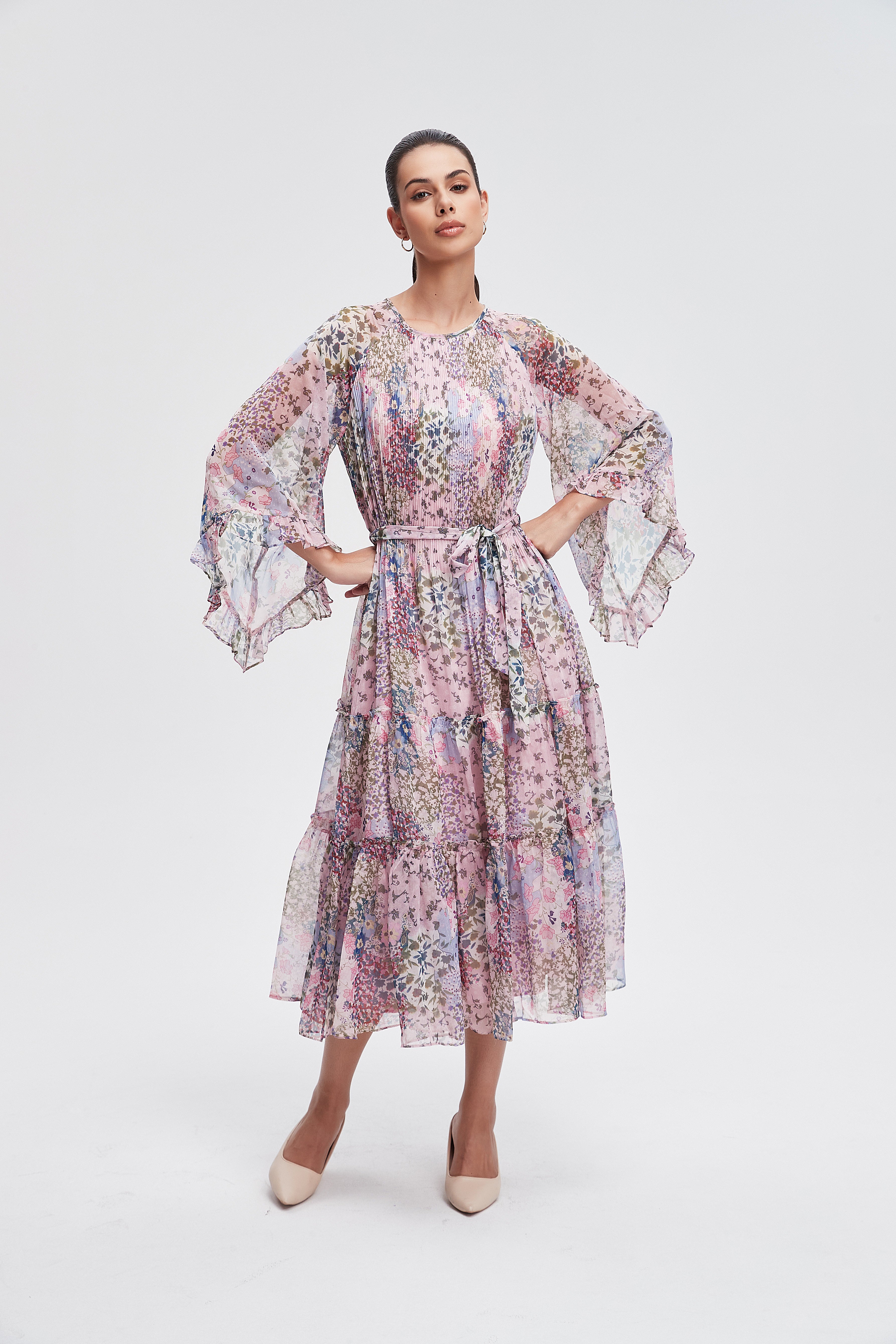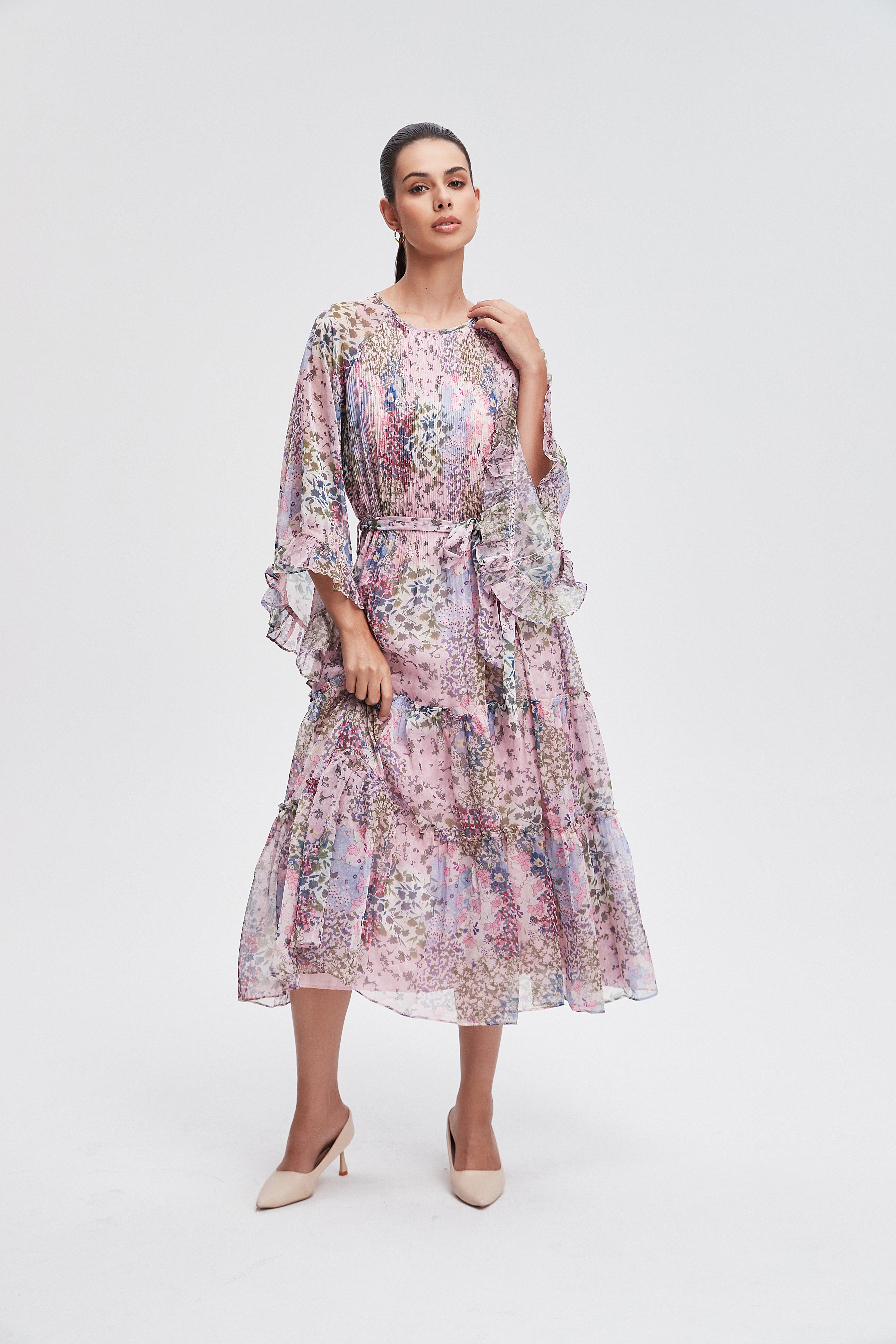 Embrace the essence of femininity with our stunning 3/4 sleeve floral midi dress. This dress features a charming floral pattern that brings a touch of nature to your wardrobe. The flattering midi length and comfortable fit make it perfect for any occasion, from brunch with friends to a romantic evening out. Crafted with care, it combines style and comfort seamlessly. Pair it with your favorite accessories for a complete look that turns heads. Product Number: l3311