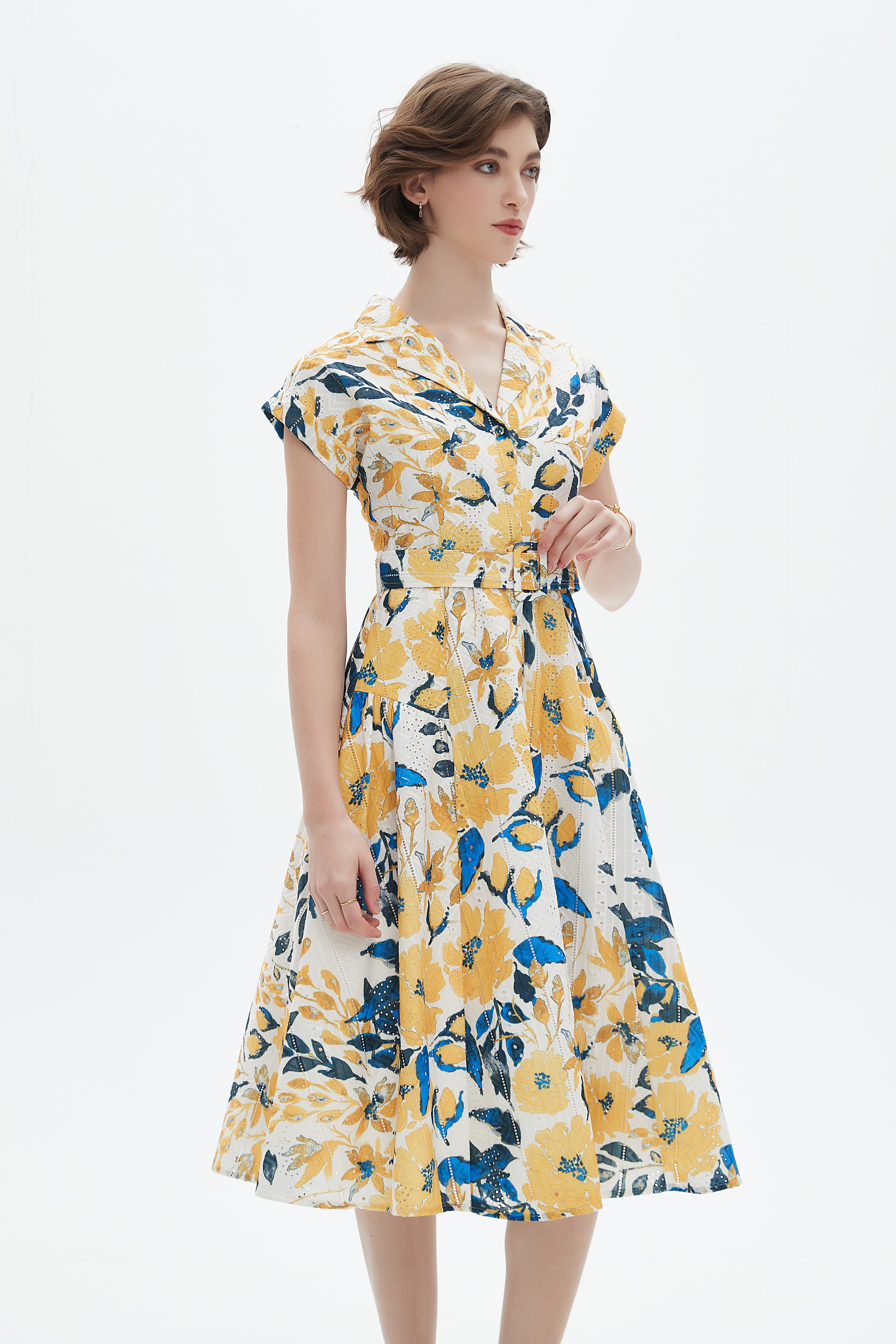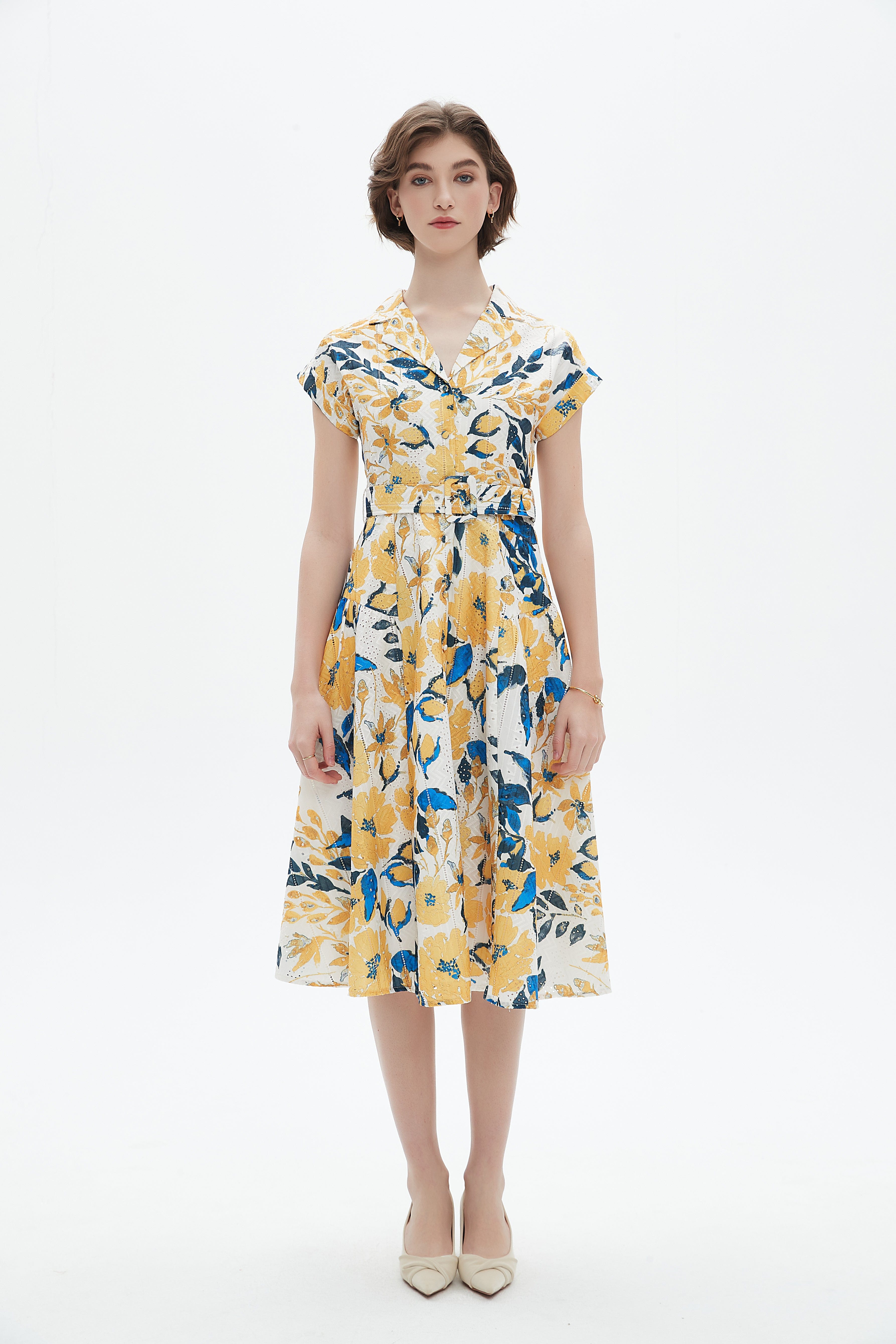 This yellow floral midi belted dress is a fresh, feminine staple that blends timeless shape with easy everyday wear. Cut in a flattering A-line silhouette from a lightweight 95% polyester, 5% cotton blend, it drapes beautifully across the waist while the included self-fabric belt defines your shape for a tailored, regular fit. The shirt collar and button-front closure lend subtle structure, while short sleeves and a breezy midi length make it ideal for spring and autumn outings. Unlined for a light, breathable feel, the multicolor floral print keeps the mood playful yet polished. Thoughtfully designed by Nichii and available at Fashion SA, this versatile dress moves seamlessly from weekend brunch to casual office days — add it to your wardrobe collection today.