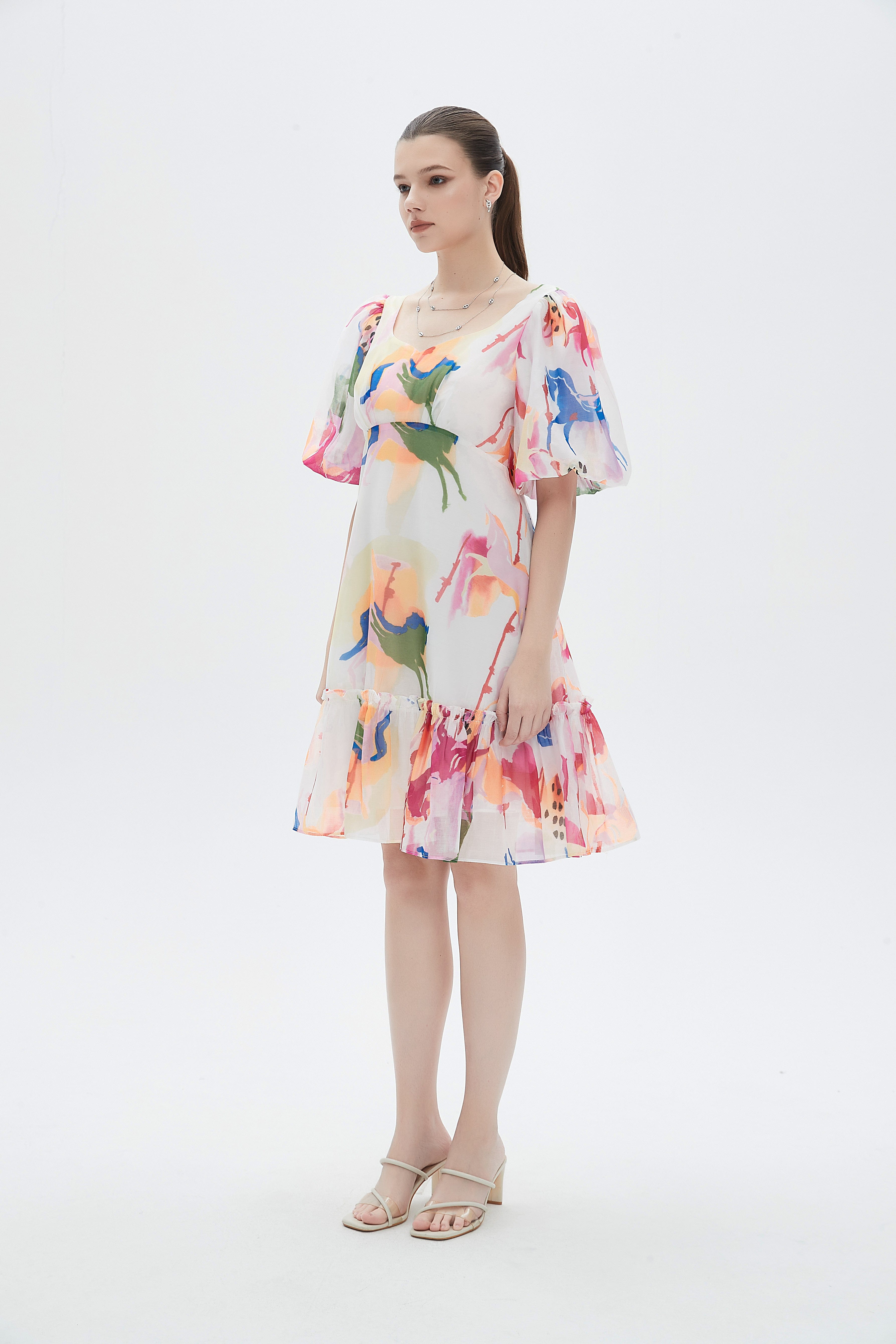 - Allover multicolor abstract print with puffed/ruffle short sleeves and round neck for feminine detail