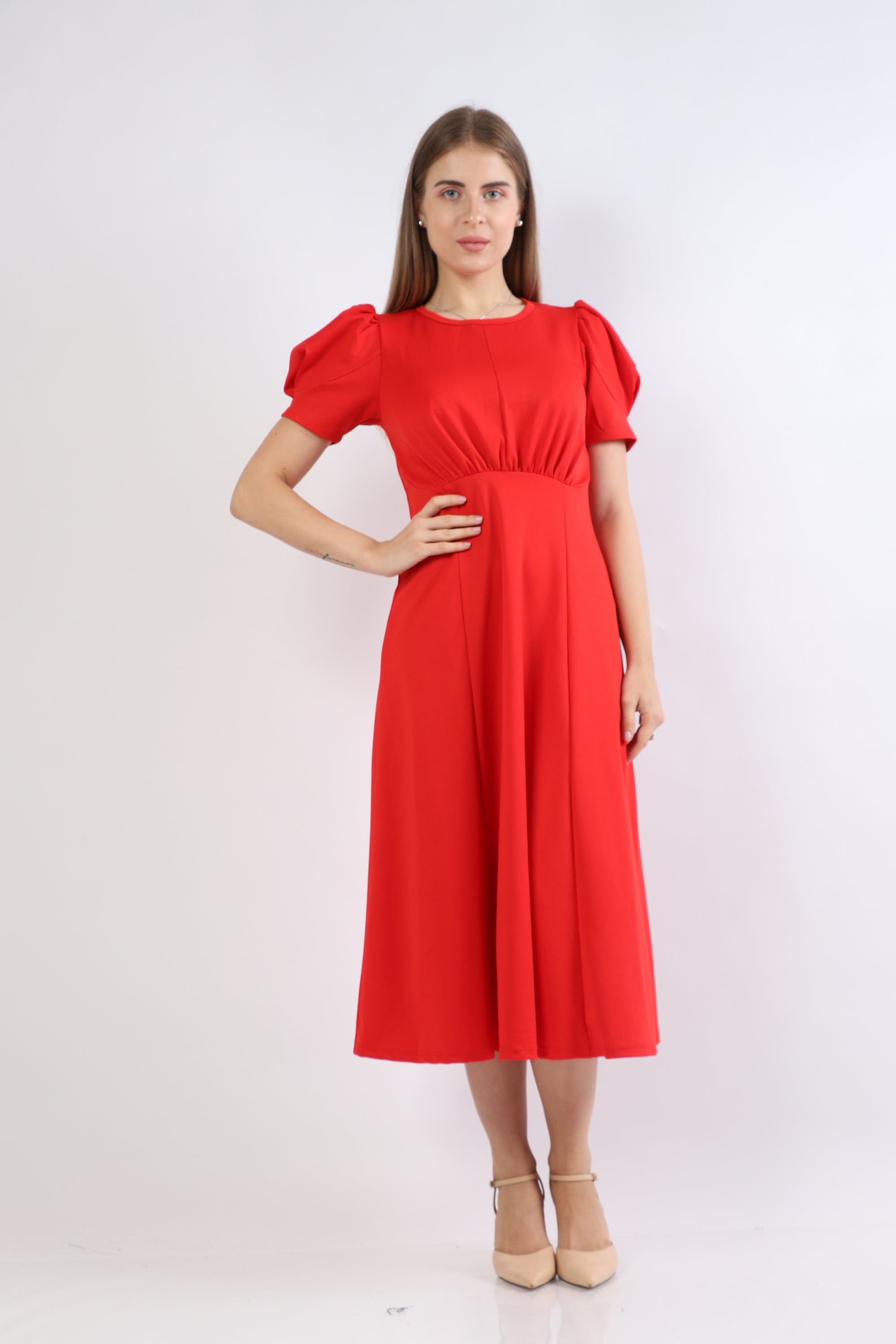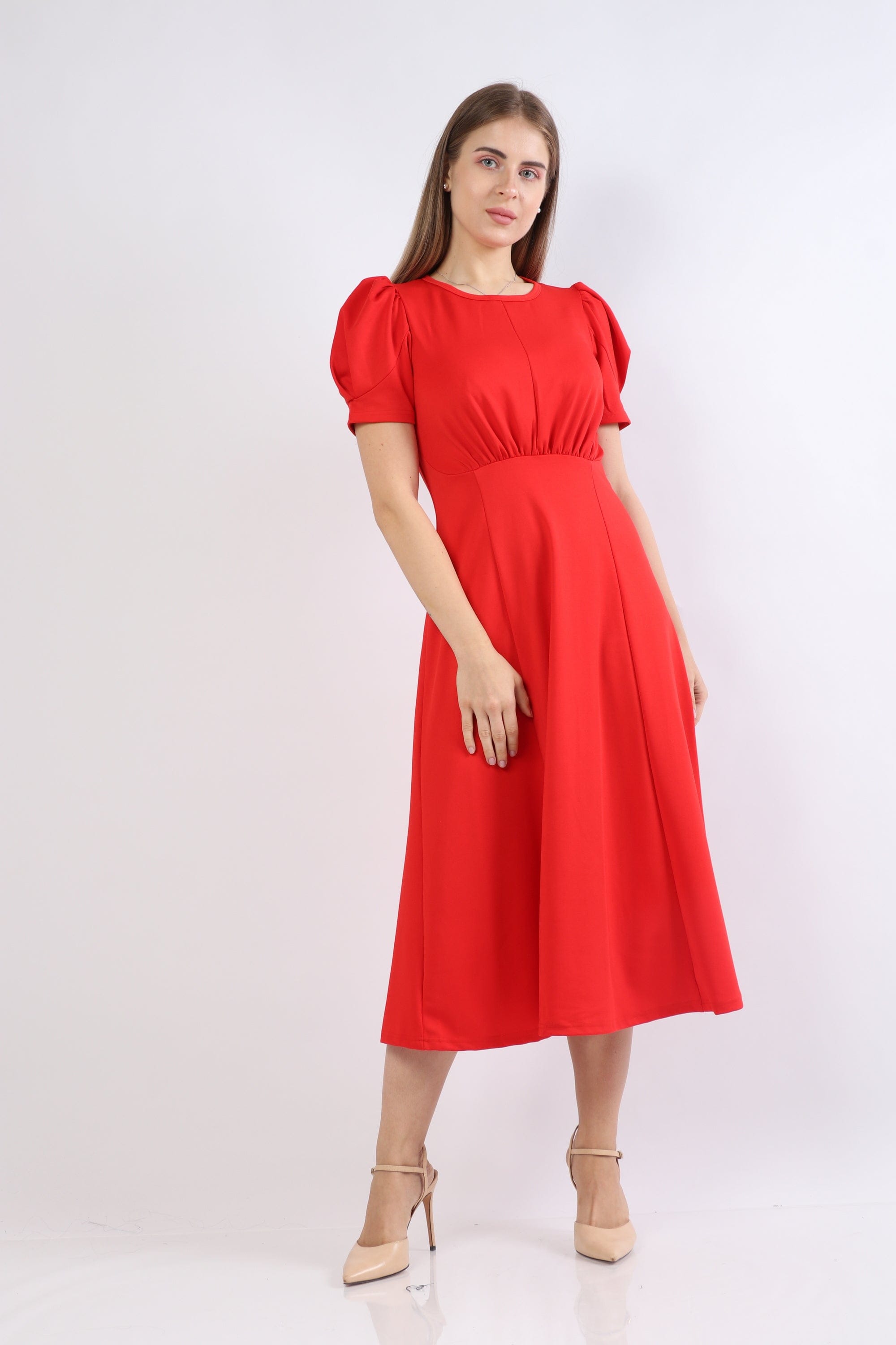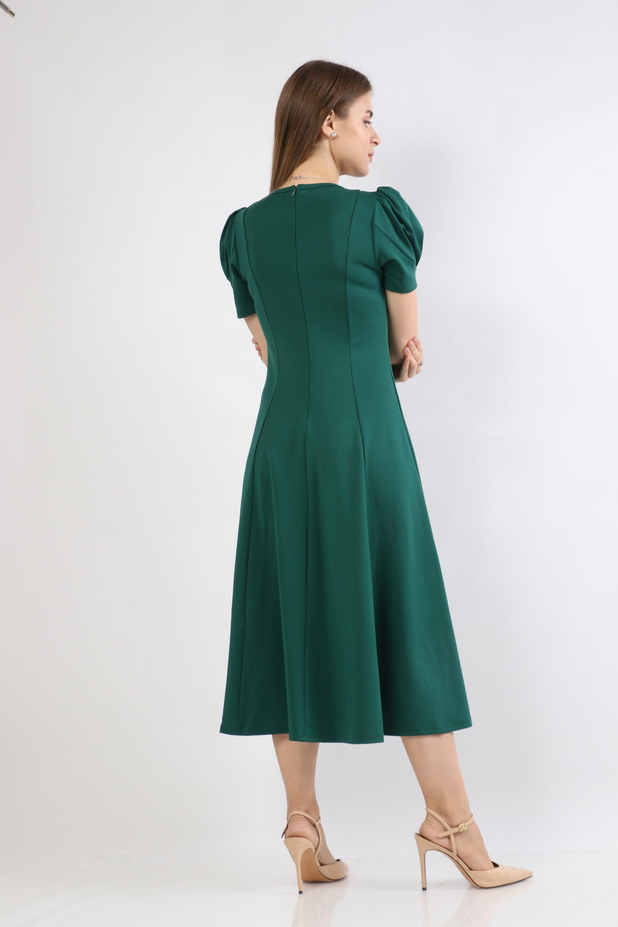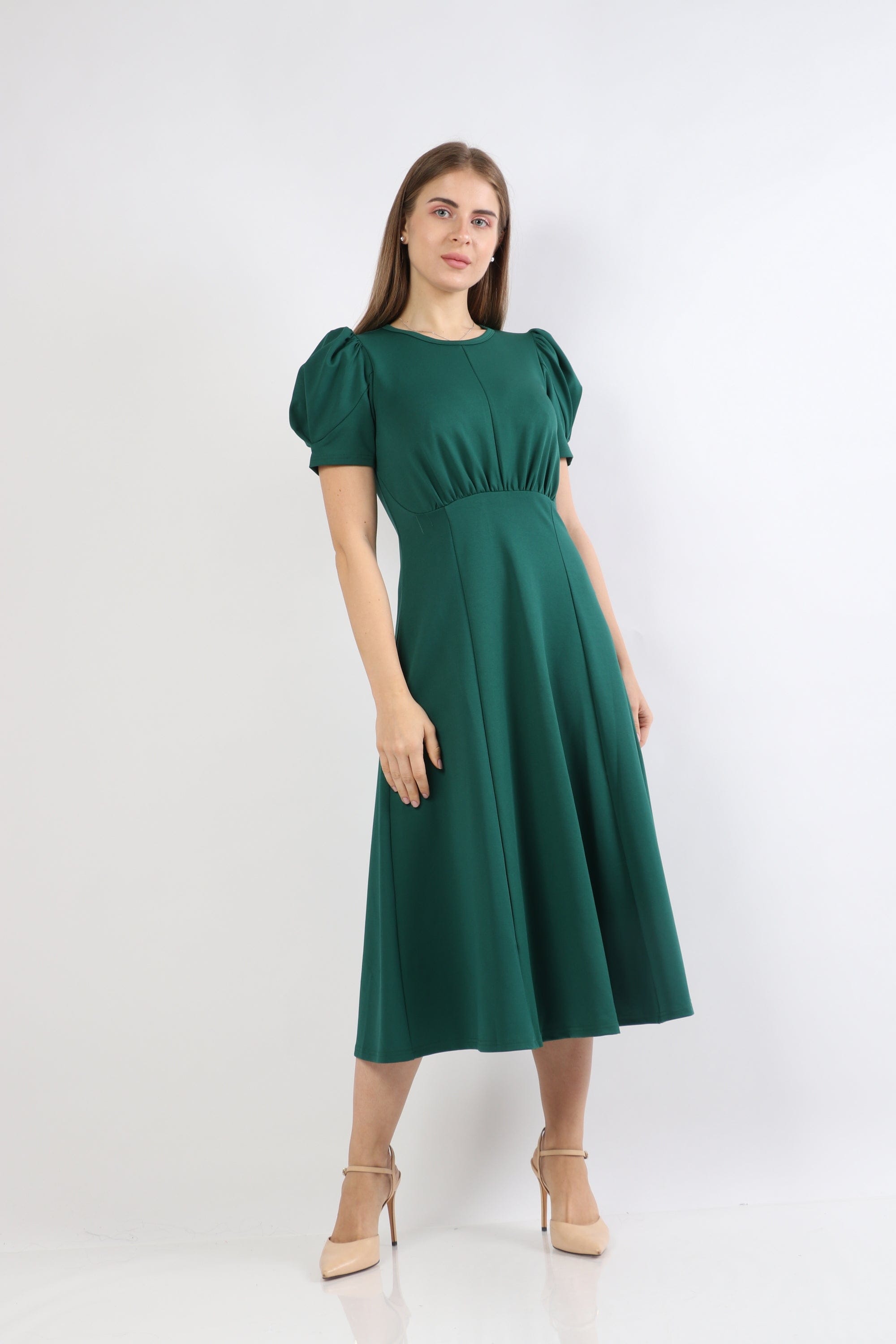 Puffed Short-Sleeve Midi Dress