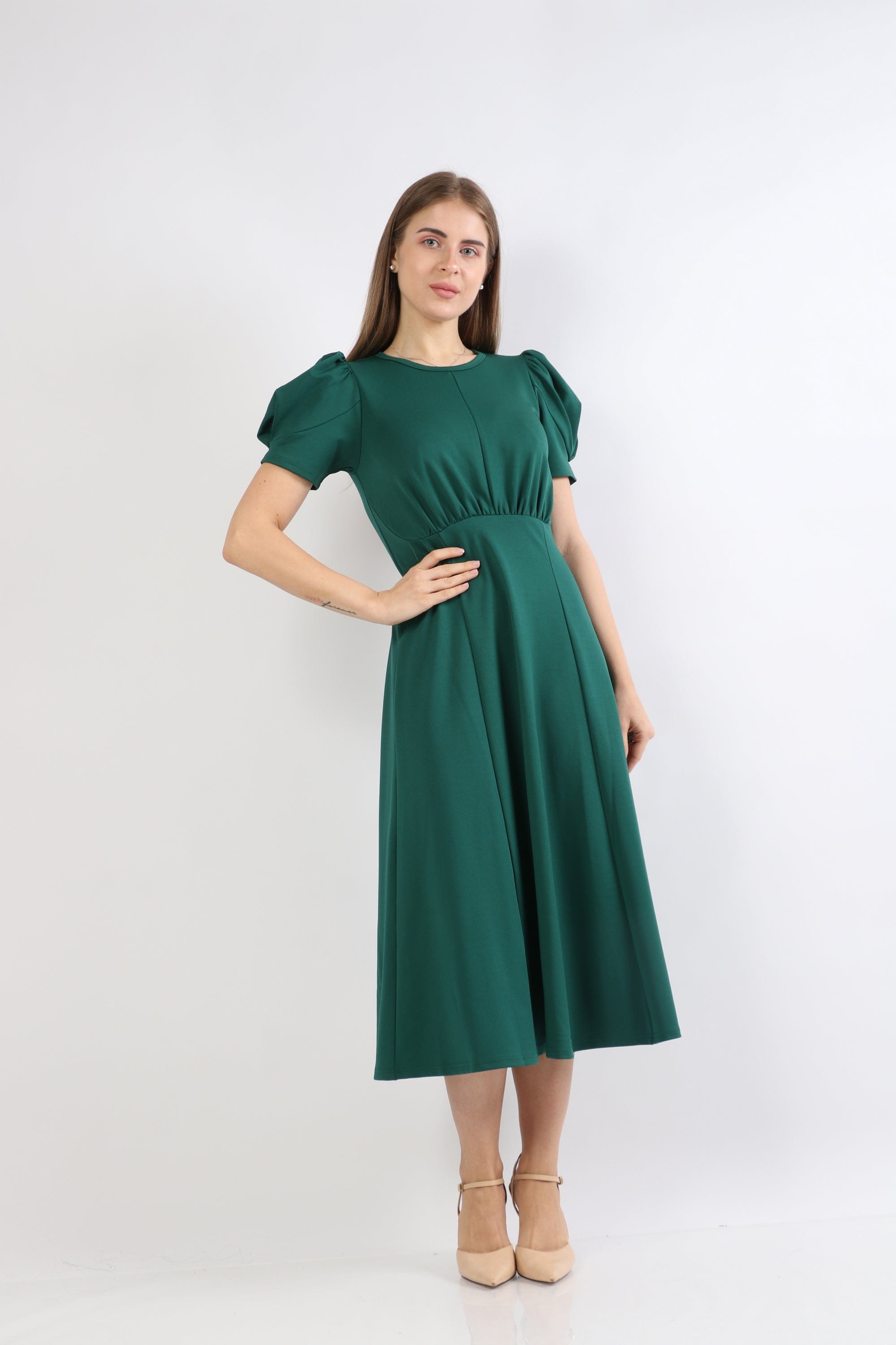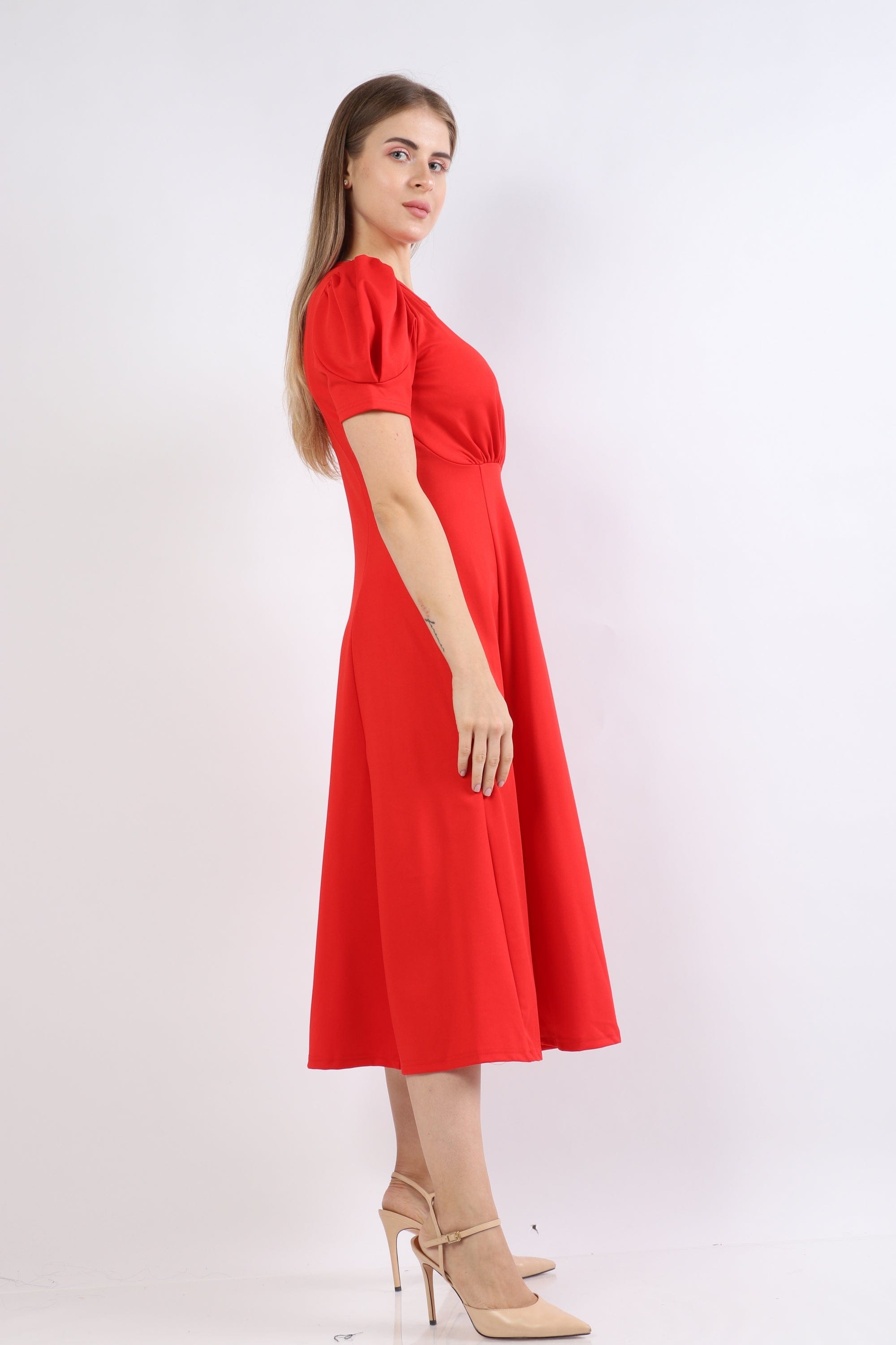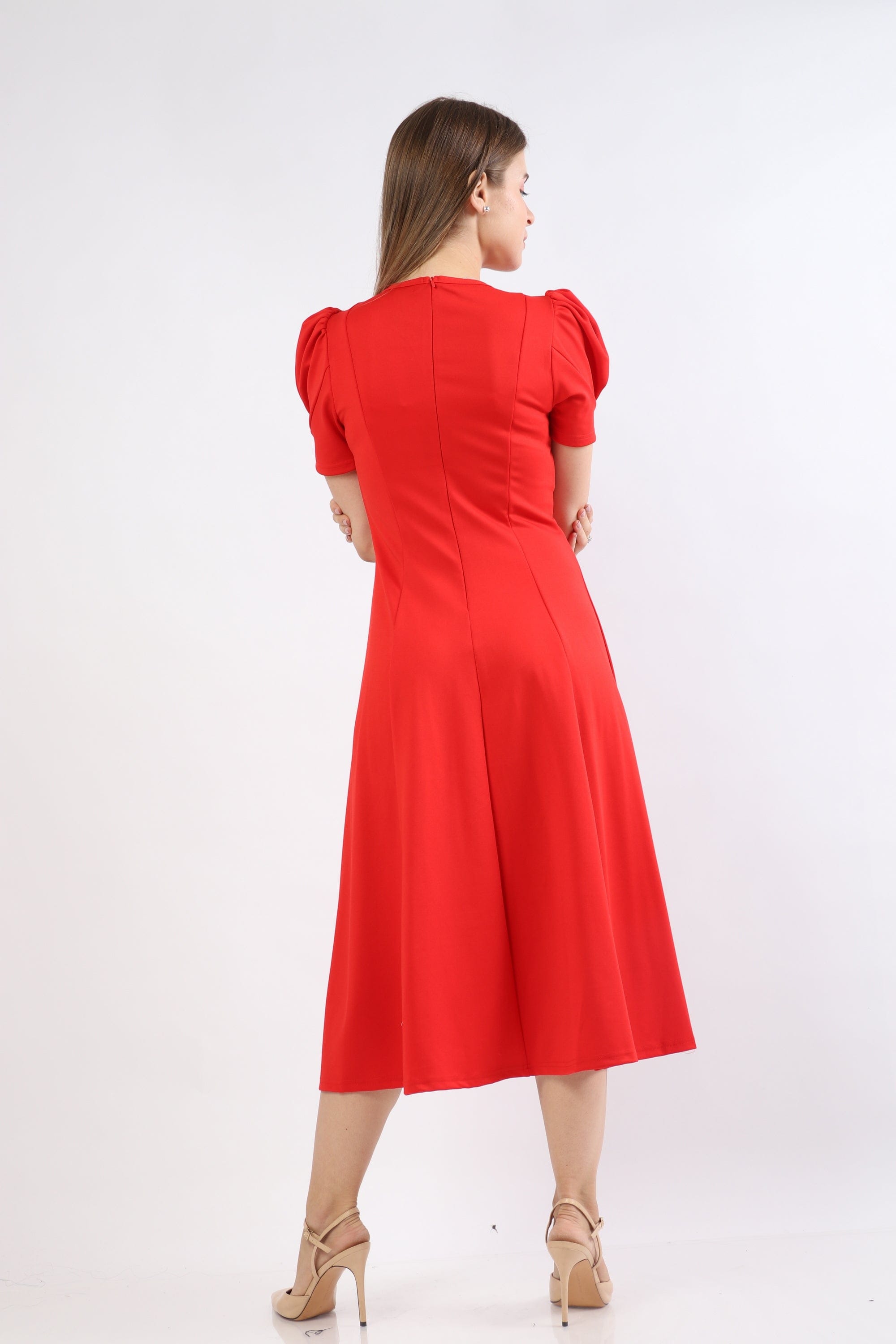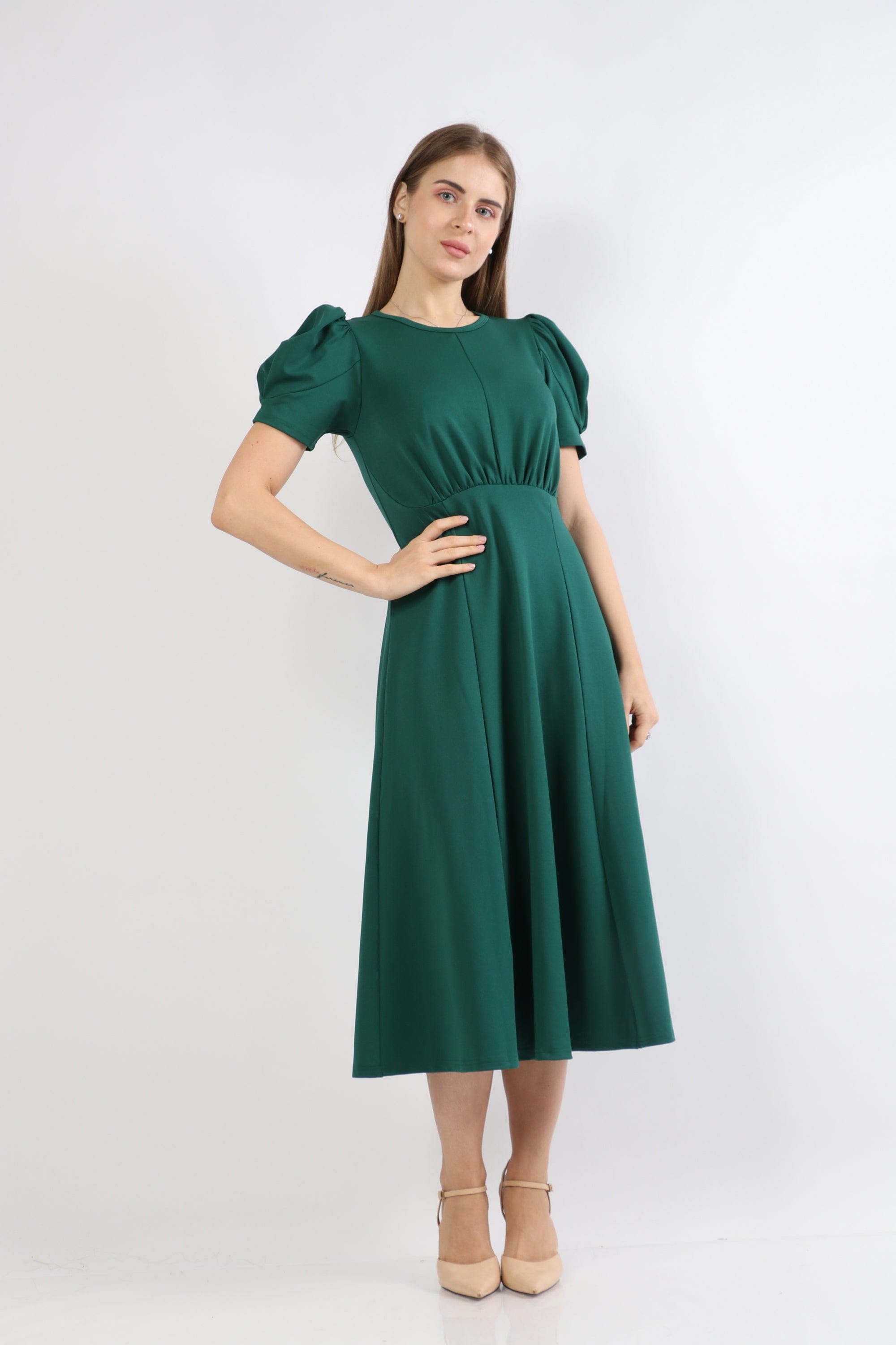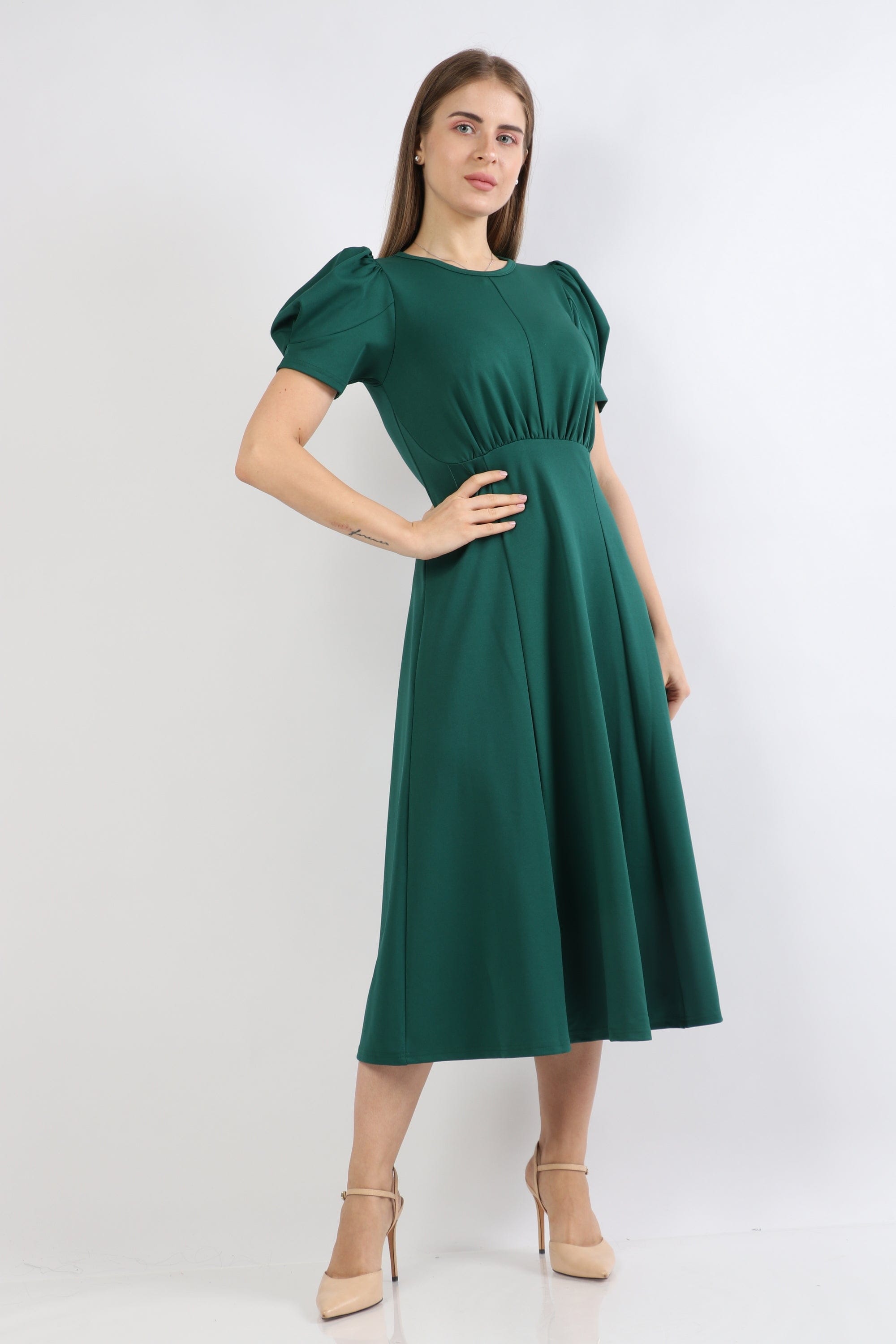 Puffed Short-Sleeve Midi Dress