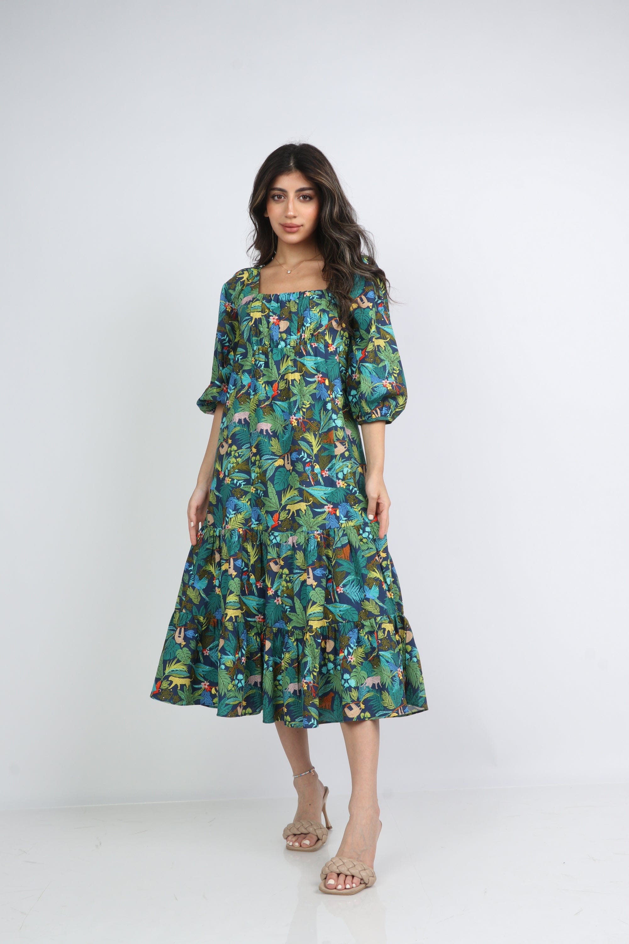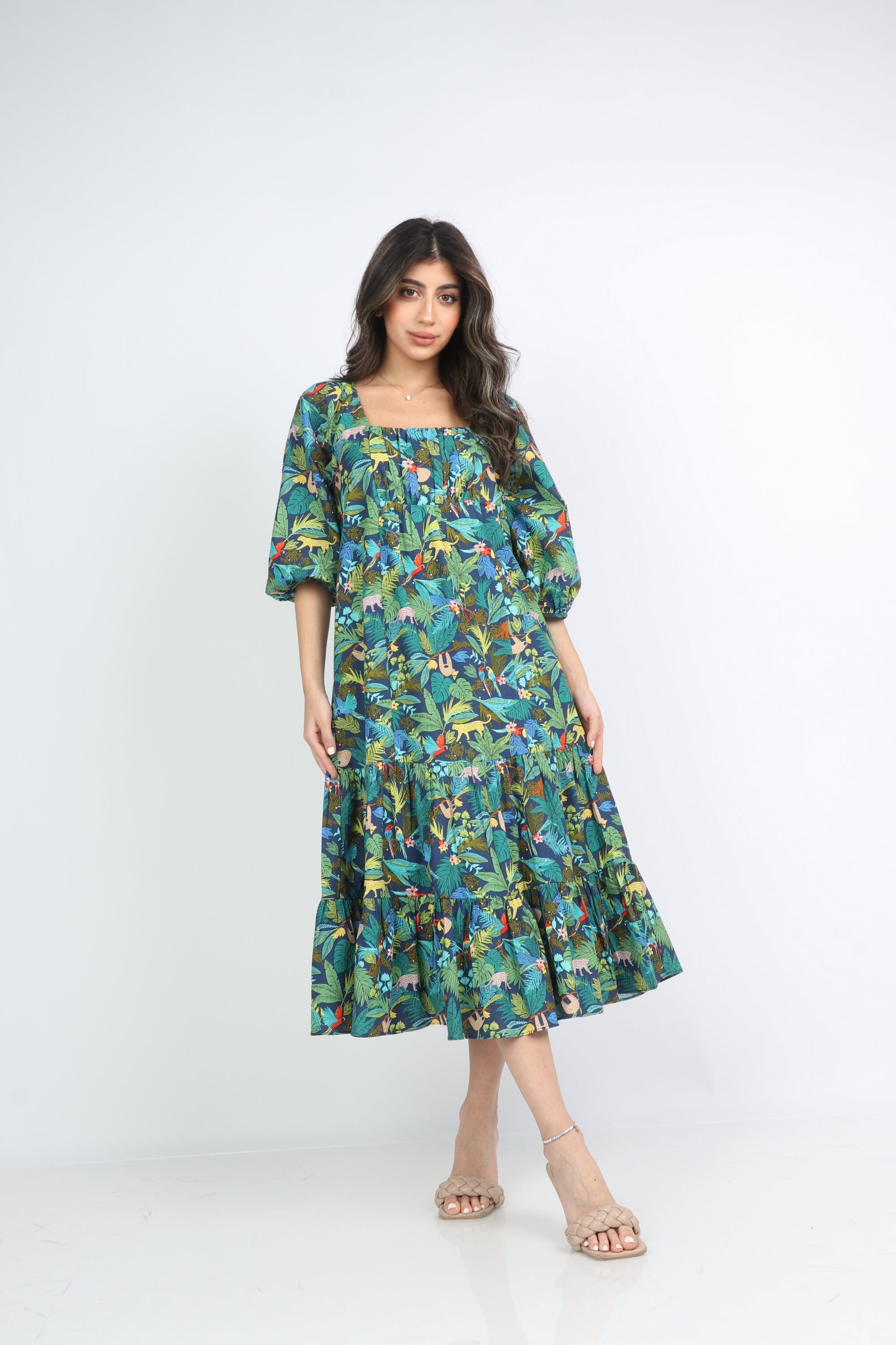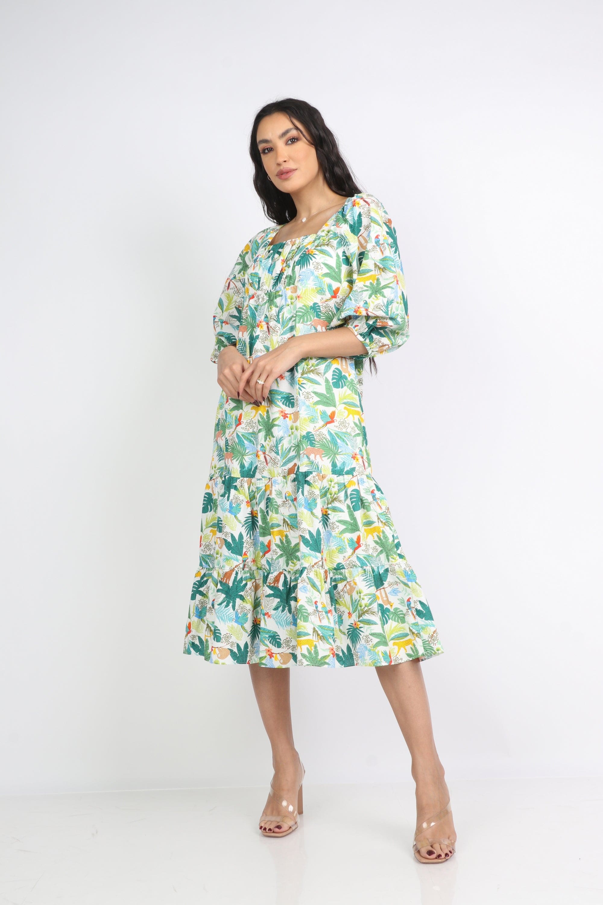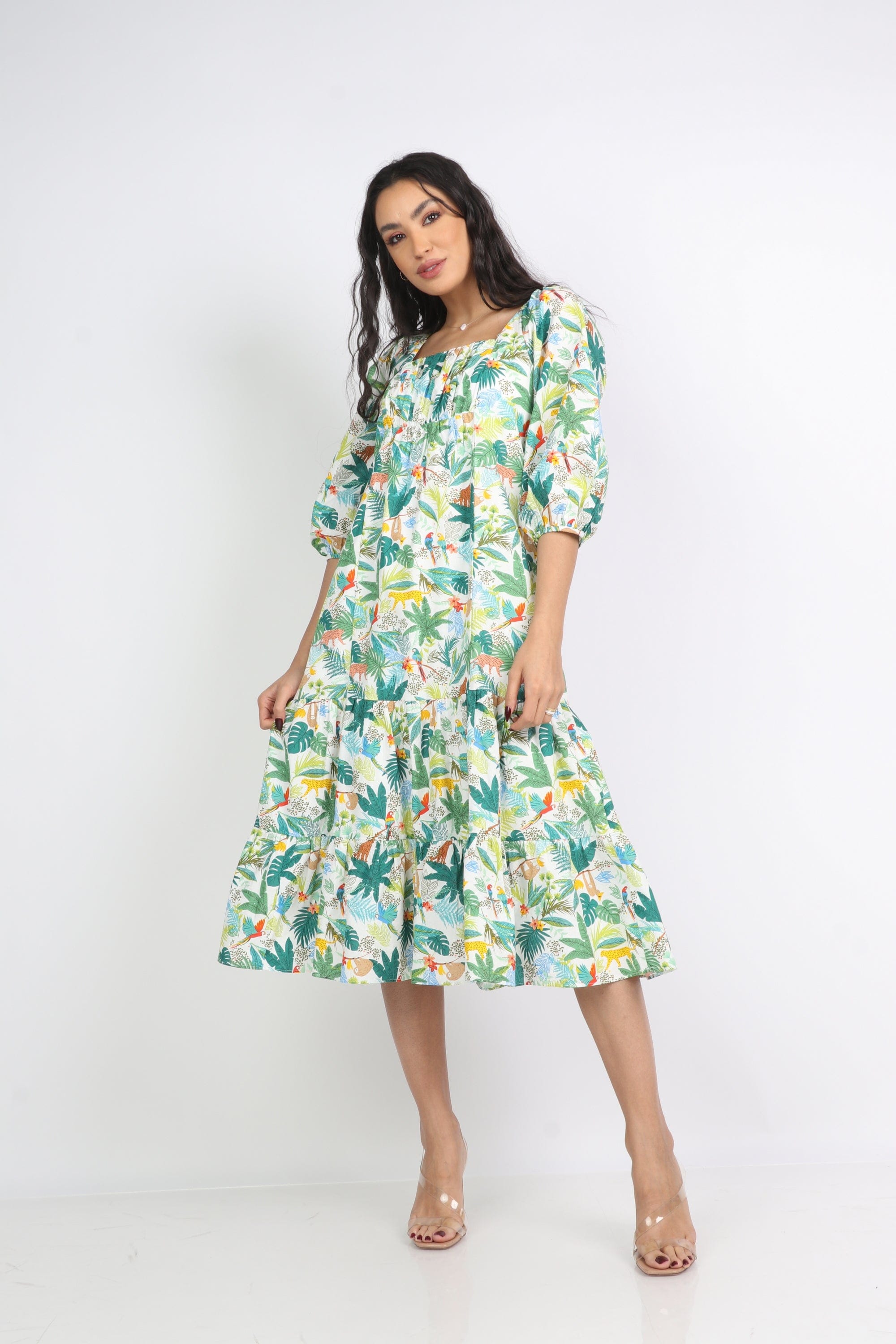 This multicolor patterned midi dress is a go-to for effortless everyday style — a breathable 100% cotton A-line that flatters while keeping you cool. The midi length and three-quarter sleeves offer polished coverage for casual outings, brunches or light office days, while the regular A-line fit skims the waist and hips for a universally flattering silhouette. Unlined construction and medium-weight cotton give soft, natural drape without added bulk, and the square neckline adds a modern, feminine touch. Pocketless and beltless for a clean profile, it layers easily under jackets or over a slip if you prefer extra coverage. Designed by Mica and curated for Fashion SA’s Cool & Comfort edit, this versatile patterned dress moves from day to evening with a quick change of shoes — add it to your wardrobe today.