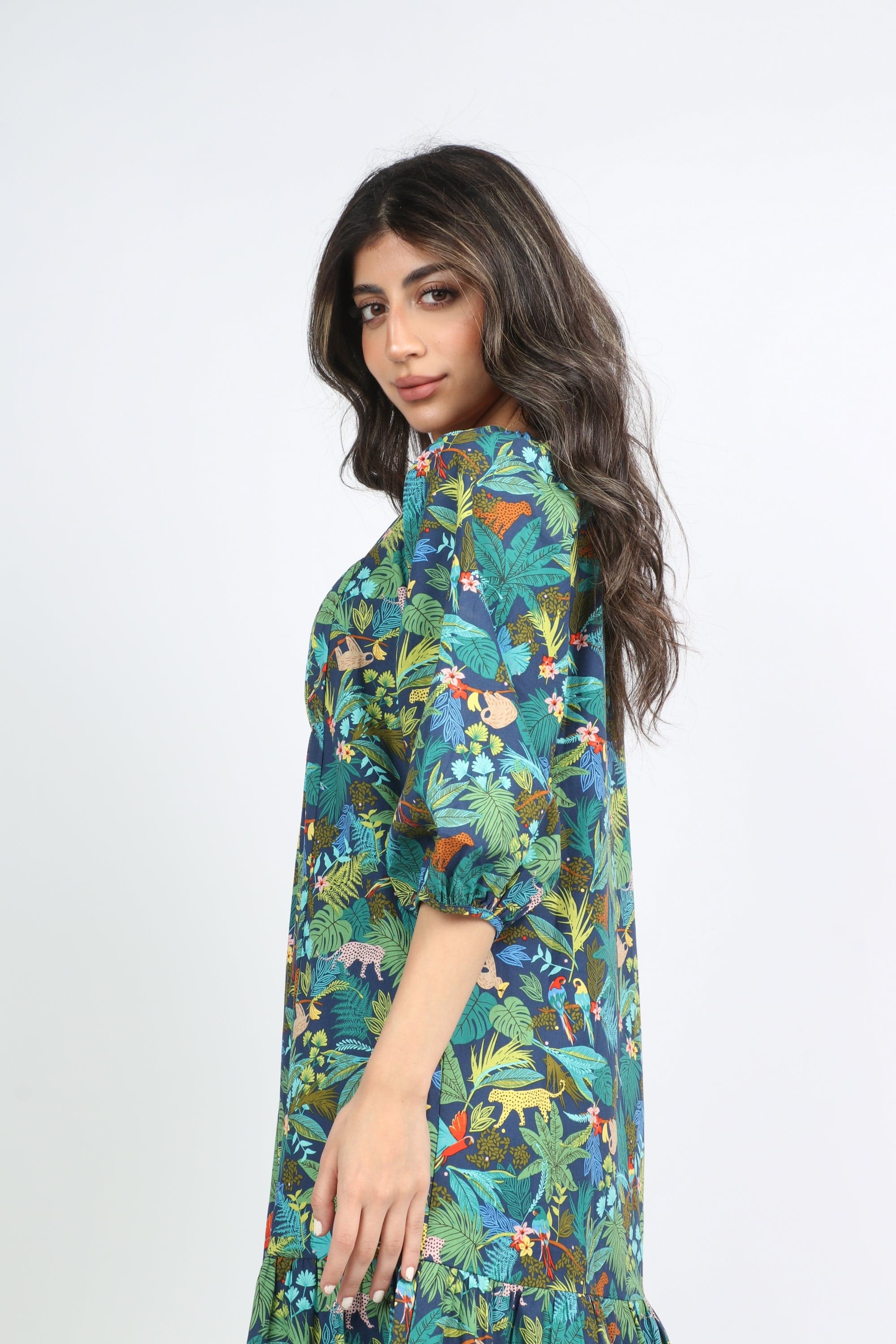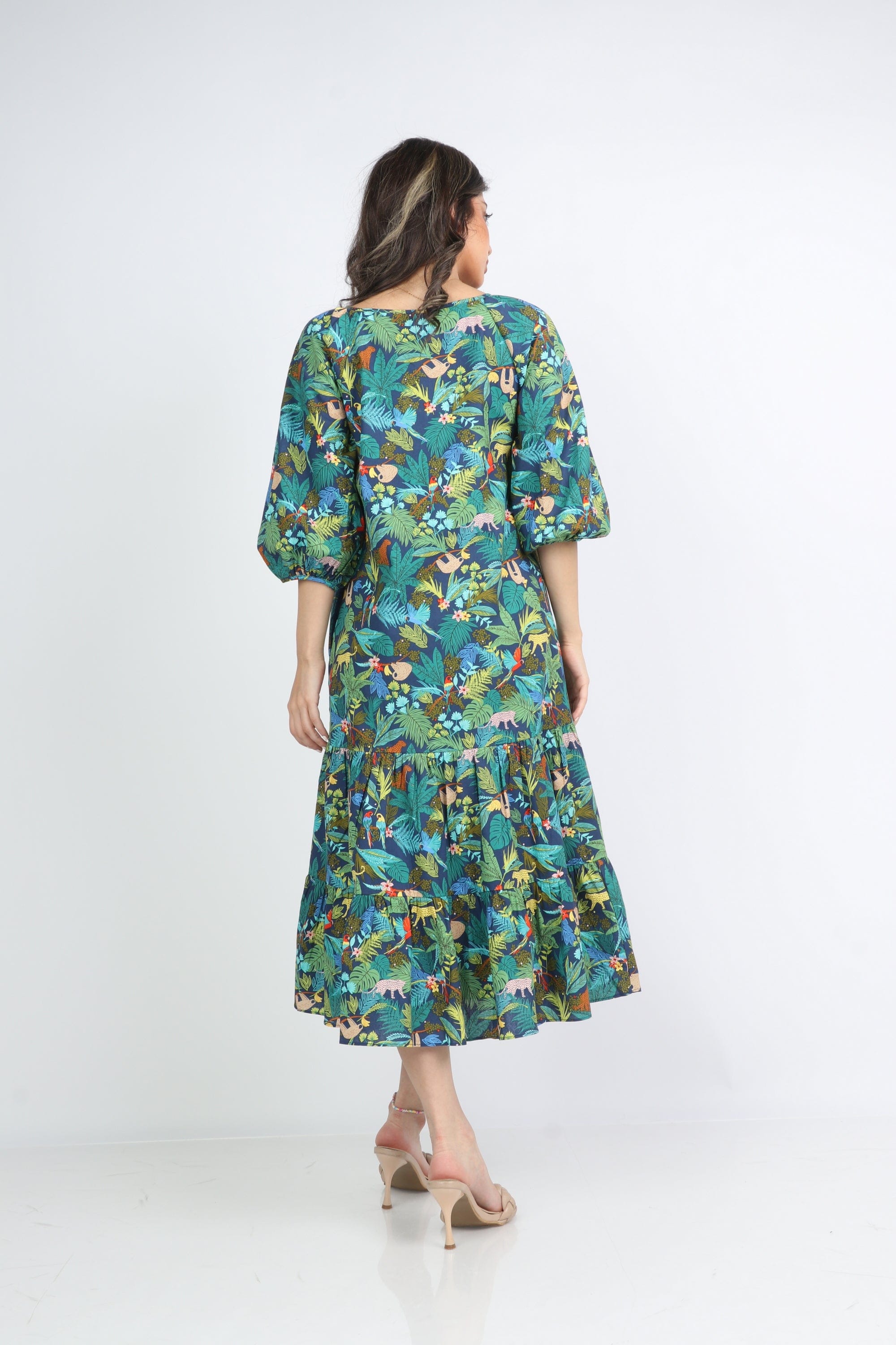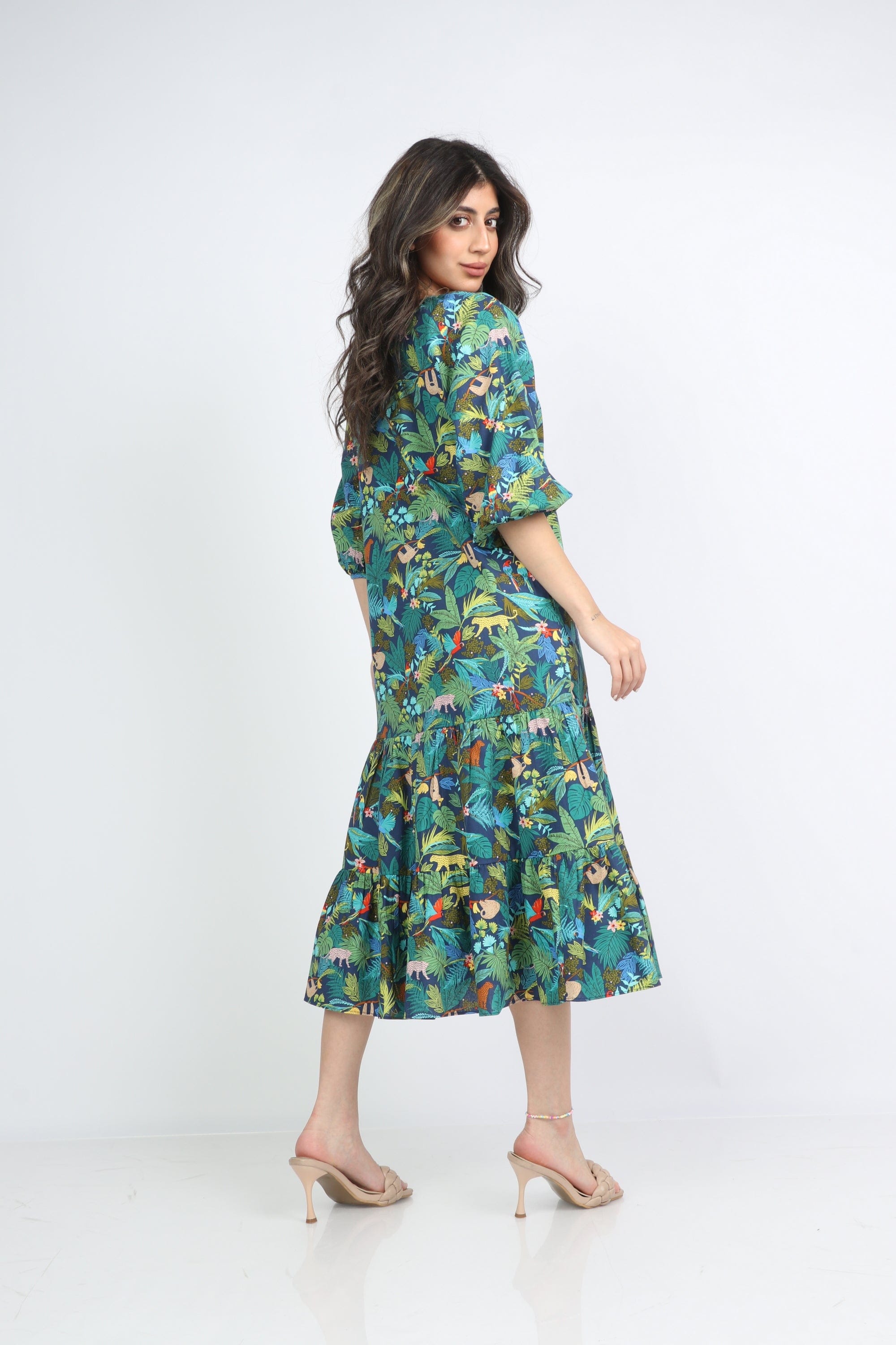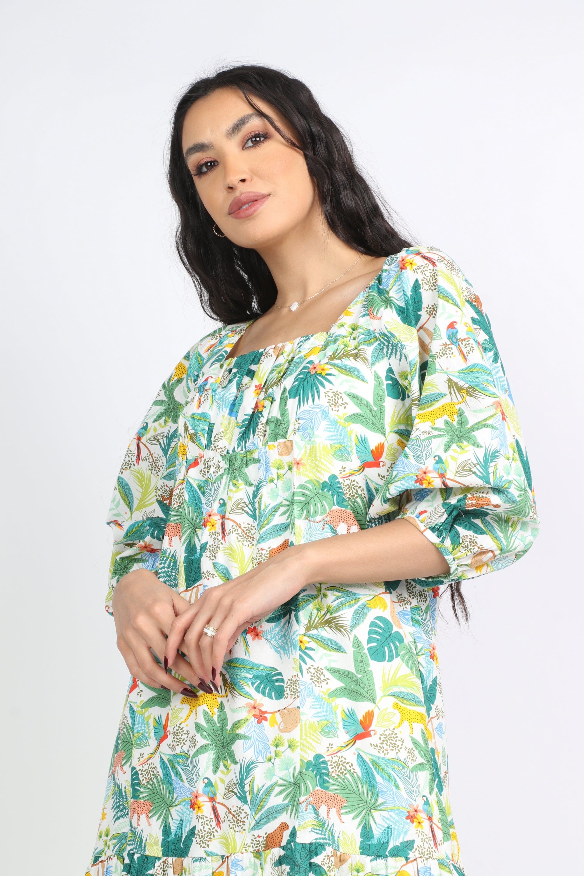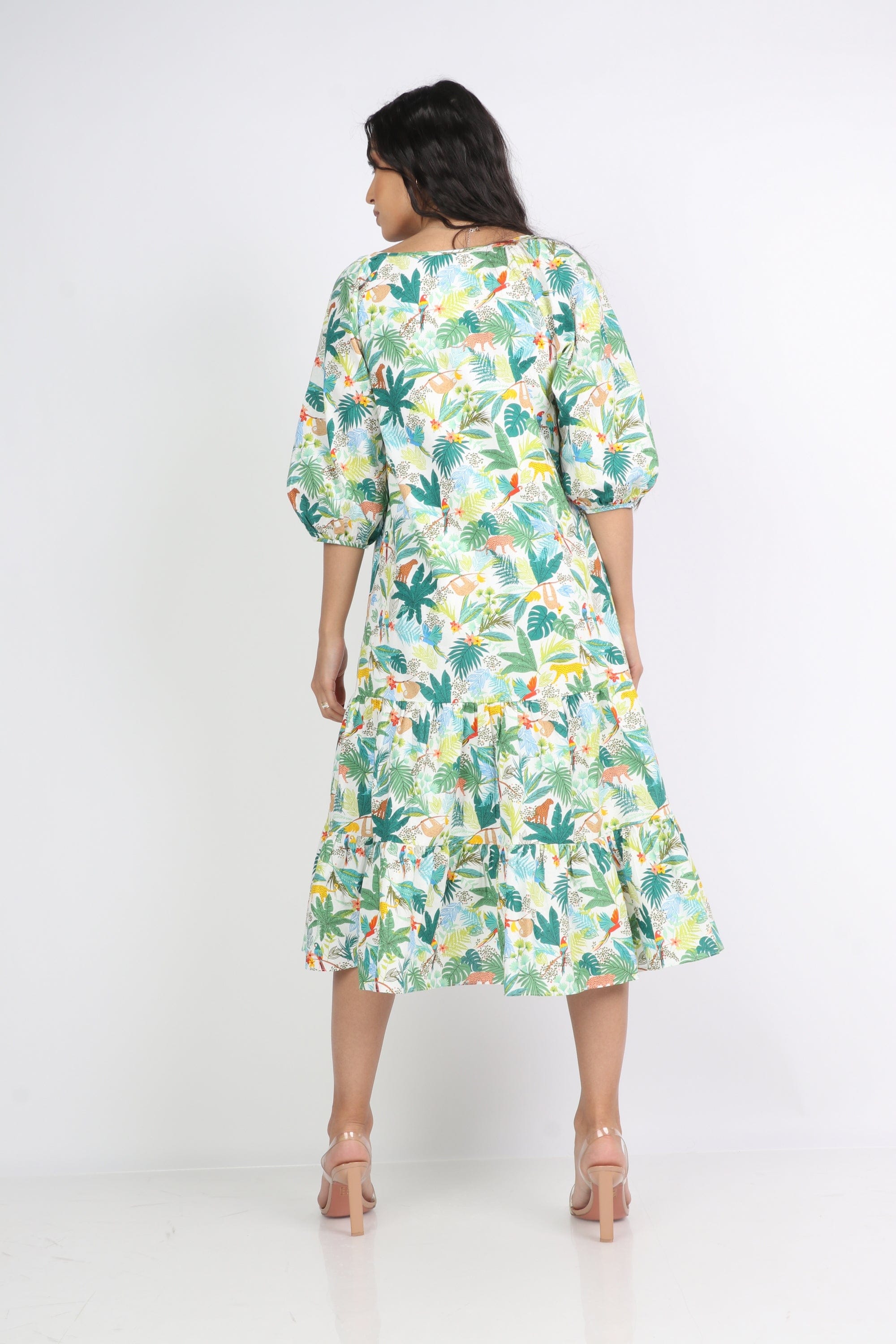This multicolor patterned midi dress is a go-to for effortless everyday style — a breathable 100% cotton A-line that flatters while keeping you cool. The midi length and three-quarter sleeves offer polished coverage for casual outings, brunches or light office days, while the regular A-line fit skims the waist and hips for a universally flattering silhouette. Unlined construction and medium-weight cotton give soft, natural drape without added bulk, and the square neckline adds a modern, feminine touch. Pocketless and beltless for a clean profile, it layers easily under jackets or over a slip if you prefer extra coverage. Designed by Mica and curated for Fashion SA’s Cool & Comfort edit, this versatile patterned dress moves from day to evening with a quick change of shoes — add it to your wardrobe today.