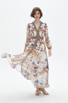 This Multicolor Patterned Maxi Belted Dress is an elegant showstopper that marries flattering shape with easy-care practicality. Crafted from 100% polyester with a soft, wrinkle-resistant finish, the A-line silhouette skims the body in a regular fit while the maxi length creates graceful movement. Long sleeves and a V-neck deliver refined coverage and elongating lines, while the self-tie belt cinches the waist for a defined profile; button-front closure lets you adjust the neckline. The unlined construction keeps the dress lightweight for all-season wear, and the vibrant patterned print brings feminine interest to evening events or dressy daytime occasions. Designed by Nichii and available at Fashion SA, this versatile piece transitions from cocktail parties to destination dinners — add it to your wardrobe now.