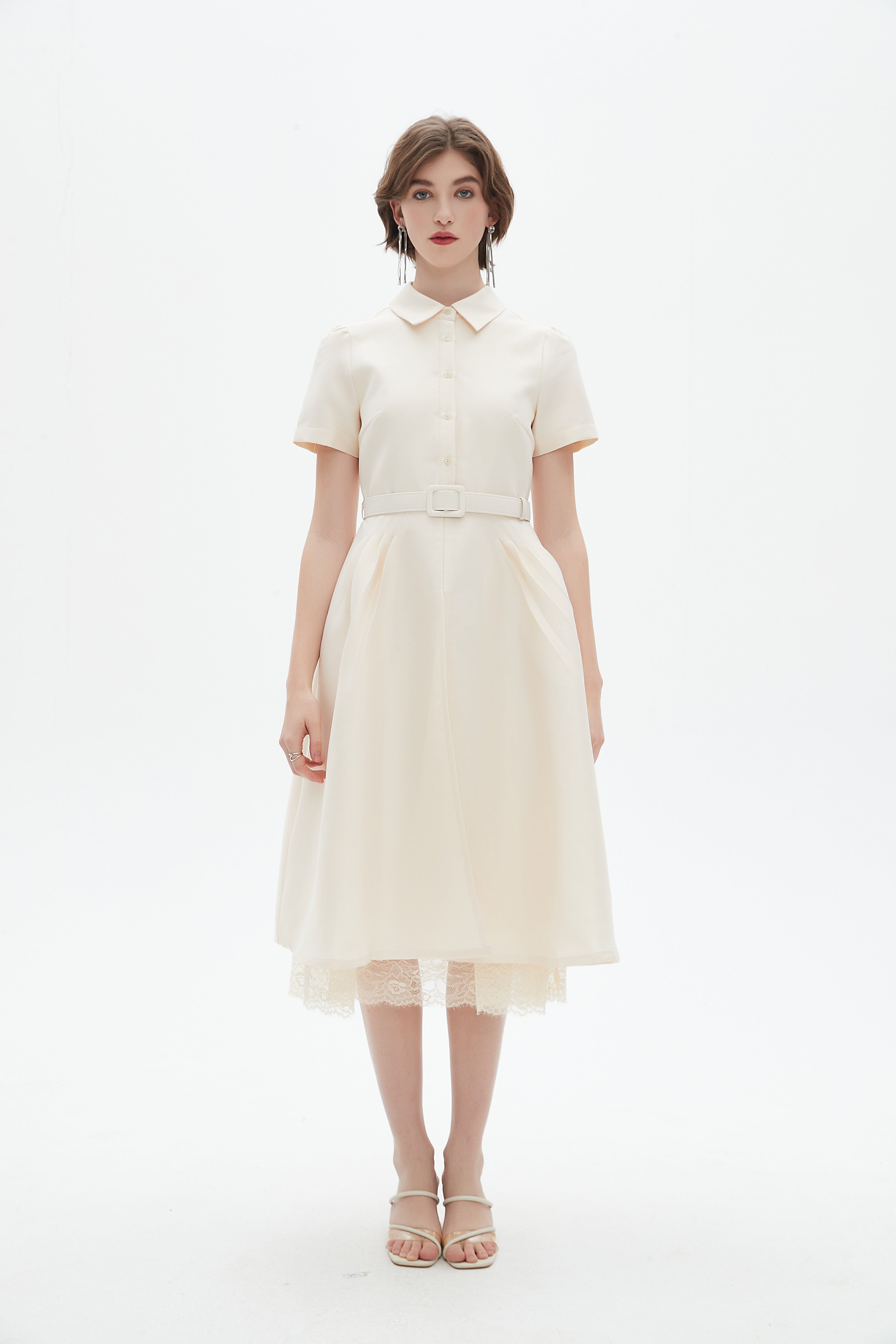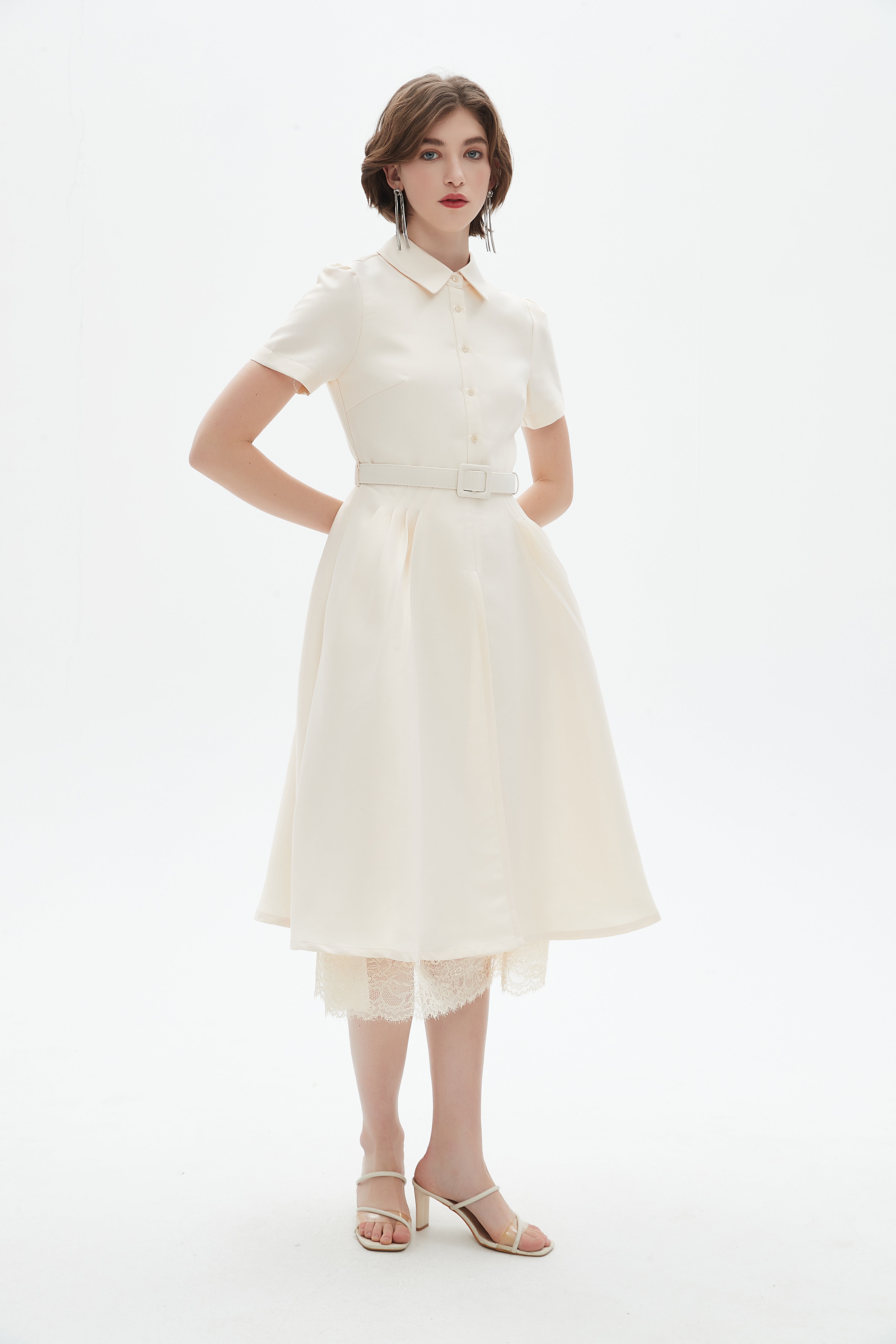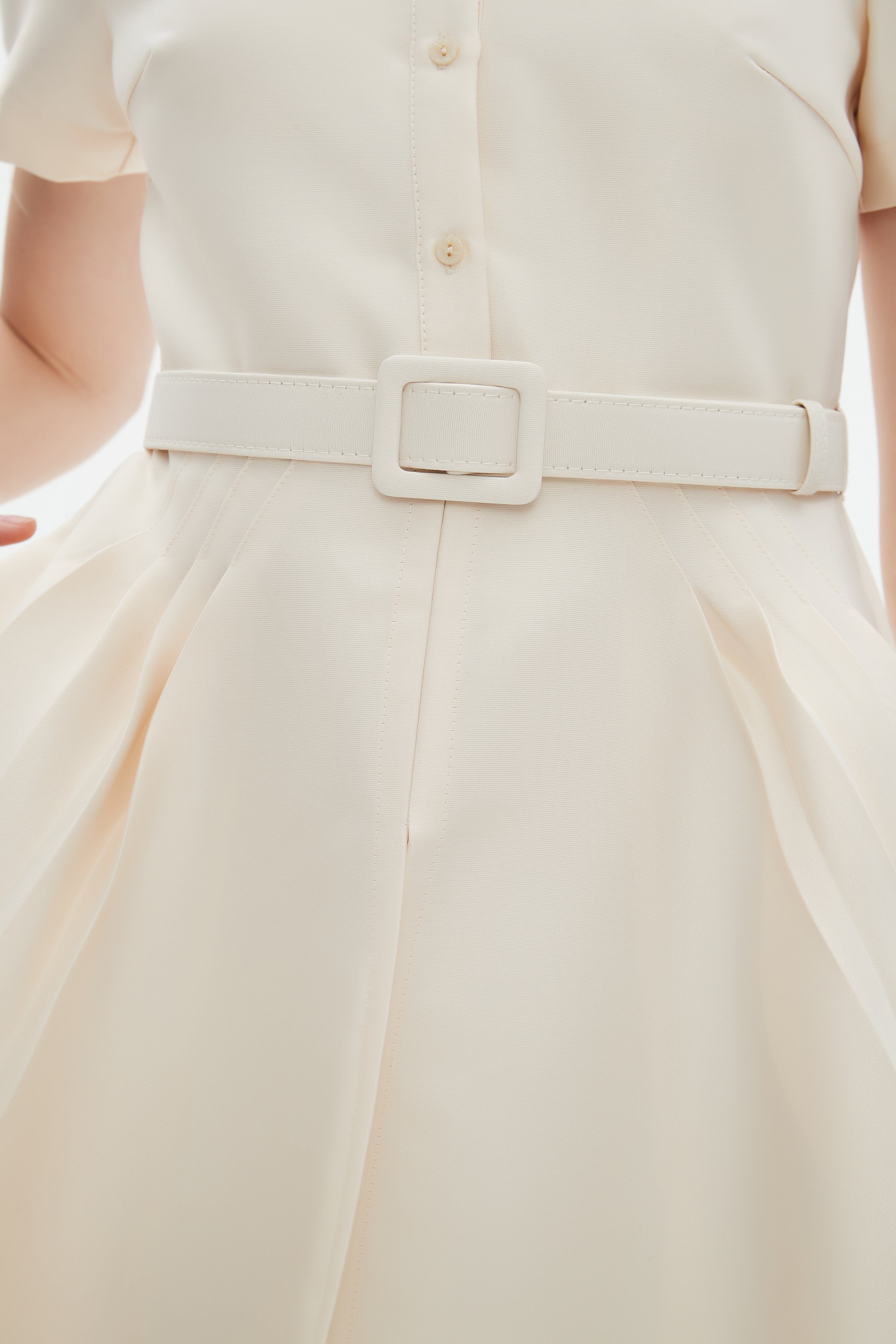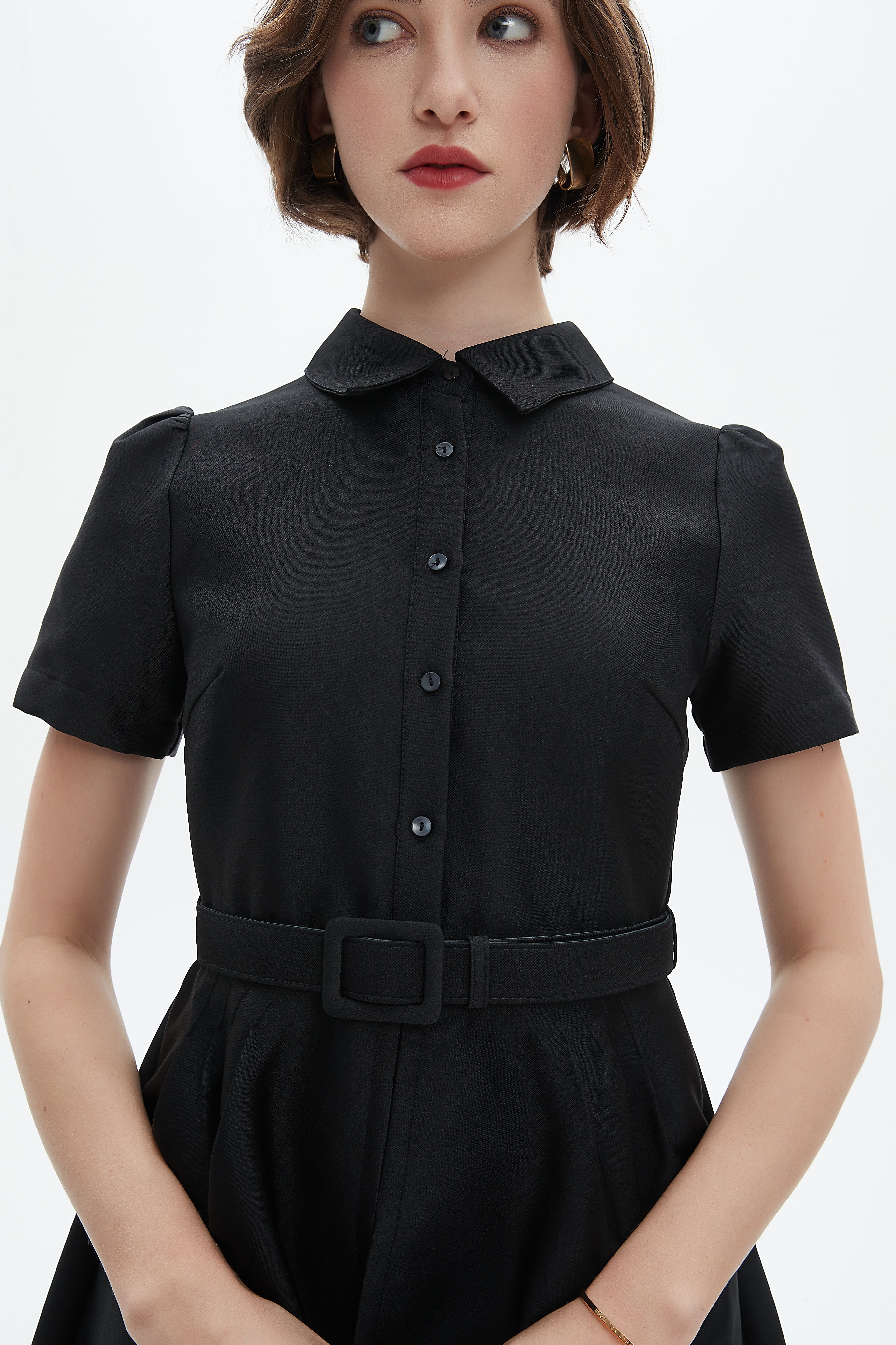 - Shirt collar, short sleeves and button-front closure for a tailored, office-ready look; belted waist enhances shape