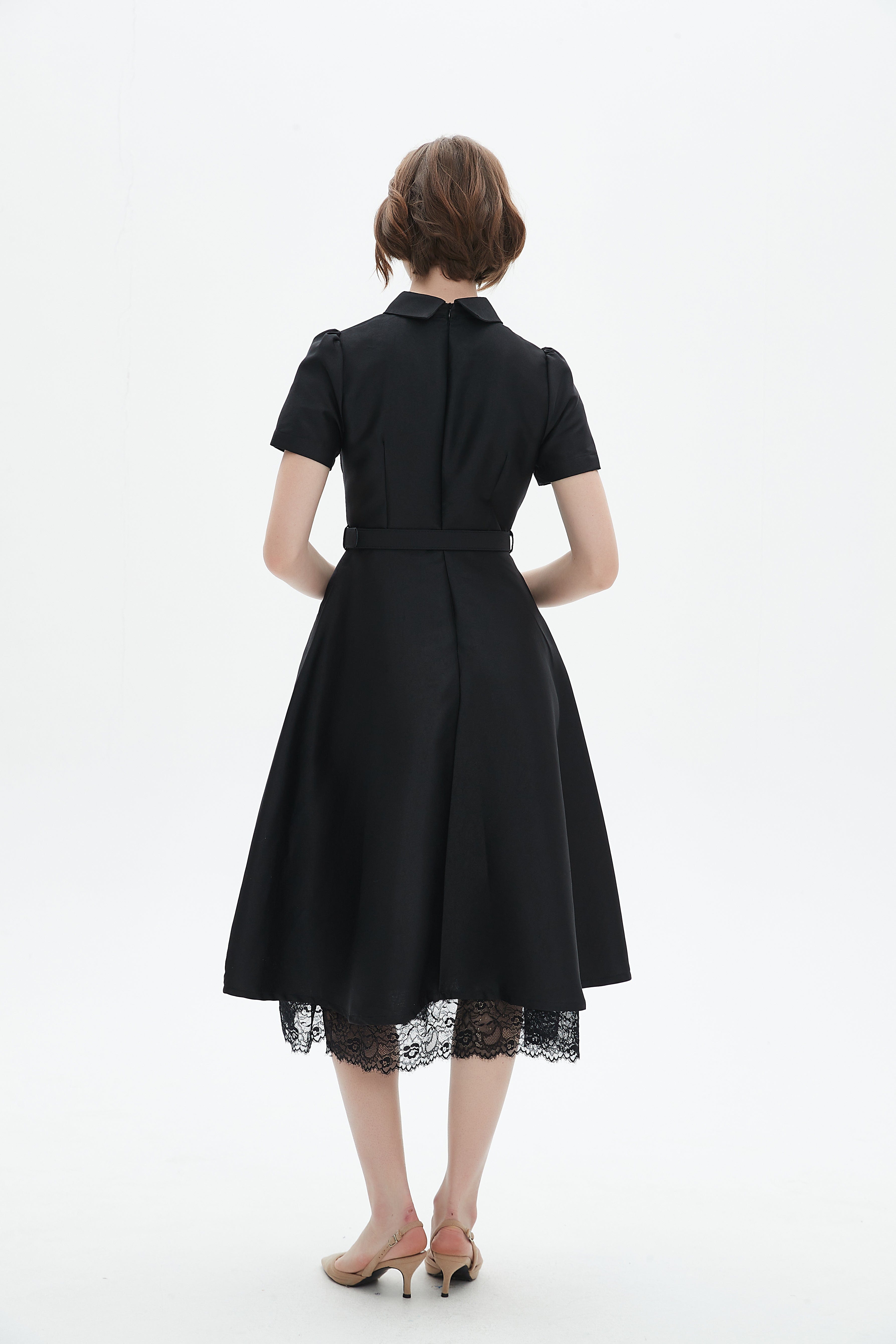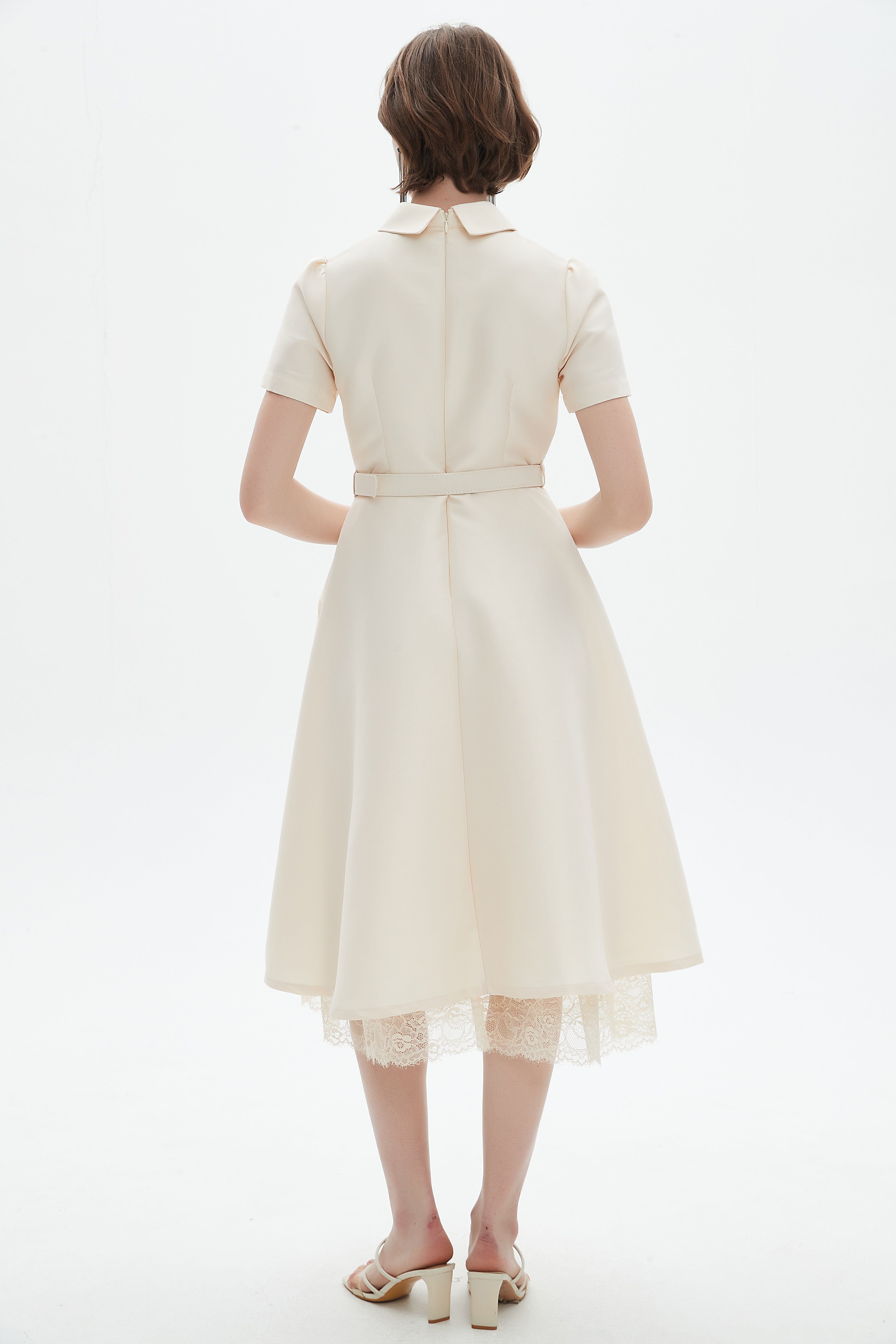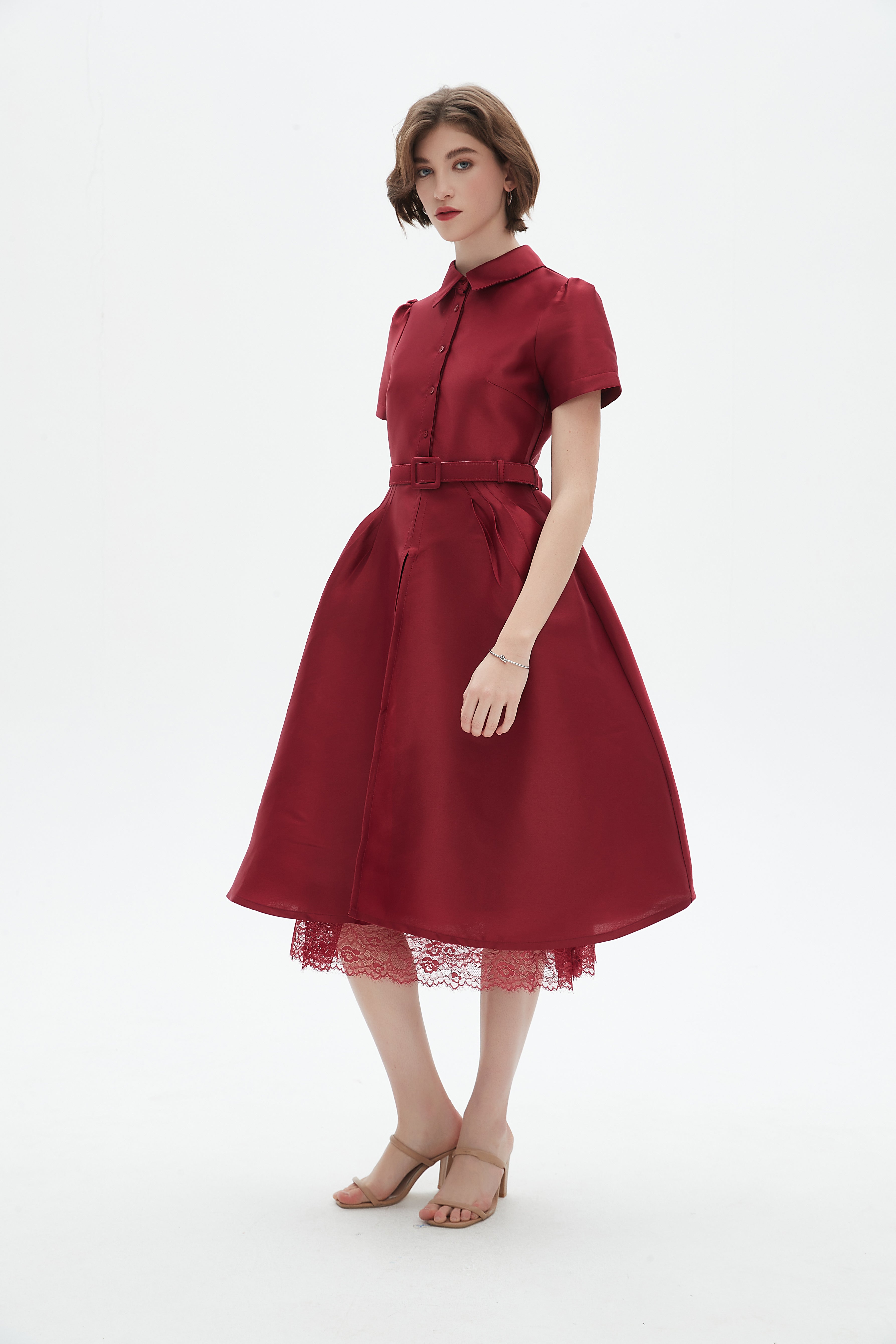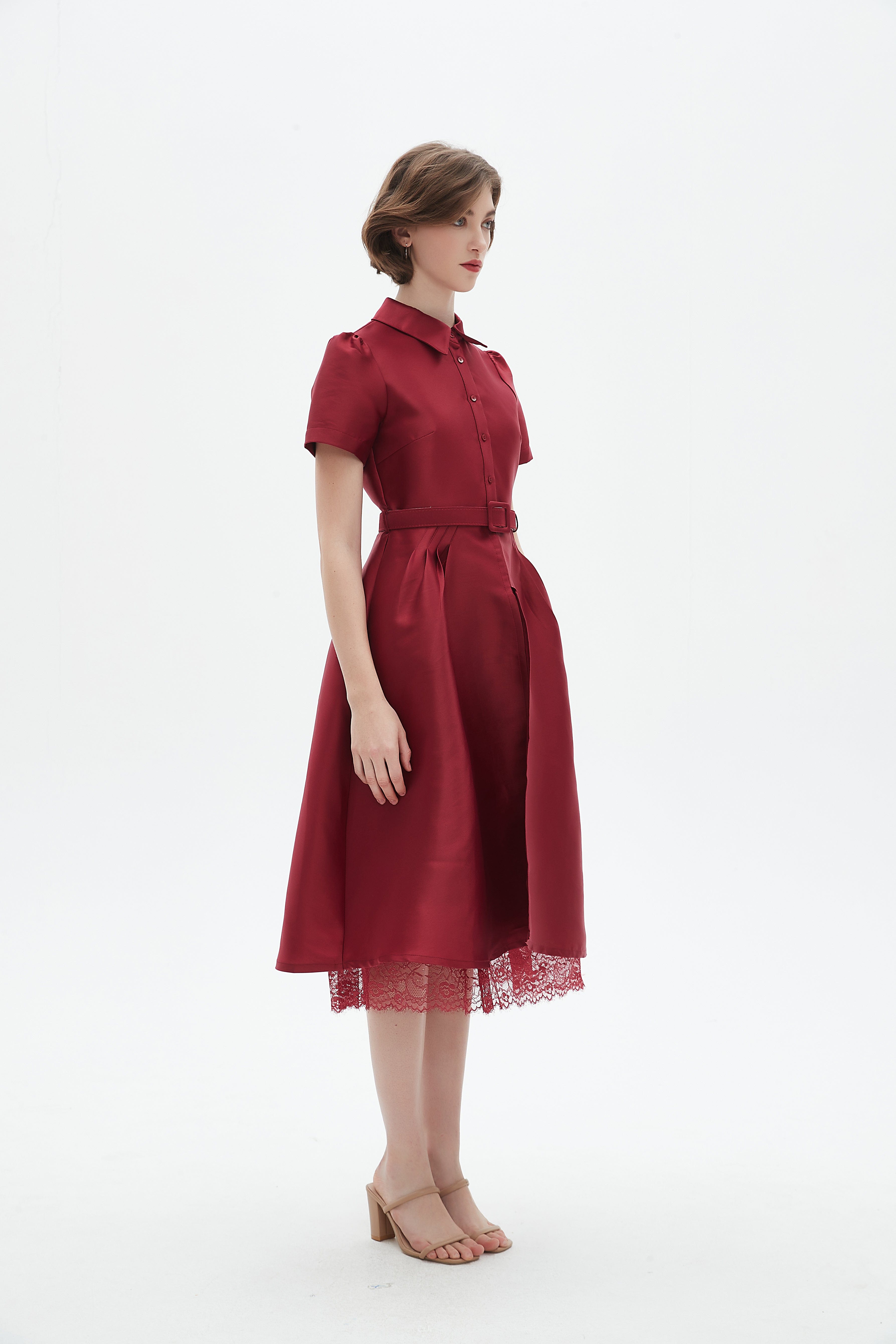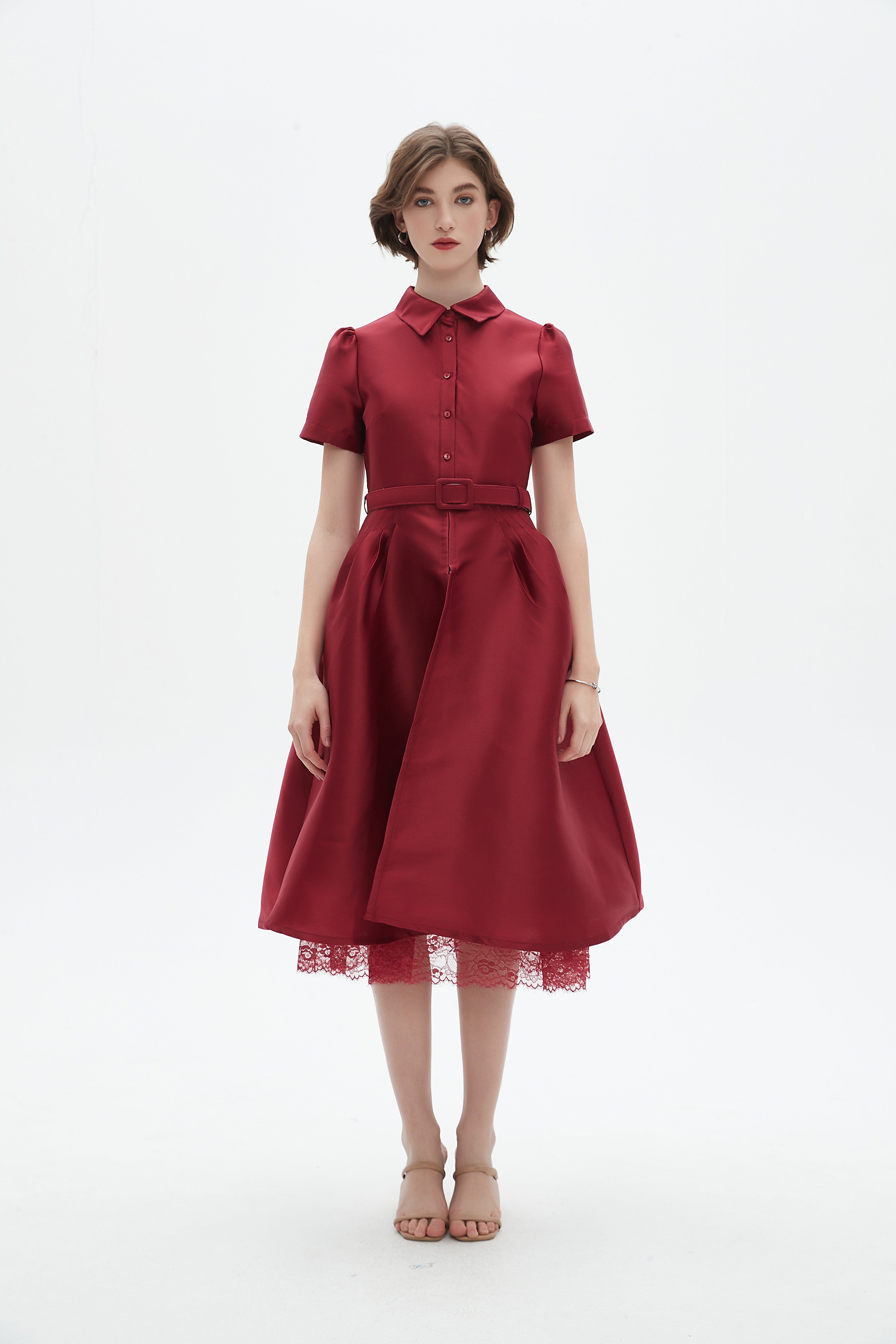 - Shirt collar, short sleeves and button-front closure for a tailored, office-ready look; belted waist enhances shape