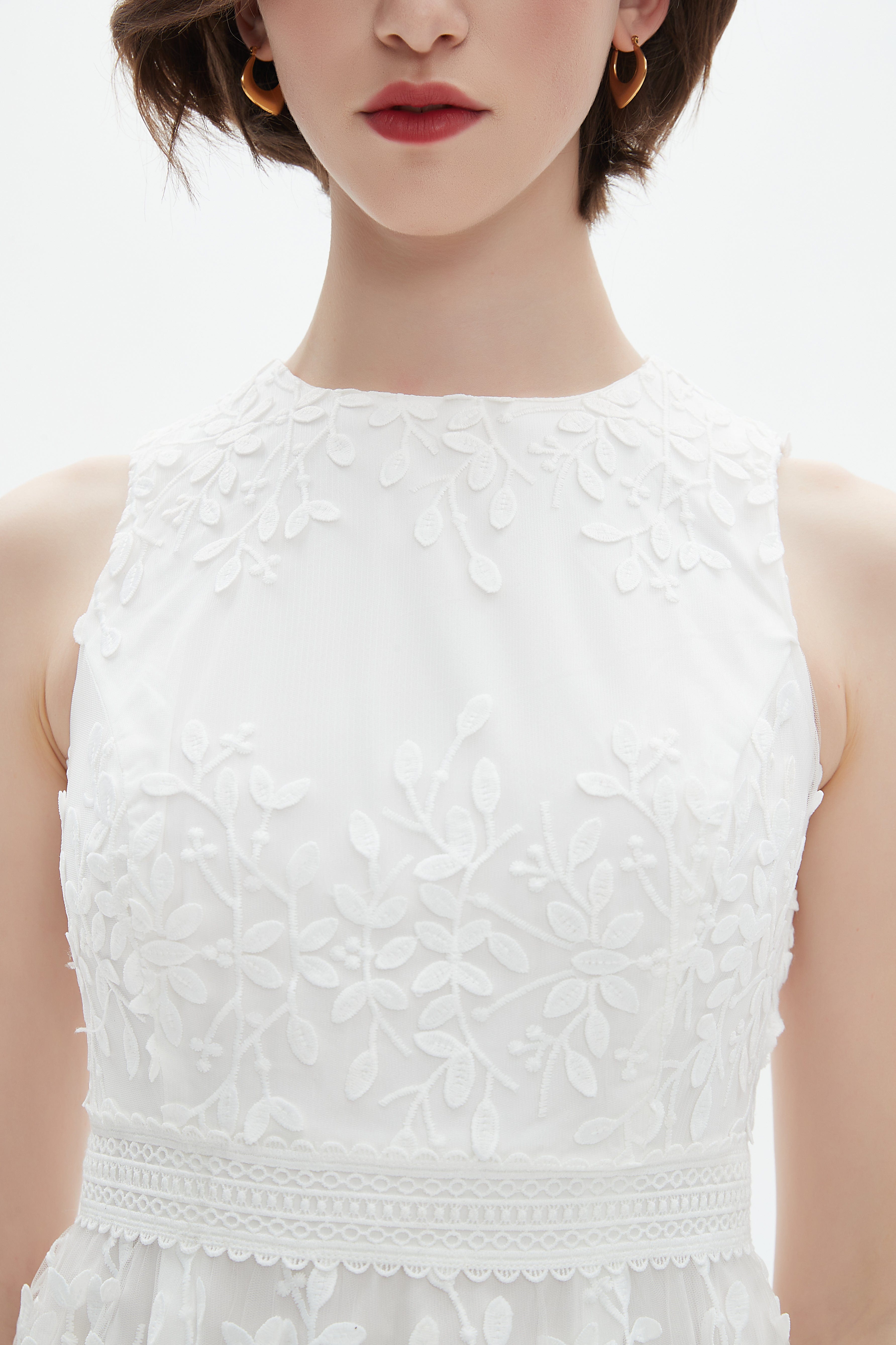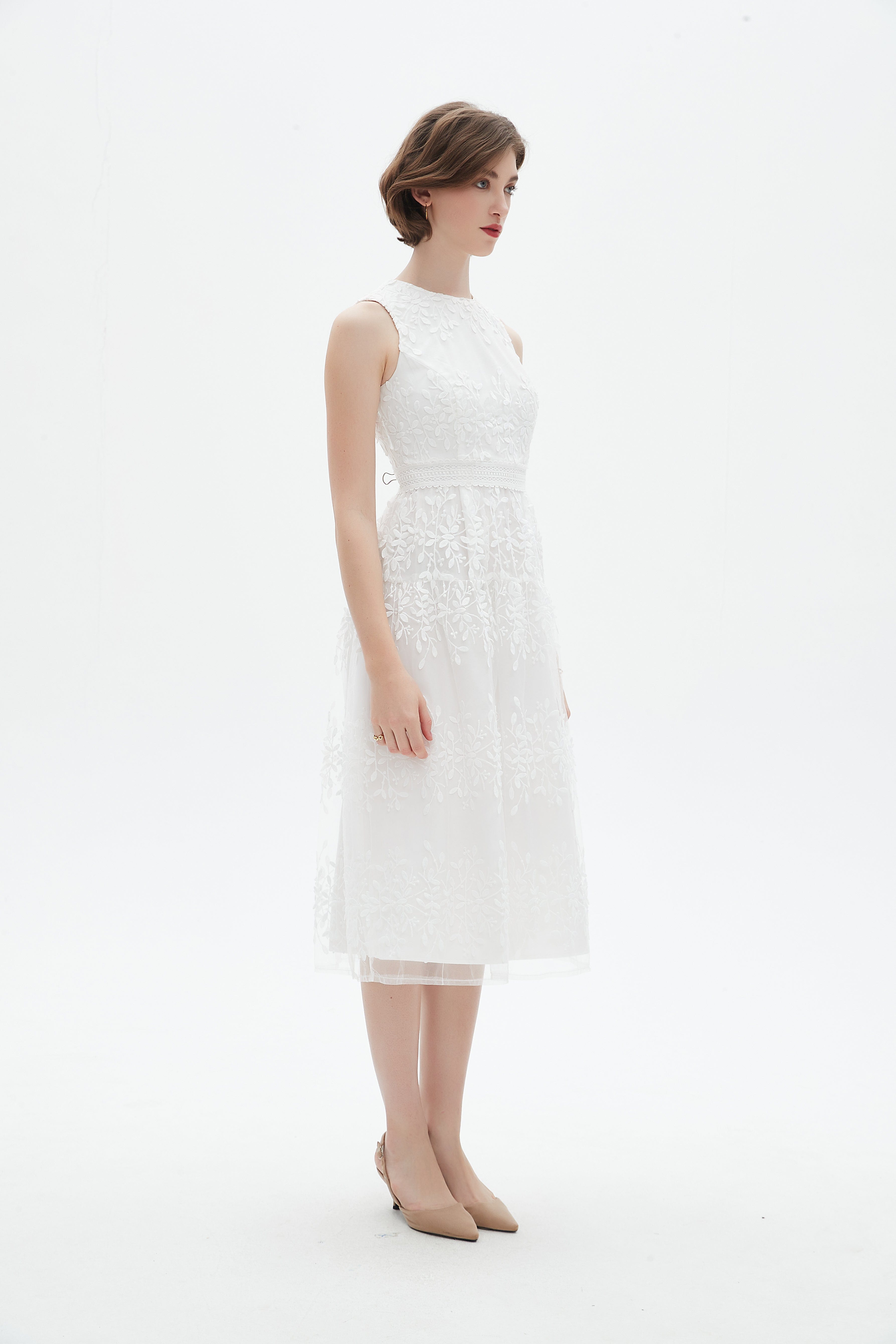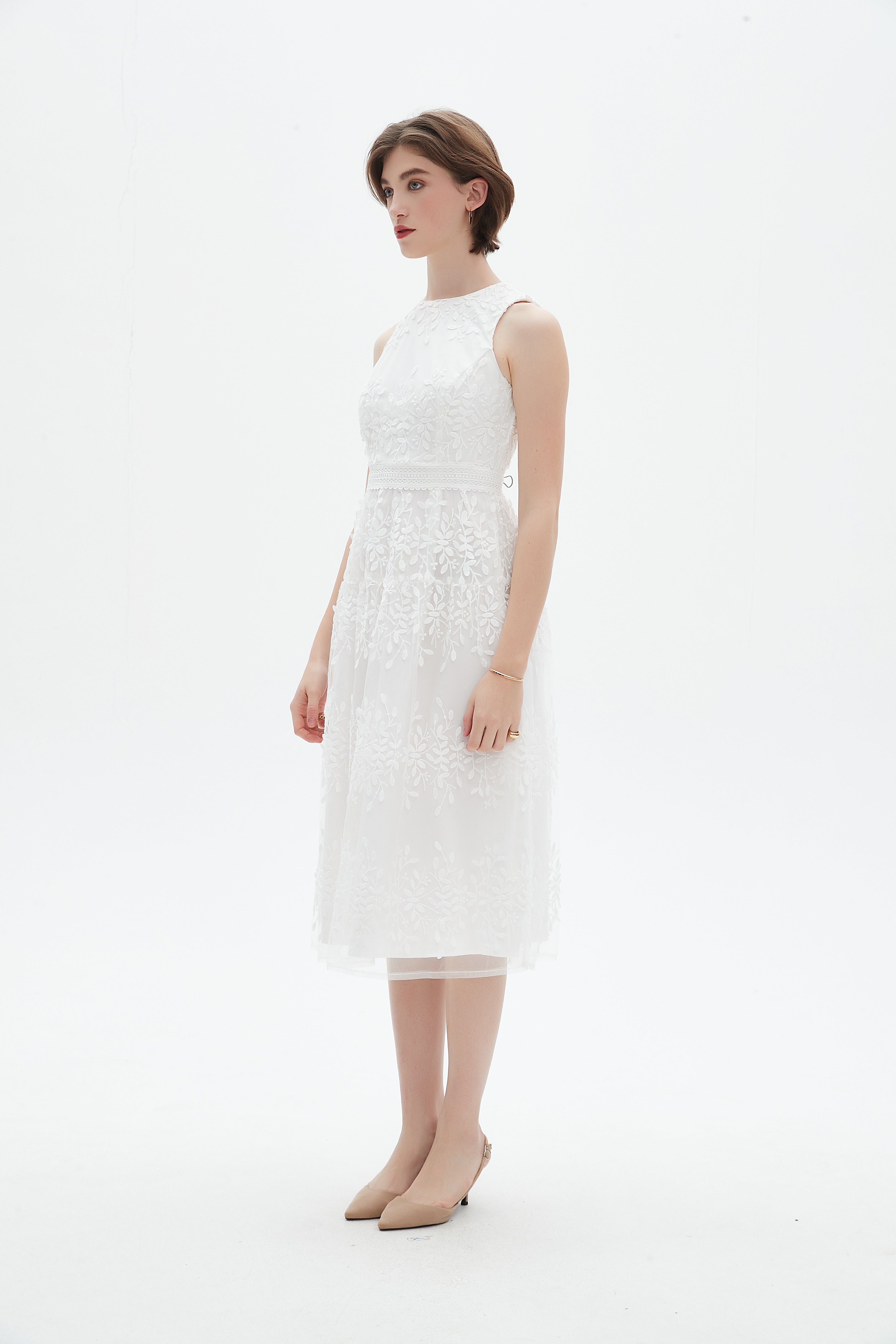 - Embroidered floral pattern on crisp white ground adds feminine texture