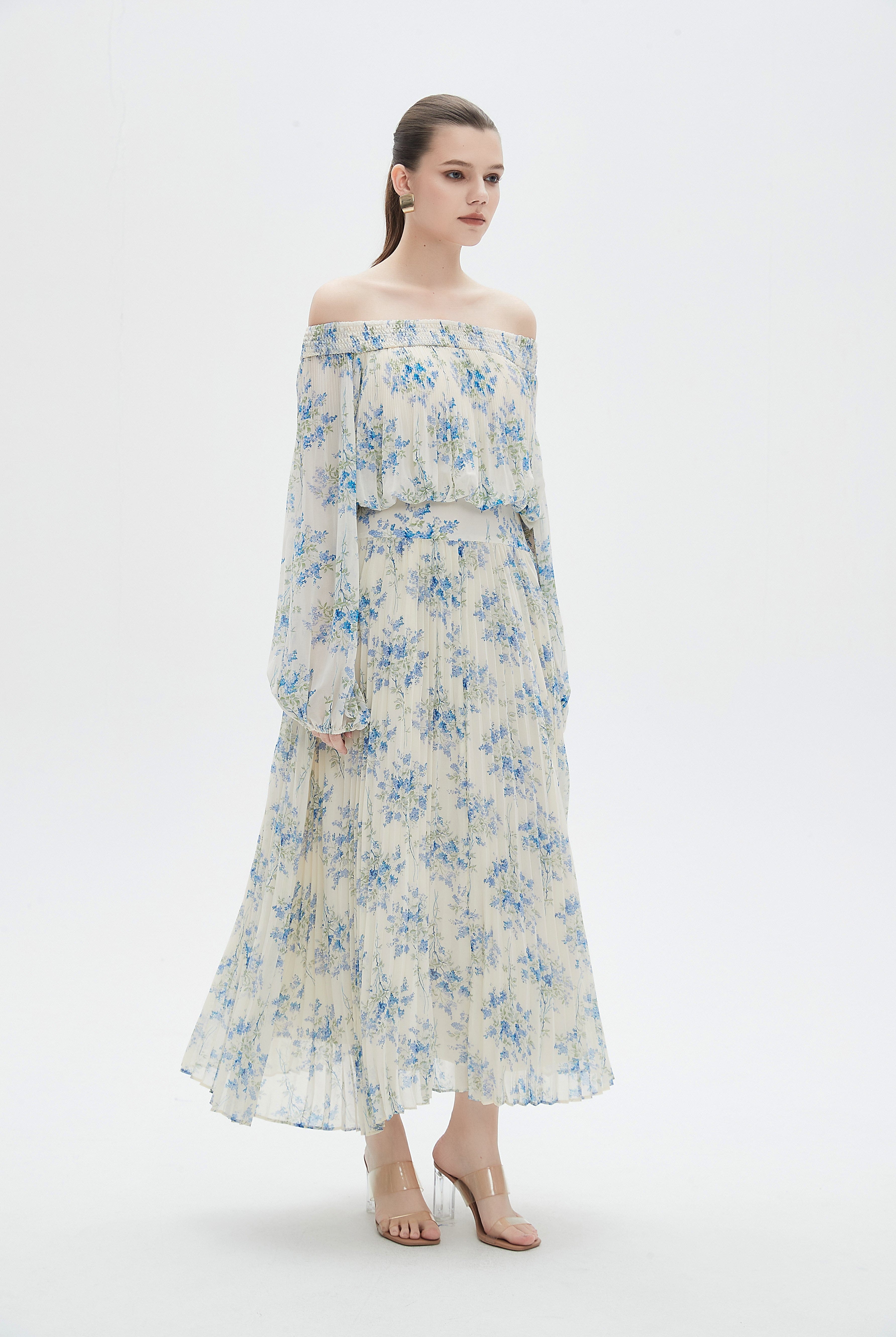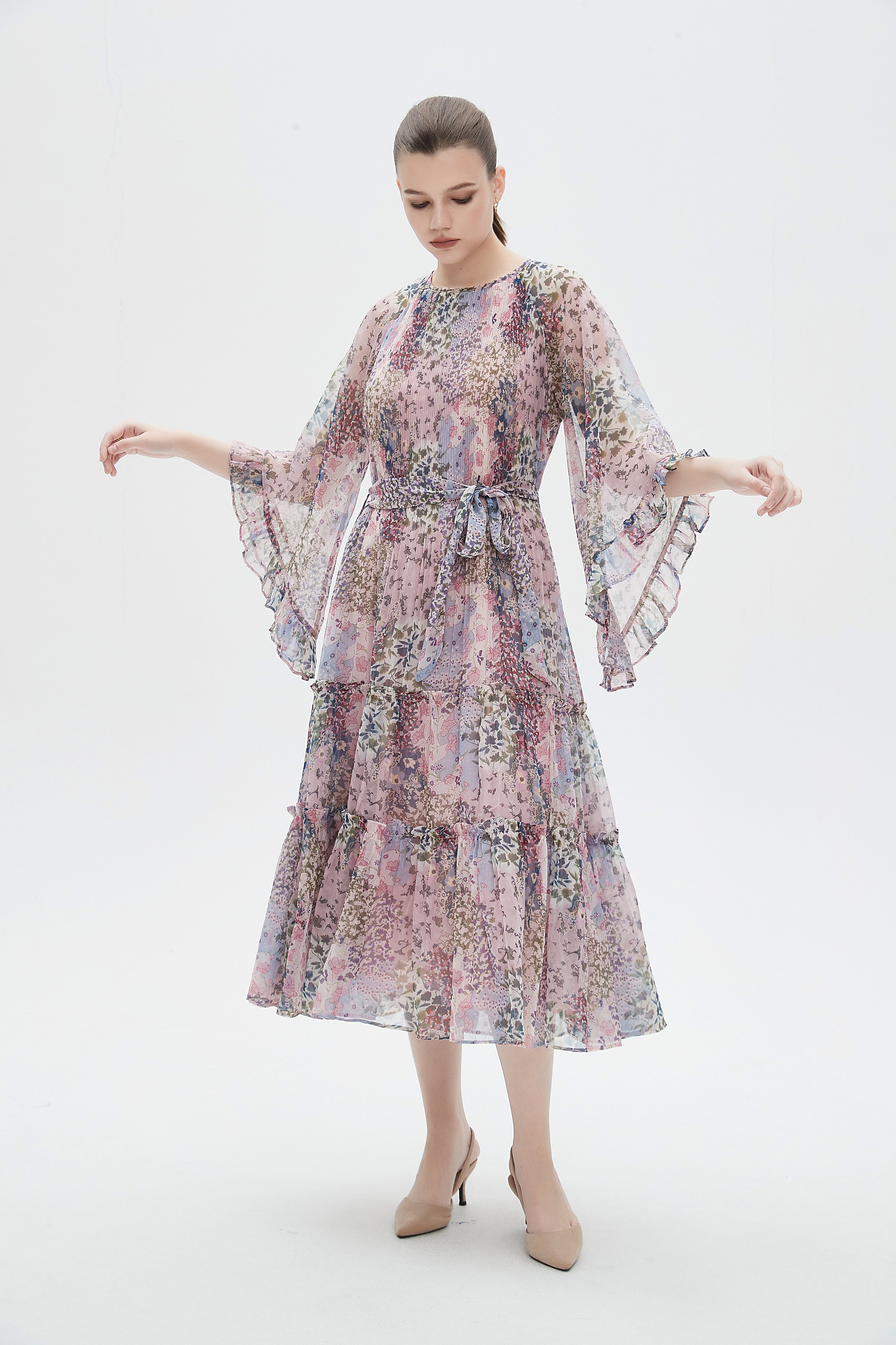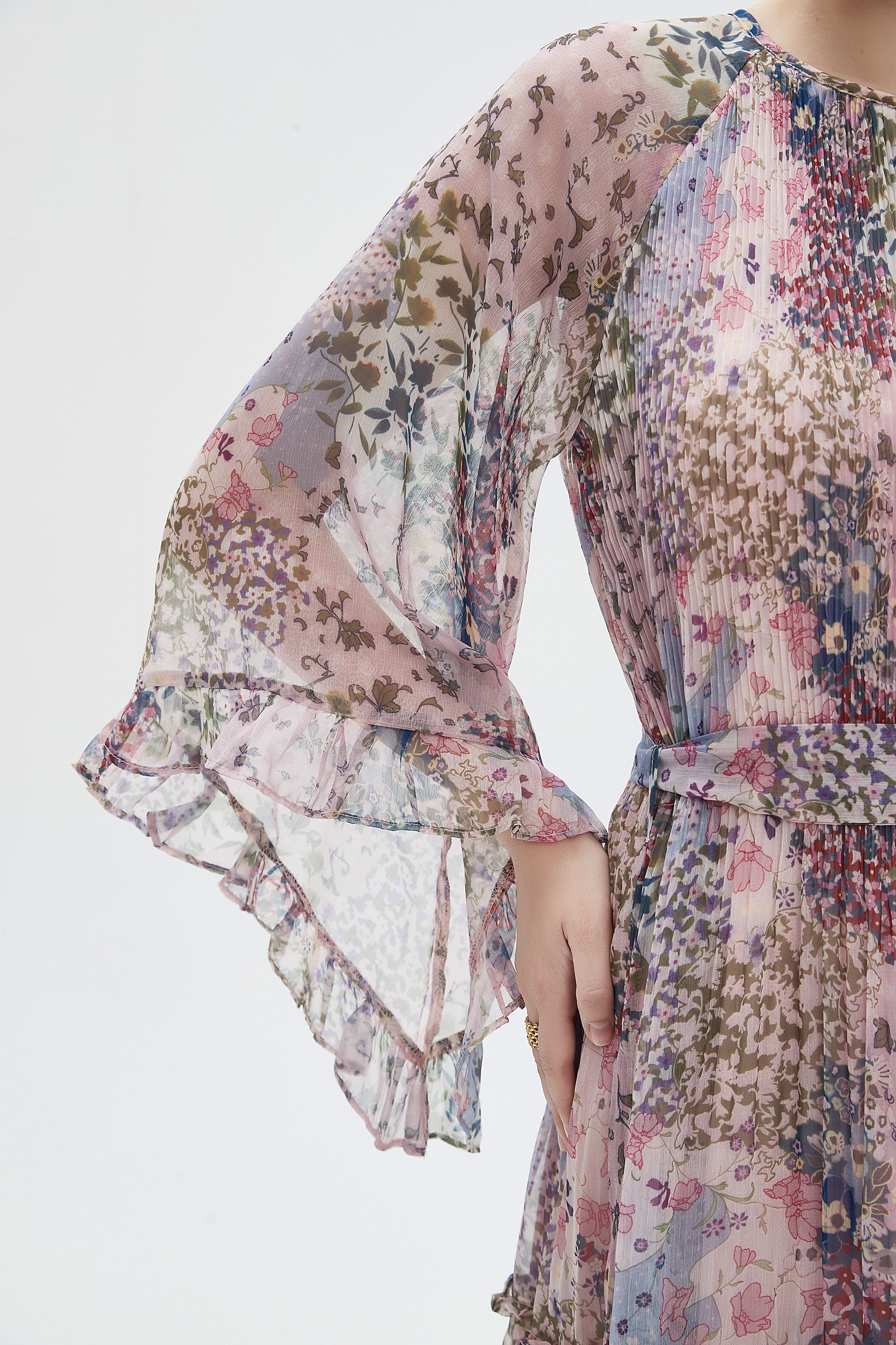Floral Midi Dress with Chiffon Detail and Long Sleeves