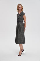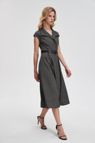 Polished and poised, the Black Patterned Midi Belted Dress elevates workwear with tailored ease, offering instant confidence from boardroom to after‑work drinks. This Nichii design features a flattering A‑line silhouette, shirt collar, short sleeves and a defined belted waist that skims the body in a regular fit. The patterned midi length lends professional polish while the polyester‑viscose‑nylon‑elastane blend delivers soft drape, wrinkle resistance and comfortable stretch; a 100% polyester lining ensures smooth coverage. The separate viscose‑PU belt adds structure and refined detail, and button closures create a neat front finish. Medium weight fabric makes it ideal for all seasons, while the pocketless, streamlined cut reads exceptionally smart. Shop this versatile business dress at Fashion SA and make it your go‑to piece for meetings, presentations and polished day‑to‑evening looks.