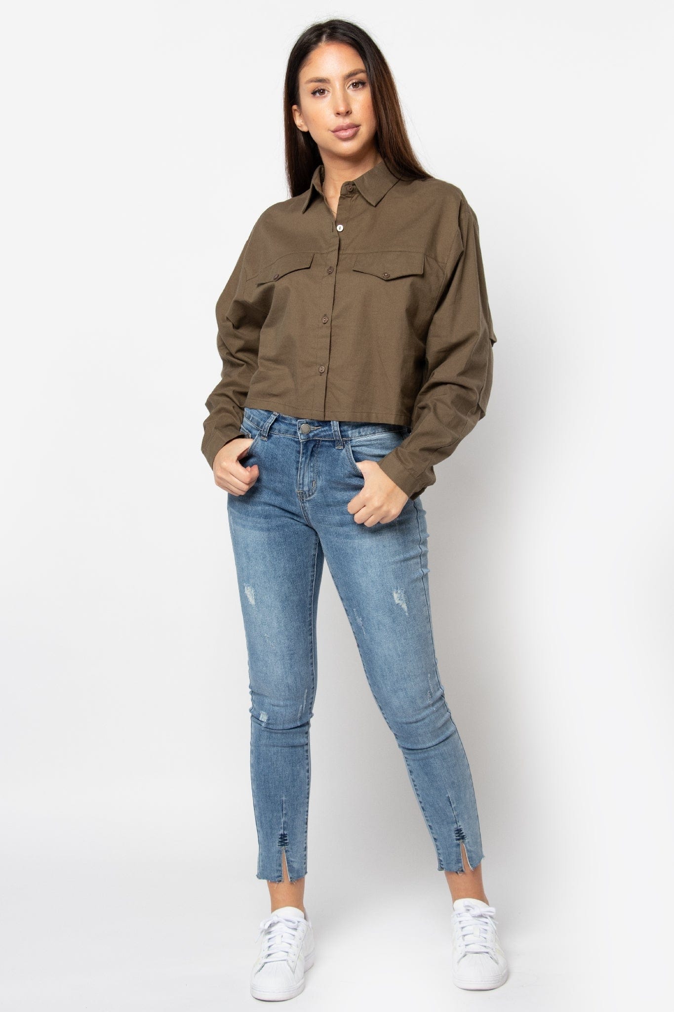 Add a stylish and modern touch to your outfit with a plain blouse with front buttons and long sleeves from Fashion Saudi Arabia. This blouse is available in great colors: Army Green and White. This blouse is designed with superior elegance and high quality to ensure comfort and elegance at the same time. It's cut for a sleek cut and buttoned front adds a touch to the blouse. Wear it with jeans or a skirt for any occasion. Get now a plain button-down blouse for women with long sleeves from Fashion Saudi Arabia and get ready for a charming and distinctive look. Order it now through Fashion KSA and don't miss this opportunity! Product Number: 07-0758