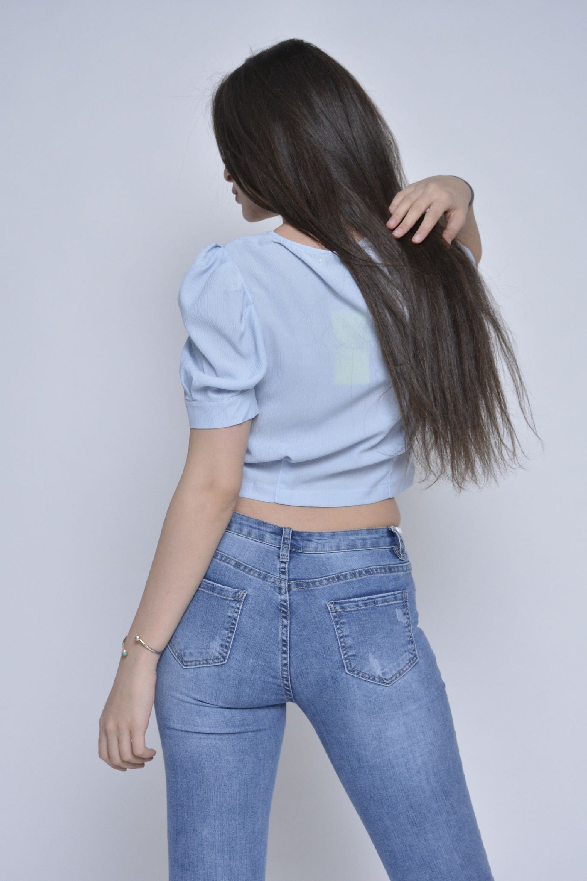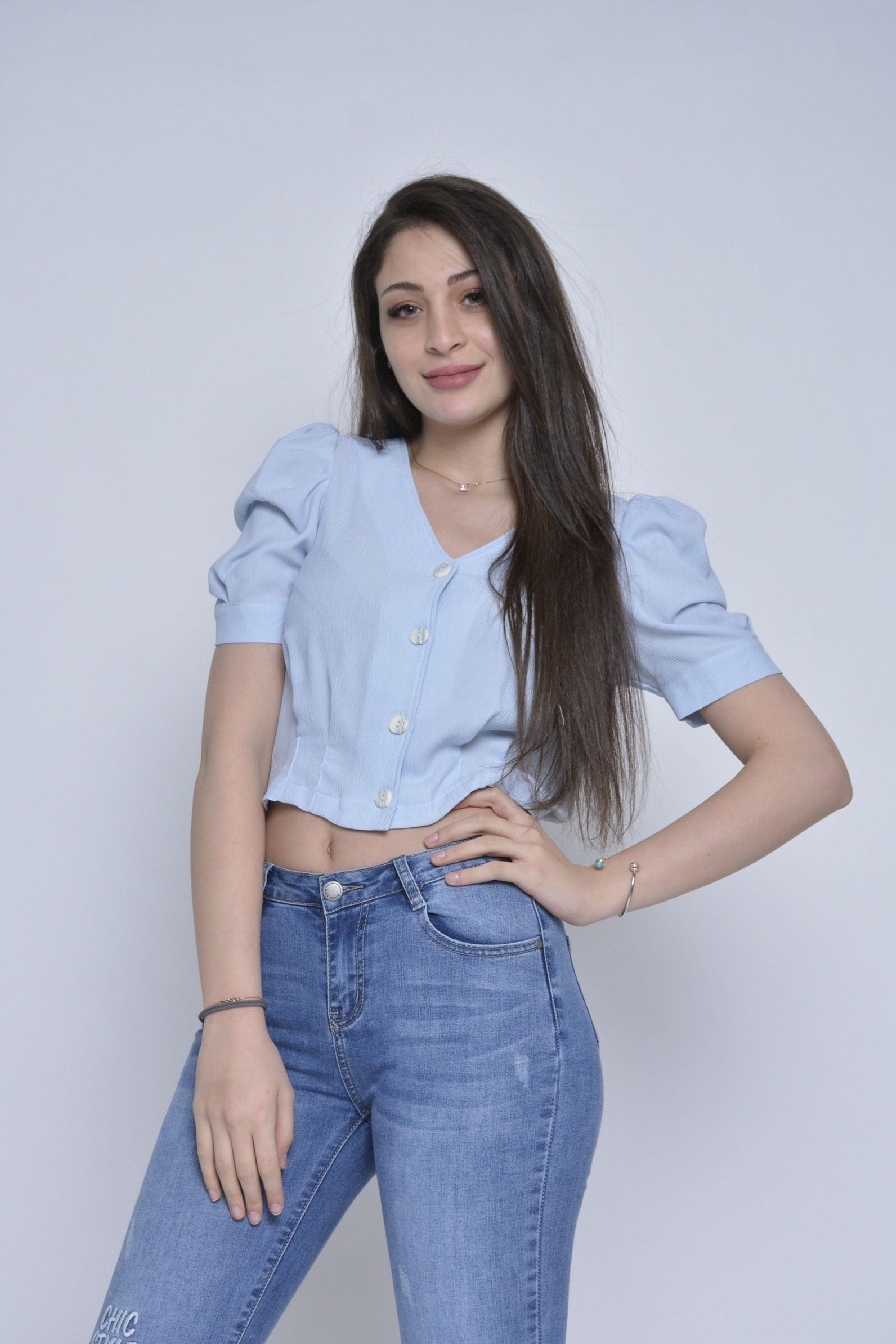 Prepare for an elegant and distinctive look with seven belly blouse with front buttons and a short and brilliant women Mica. This blouse is characterized by its attractive and modern design, as it comes with front buttons that add an elegant and distinctive touch, and a length of up to the middle of the abdomen for an attractive and exciting look. Thanks to the short sleeves, you can wear this blouse on any occasion and switch it easily to suit your taste and style. Available in light blue and bright white colors, you can choose the color that suits you and highlights your beauty. Now ask for seven belly text blouse with front buttons, a short amount of women from Saudi Fashion, and get a wonderful and distinctive look. Product number: mgl0120-20Q202