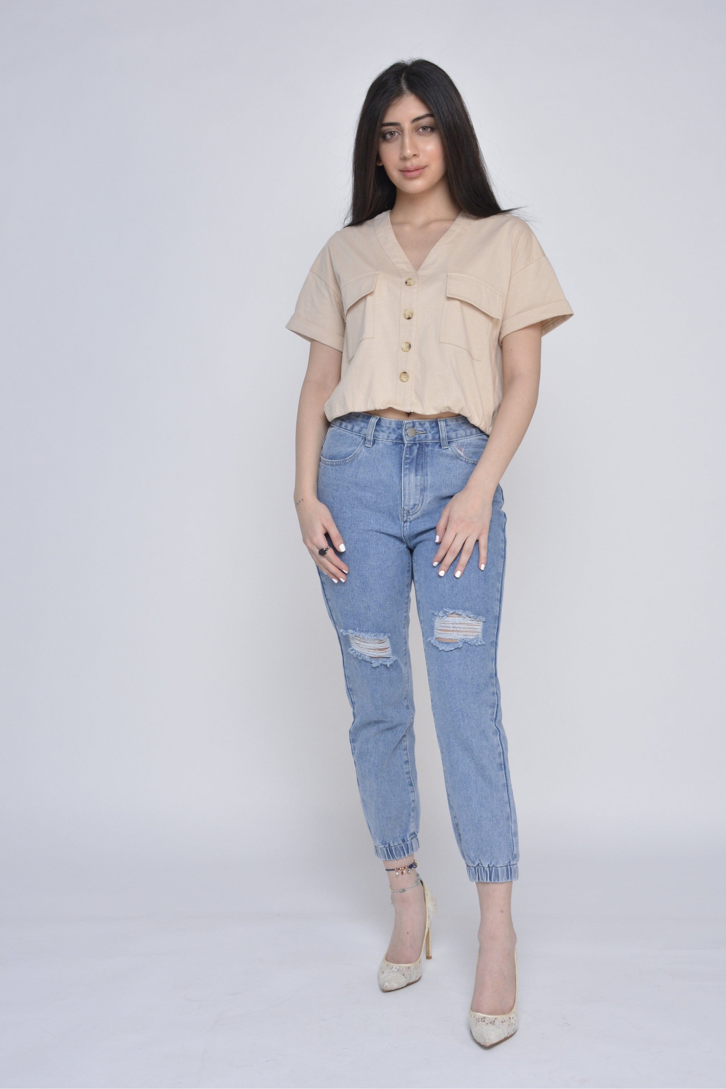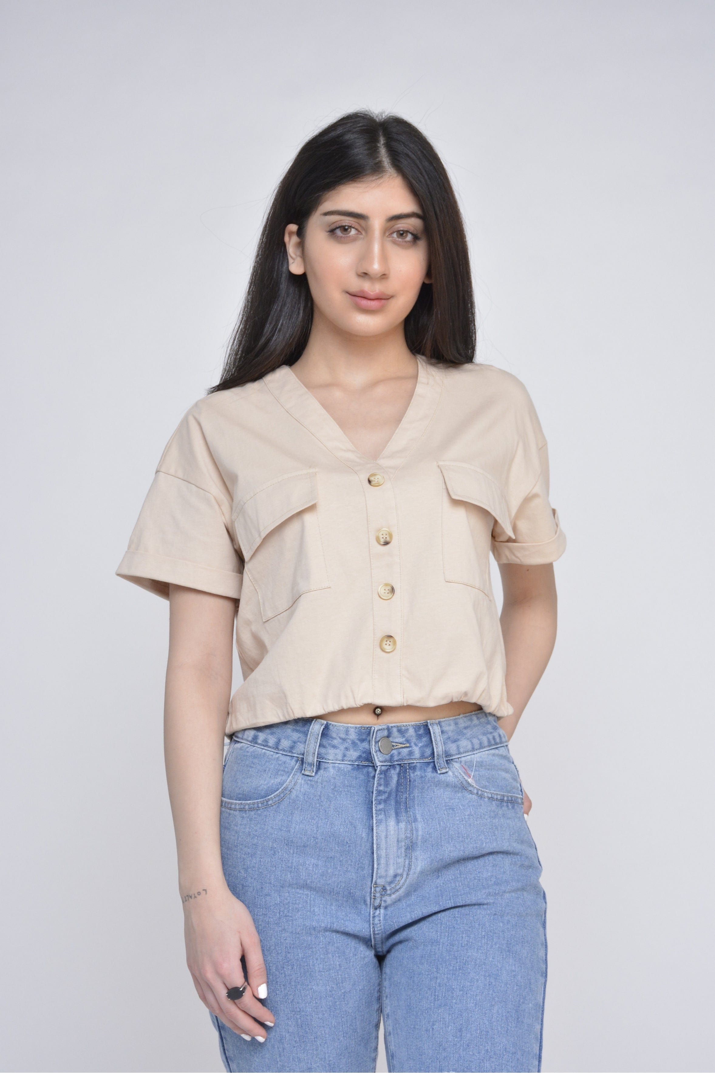 Discover the latest fashion trends with a belly text shirt with pockets and front buttons short women Mica. This amazing shirt features its unique and elegant design, as it features a comfortable and elegant story at the same time. Made of high -quality material provides you with comfort throughout the day. It is characterized by the details of the pockets and the front buttons that add a feminine touch and elegance to your look. Available in exquisite almond and White colors to suit your unique taste. Get this great shirt now and enjoy an attractive and modern look at every occasion. Ask it now from the Saudi Fashion and I am the focus of attention anywhere you go! Product number: ms80217-20Q107