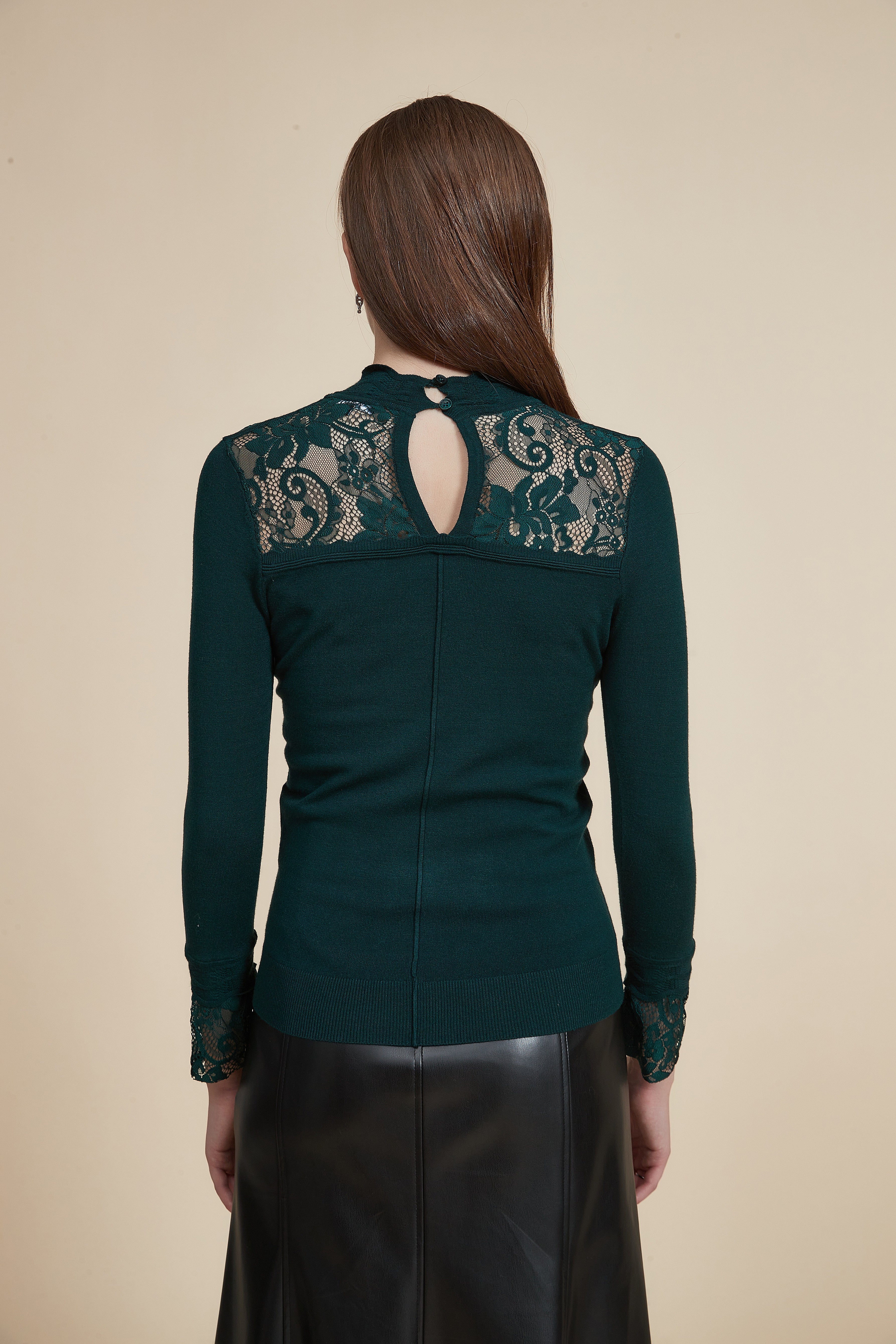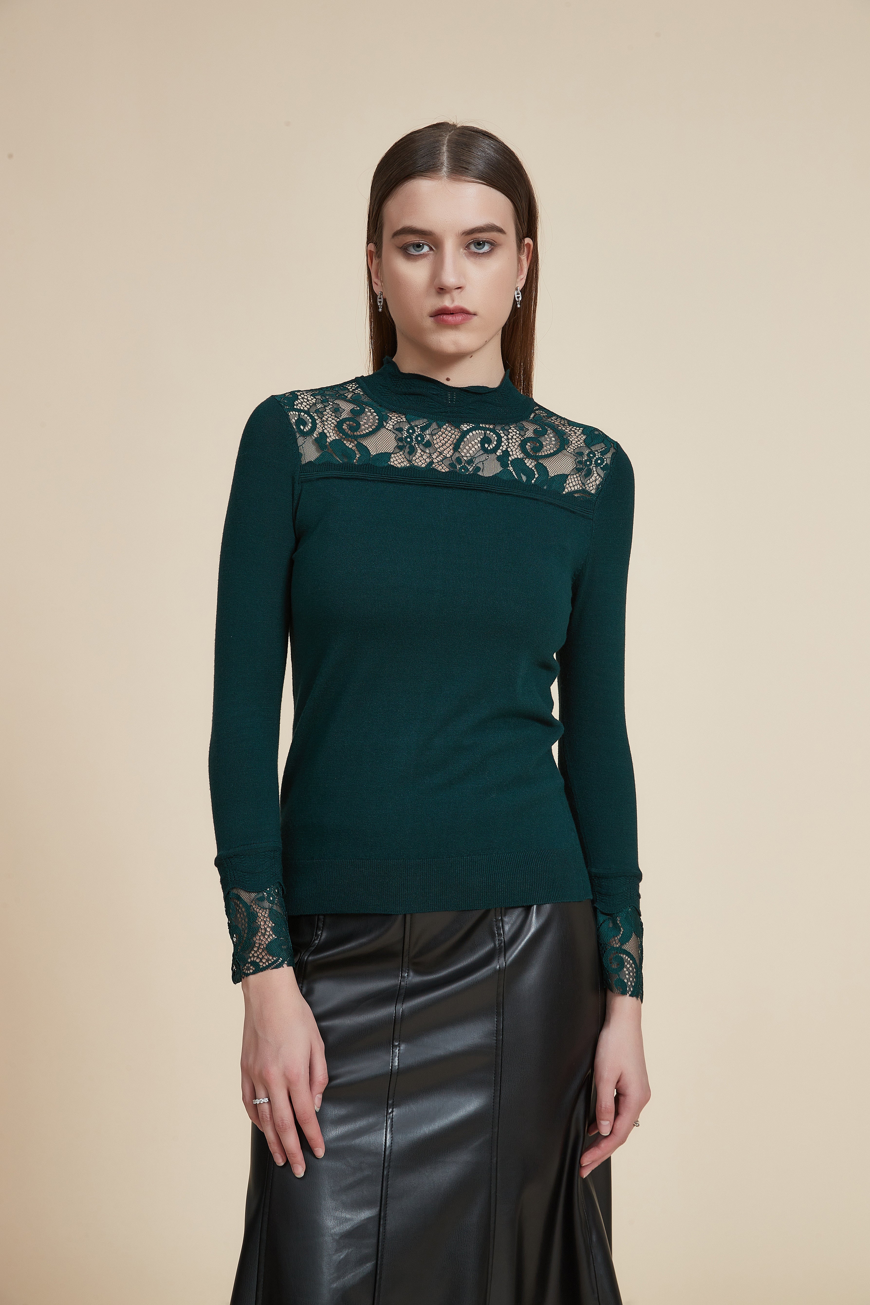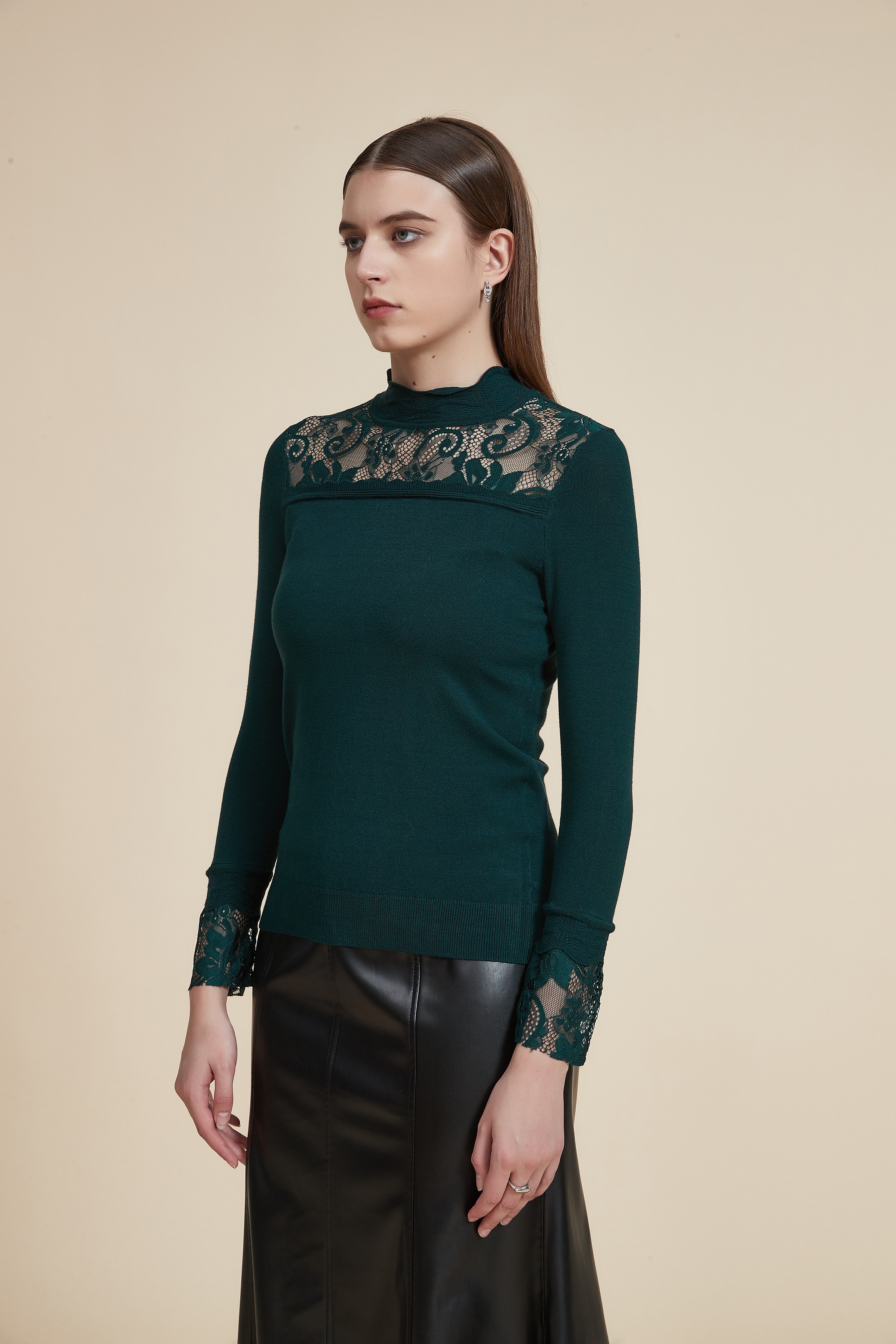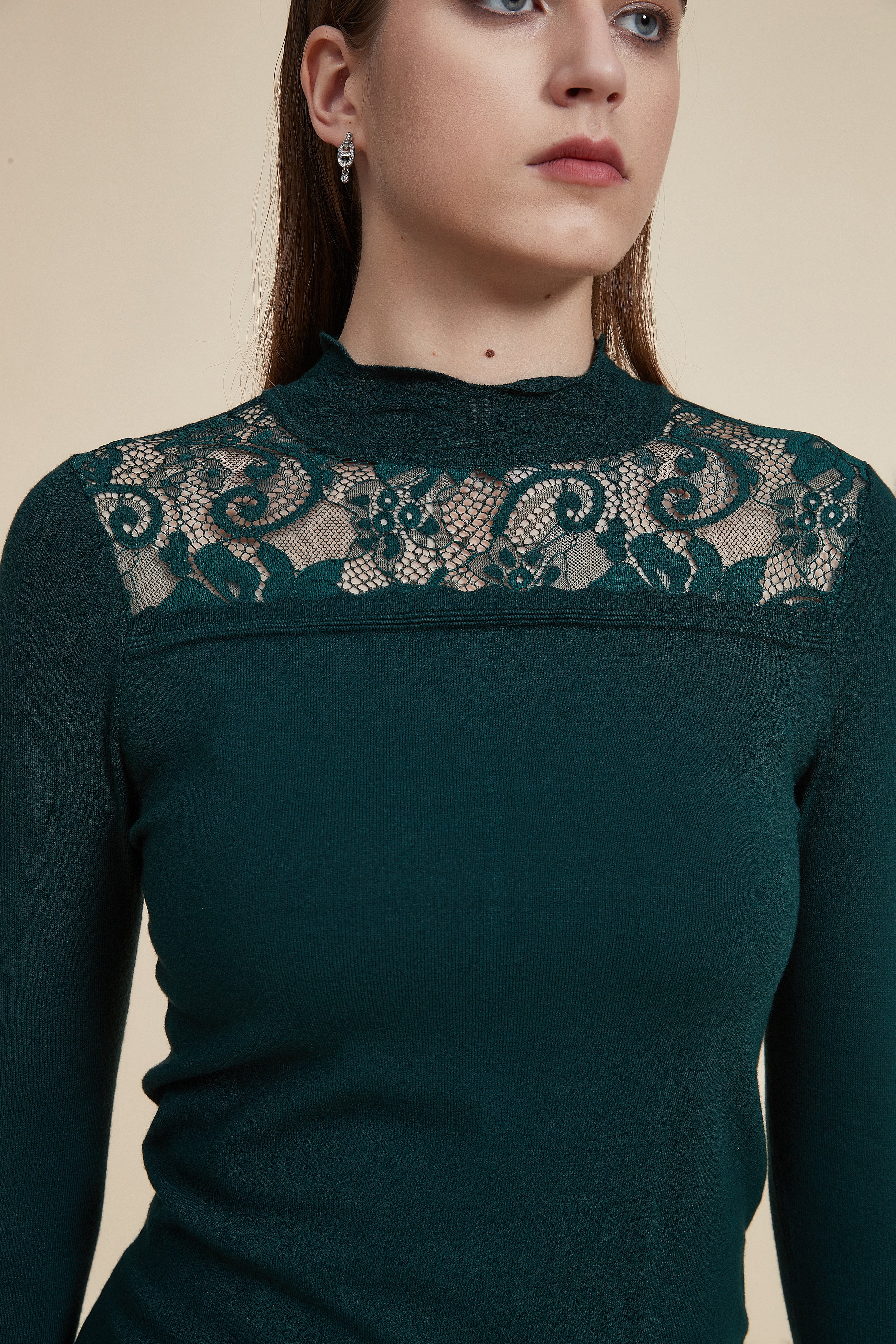 Solid High Neck Long Sleeve Top with Lace Details