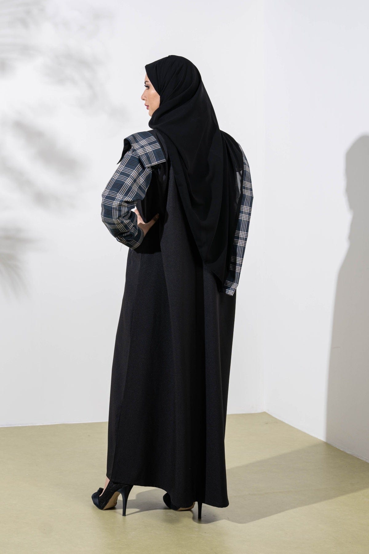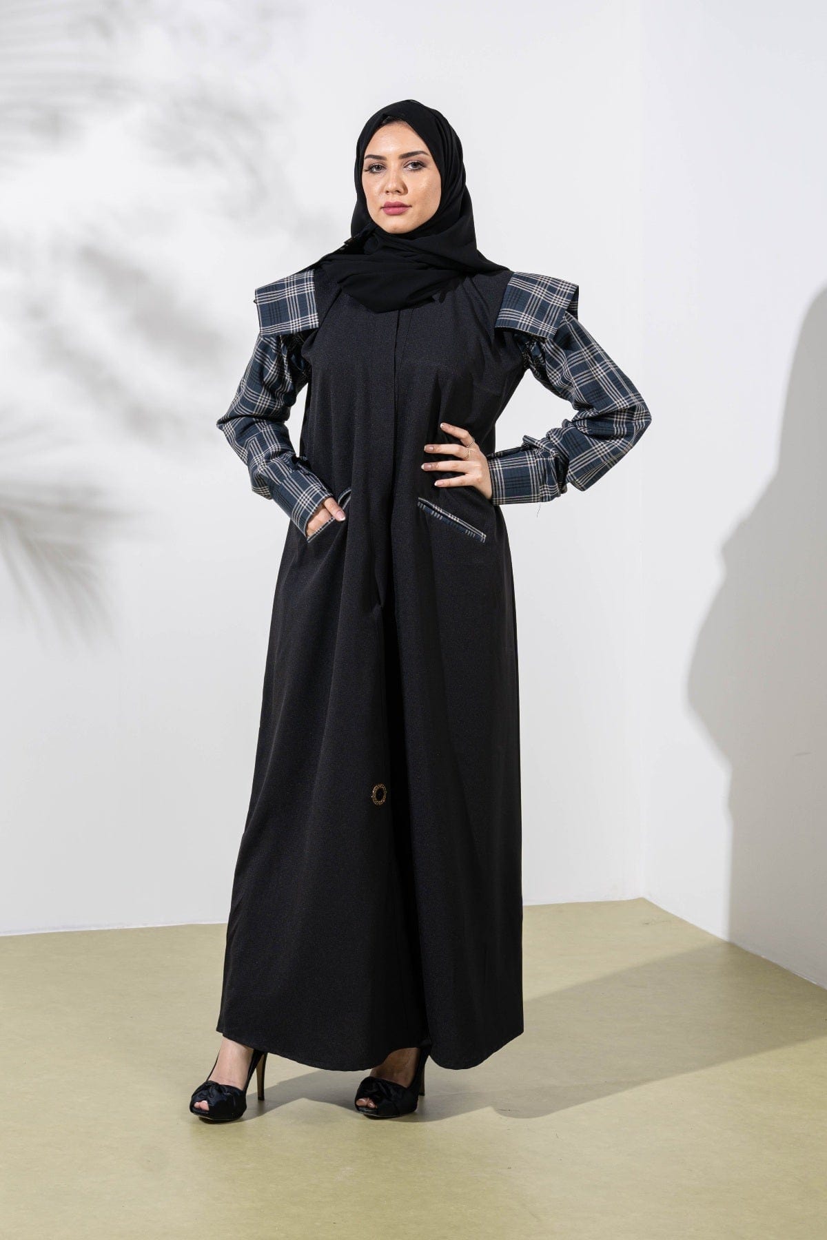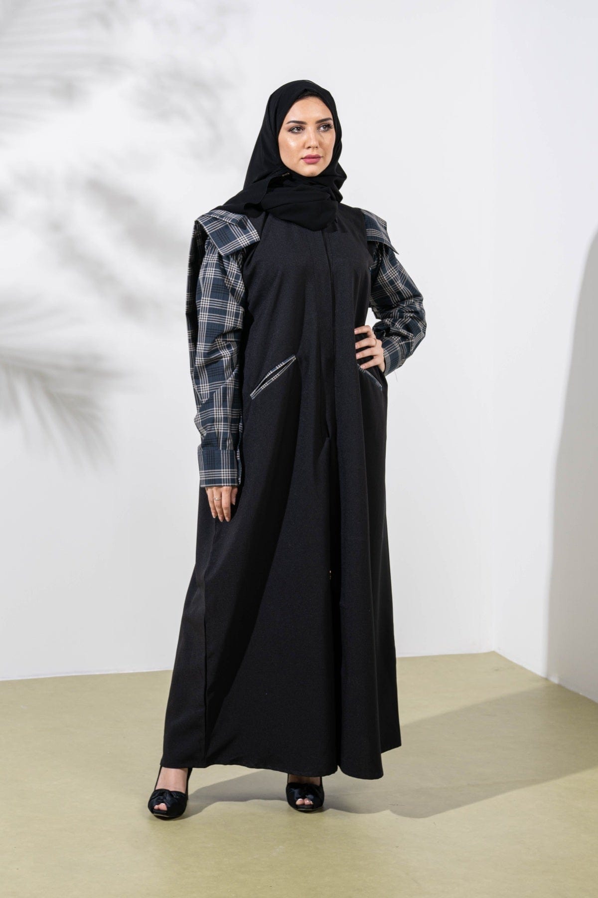 Get ready for a glamorous look with the elegant crepe abaya with checked sleeves, collar, pockets and front buttons from Johrh. This abaya is available in a gorgeous black color, which adds a touch of elegance and beauty to your look. They are designed with superior elegance and meticulous details make them ideal for special occasions and everyday times. Its sophisticated crepe fabric and contemporary design feature checked sleeves, a neckline, pockets and front buttons, adding a distinctive and modern touch to your look. Get now a crepe abaya with checked sleeves, a neckline, pockets and front buttons in black color from Johrh Be the center of attention on every occasion. Order it now through Fashion KSA and get ready to shine. Product ID: 10377