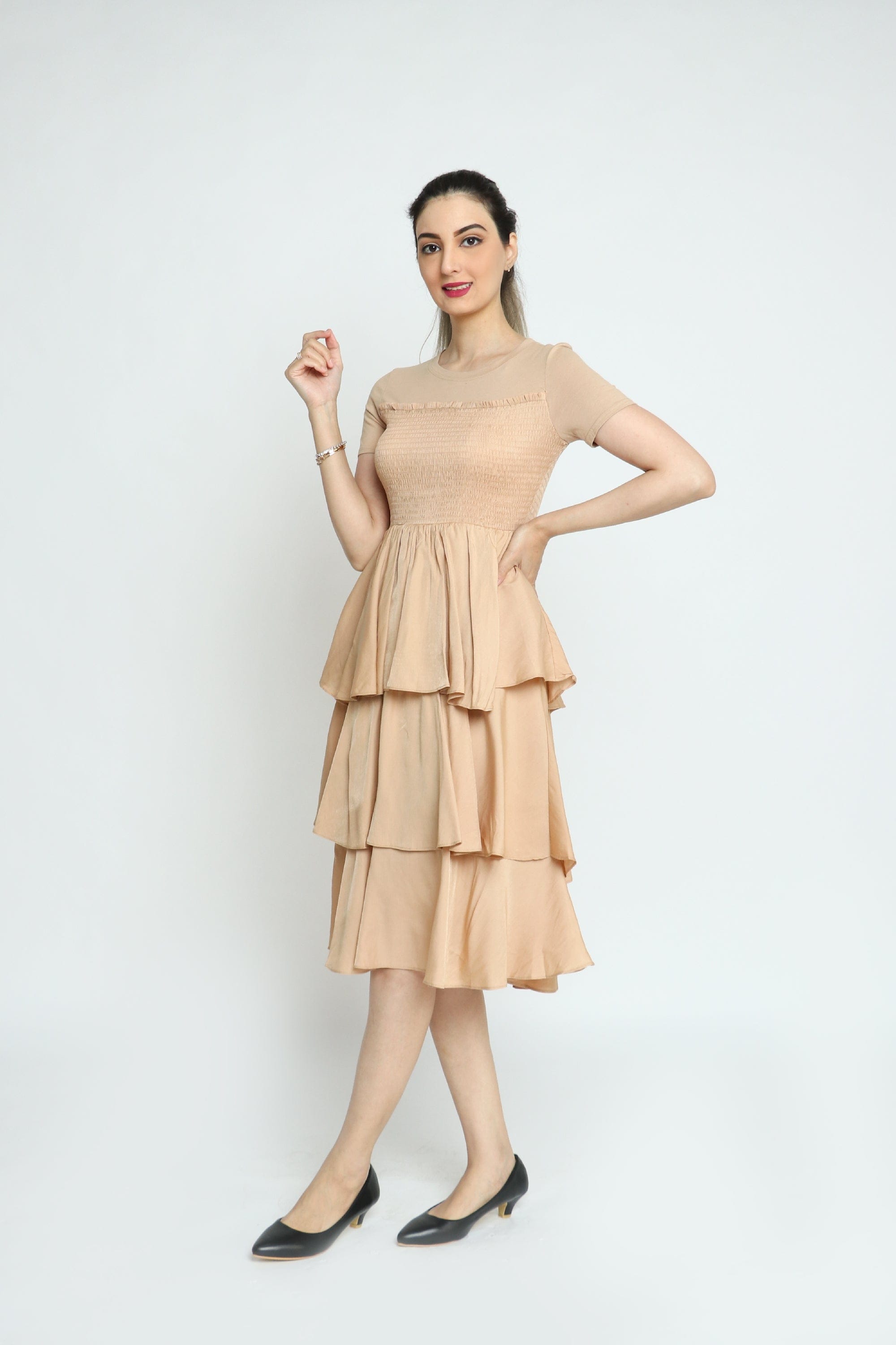 Fresh, feminine and effortlessly wearable — this Beige Solid Midi Ruffled Dress from Kitschen is a wardrobe essential for spring and autumn. The flattering A-line silhouette skims the waist and falls to a versatile midi length, while delicate ruffled detailing and a classic round neck add soft, feminine interest to the plain beige canvas. Designed in a medium-weight, unprinted fabric with a regular fit and short sleeves, the non-padded bodice and beltless, pull-on construction (without closure) make it comfortable and easy to wear all day. Ideal for casual weekends, brunches or relaxed office days, it layers beautifully under a denim jacket or a tailored blazer. Discover this go-to piece on Fashion SA and elevate your everyday rotation — add to cart now for timeless, fuss-free style.