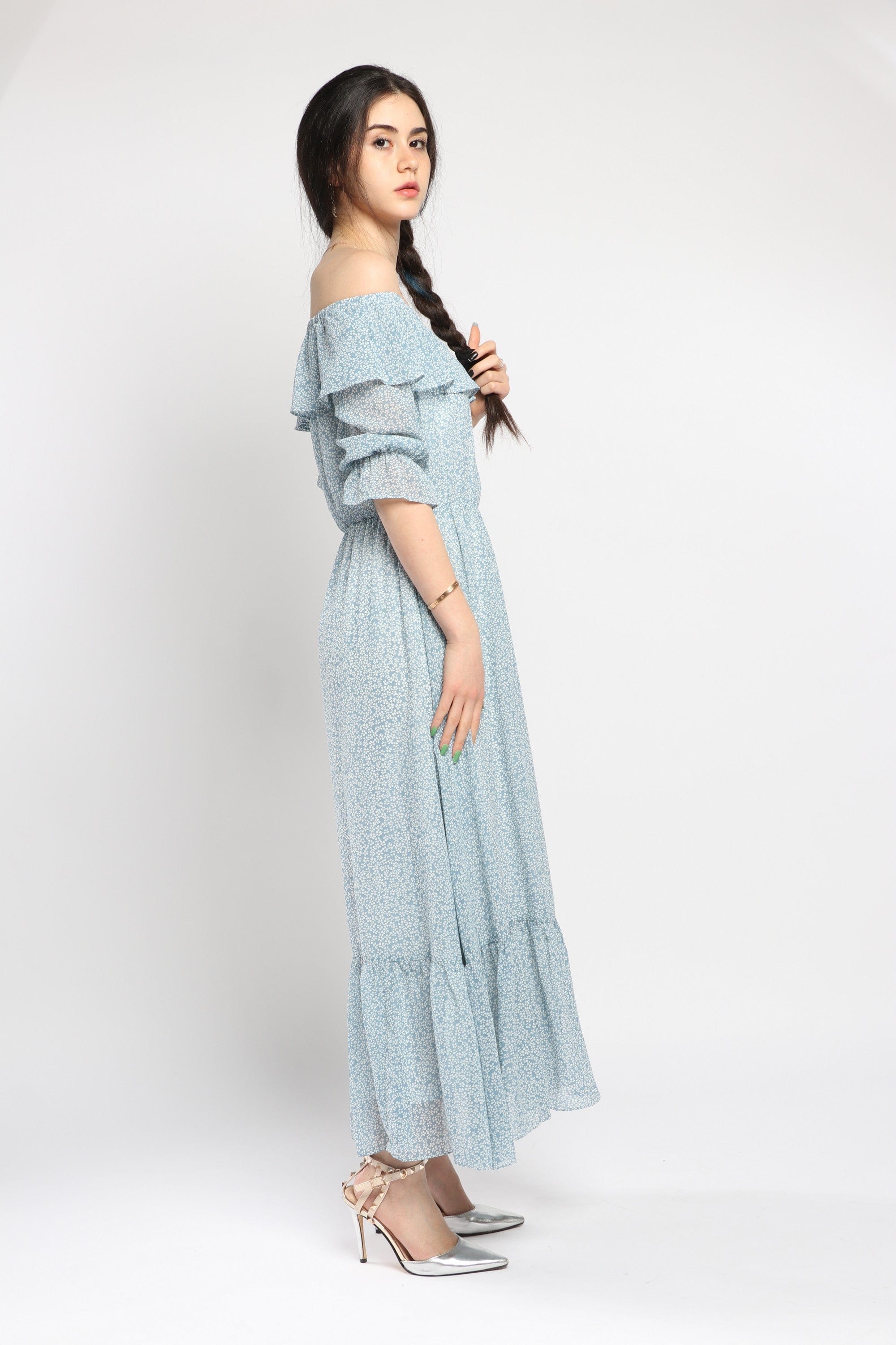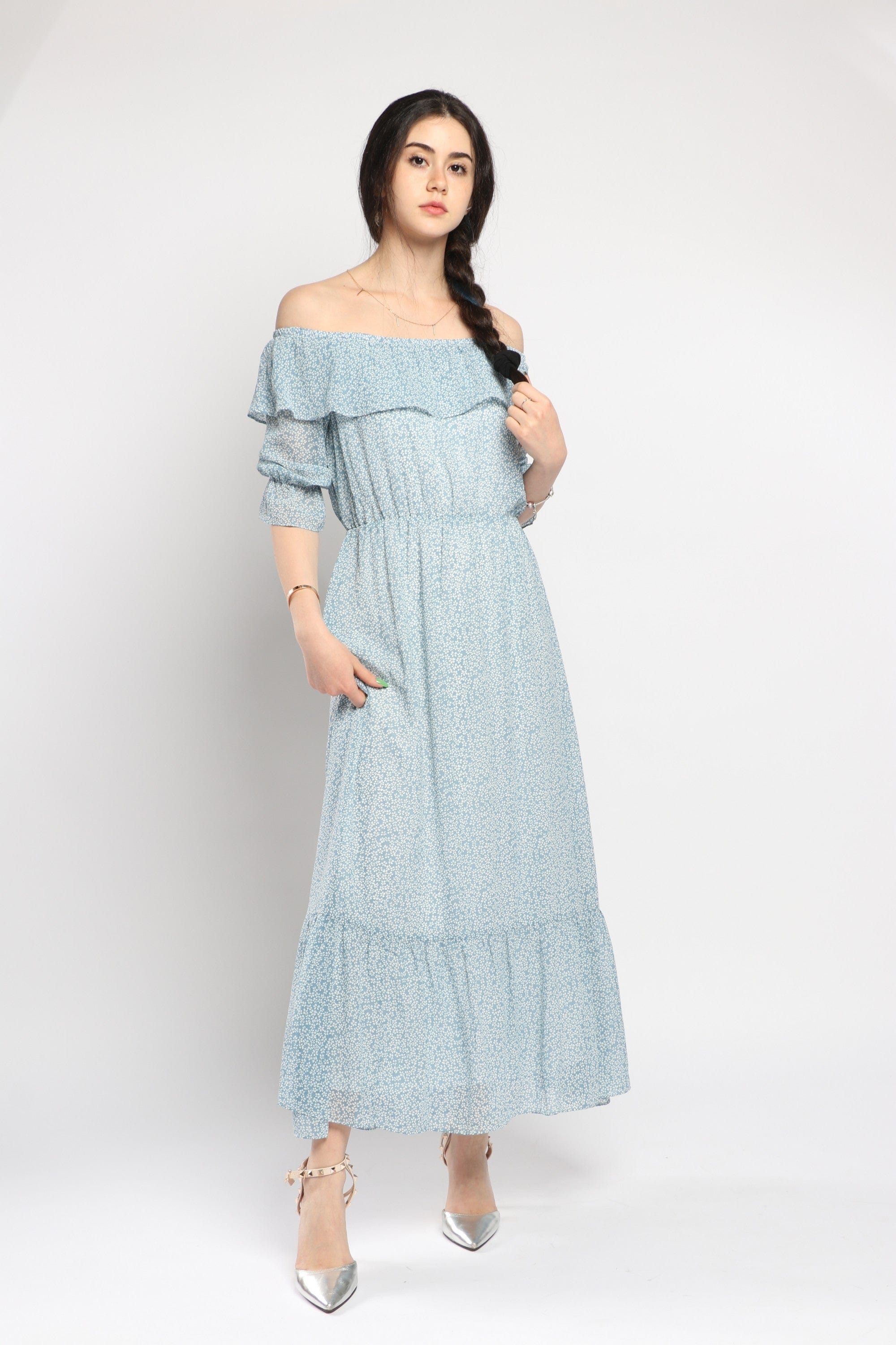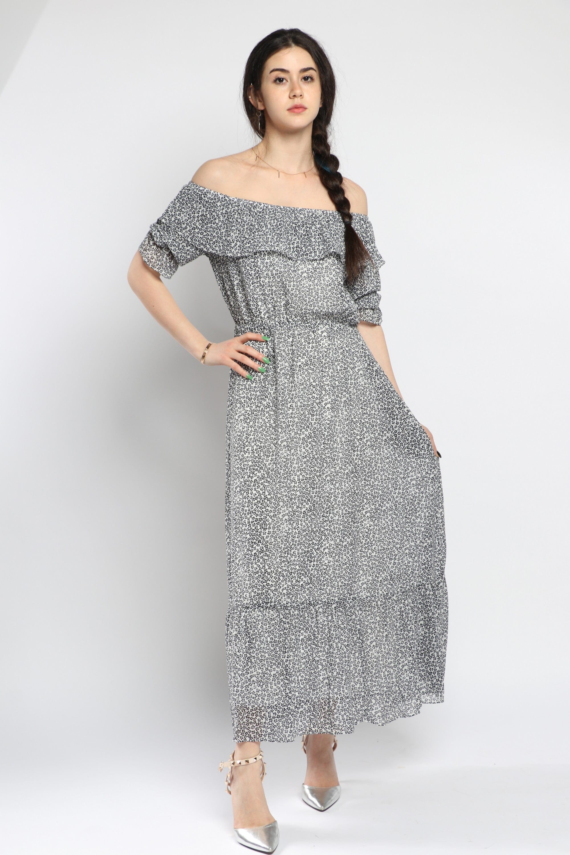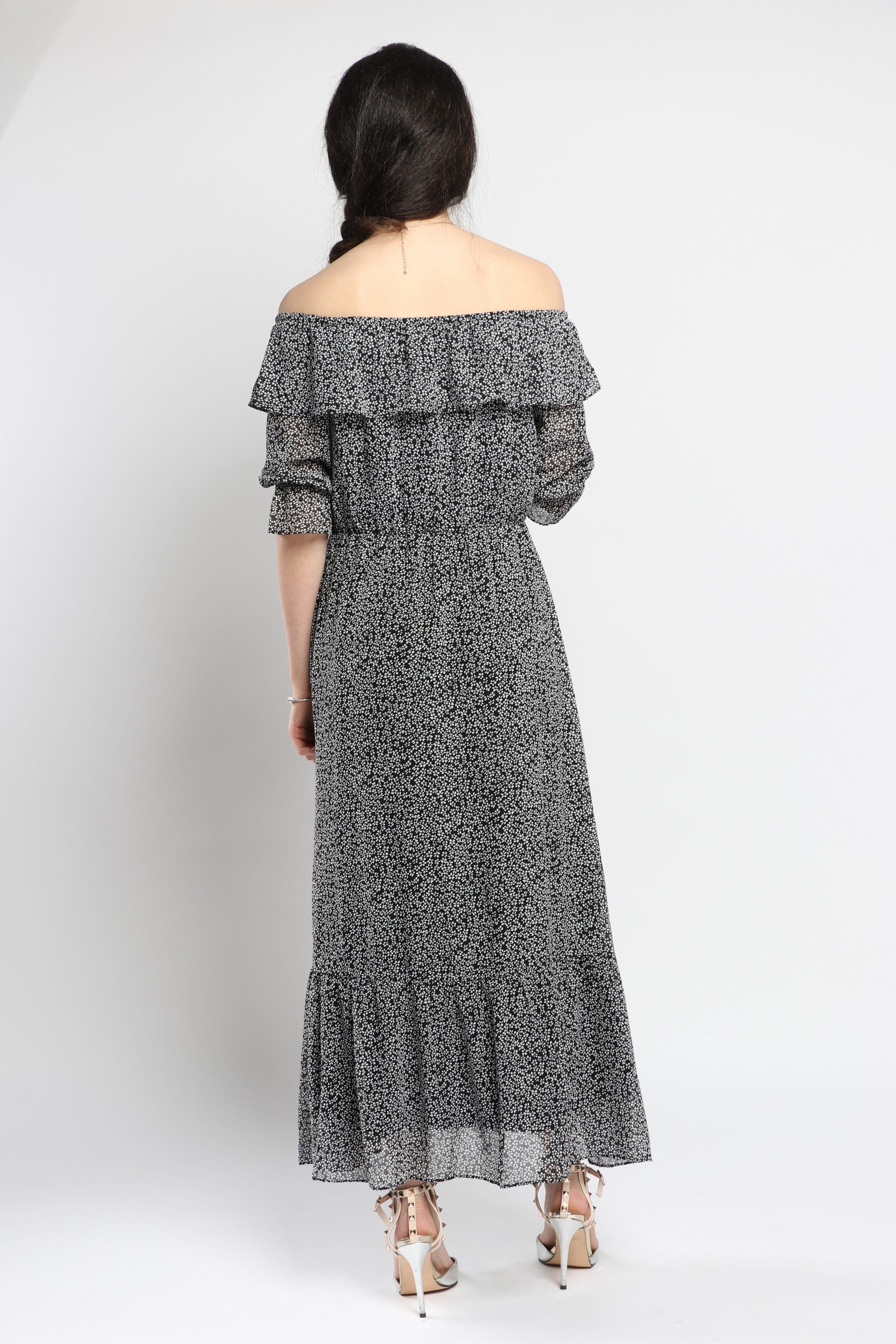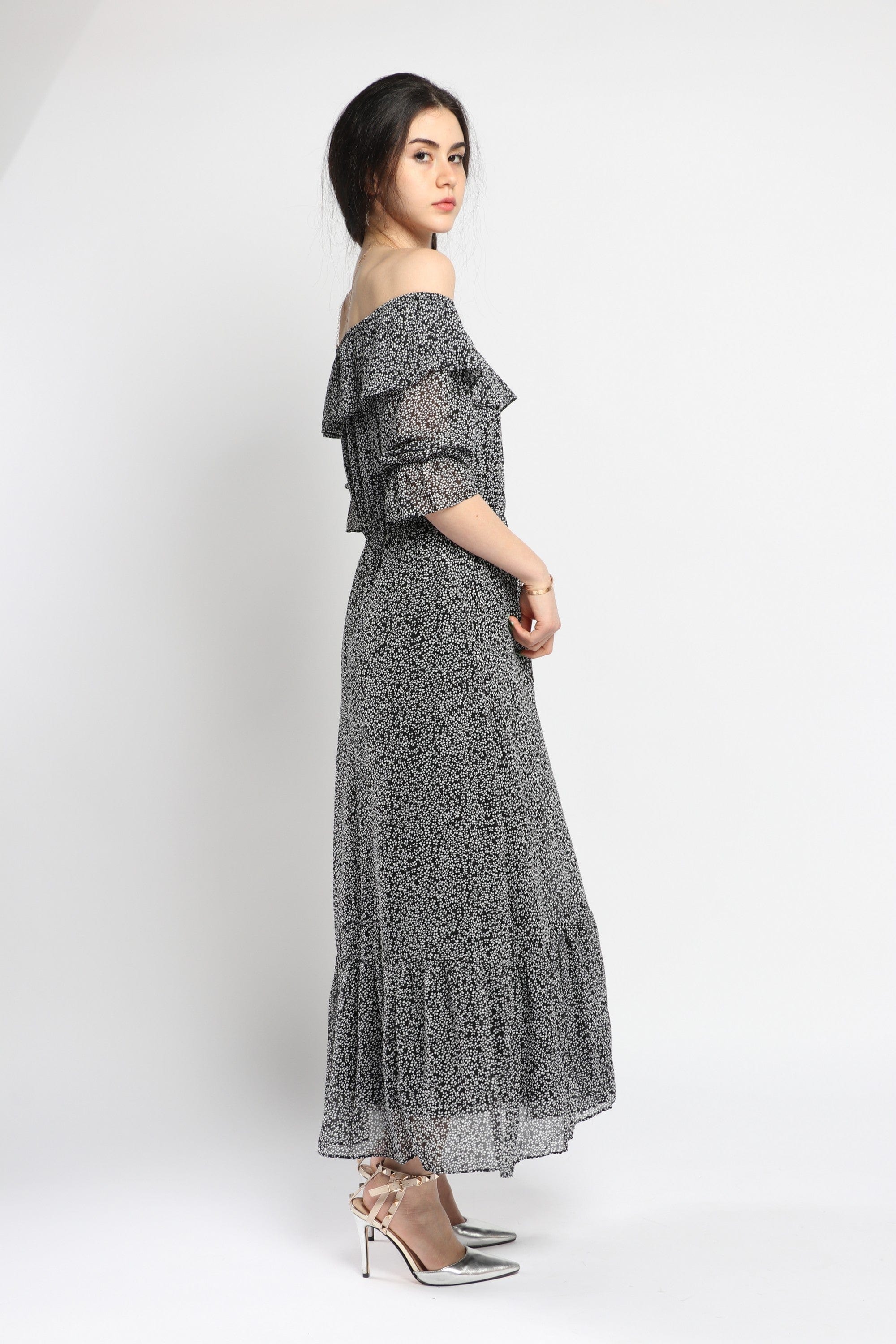 This Black Patterned Maxi Ruffled Dress delivers instant, feminine drama with comfortable everyday ease. The A-line silhouette and flowing maxi length create a flattering, elongating drape, while the off-shoulder collar and soft ruffled trims add romantic detail. Cut in a medium-weight woven that skims the body, the regular-fit construction and elastic waist offer a comfortable, pull-on fit without closures; the unlined design keeps it breathable for spring and autumn. Three-quarter sleeves balance coverage and movement, and the patterned black print makes it versatile from brunch to weekend strolls. Pocketless and beltless for a clean silhouette, the dress layers beautifully under a denim jacket or leather moto for cooler days. Find this casual, everyday essential at Fashion SA — add it to your wardrobe and shop now.