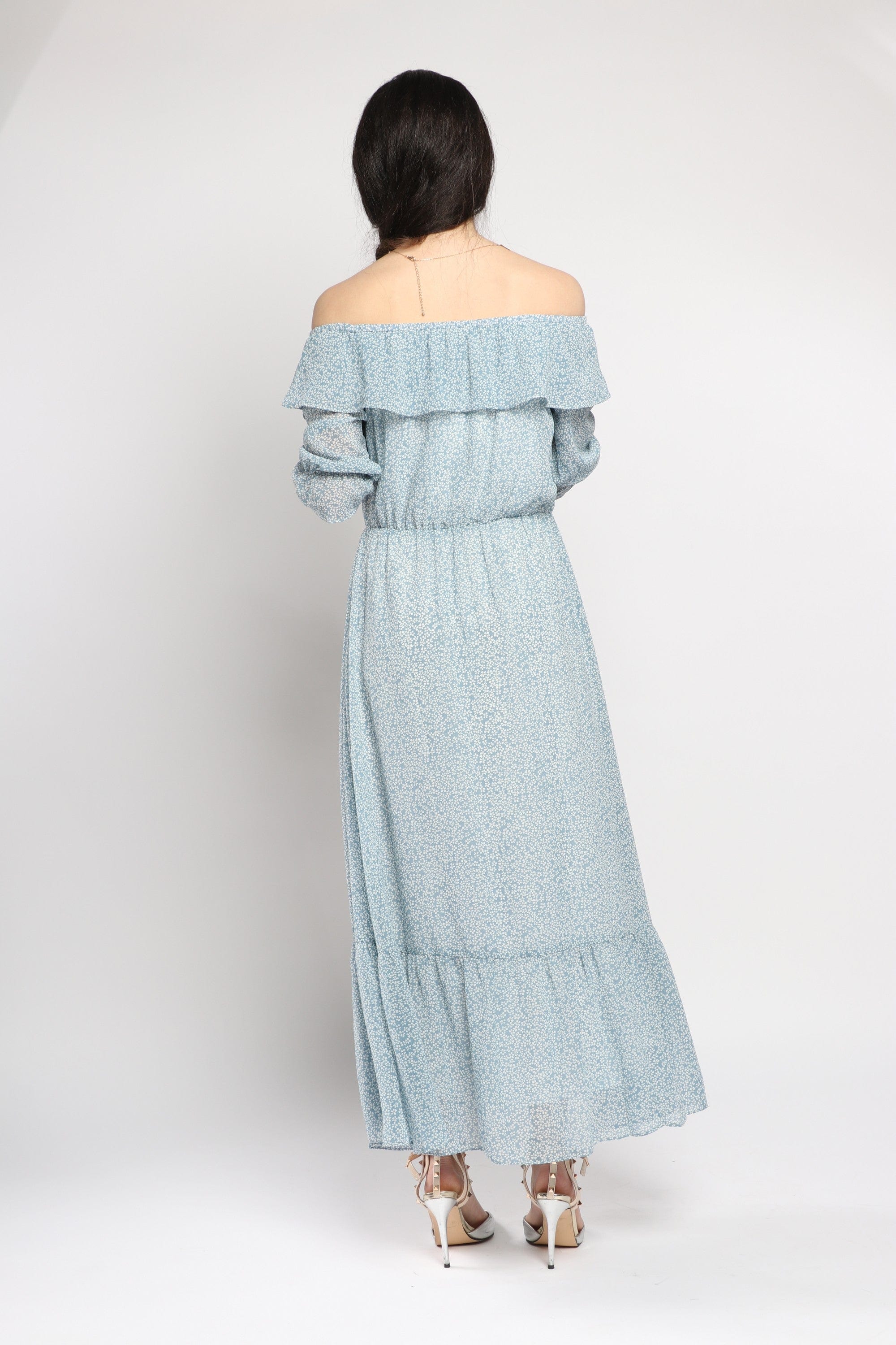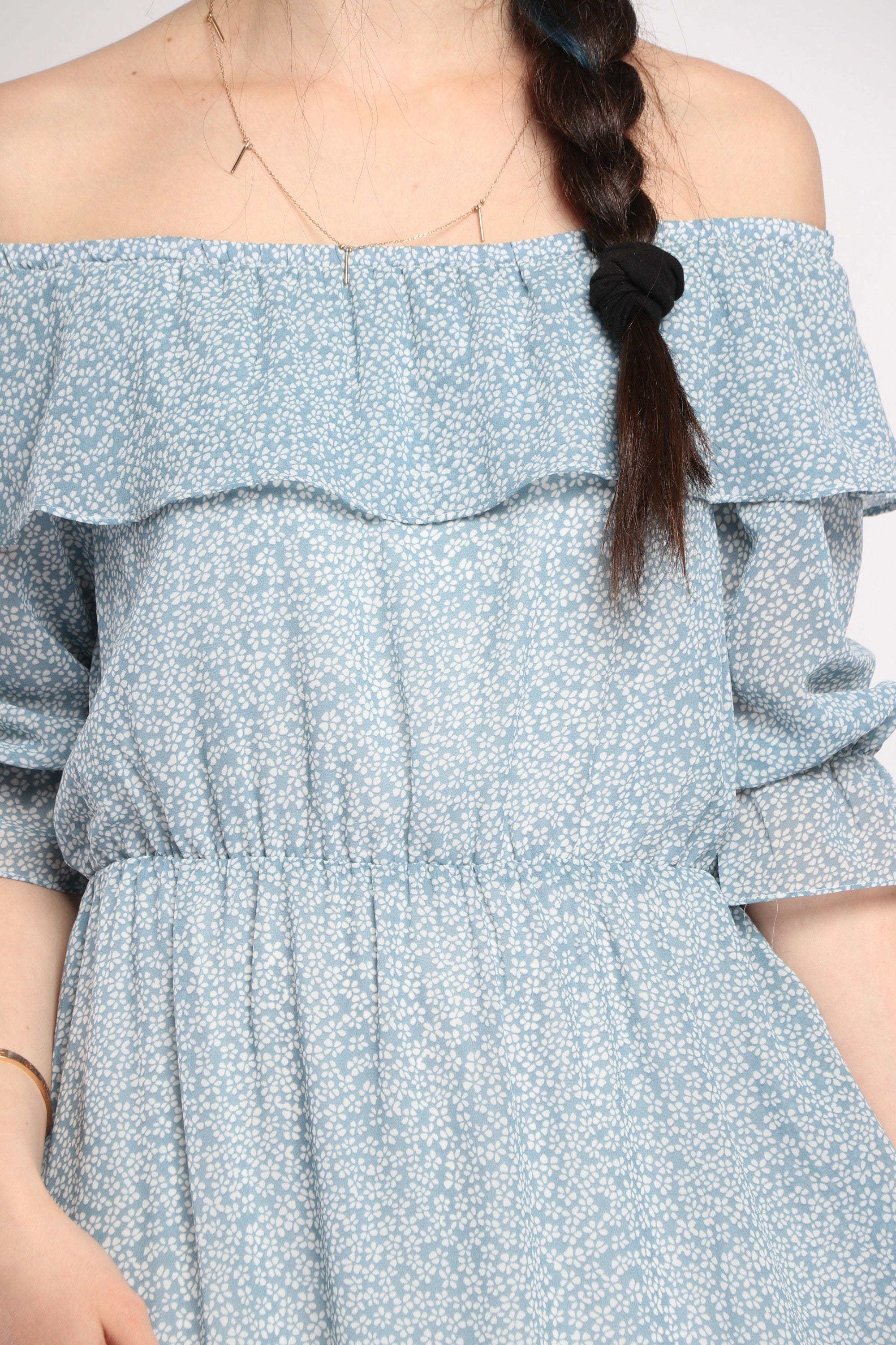 • Off-shoulder collar, ruffled trims and elastic waist create feminine shape without closures