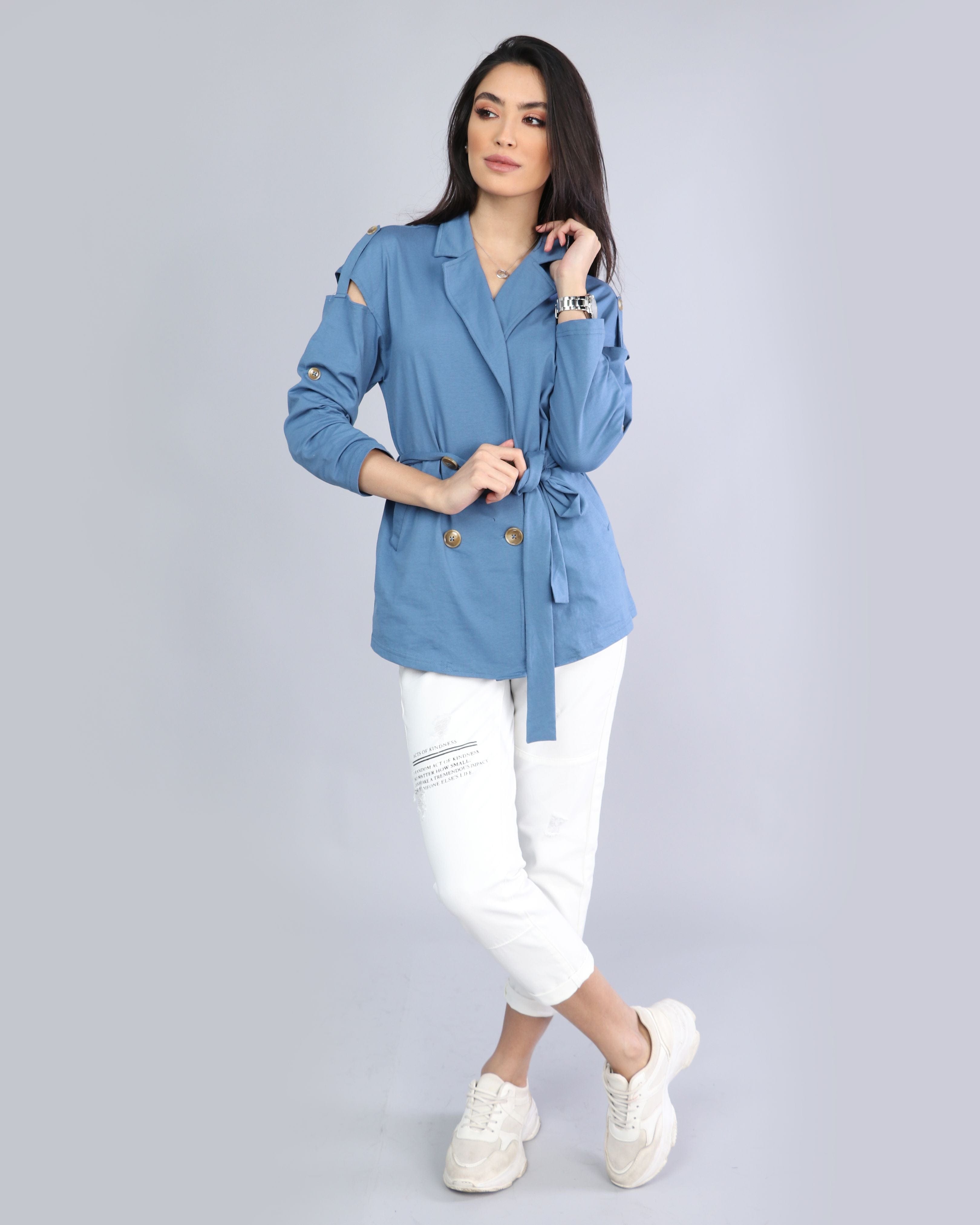 Get ready to shine with a distinctive women's formal jacket from Saudi Fashion. This jacket comes in an elegant design that features a collar, golden buttons and belt in the middle to highlight your femininity. Available in attractive colors, including blue and white, to choose what suits your unique taste. This jacket is designed with a comfortable story and long sleeves to add an elegance to your look. Ask it now and prepare to shine in your own style. Ask now and enjoy the high -end fashion from Saudi Fashion. Product number: 18-0523