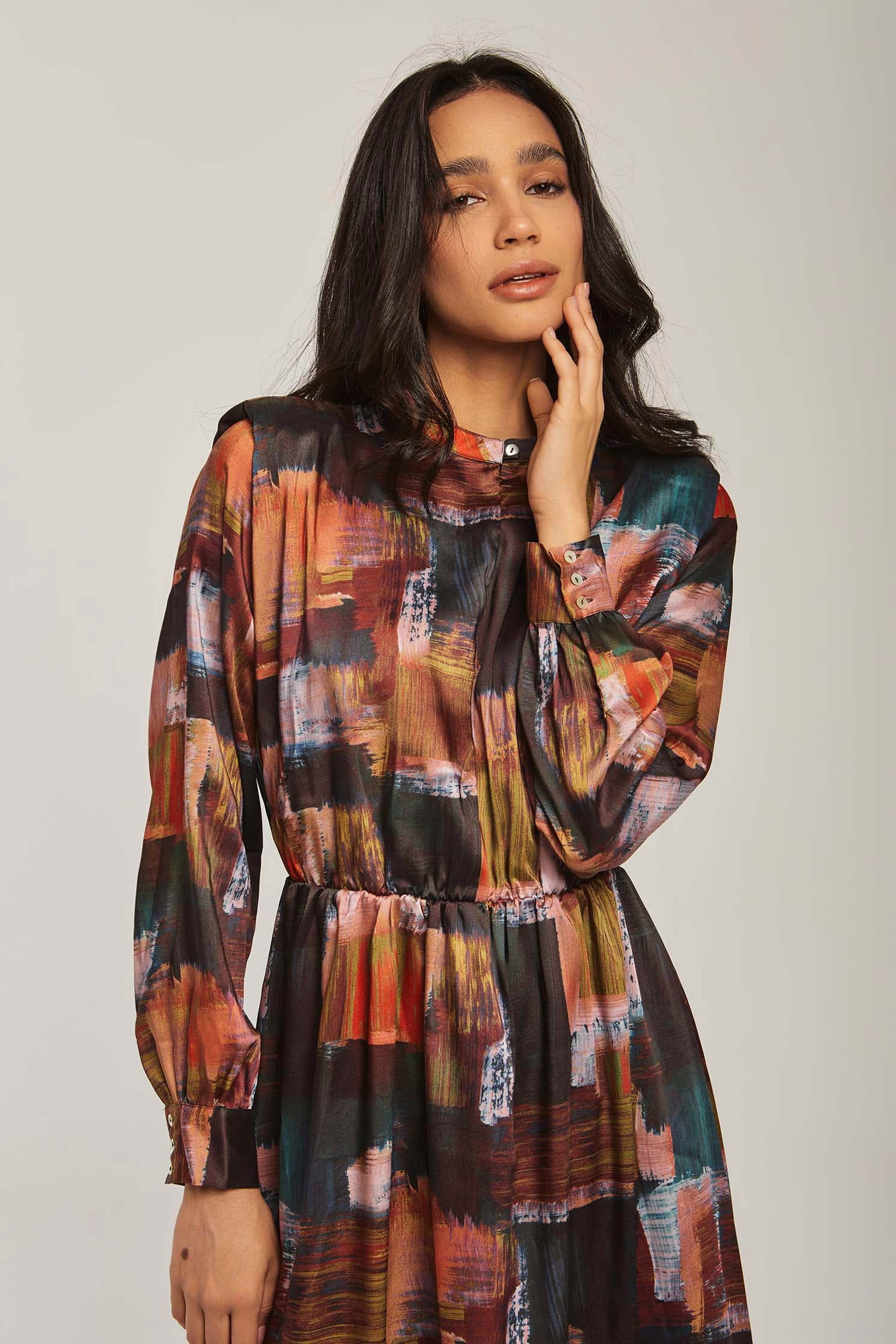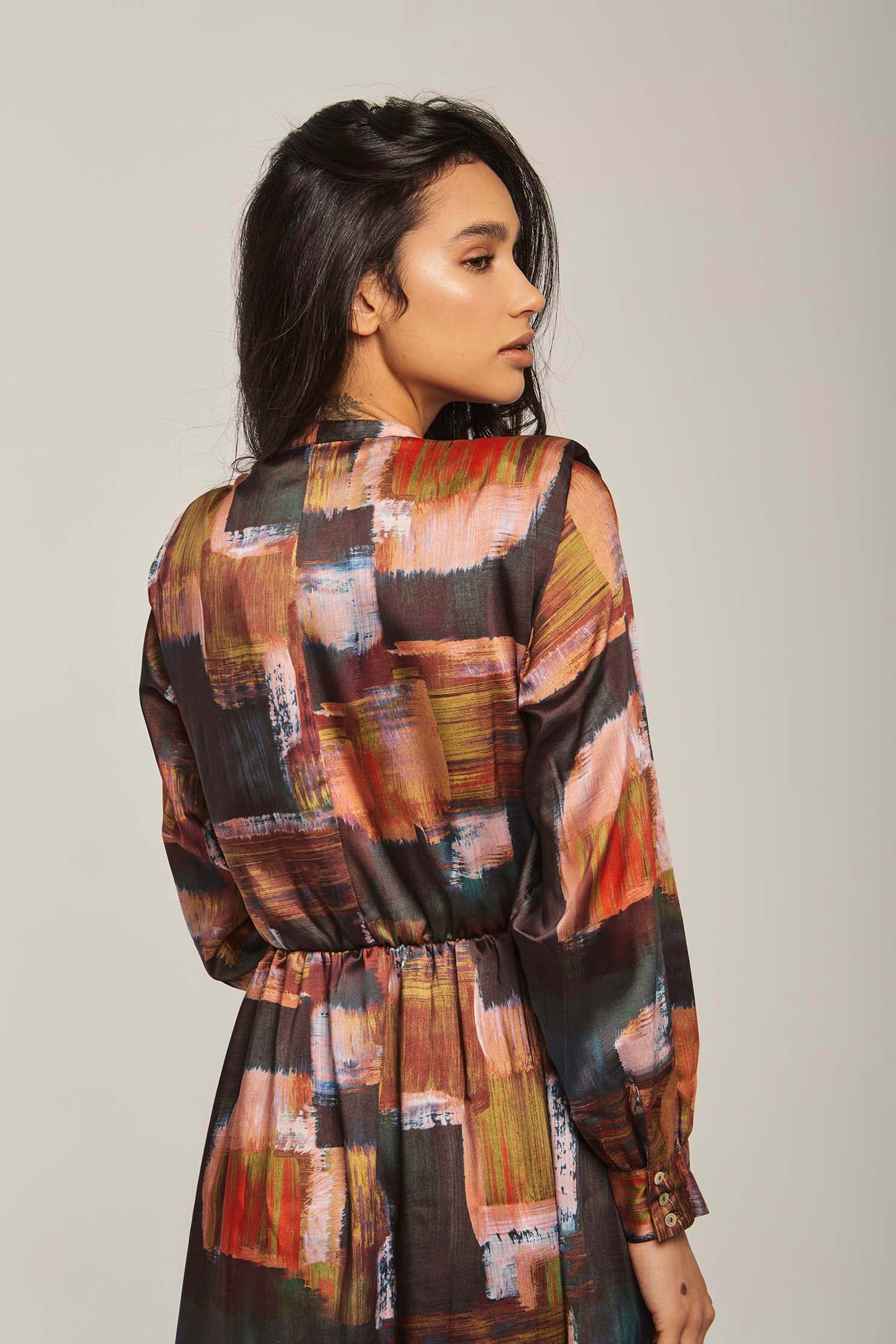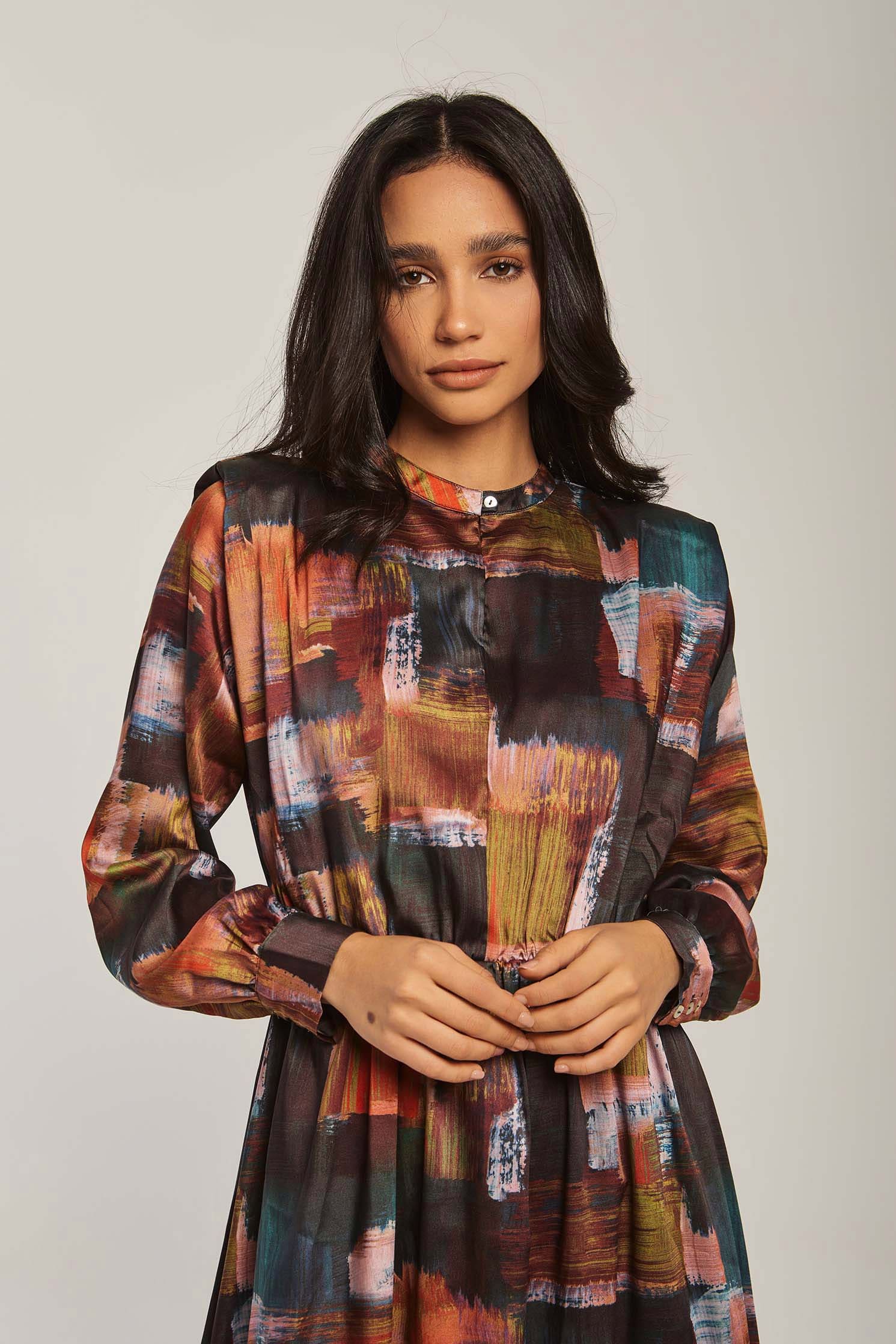 Make a vibrant statement in the Multicolor Abstract Maxi Long-Sleeve Dress โ an A-line silhouette designed to flatter while offering effortless movement. The multicolor abstract pattern brings artistic energy to a medium-weight fabric blend that transitions beautifully between spring and autumn. Long sleeves and a neat mandarin collar with button closure create a polished, wearable look; the unlined construction keeps the dress breathable and comfortable for all-day wear. With a regular fit and flowing maxi length, this piece provides graceful coverage without sacrificing ease โ perfect for weekend brunches, city strolls or relaxed office settings. Pocketless and beltless for a clean profile, itโs easy to accessorize for day or evening. Shop this versatile staple at Fashion SA and add instant personality to your casual wardrobe.