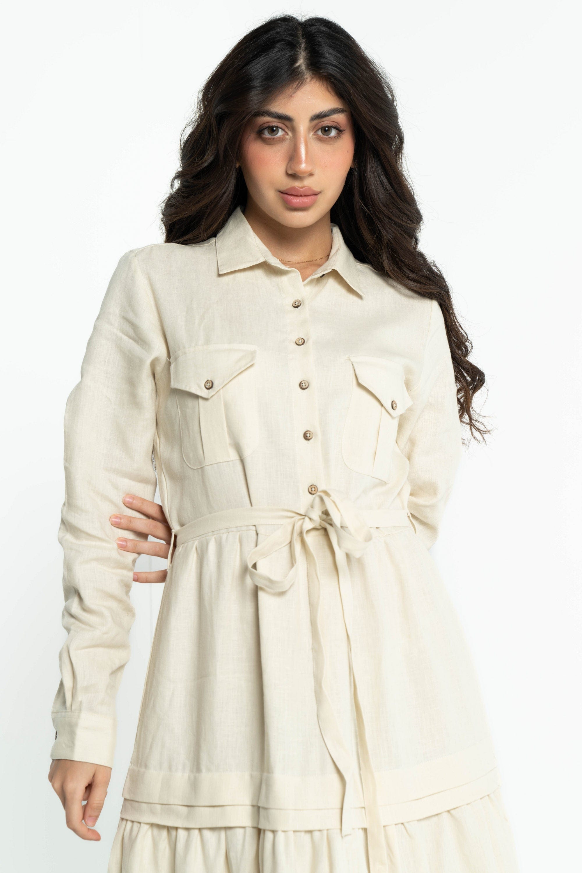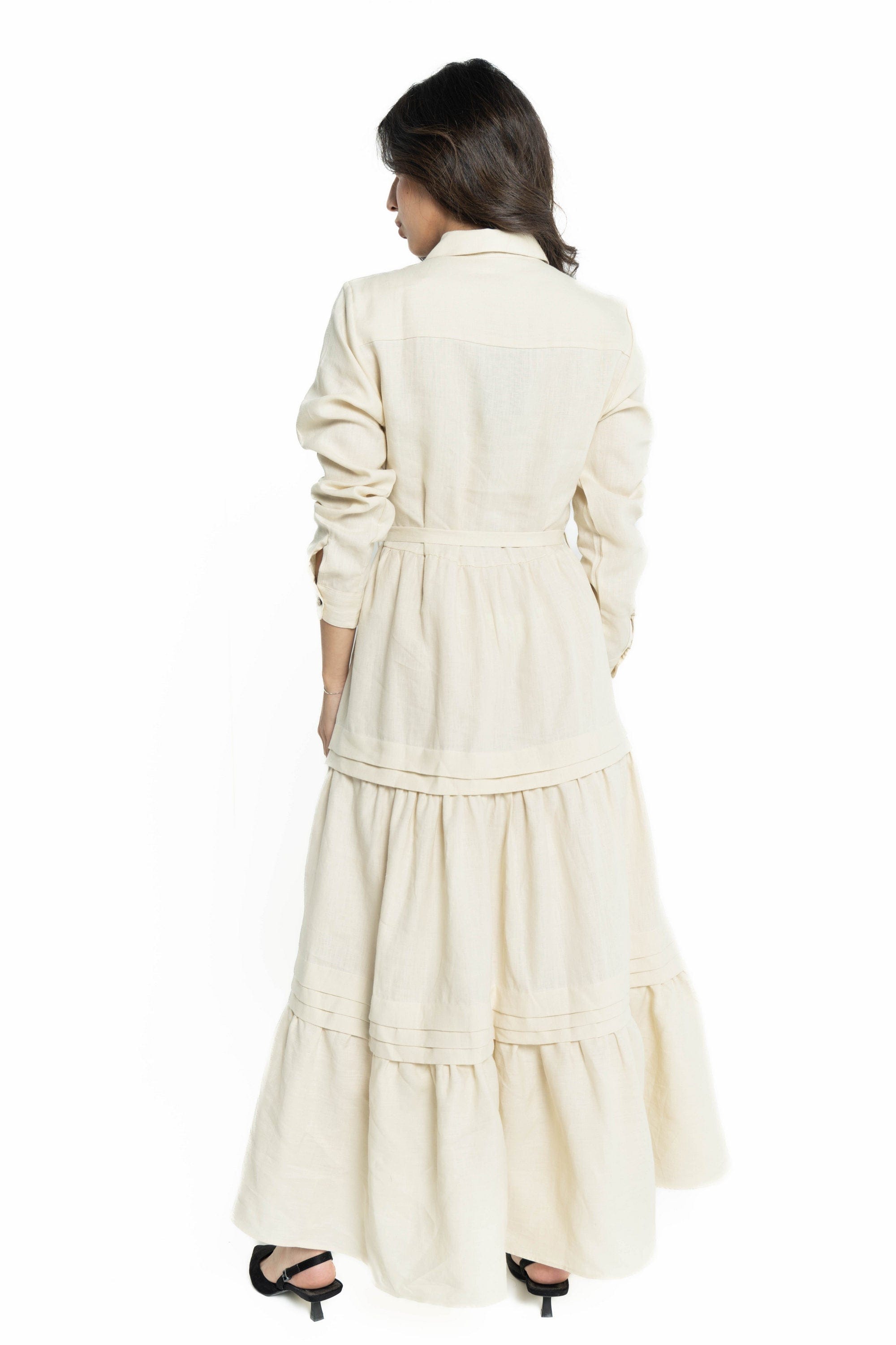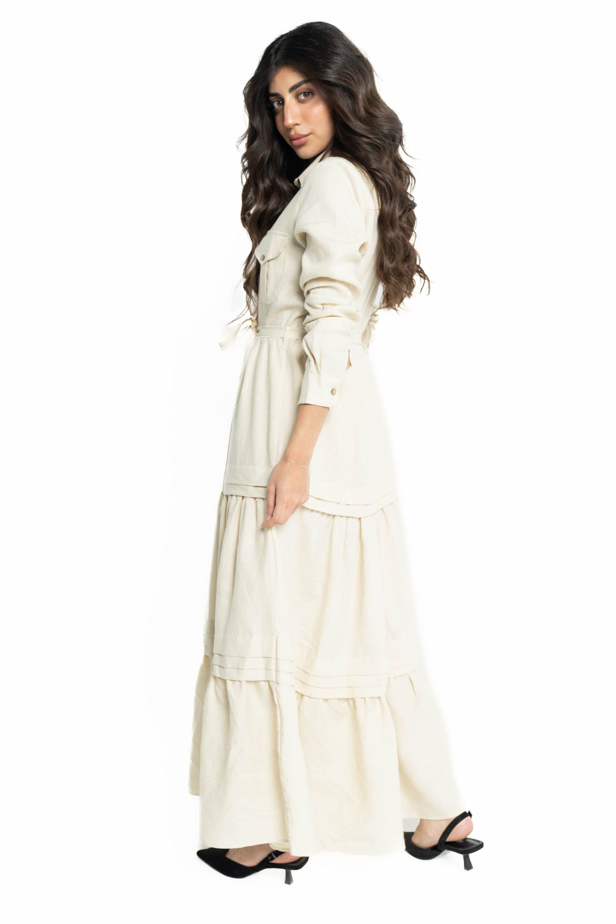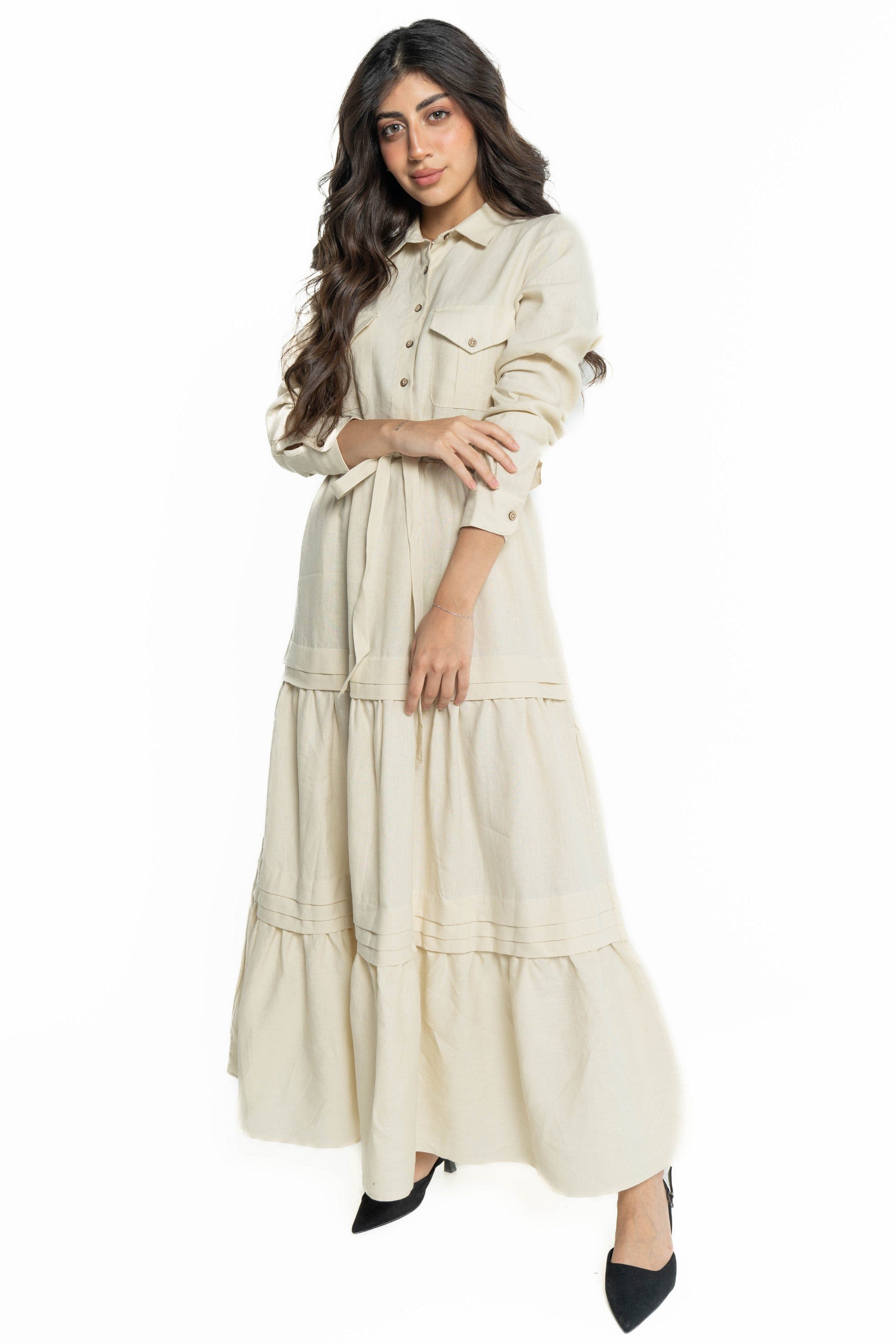 This ecru solid maxi belted dress is a wardrobe staple that blends timeless elegance with everyday ease. Cut in a flattering A-line silhouette, the flowing maxi length and long sleeves create graceful coverage while the medium-weight fabric provides structure without feeling stiff. A classic shirt collar and button-front closure add refined polish, while the included self-tie belt defines the waist for a customizable, regular fit. Functional double pockets lend practical convenience for hands-free days. With its plain, minimalist finish this dress transitions effortlessly from casual spring brunches to relaxed office days or autumn strolls. Designed for comfort and easy wear, the Dalydress piece is part of Fashion SA's casual/everyday collection — a versatile pick you'll reach for again and again. Shop now at Fashion SA to add this easy, elegant piece to your rotation.