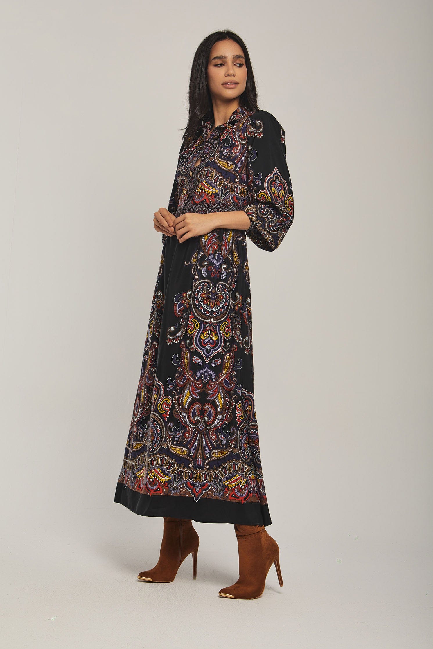 This Multicolor Paisley Maxi Balloon-Sleeve Dress fuses bohemian charm with modern polish—an instant wardrobe go-to that flatters and feels effortless. The A-line silhouette skims the waist and flows into a full maxi length for graceful movement, while long balloon sleeves and a structured shirt collar add sculptural interest. Rendered in a vivid multicolor paisley print on a lightweight, breathable fabric, the dress offers comfortable coverage and easy layering thanks to its button-down closure that lets you adjust the neckline. Ideal for casual days, weekend getaways and laid-back dinners, it transitions easily from sunlit markets to evening strolls. Crafted for versatility and everyday comfort, this Dalydress design is available at Fashion SA—shop now to add a standout, season-spanning piece to your rotation.