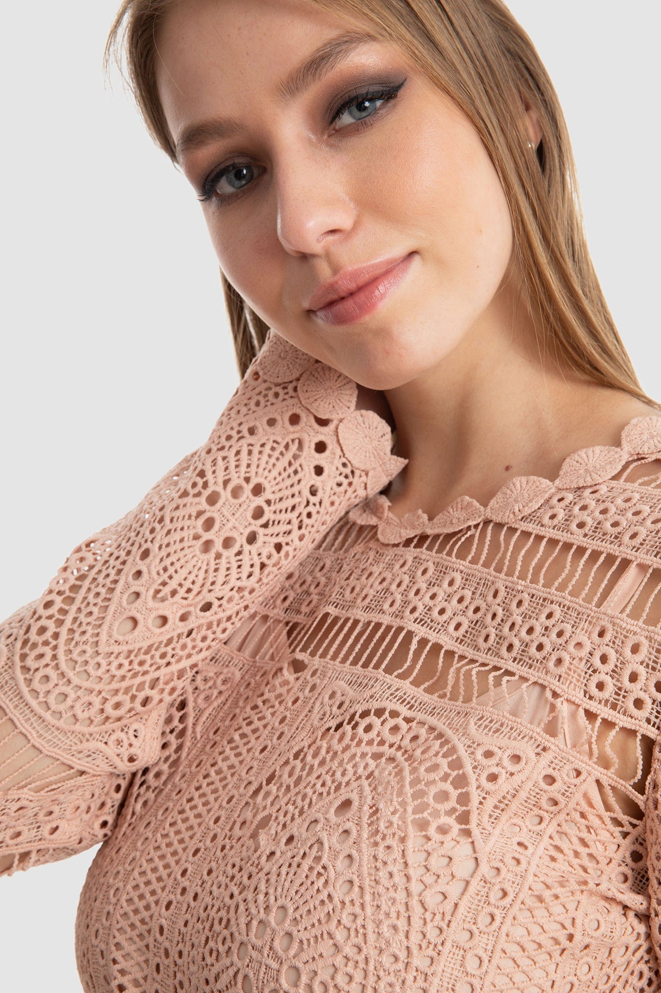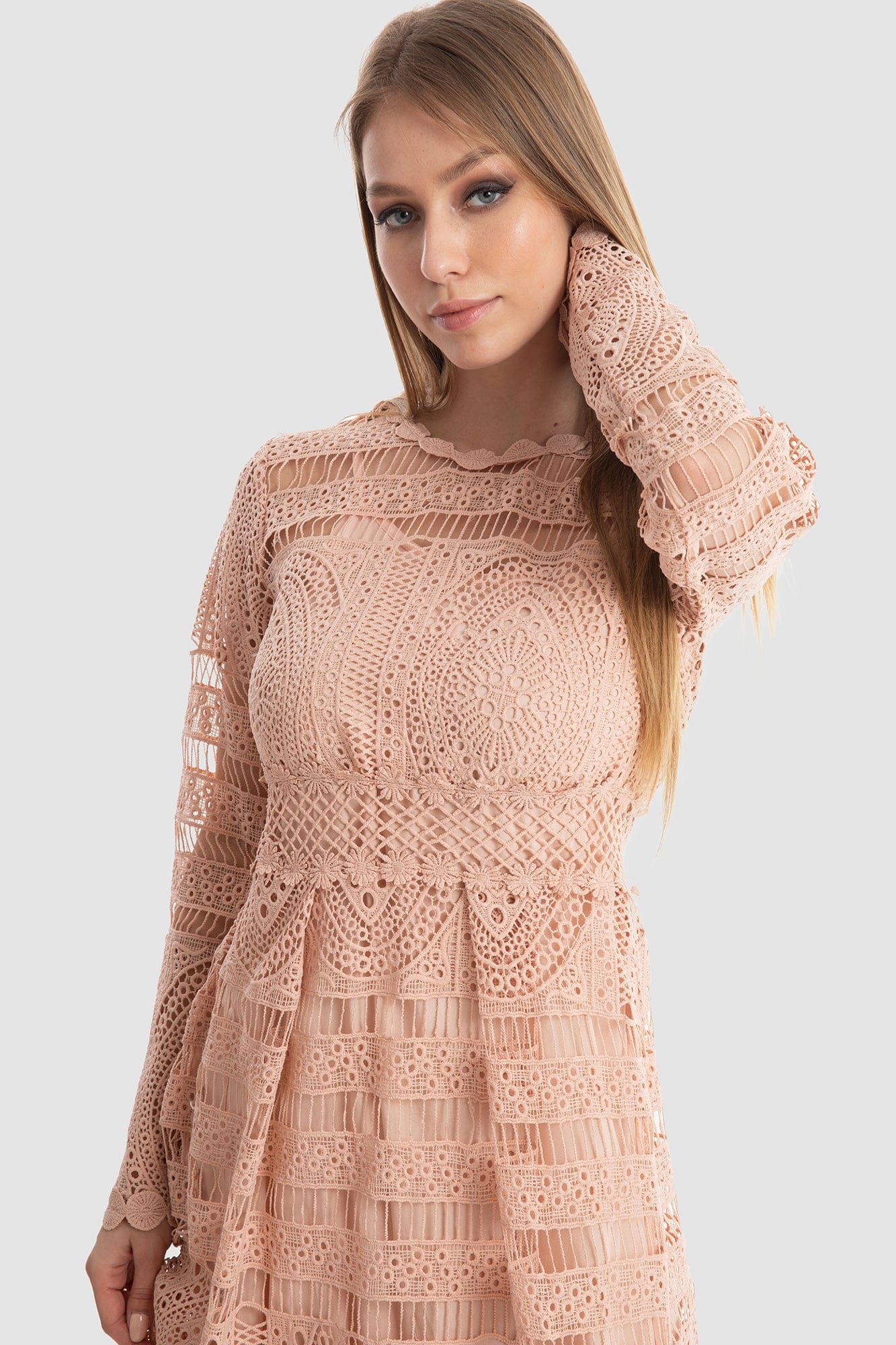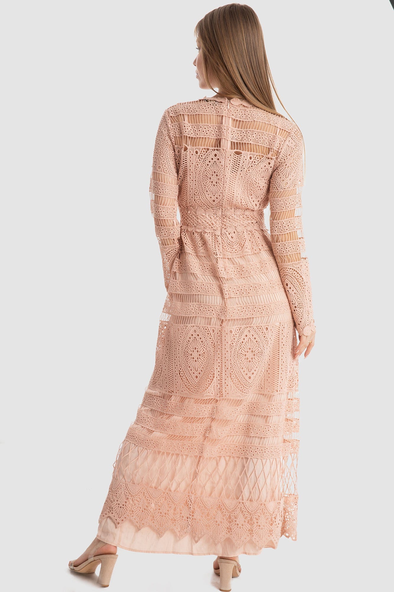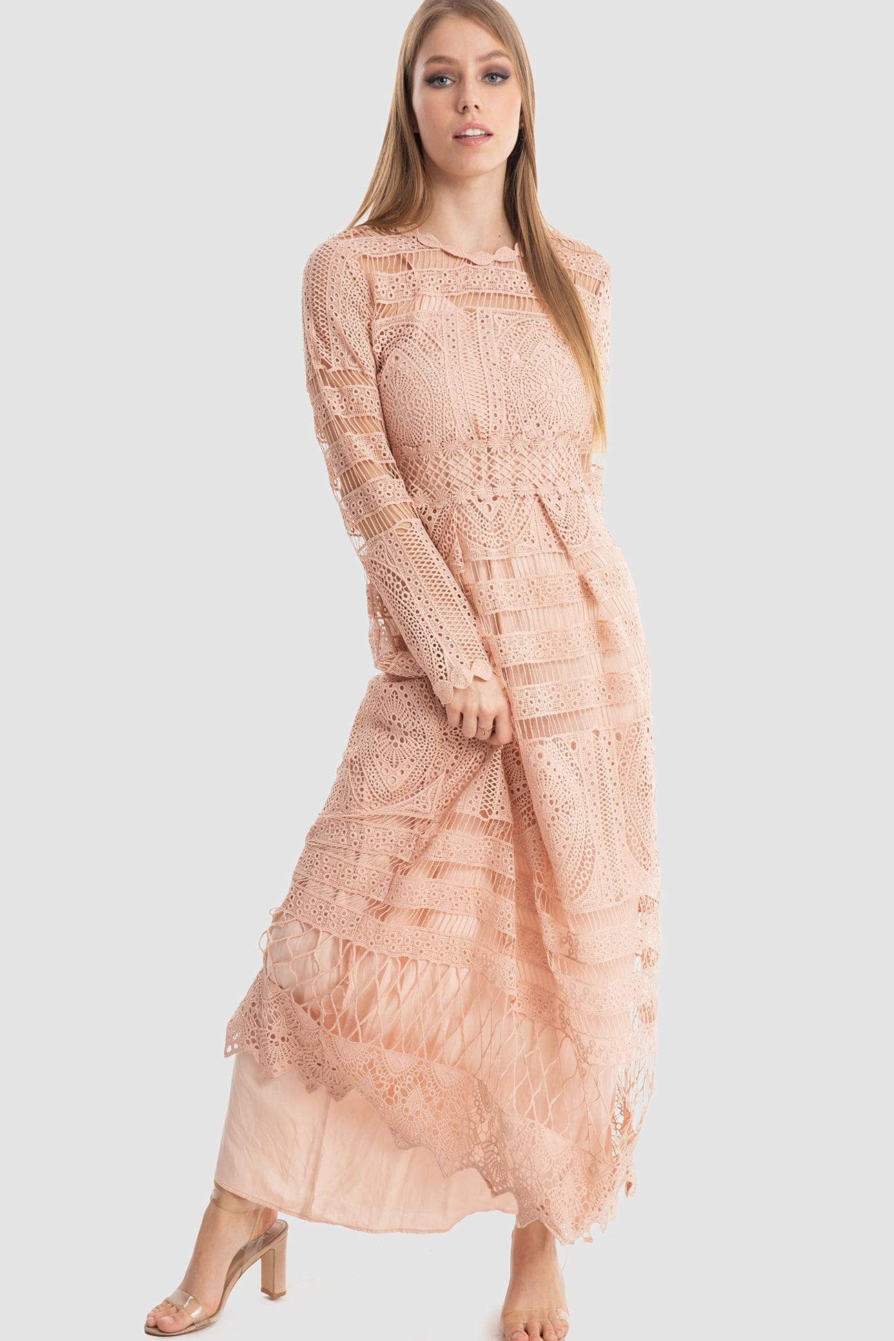 This pink lace maxi dress delivers timeless elegance with a modern, flattering silhouette—perfect for spring and autumn events. Crafted with intricate lacework overlay and a soft fully lined body, the A-line cut skims the waist and falls into a graceful maxi length that flatters every figure while offering comfortable, regular-fit wear. Long sleeves give refined coverage and seasonal versatility; a discreet zippered closure ensures easy dressing and a smooth back. The patterned lace detailing adds feminine texture and visual interest, while the medium-weight construction keeps the gown draping beautifully from daytime ceremonies to evening cocktails. Designed by Dalydress for Fashion SA, this beltless statement piece is an effortless choice for elegant occasions — add it to your wardrobe now for understated glamour and versatile styling.