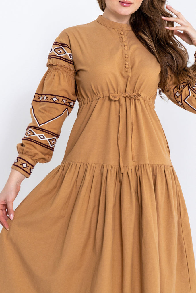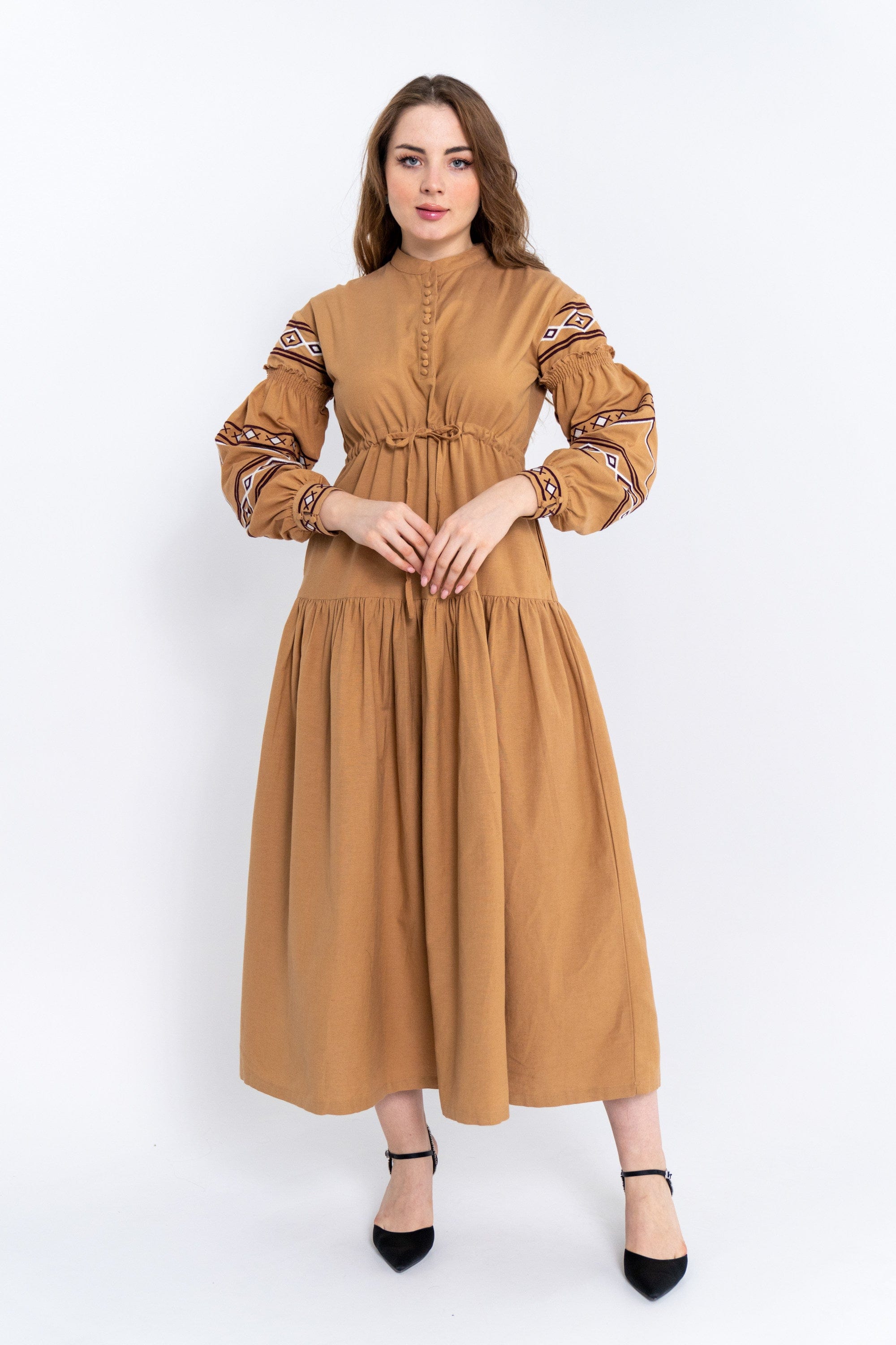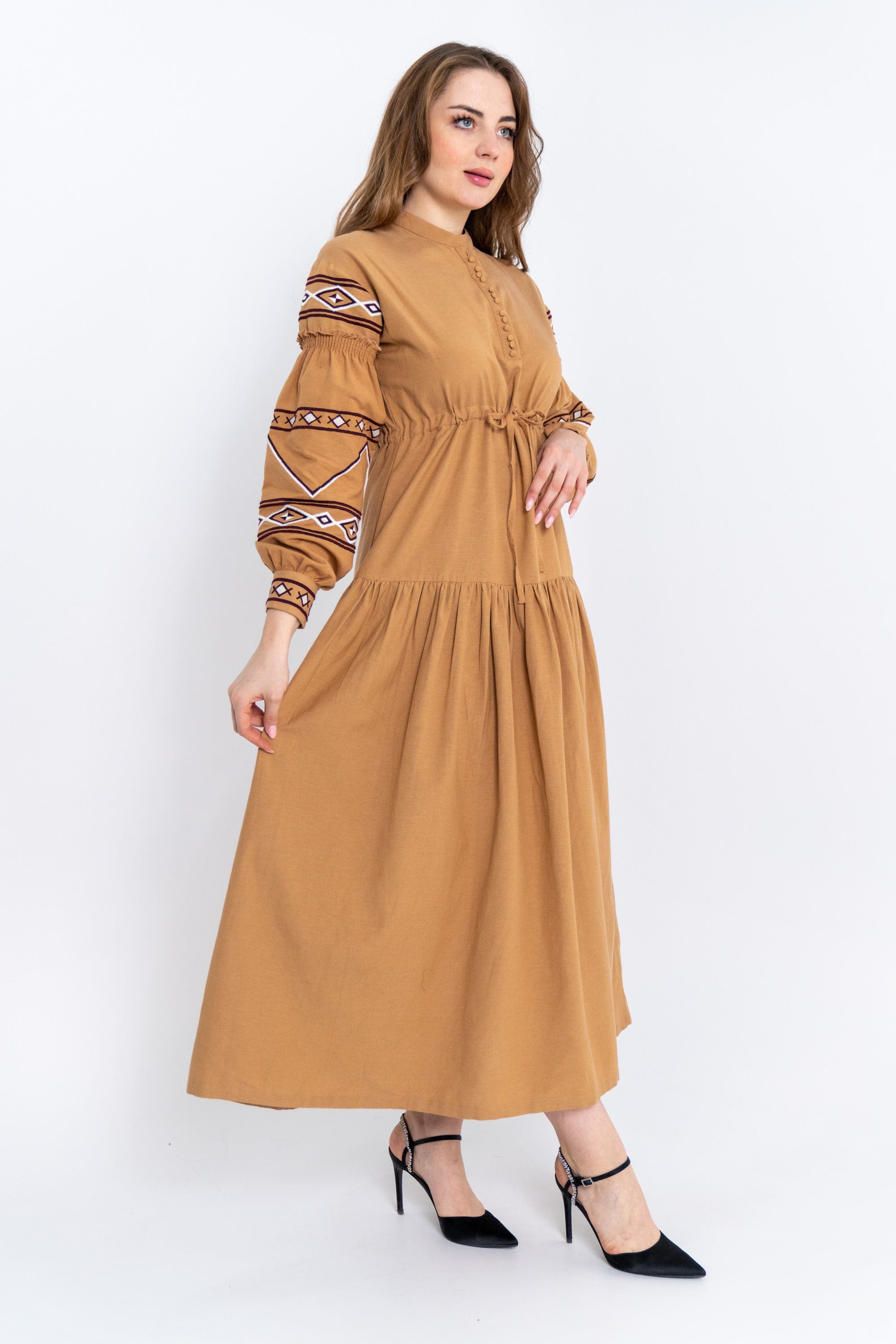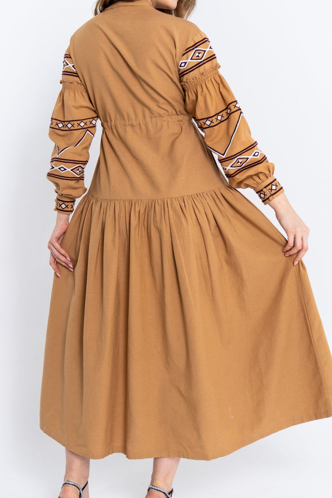 This Brown Ethnic Maxi Belted Dress makes a striking statement with effortless ease — a flattering A-line silhouette and fluid maxi length combine comfort and polish for everyday wear. Rendered in a medium-weight woven fabric with a warm brown ethnic pattern, it drapes softly while offering breathability and light structure for spring and autumn. The regular-fit bodice features a mandarin collar, button-front closure and long balloon sleeves that gather at the cuff; an elasticized waist with included belt defines the shape for a cinched waistline without sacrificing comfort. Finished in a versatile casual aesthetic, this belted maxi transitions from daytime errands to relaxed dinners with simple swaps of footwear. Shop this versatile piece at Fashion SA and elevate your seasonal rotation — add to cart for timeless, easy styling.