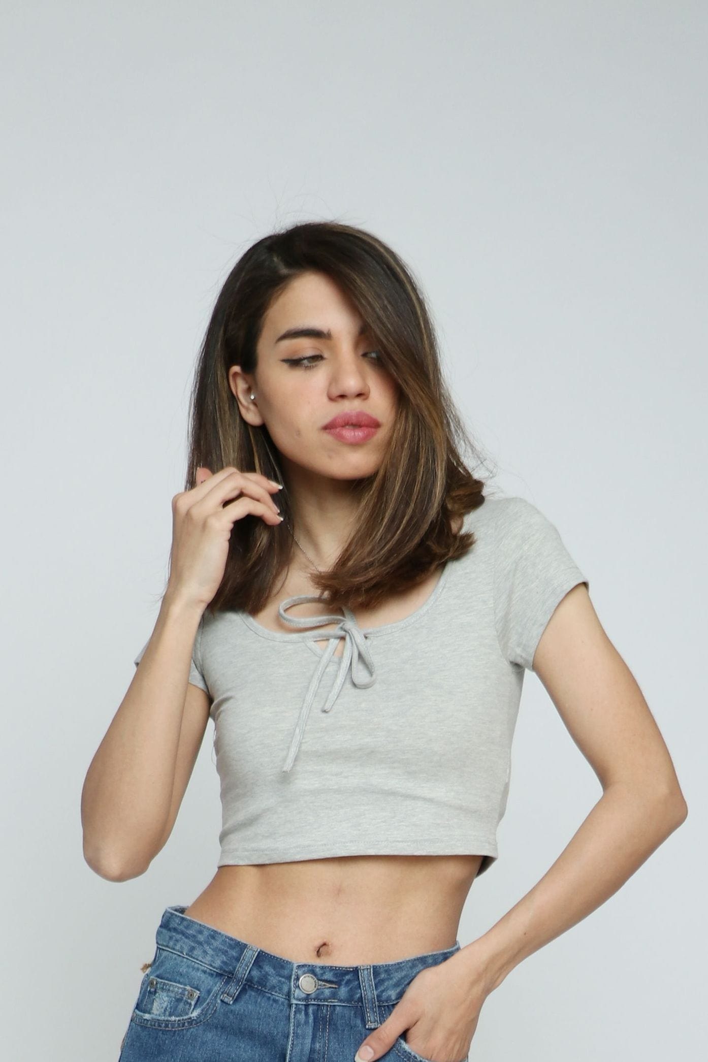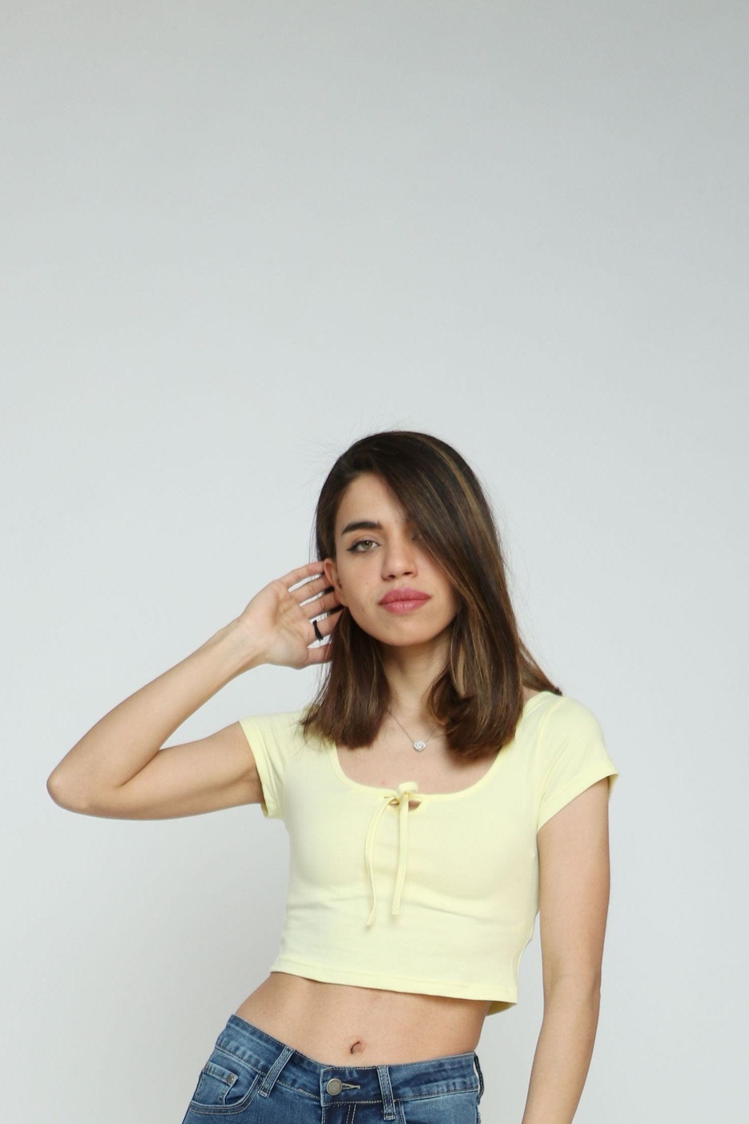 Get ready to shine in a cotton half-belly-sleeved short sleeve crewneck with a tie for women from Kitschen. Available in pastel grey and yellow tones, this blouse will suit your unique taste. Designed with elegance and comfort, this piece is perfect for modern and comfortable looks. It's cut for a relaxed silhouette with short sleeves, and a tie neckline for added elegance. Wear it with jeans or a skirt for a feminine look. Get now a cotton blouse with half belly short sleeves with a round neck with a tie for women from Kitschen Get ready to shine in your own style. Order it now and enjoy the most beautiful fashion from Fashion Saudi Arabia. Product Number: 05-1874