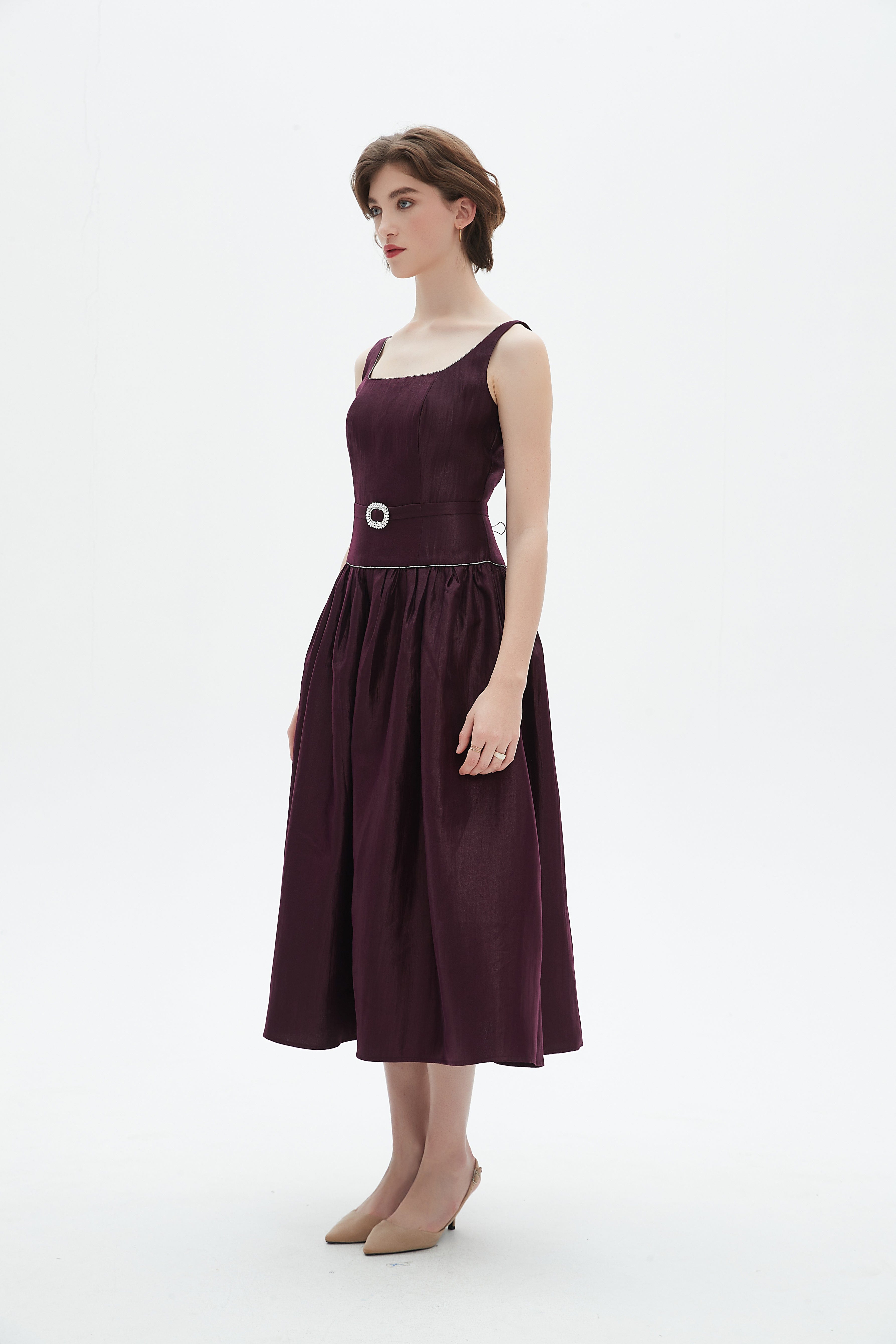 - Belted waist for instant shaping; sleeveless cut and square collar for a modern, feminine profile