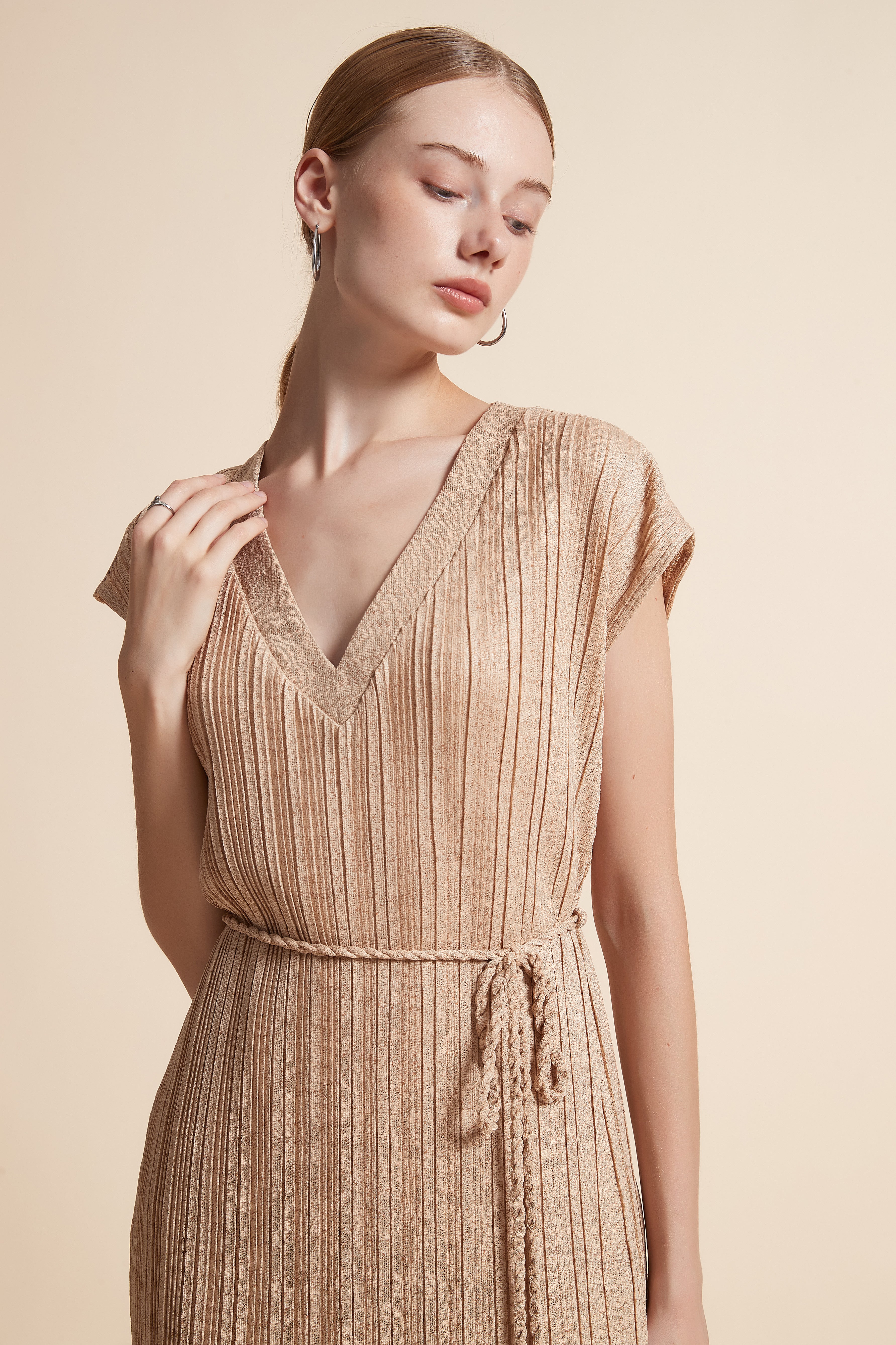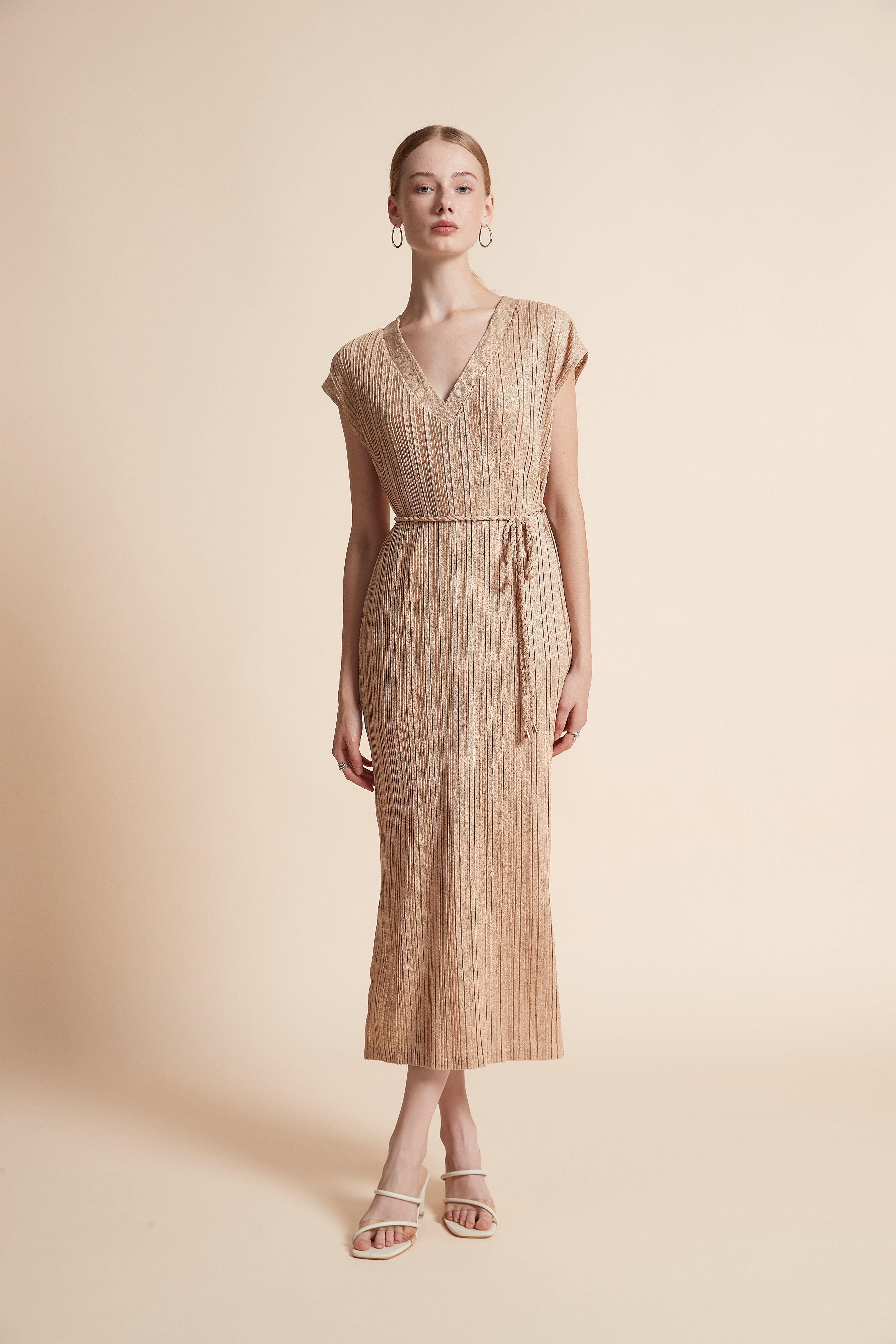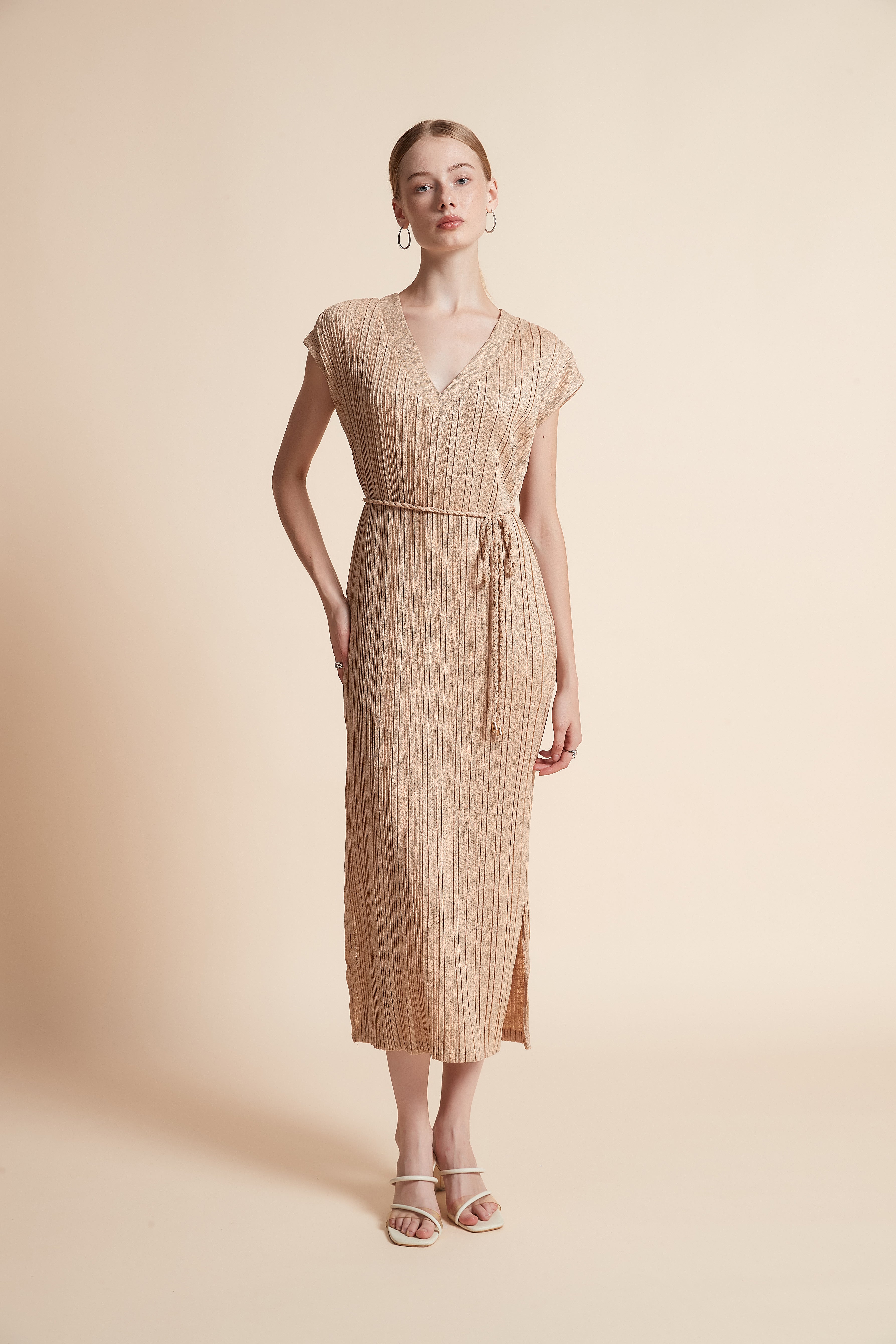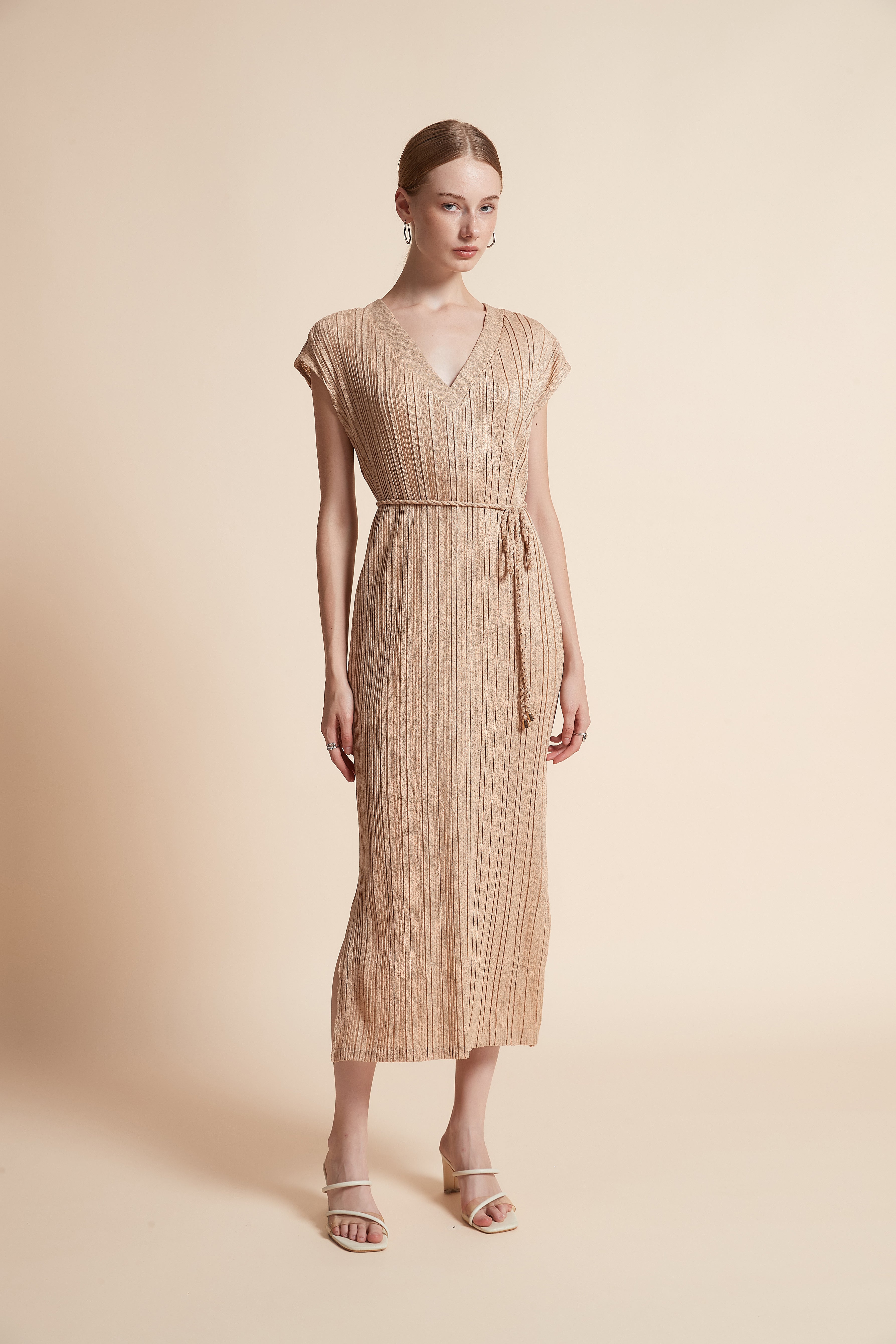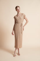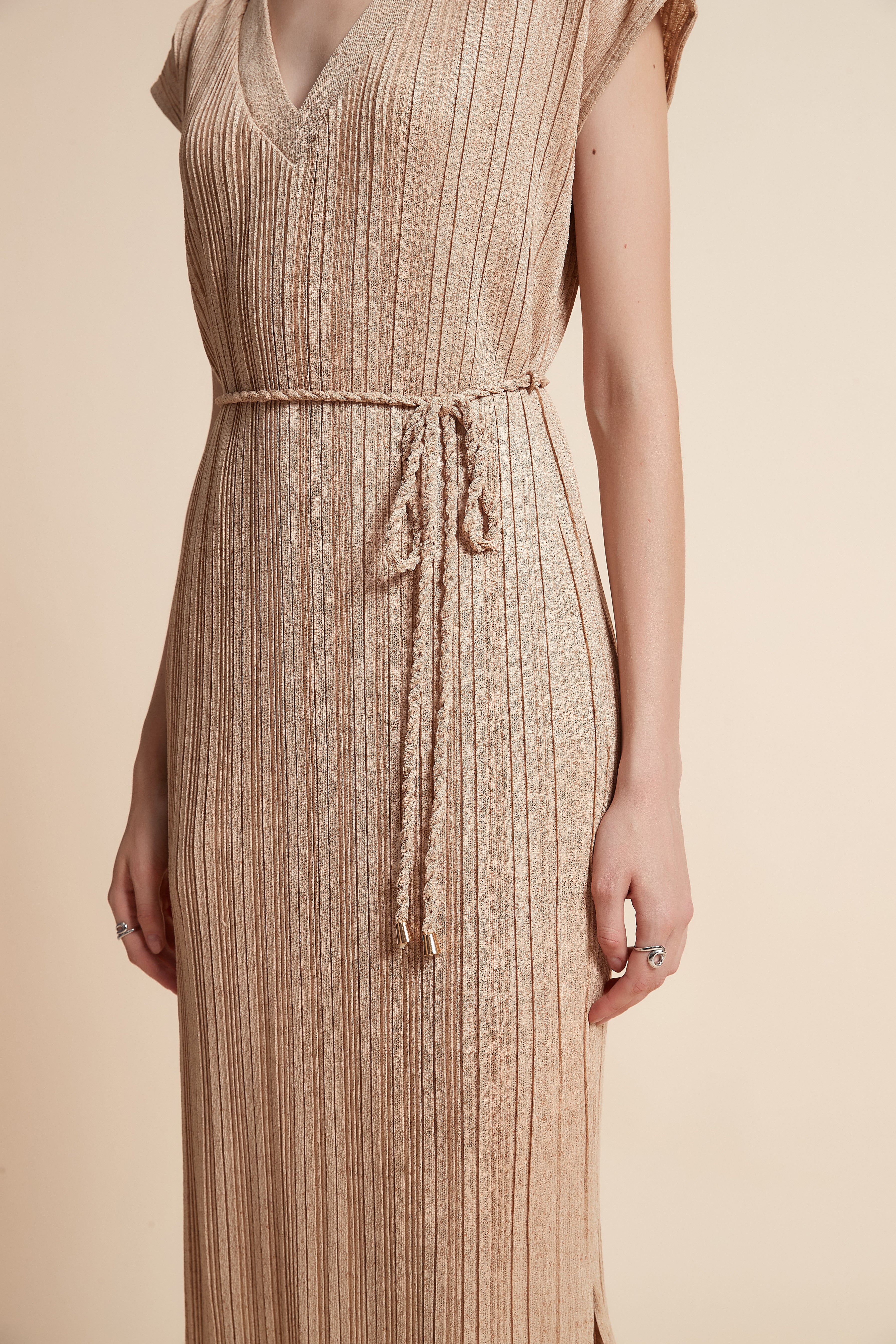Timeless and effortlessly chic, the Beige Solid Midi Belted Dress brings refined simplicity and everyday ease to your wardrobe. Cut from 100% polyester, this straight silhouette offers a regular, streamlined fit with medium-weight drape and wrinkle-resistant performance for low-maintenance wear. The sleeveless V-neck and unlined construction create a sleek, cool layer for year-round styling, while the included belt defines the waist for a flattering profile. Midi length balances coverage and movement, making it ideal for casual weekends, office-smart looks, or layered evening outfits. Pocketless detailing keeps the lines clean and modern. In a versatile solid beige, this piece is a neutral foundation that adapts across seasons—shop this wardrobe essential at Fashion SA and elevate everyday dressing with ease. Order now and enjoy effortless style every day.
