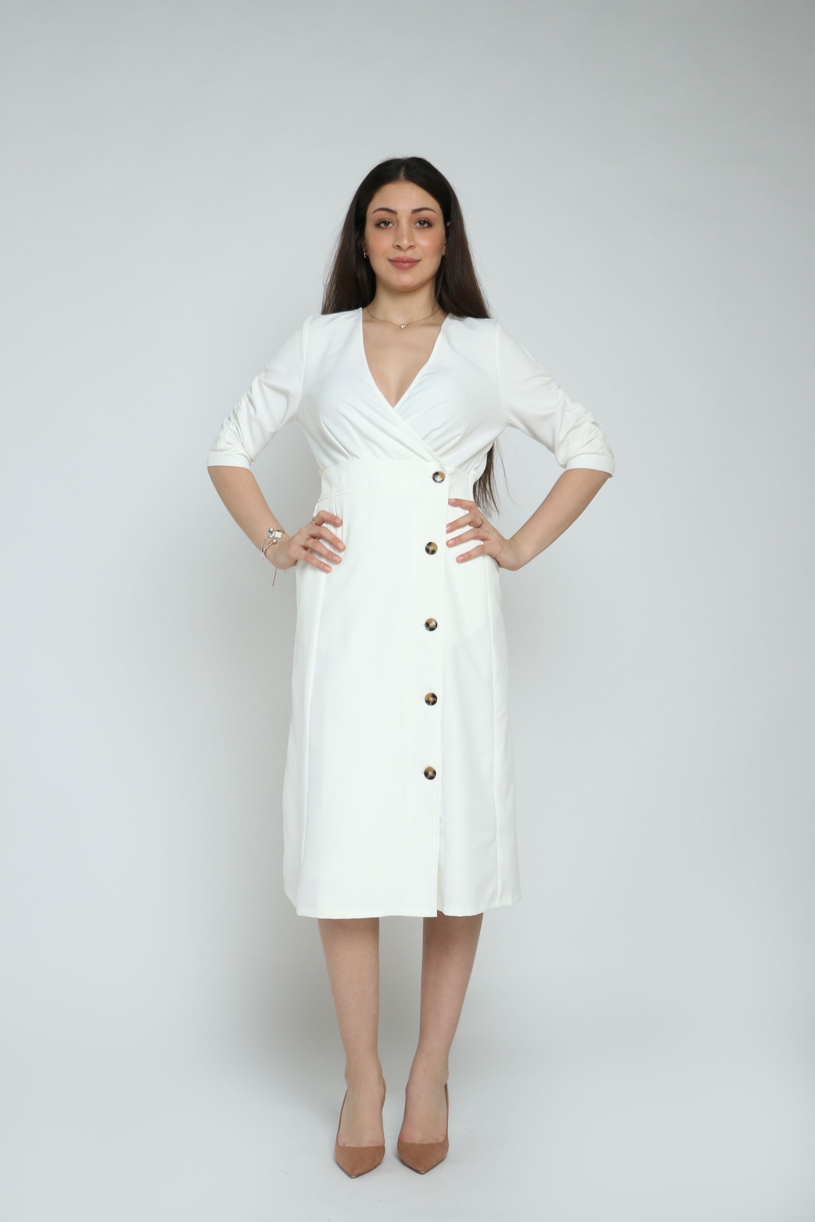 This crisp white midi dress is a polished wardrobe essential, marrying professional poise with everyday ease for the modern office. Cut in a flattering A-line silhouette with a feminine V-neck and three-quarter sleeves, this plain midi length offers refined coverage and effortless movement. Tailored from a 97% polyester, 3% elastane blend with a full polyester lining, the fabric is wrinkle-resistant with subtle stretch for comfortable all-day wear and a smooth drape. The regular fit and medium-weight construction keep proportions smart without feeling restrictive, while button-through closure adds tailored detail. Pocketless design streamlines the profile for sleek suiting looks. Perfect for business meetings, client presentations, or office-to-evening transitions, pair it with a structured blazer or polished pumps. Discover refined office dressing at Fashion SA — add this versatile piece to your collection today.