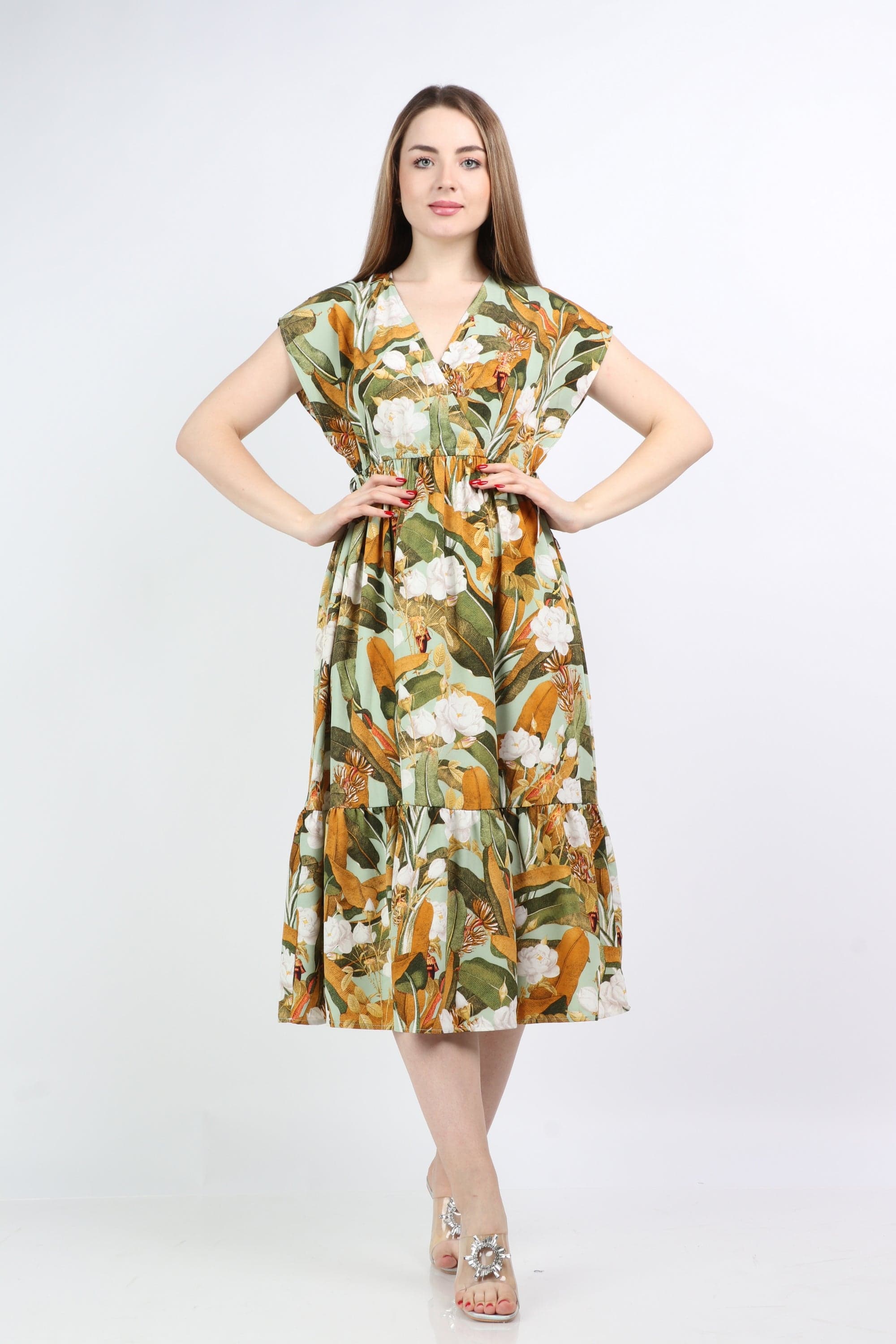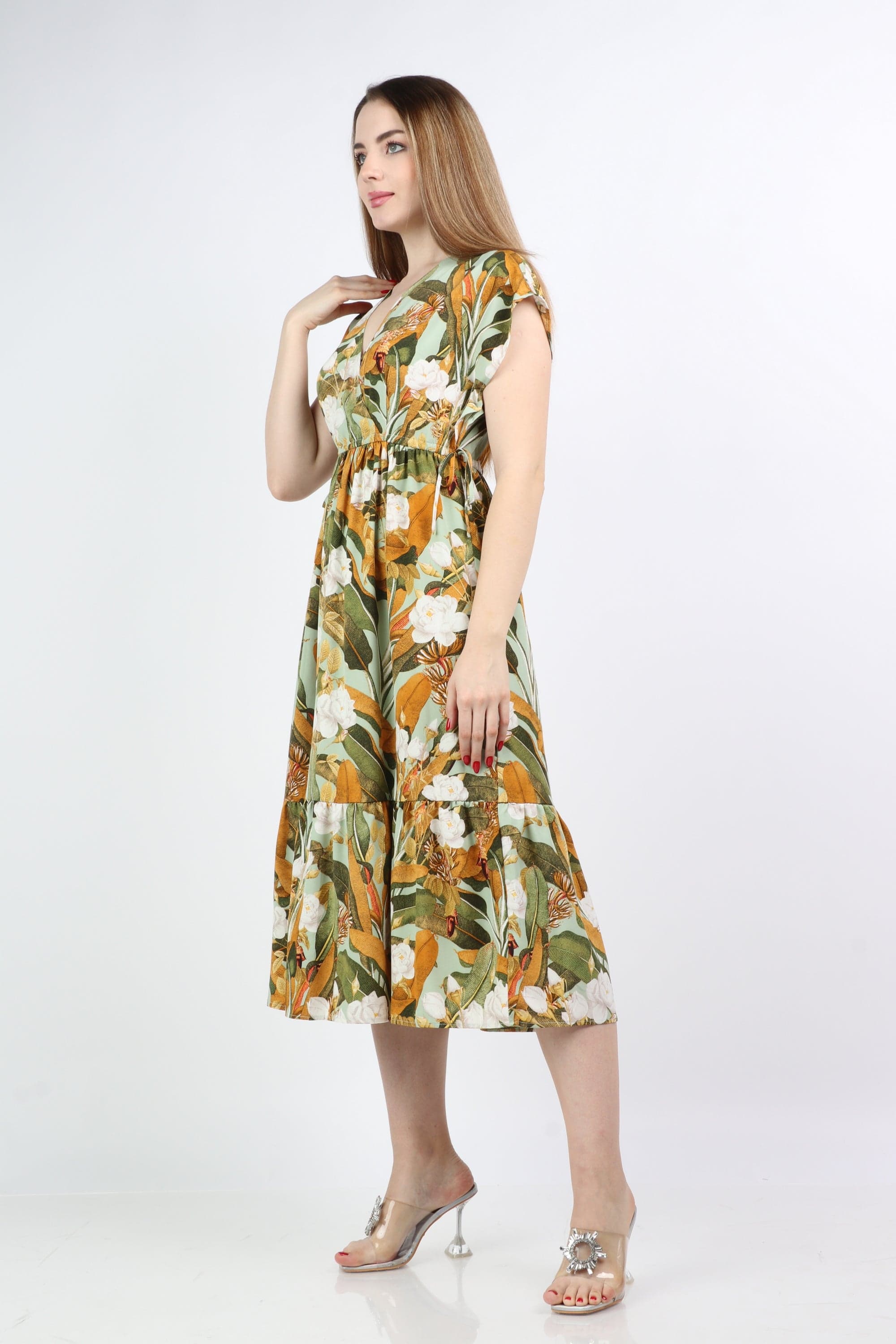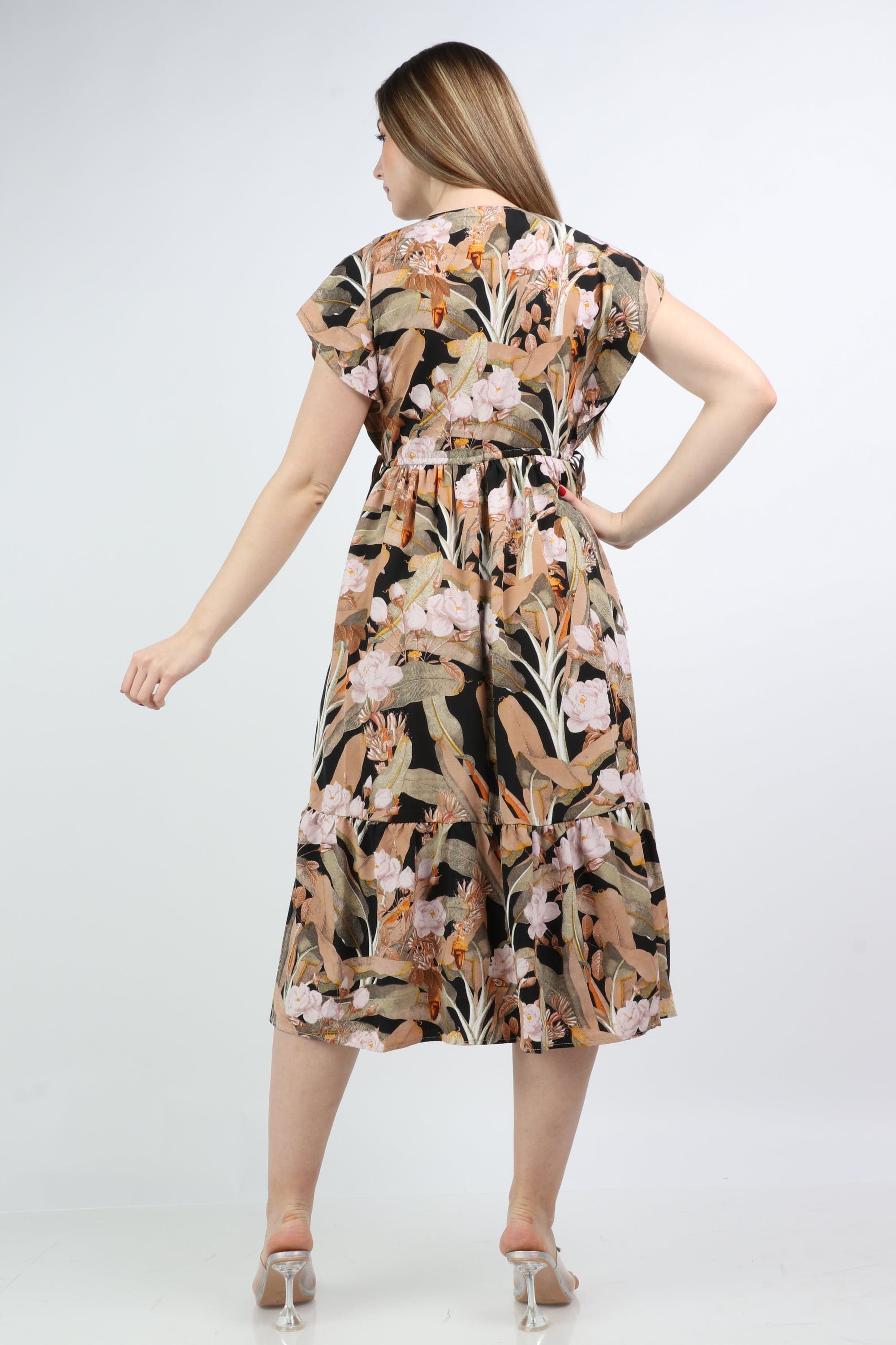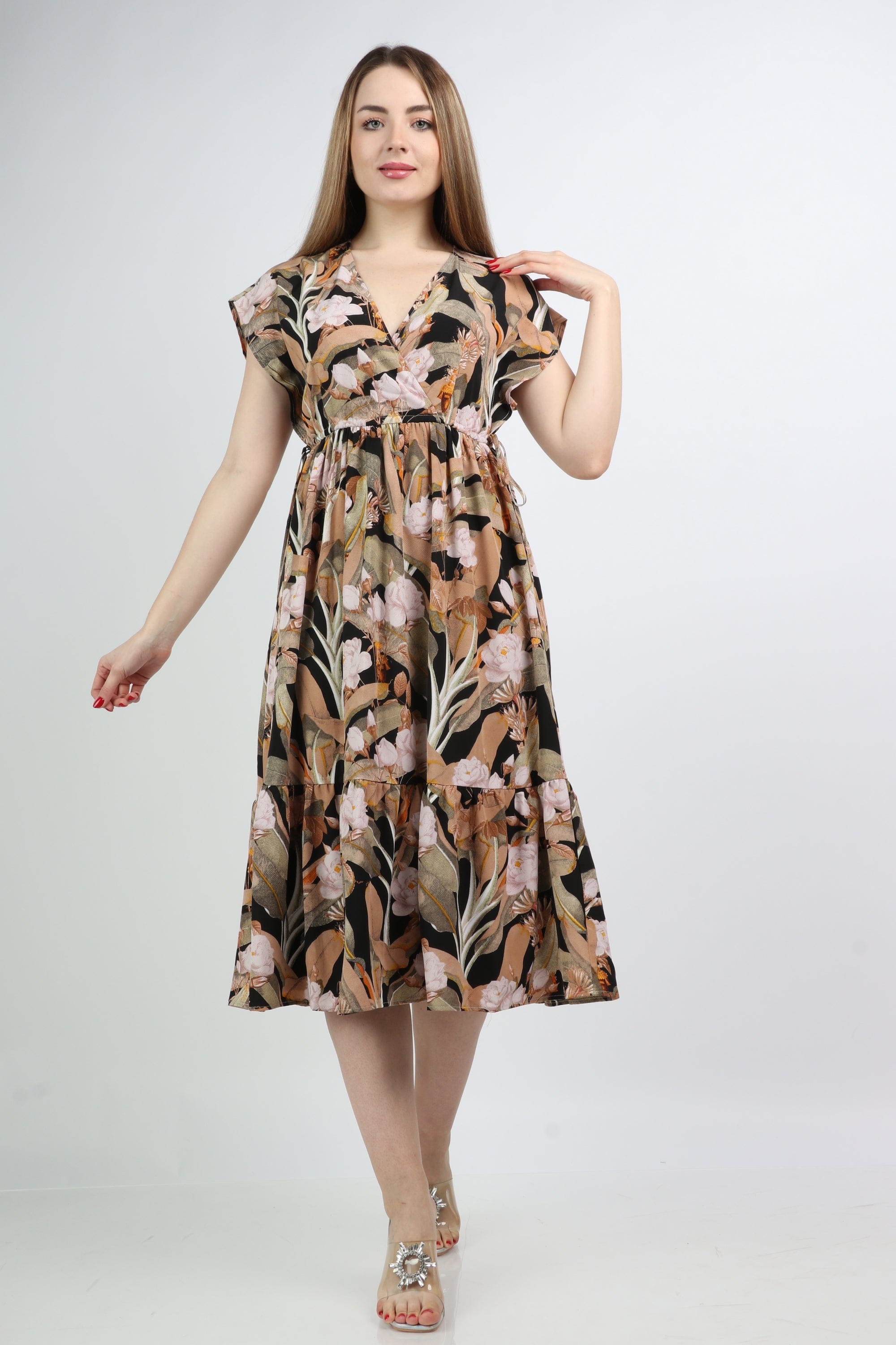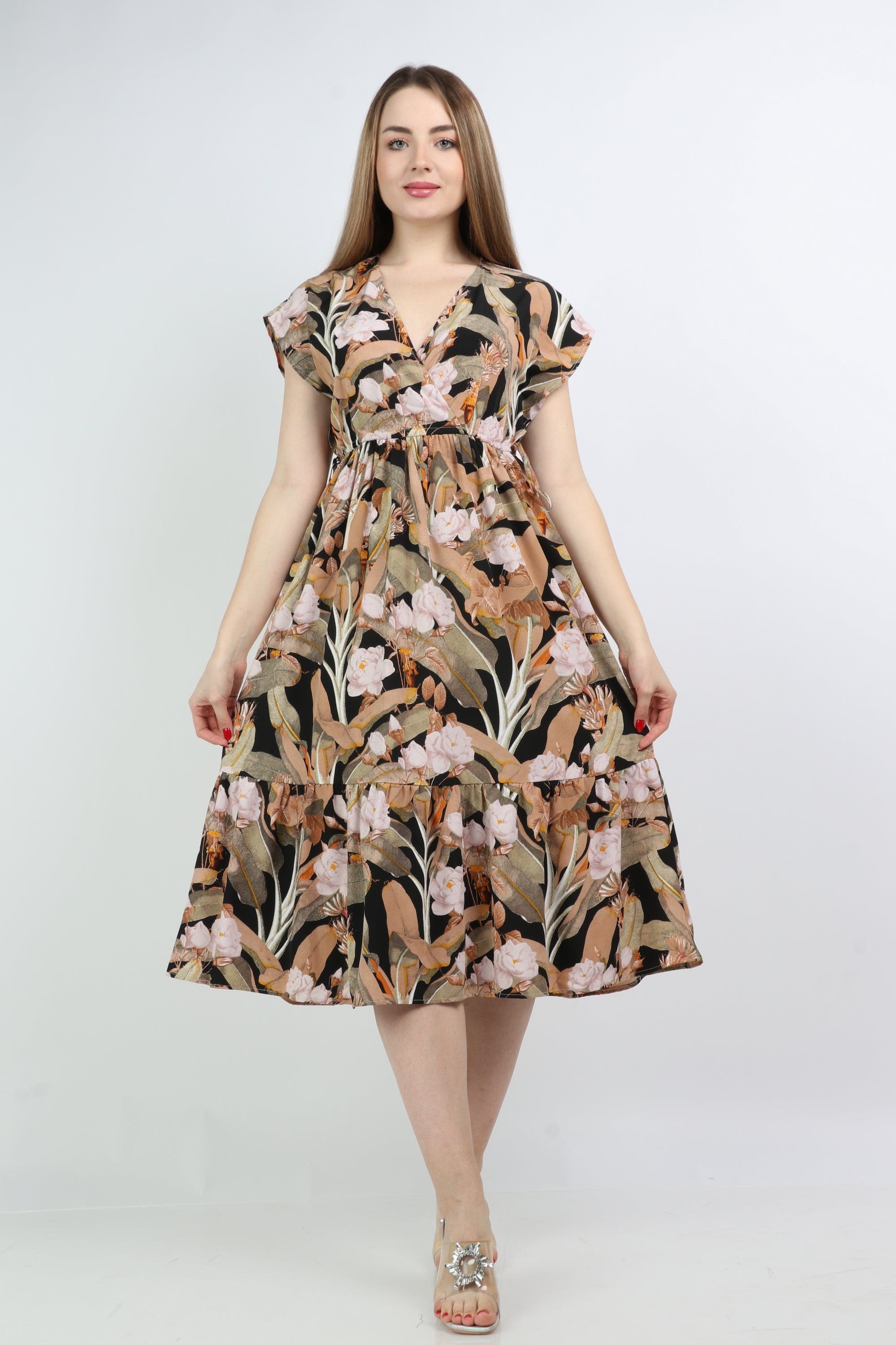 This multicolor floral midi V-neck dress is a seasonal must-have, blending feminine charm with everyday ease. Cut in a flattering A-line silhouette from 100% polyester, the regular-fit bodice skims the waist and flows into a midi-length hem that moves gracefully with every step. Short sleeves and a timeless V-neck offer breathable coverage for all-season wear, while the unlined construction keeps the feel lightweight without bulk. The vibrant floral pattern brightens casual looks for brunches, markets or weekend outings, and the pocketless, beltless design creates a clean, streamlined profile that layers beautifully under jackets. Easy-care polyester resists wrinkles and holds color wash after wash. Discover this versatile piece at Fashion SA and add instant polish to your day-to-day wardrobe—shop now to refresh your collection.