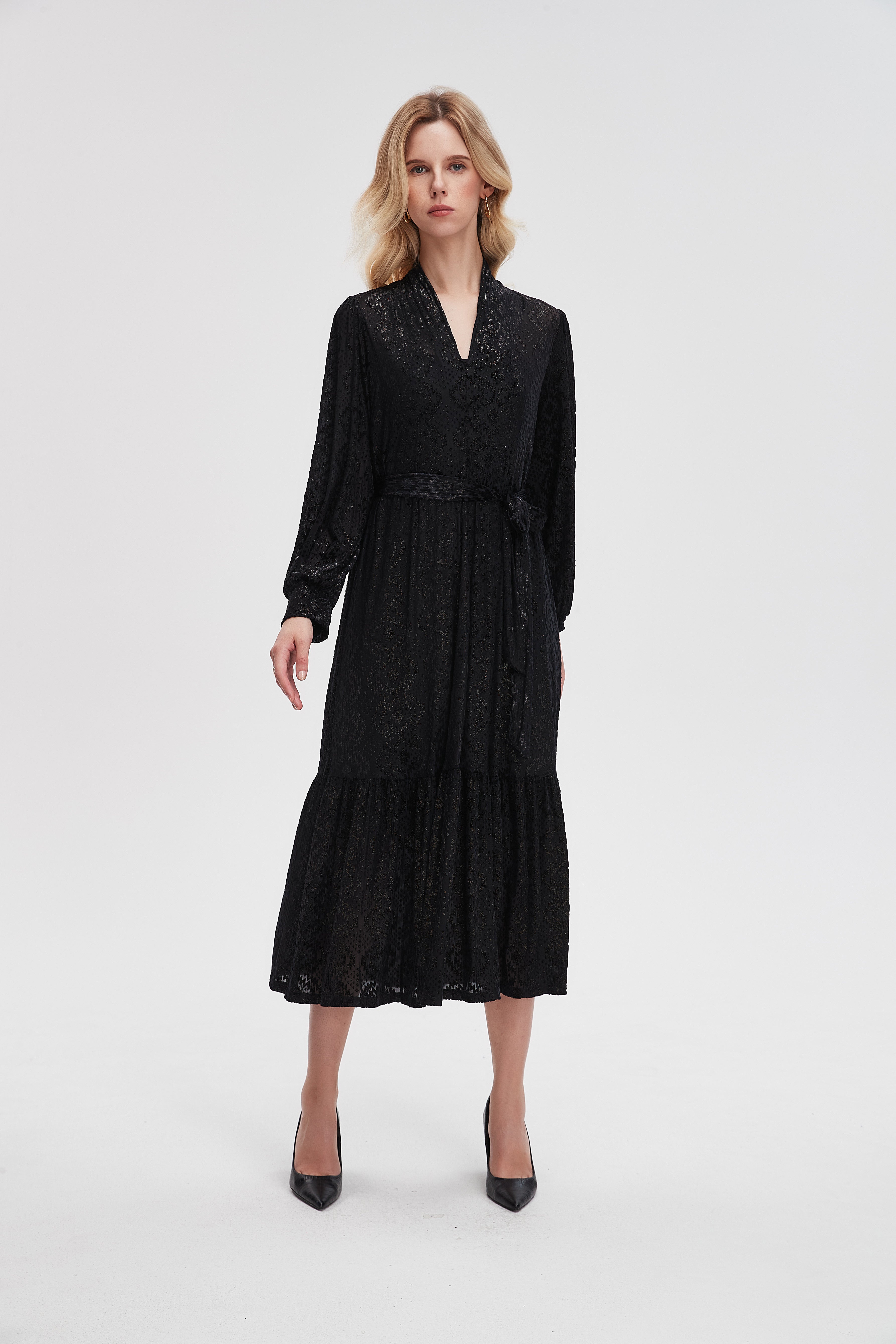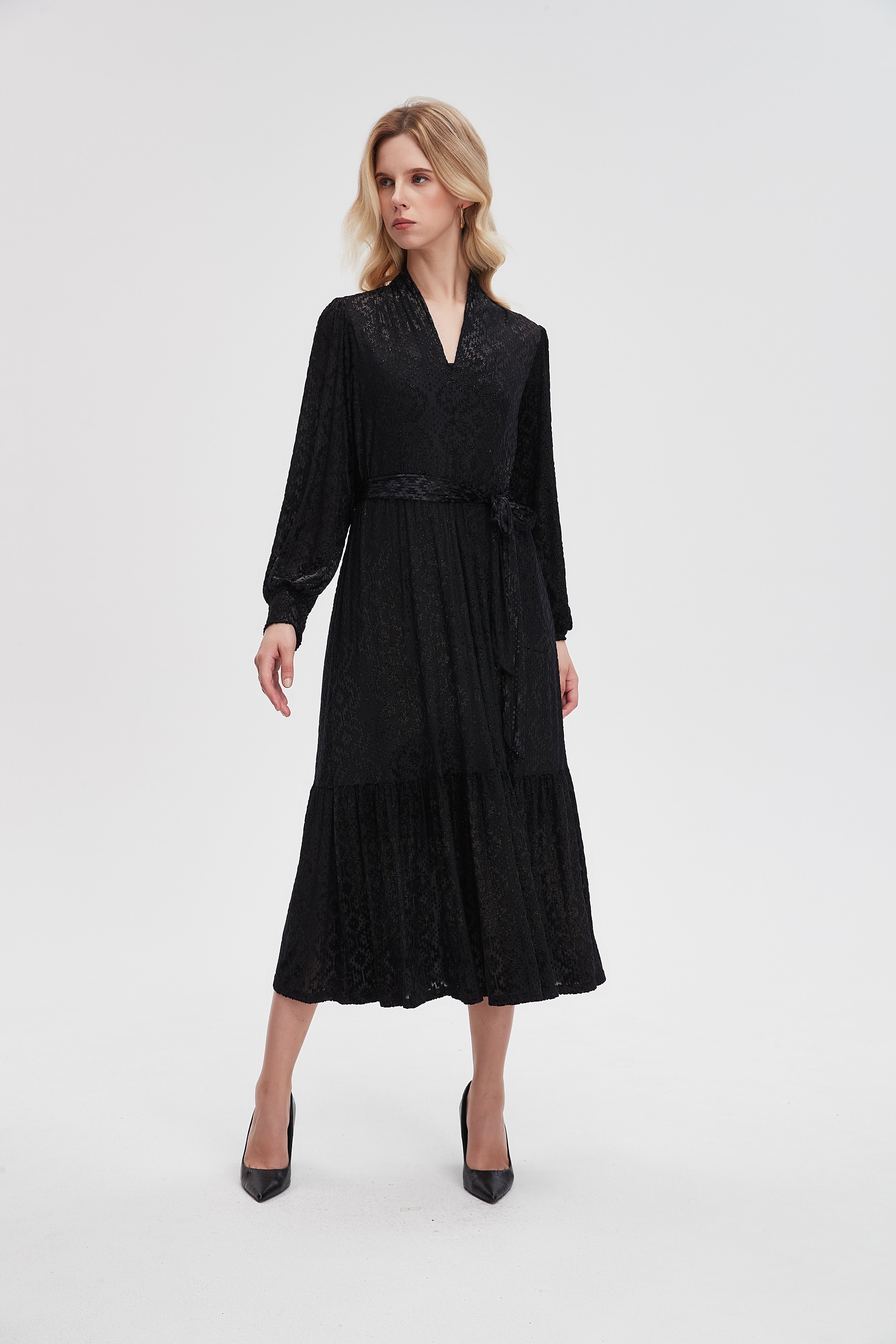 This Black Textured Midi Belted Dress from Nichii brings refined elegance to your wardrobe with a modern A-line silhouette that flatters the figure while offering effortless movement. Cut in a luxe blend of 70% polyester, 20% nylon and 10% elastane, the medium-weight textured fabric is wrinkle-resistant, durable and has comfortable stretch that retains shape. The V-neck and long sleeves create a poised, polished profile; the belted waist defines the silhouette for a feminine, tailored look. Unlined and pocketless for a sleek finish, the regular fit sits true to size and is ideal for sophisticated daytime events or evening occasions. Whether styled with pumps and a clutch for an elegant affair or ankle boots and a tailored coat for city dressing, this versatile midi is a wardrobe staple. Shop it now at Fashion SA.